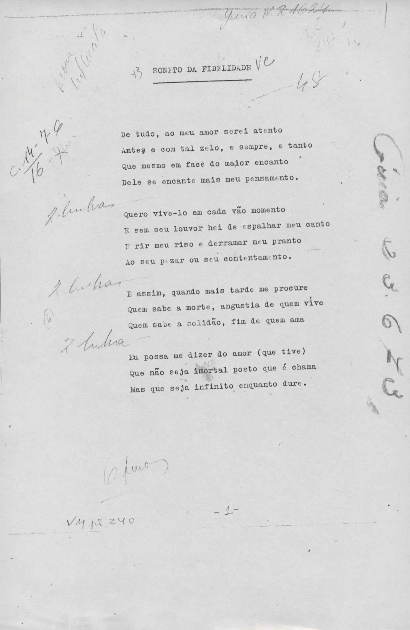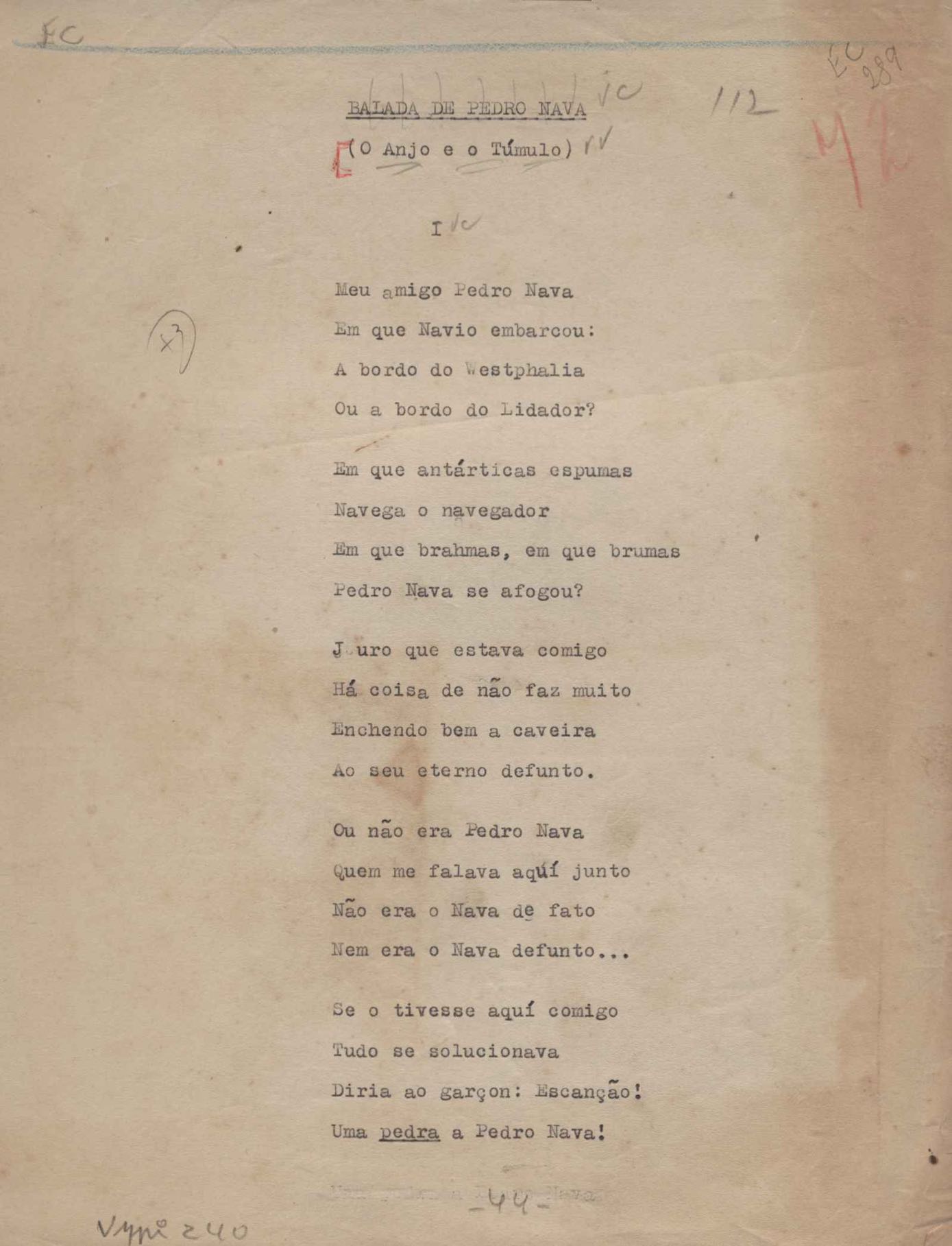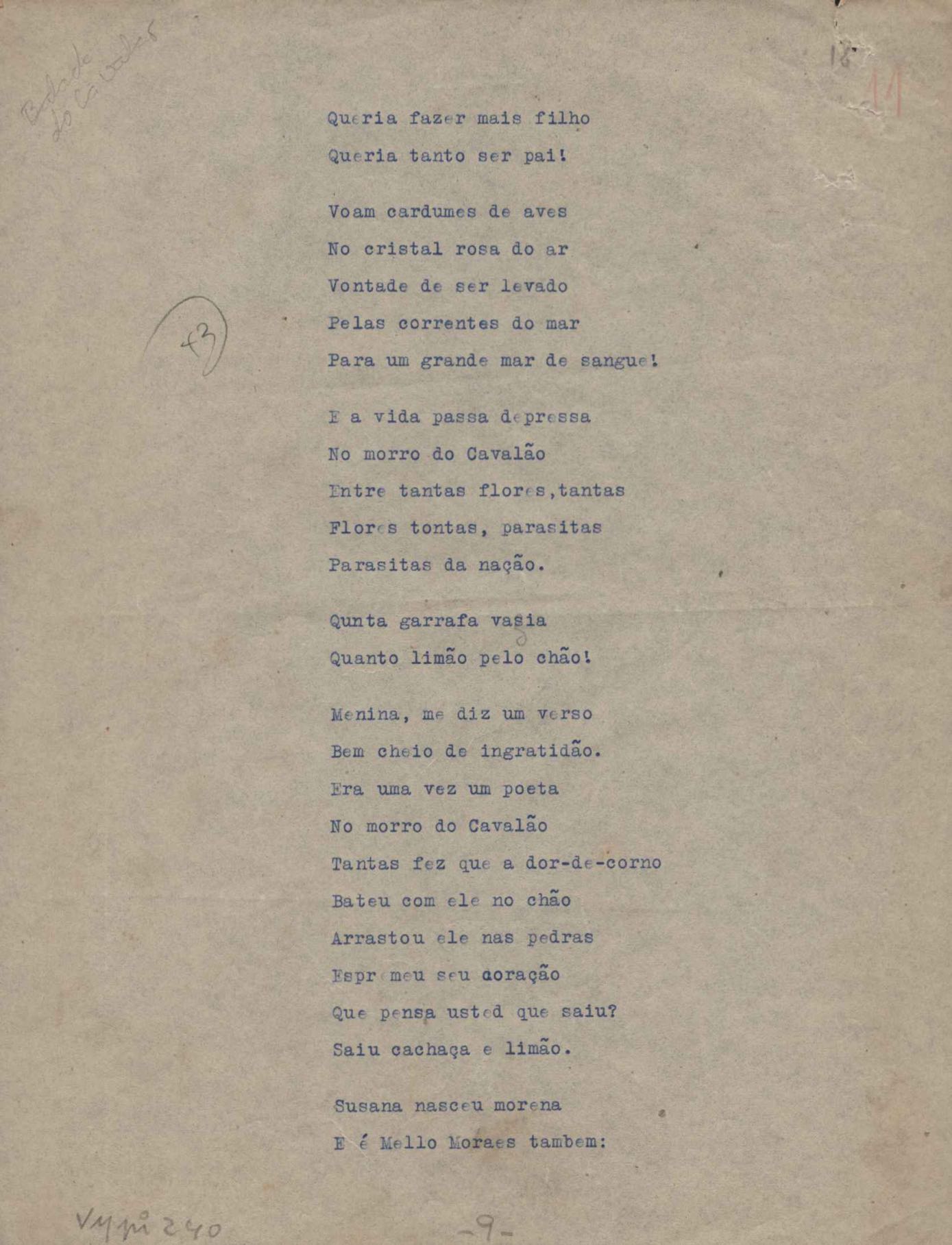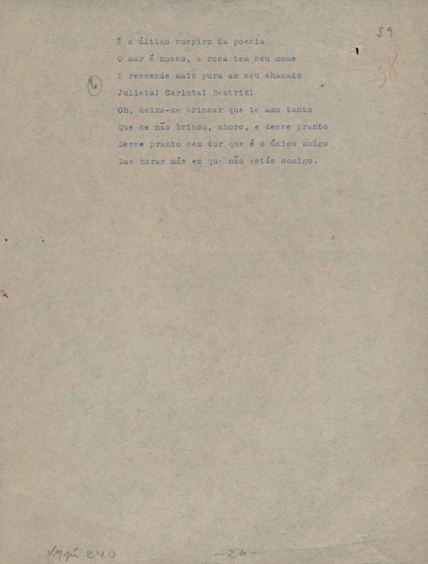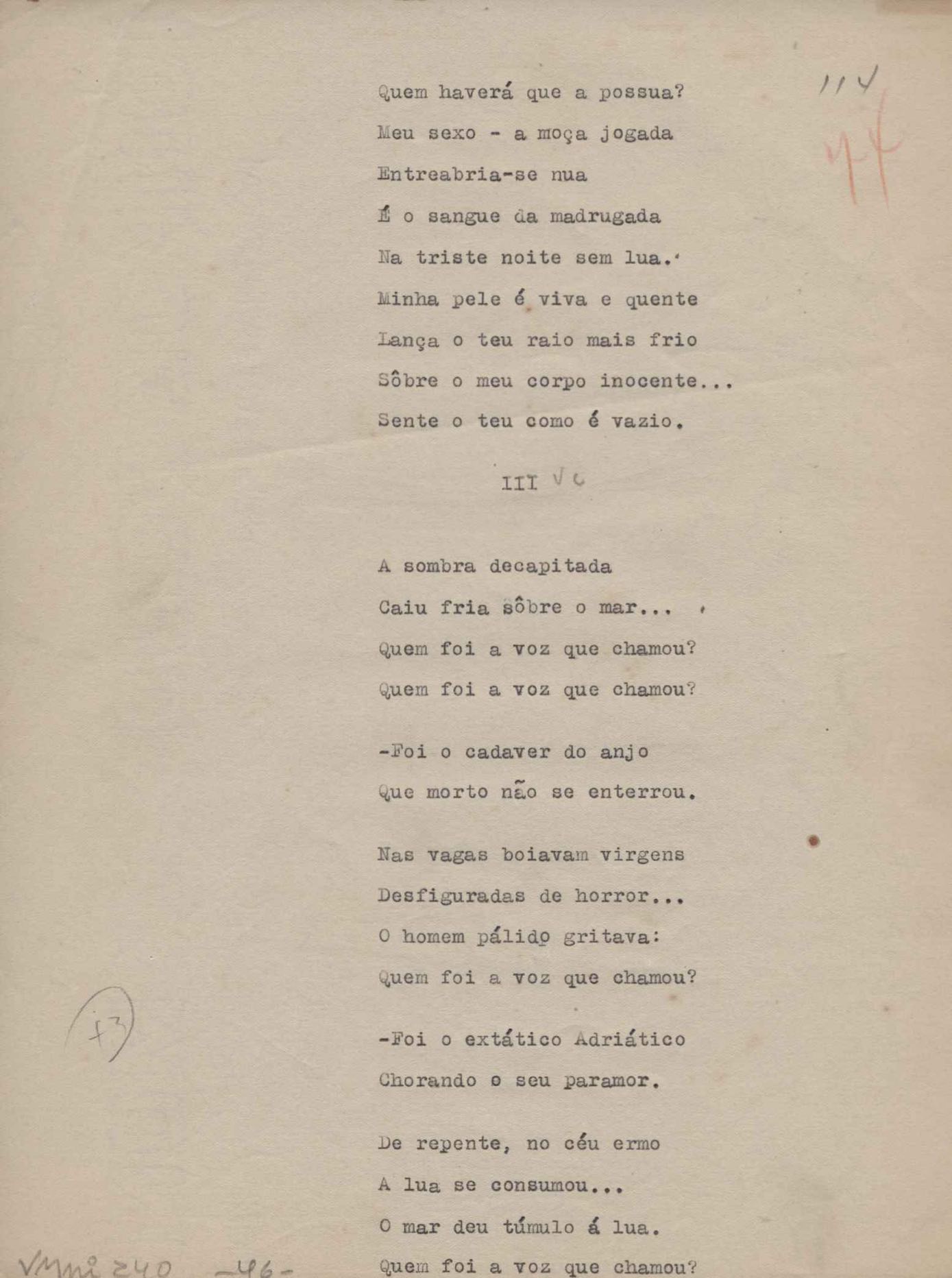 Poemas (52). "A um passarinho", "Os acrobatas", "Allegro", "O apelo", "Azul e branco", "balada da praia do Vidigal", "Balada das meninas de bicicleta", "Balada de Pedro Nava", "Balada do cavalão", "Balada do enterrado vivo", "Balada do mangue", "Barcarola", "Canção", "Cântico", "O dia da criação", "Epitáfio", "O escândalo da rosa", "Estrela polar", "Imitação de Rilke", "Lápide de Sinhazinha Ferreira", "Mar", "Marina", "Marinha", "A morte", "Notícia d'O Século", "Paisagem", "A partida", "Pescador", "Poema de Natal", "Quatro sonetos de meditação", "O riso", "Rosário", "Saudade de Manuel Bandeira", "Sinos de Oxford", "Sombra e luz", "Soneto a Otávio de Faria", "Soneto ao inverno", "Soneto da madrugada", "Soneto de Carnaval", "Soneto de despedida", "Soneto de fidelidade", "Soneto de Londres", "Soneto de quarta-feira de cinzas", "Soneto de separação", "Soneto de véspera", "Soneto do maior amor" e "Trecho". Anexo: 1. Prova tipográfica da primeira edição (incompleta); 2. Outras versões manuscritas e datilografadas, com emendas, exceto de: "Balada das meninas de bicicleta", "Marinha", "Notícia d'O Século", "Saudade de Manuel Bandeira" e "Soneto de despedida".