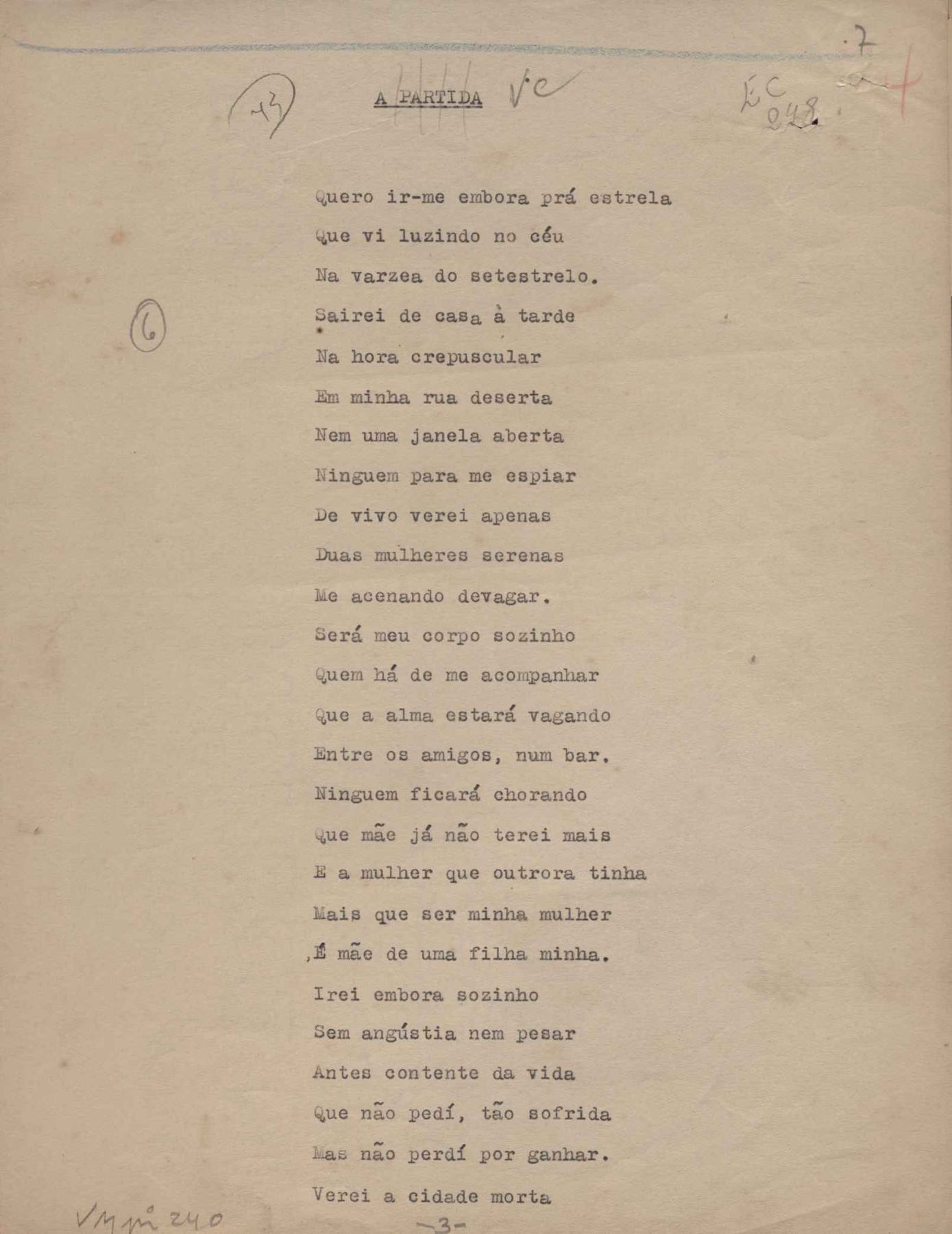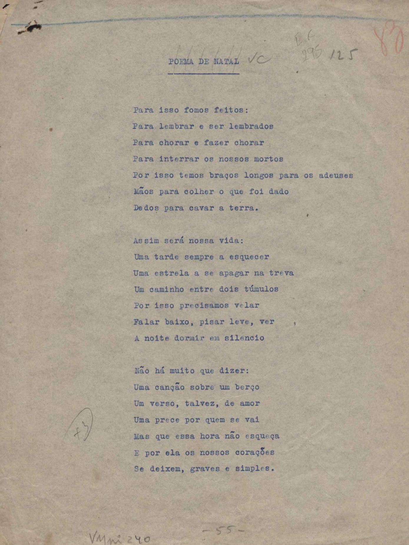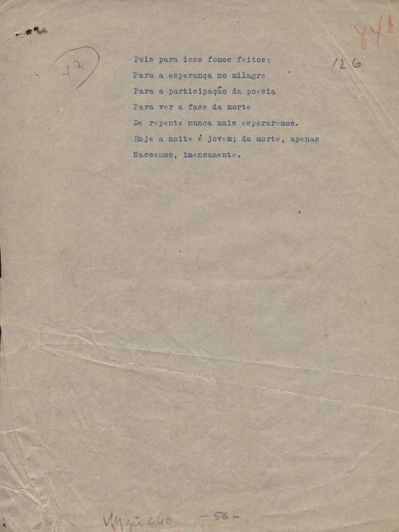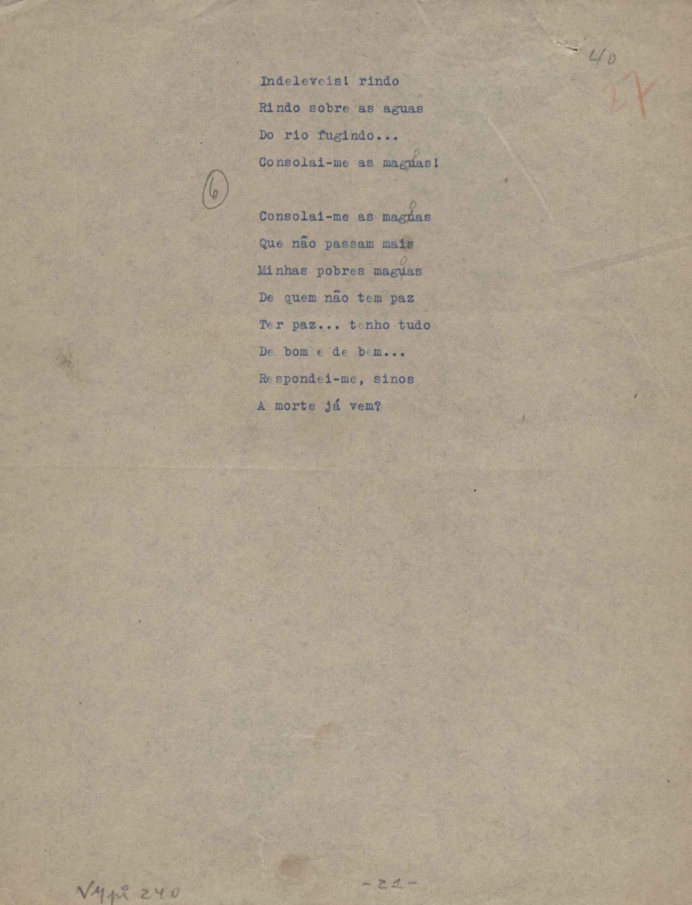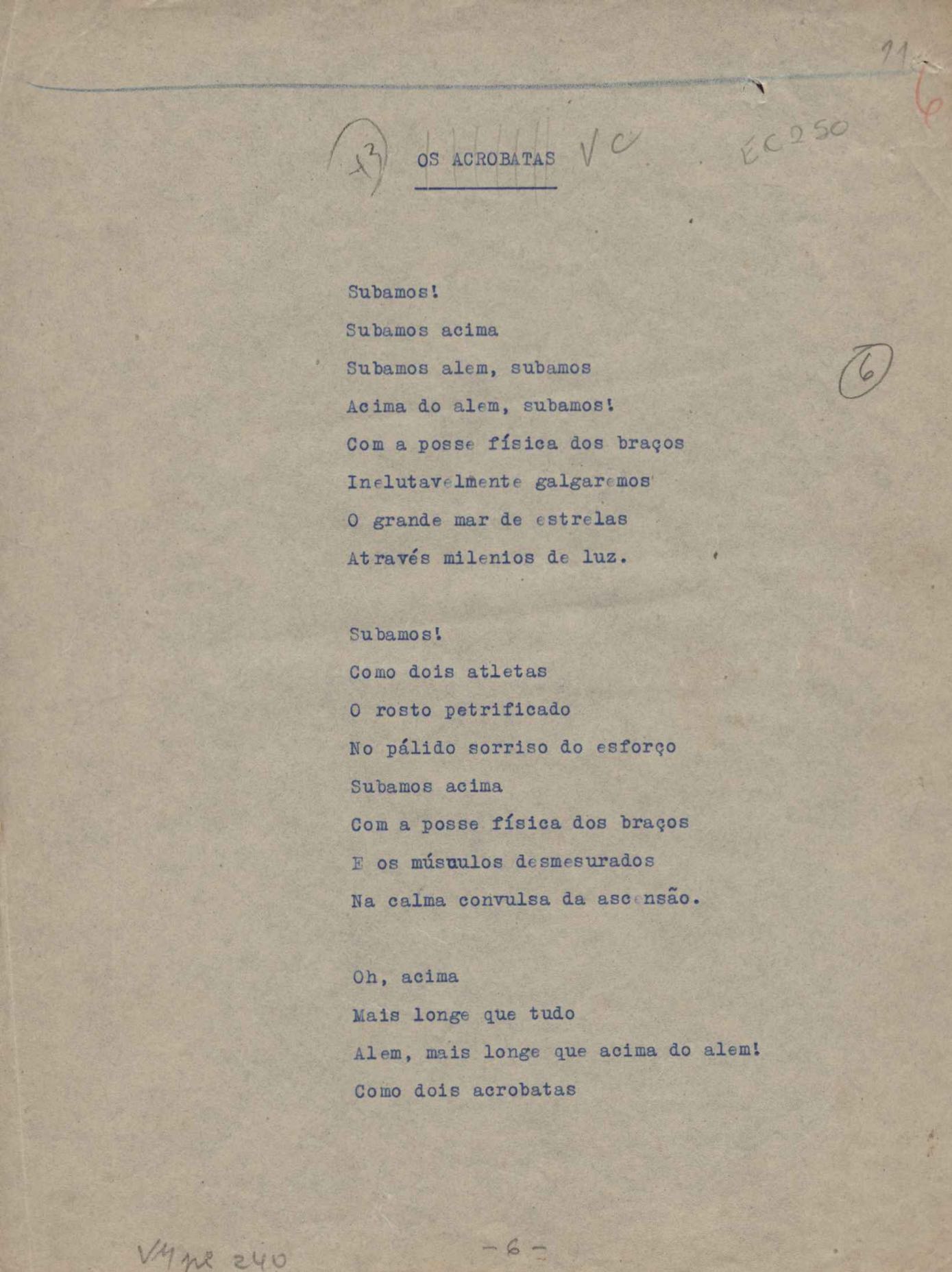 Poemas (52). "A um passarinho", "Os acrobatas", "Allegro", "O apelo", "Azul e branco", "balada da praia do Vidigal", "Balada das meninas de bicicleta", "Balada de Pedro Nava", "Balada do cavalão", "Balada do enterrado vivo", "Balada do mangue", "Barcarola", "Canção", "Cântico", "O dia da criação", "Epitáfio", "O escândalo da rosa", "Estrela polar", "Imitação de Rilke", "Lápide de Sinhazinha Ferreira", "Mar", "Marina", "Marinha", "A morte", "Notícia d'O Século", "Paisagem", "A partida", "Pescador", "Poema de Natal", "Quatro sonetos de meditação", "O riso", "Rosário", "Saudade de Manuel Bandeira", "Sinos de Oxford", "Sombra e luz", "Soneto a Otávio de Faria", "Soneto ao inverno", "Soneto da madrugada", "Soneto de Carnaval", "Soneto de despedida", "Soneto de fidelidade", "Soneto de Londres", "Soneto de quarta-feira de cinzas", "Soneto de separação", "Soneto de véspera", "Soneto do maior amor" e "Trecho". Anexo: 1. Prova tipográfica da primeira edição (incompleta); 2. Outras versões manuscritas e datilografadas, com emendas, exceto de: "Balada das meninas de bicicleta", "Marinha", "Notícia d'O Século", "Saudade de Manuel Bandeira" e "Soneto de despedida".