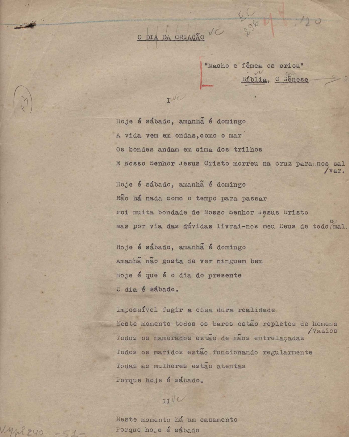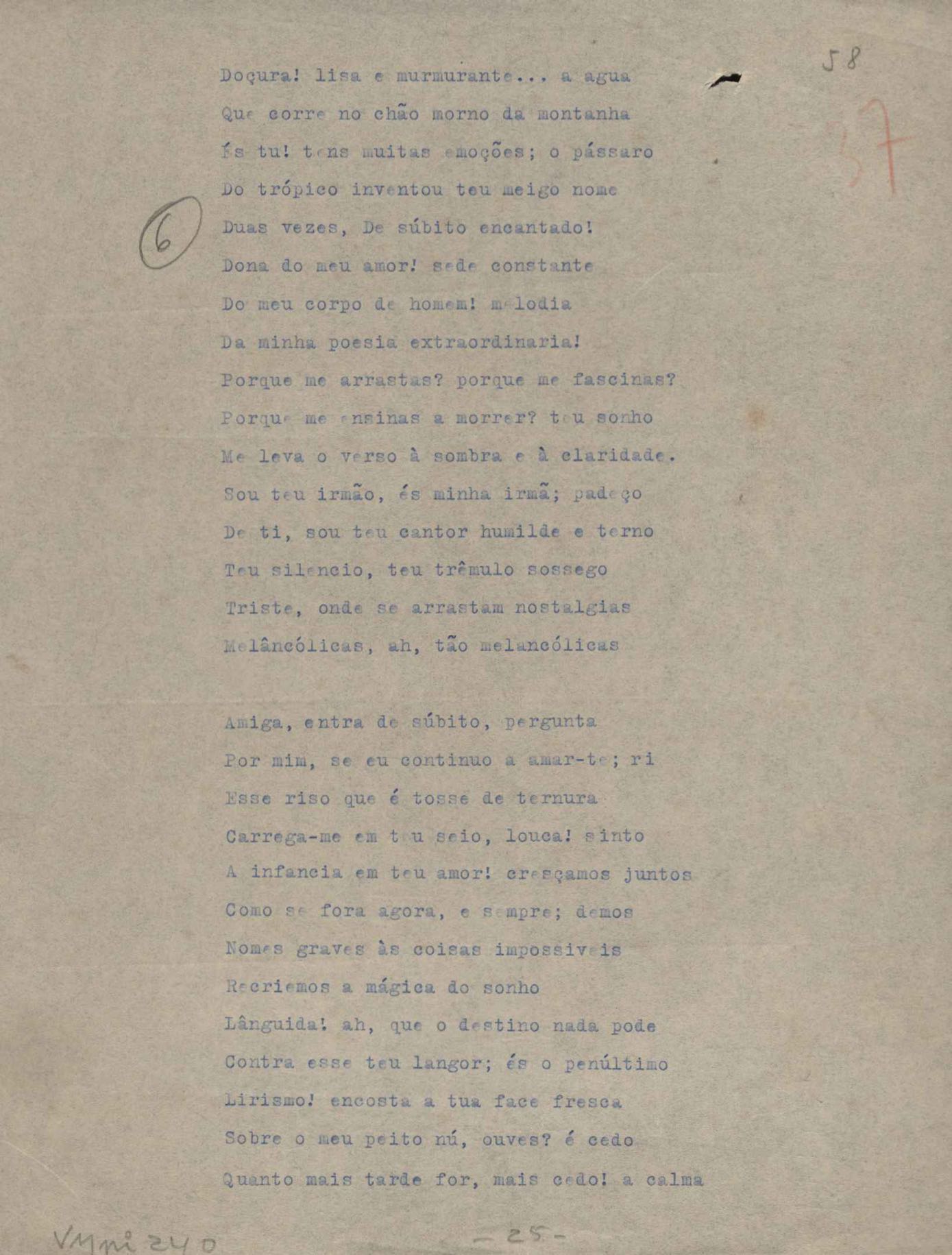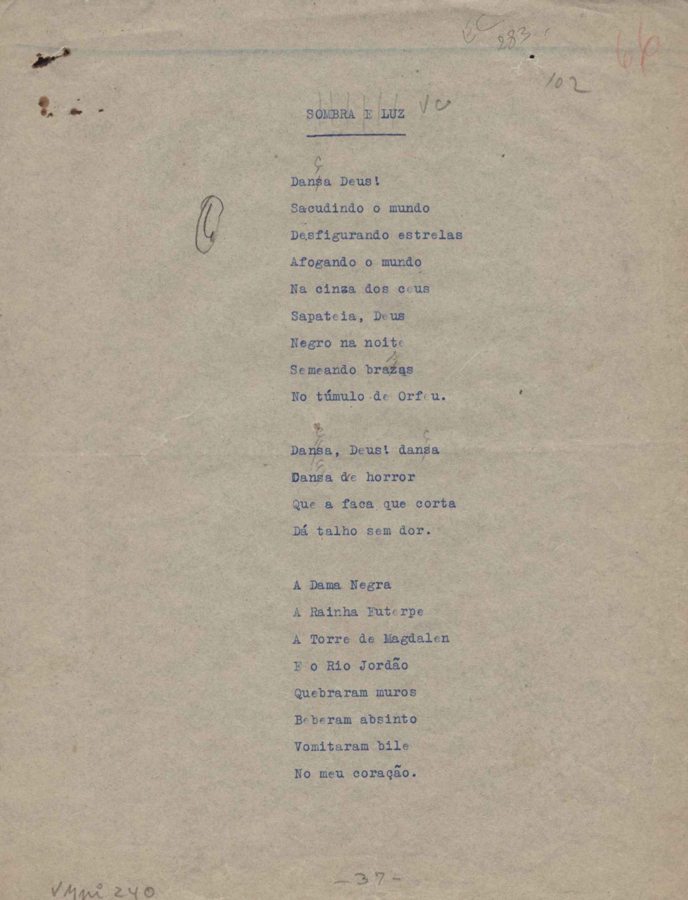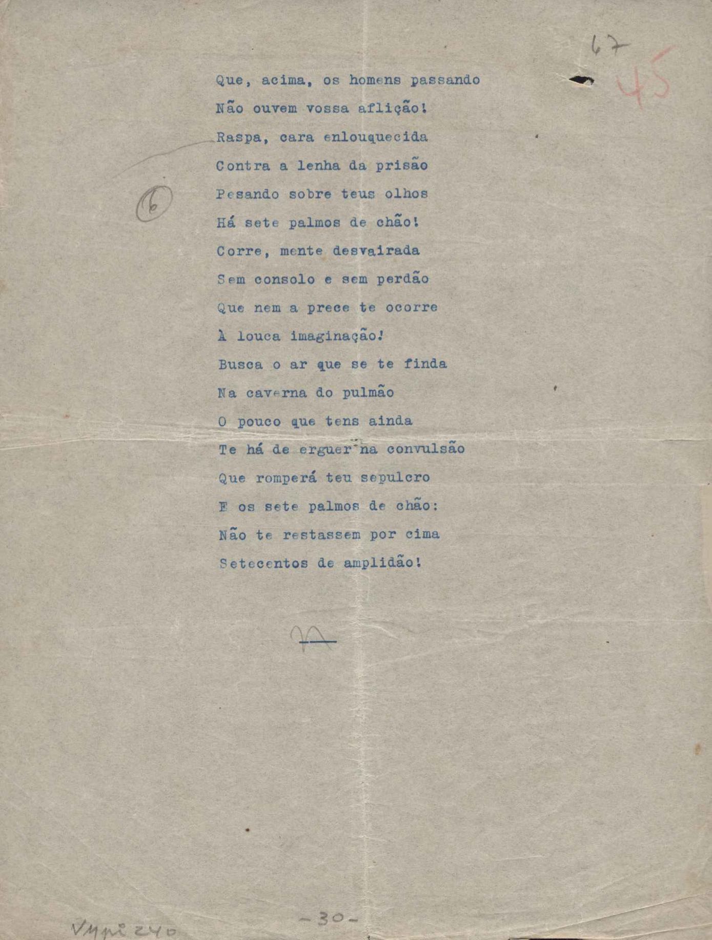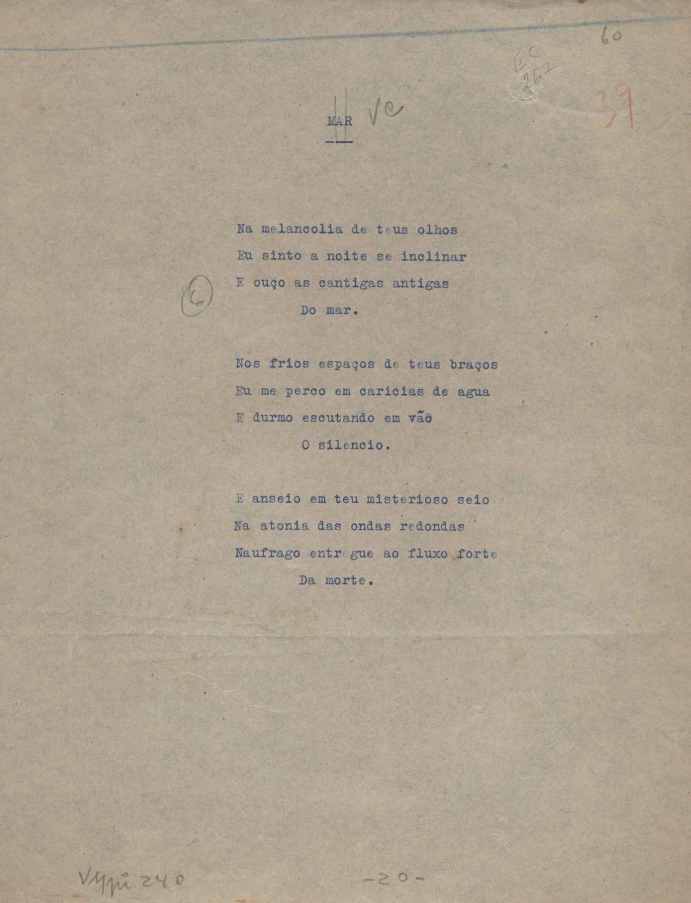 Poemas (52). "A um passarinho", "Os acrobatas", "Allegro", "O apelo", "Azul e branco", "balada da praia do Vidigal", "Balada das meninas de bicicleta", "Balada de Pedro Nava", "Balada do cavalão", "Balada do enterrado vivo", "Balada do mangue", "Barcarola", "Canção", "Cântico", "O dia da criação", "Epitáfio", "O escândalo da rosa", "Estrela polar", "Imitação de Rilke", "Lápide de Sinhazinha Ferreira", "Mar", "Marina", "Marinha", "A morte", "Notícia d'O Século", "Paisagem", "A partida", "Pescador", "Poema de Natal", "Quatro sonetos de meditação", "O riso", "Rosário", "Saudade de Manuel Bandeira", "Sinos de Oxford", "Sombra e luz", "Soneto a Otávio de Faria", "Soneto ao inverno", "Soneto da madrugada", "Soneto de Carnaval", "Soneto de despedida", "Soneto de fidelidade", "Soneto de Londres", "Soneto de quarta-feira de cinzas", "Soneto de separação", "Soneto de véspera", "Soneto do maior amor" e "Trecho". Anexo: 1. Prova tipográfica da primeira edição (incompleta); 2. Outras versões manuscritas e datilografadas, com emendas, exceto de: "Balada das meninas de bicicleta", "Marinha", "Notícia d'O Século", "Saudade de Manuel Bandeira" e "Soneto de despedida".