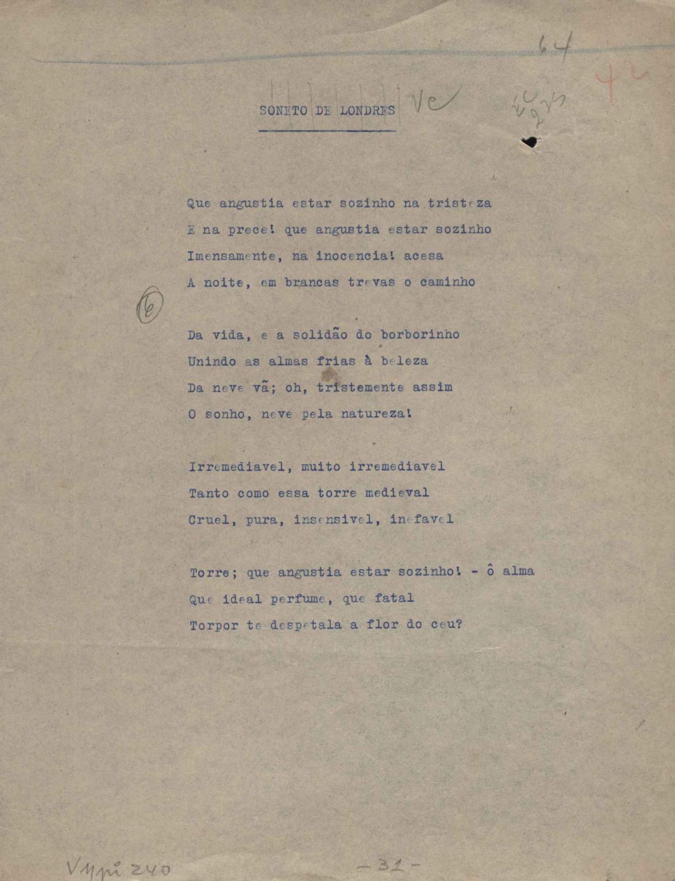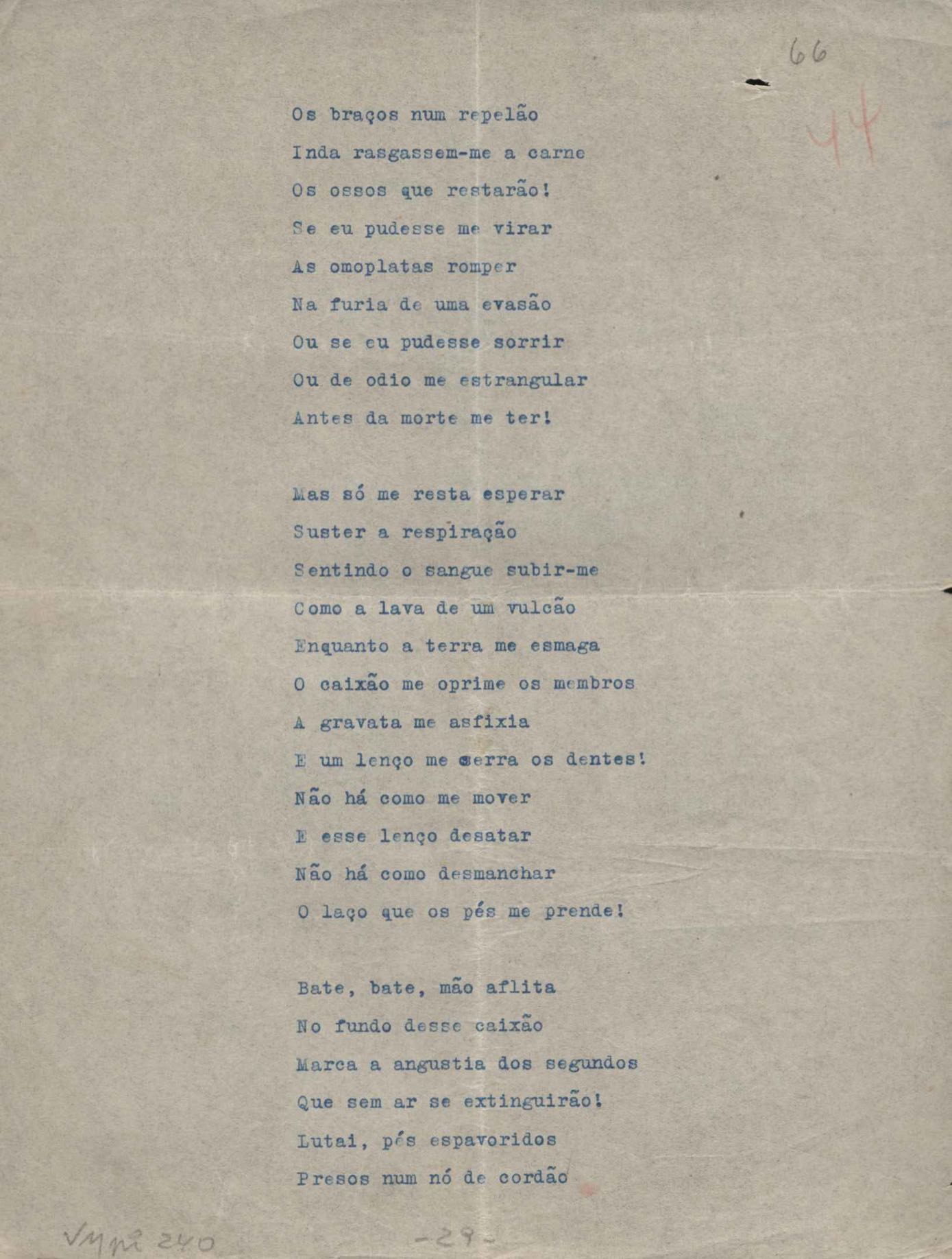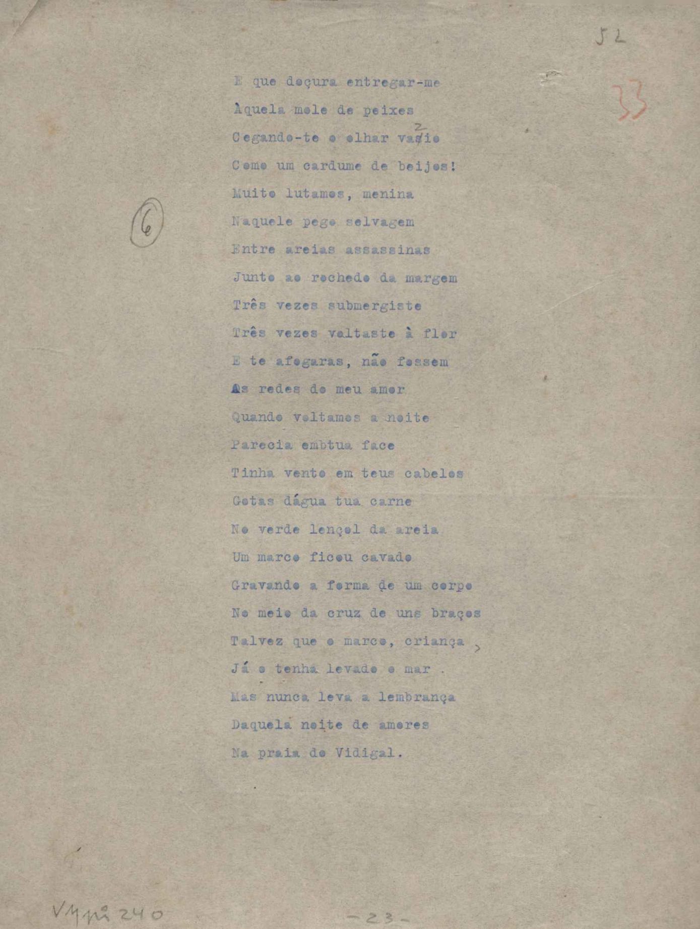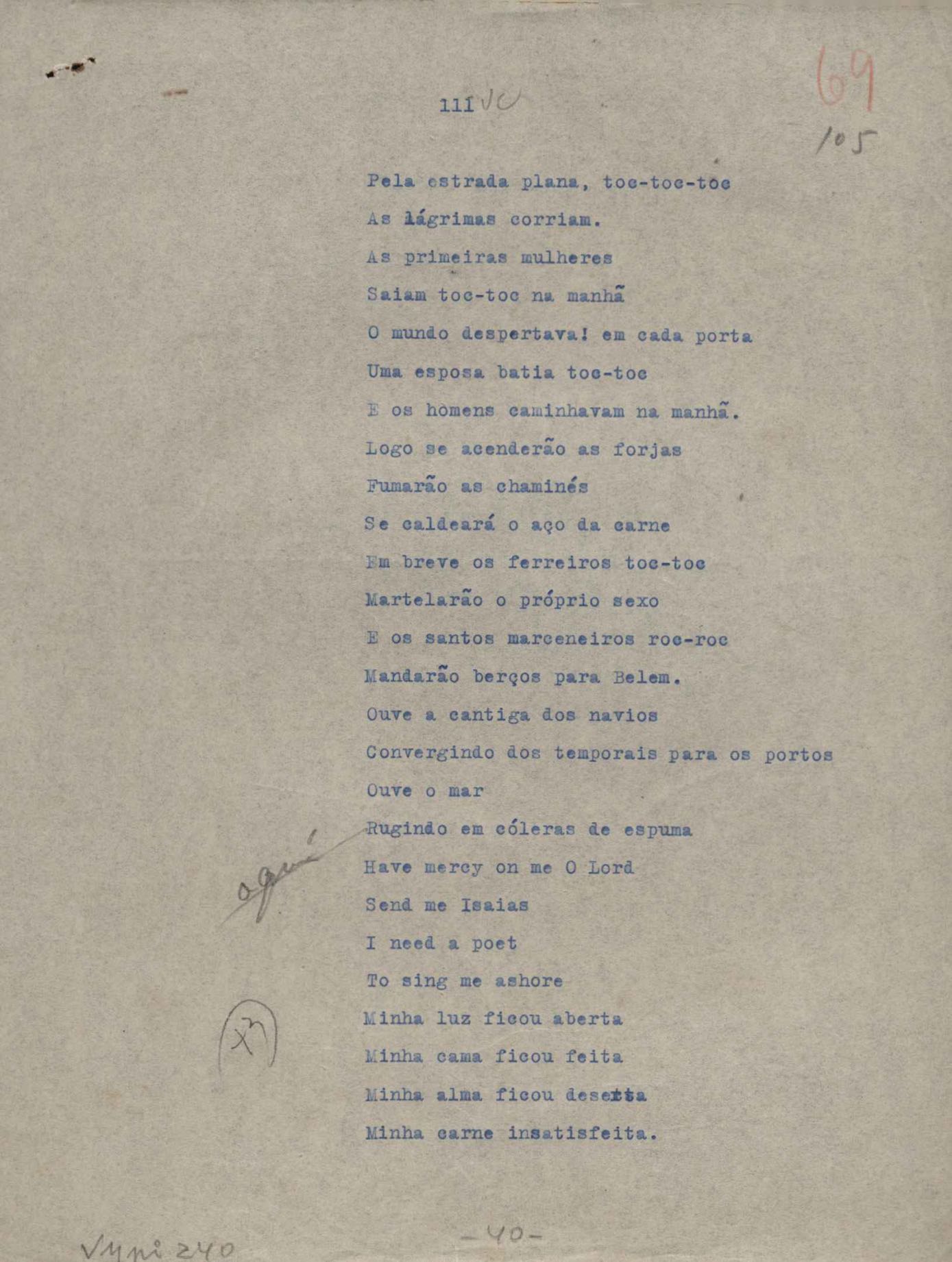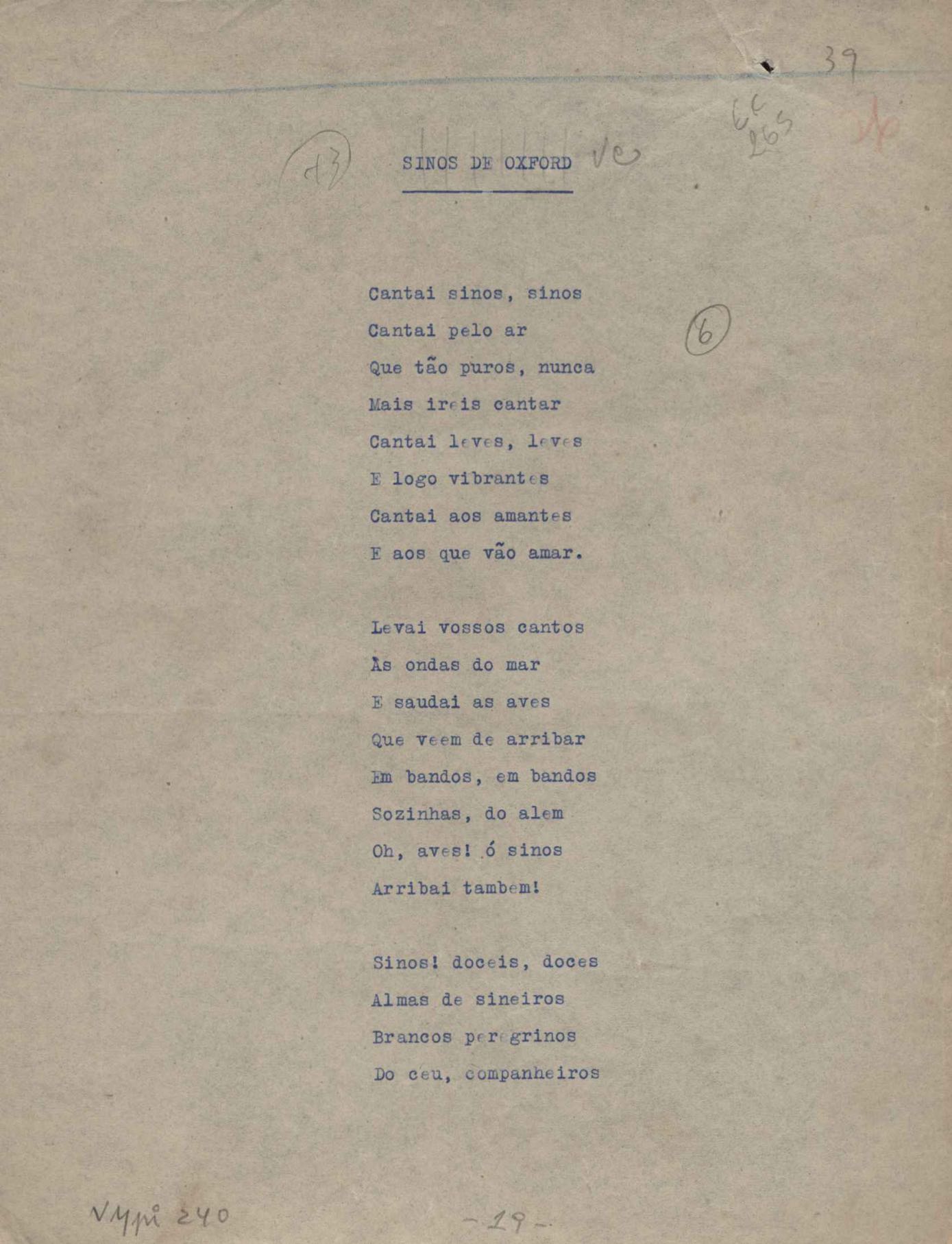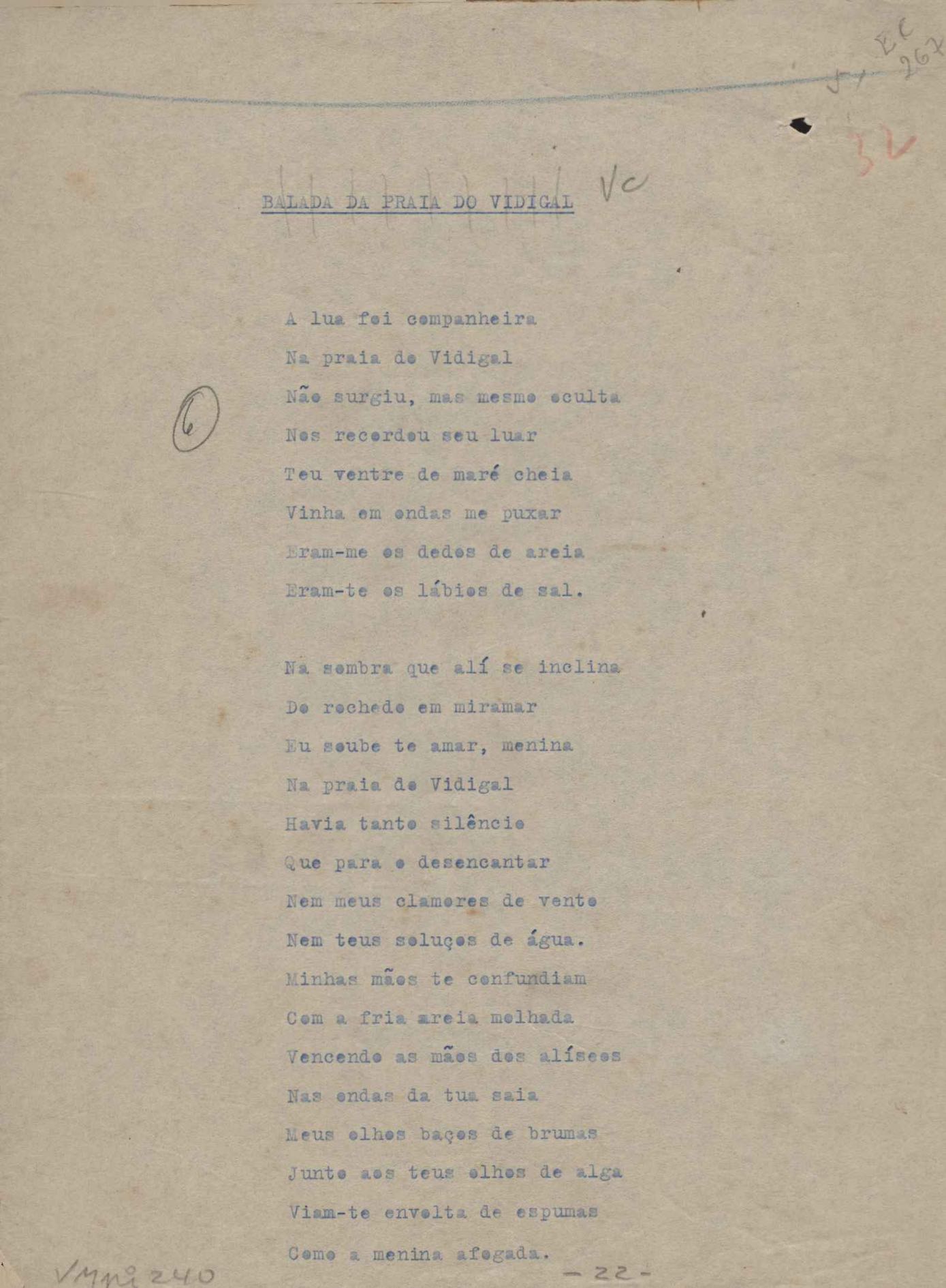 Poemas (52). "A um passarinho", "Os acrobatas", "Allegro", "O apelo", "Azul e branco", "balada da praia do Vidigal", "Balada das meninas de bicicleta", "Balada de Pedro Nava", "Balada do cavalão", "Balada do enterrado vivo", "Balada do mangue", "Barcarola", "Canção", "Cântico", "O dia da criação", "Epitáfio", "O escândalo da rosa", "Estrela polar", "Imitação de Rilke", "Lápide de Sinhazinha Ferreira", "Mar", "Marina", "Marinha", "A morte", "Notícia d'O Século", "Paisagem", "A partida", "Pescador", "Poema de Natal", "Quatro sonetos de meditação", "O riso", "Rosário", "Saudade de Manuel Bandeira", "Sinos de Oxford", "Sombra e luz", "Soneto a Otávio de Faria", "Soneto ao inverno", "Soneto da madrugada", "Soneto de Carnaval", "Soneto de despedida", "Soneto de fidelidade", "Soneto de Londres", "Soneto de quarta-feira de cinzas", "Soneto de separação", "Soneto de véspera", "Soneto do maior amor" e "Trecho". Anexo: 1. Prova tipográfica da primeira edição (incompleta); 2. Outras versões manuscritas e datilografadas, com emendas, exceto de: "Balada das meninas de bicicleta", "Marinha", "Notícia d'O Século", "Saudade de Manuel Bandeira" e "Soneto de despedida".