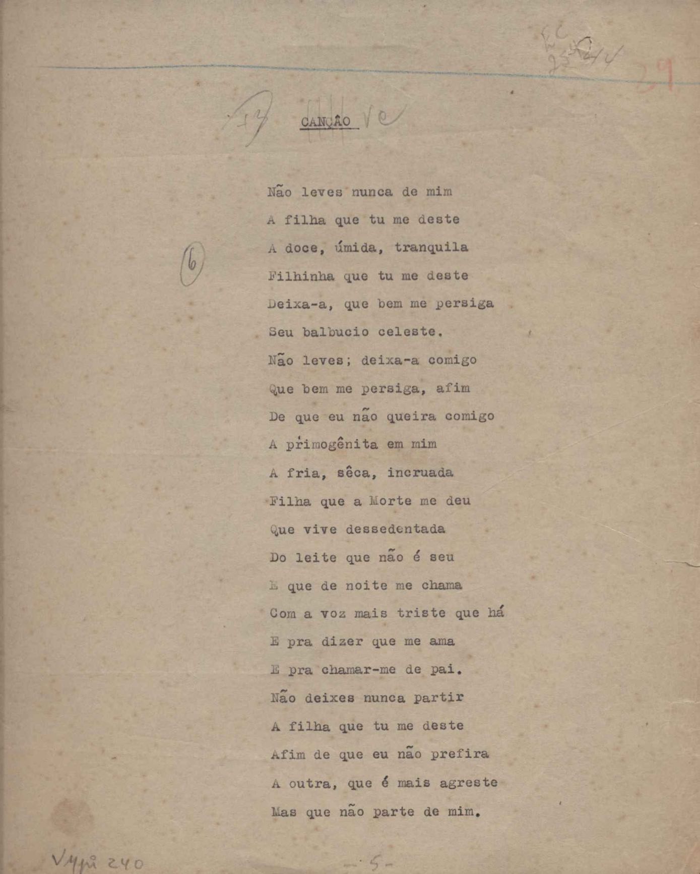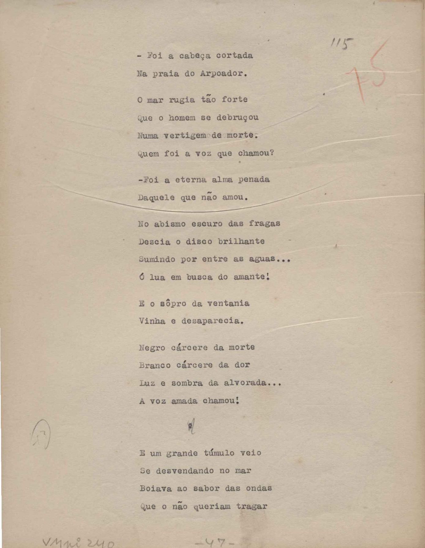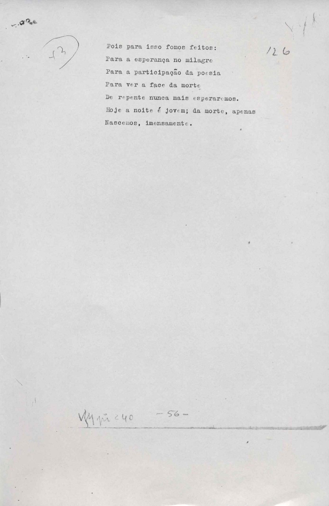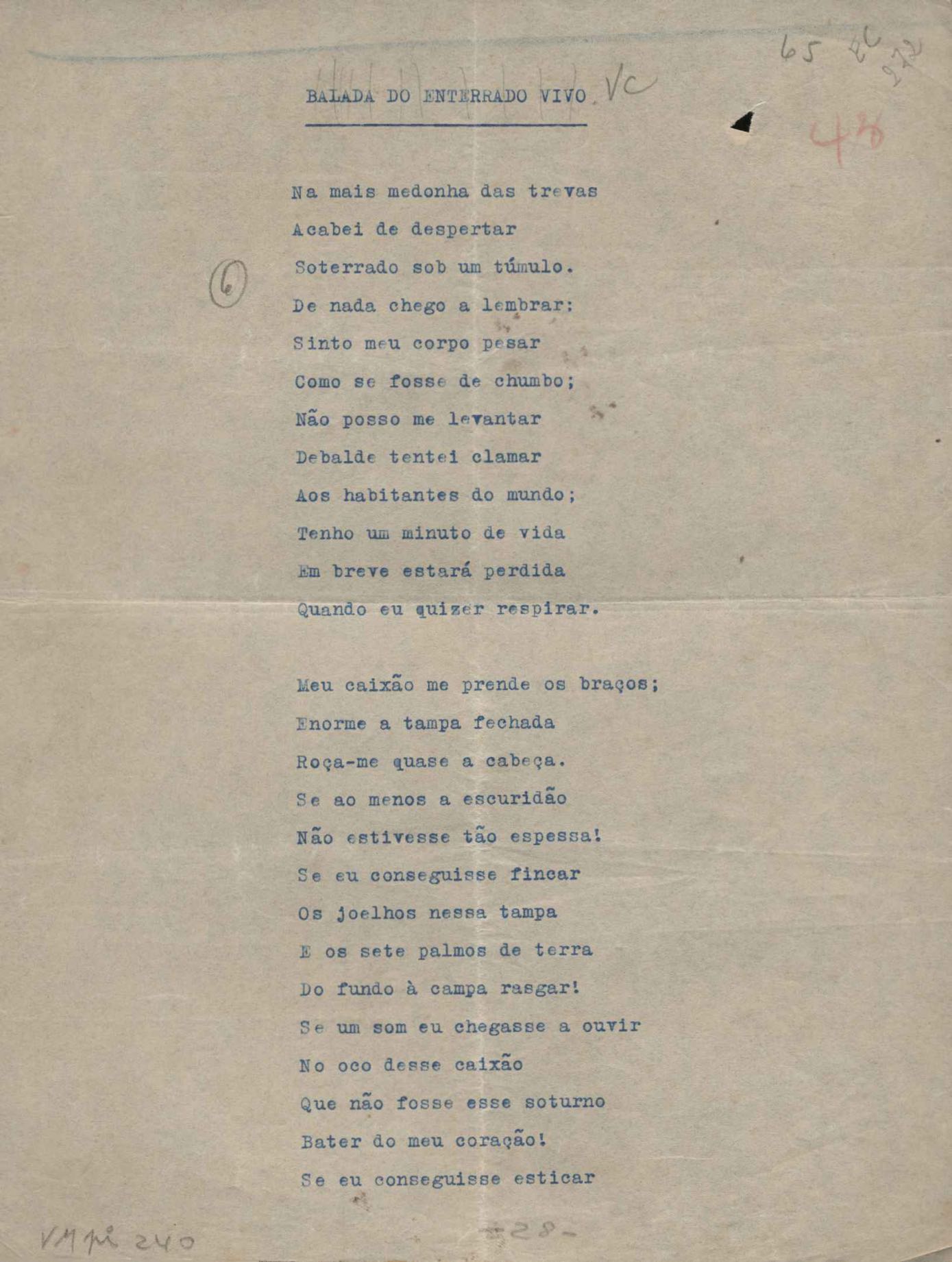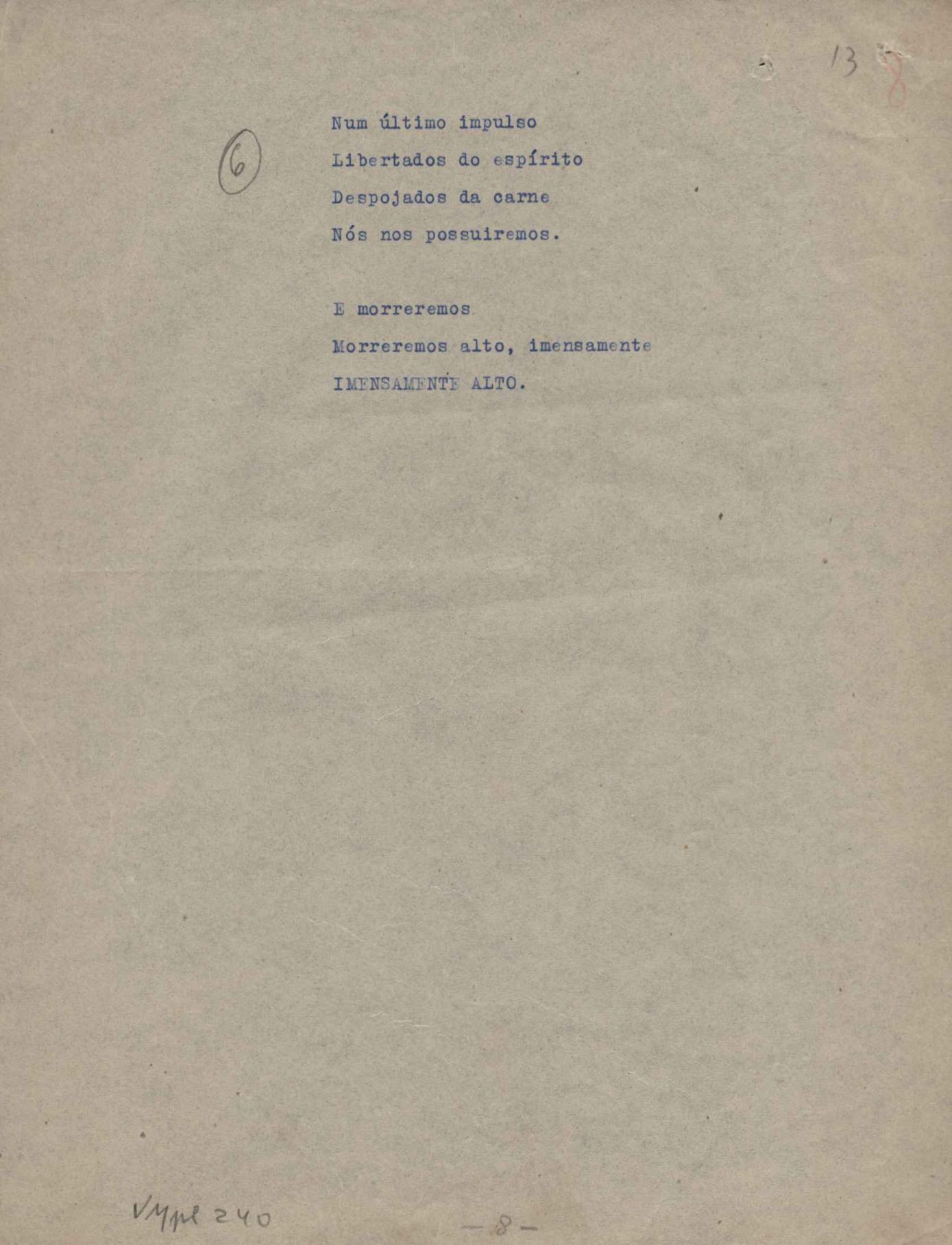 Poemas (52). "A um passarinho", "Os acrobatas", "Allegro", "O apelo", "Azul e branco", "balada da praia do Vidigal", "Balada das meninas de bicicleta", "Balada de Pedro Nava", "Balada do cavalão", "Balada do enterrado vivo", "Balada do mangue", "Barcarola", "Canção", "Cântico", "O dia da criação", "Epitáfio", "O escândalo da rosa", "Estrela polar", "Imitação de Rilke", "Lápide de Sinhazinha Ferreira", "Mar", "Marina", "Marinha", "A morte", "Notícia d'O Século", "Paisagem", "A partida", "Pescador", "Poema de Natal", "Quatro sonetos de meditação", "O riso", "Rosário", "Saudade de Manuel Bandeira", "Sinos de Oxford", "Sombra e luz", "Soneto a Otávio de Faria", "Soneto ao inverno", "Soneto da madrugada", "Soneto de Carnaval", "Soneto de despedida", "Soneto de fidelidade", "Soneto de Londres", "Soneto de quarta-feira de cinzas", "Soneto de separação", "Soneto de véspera", "Soneto do maior amor" e "Trecho". Anexo: 1. Prova tipográfica da primeira edição (incompleta); 2. Outras versões manuscritas e datilografadas, com emendas, exceto de: "Balada das meninas de bicicleta", "Marinha", "Notícia d'O Século", "Saudade de Manuel Bandeira" e "Soneto de despedida".