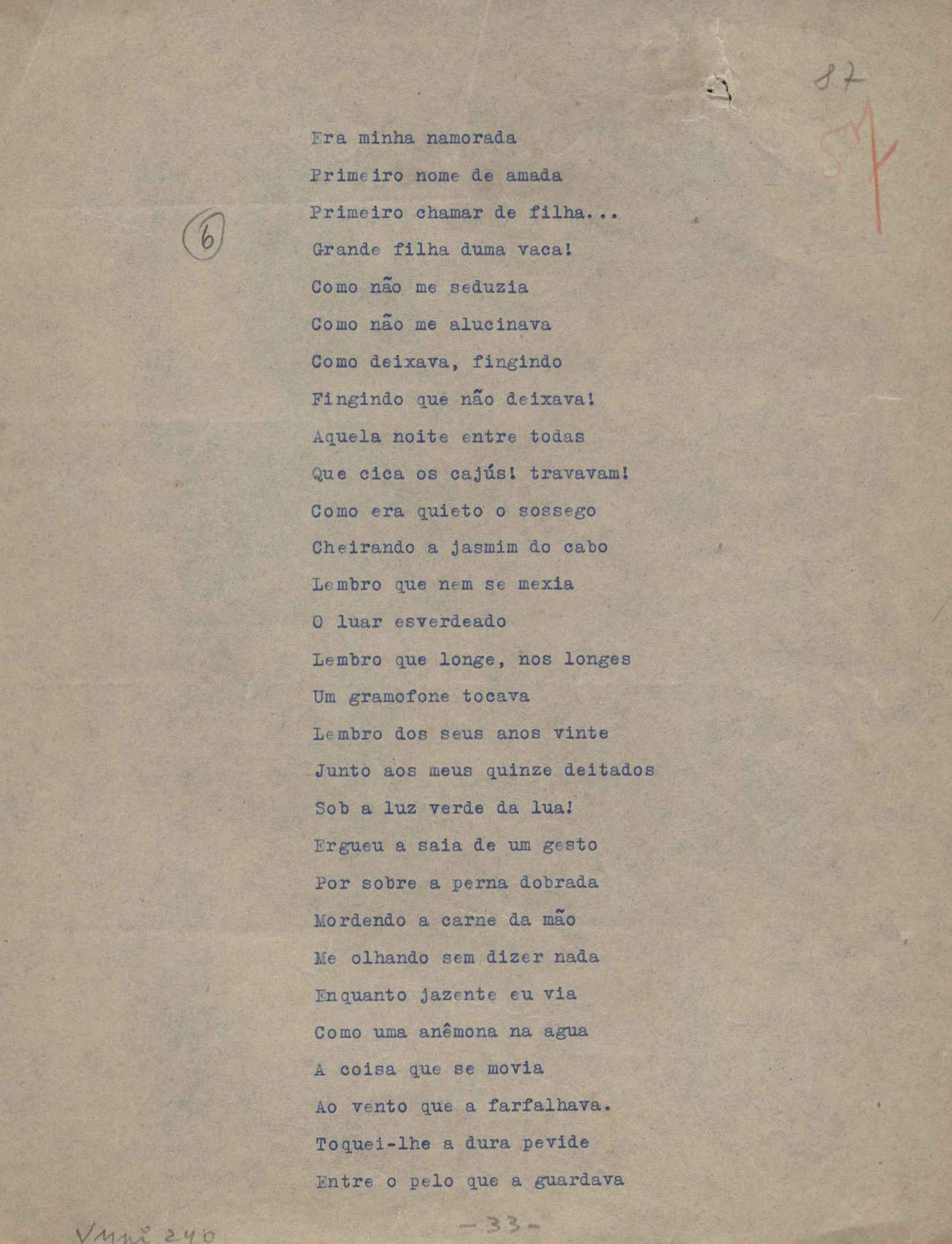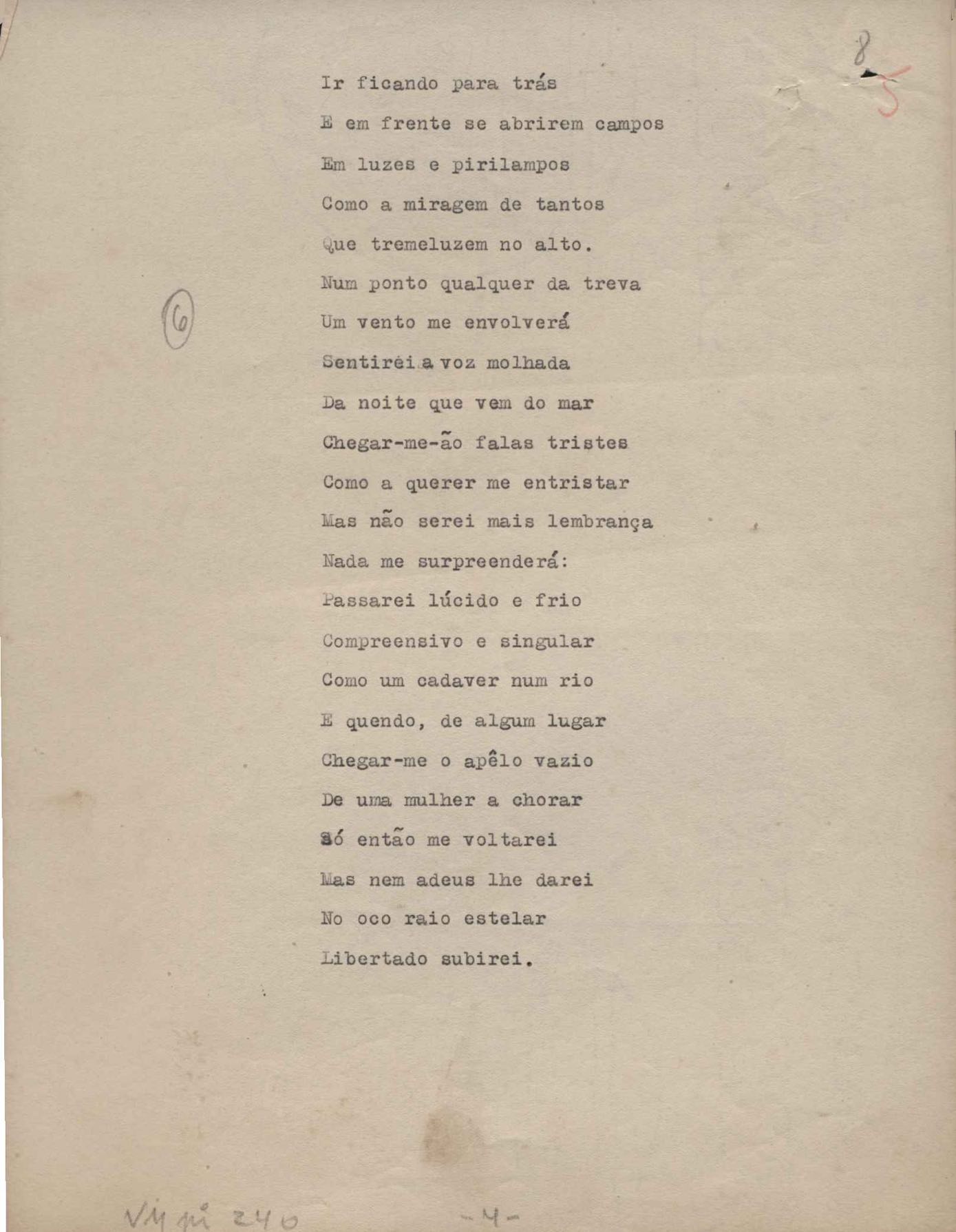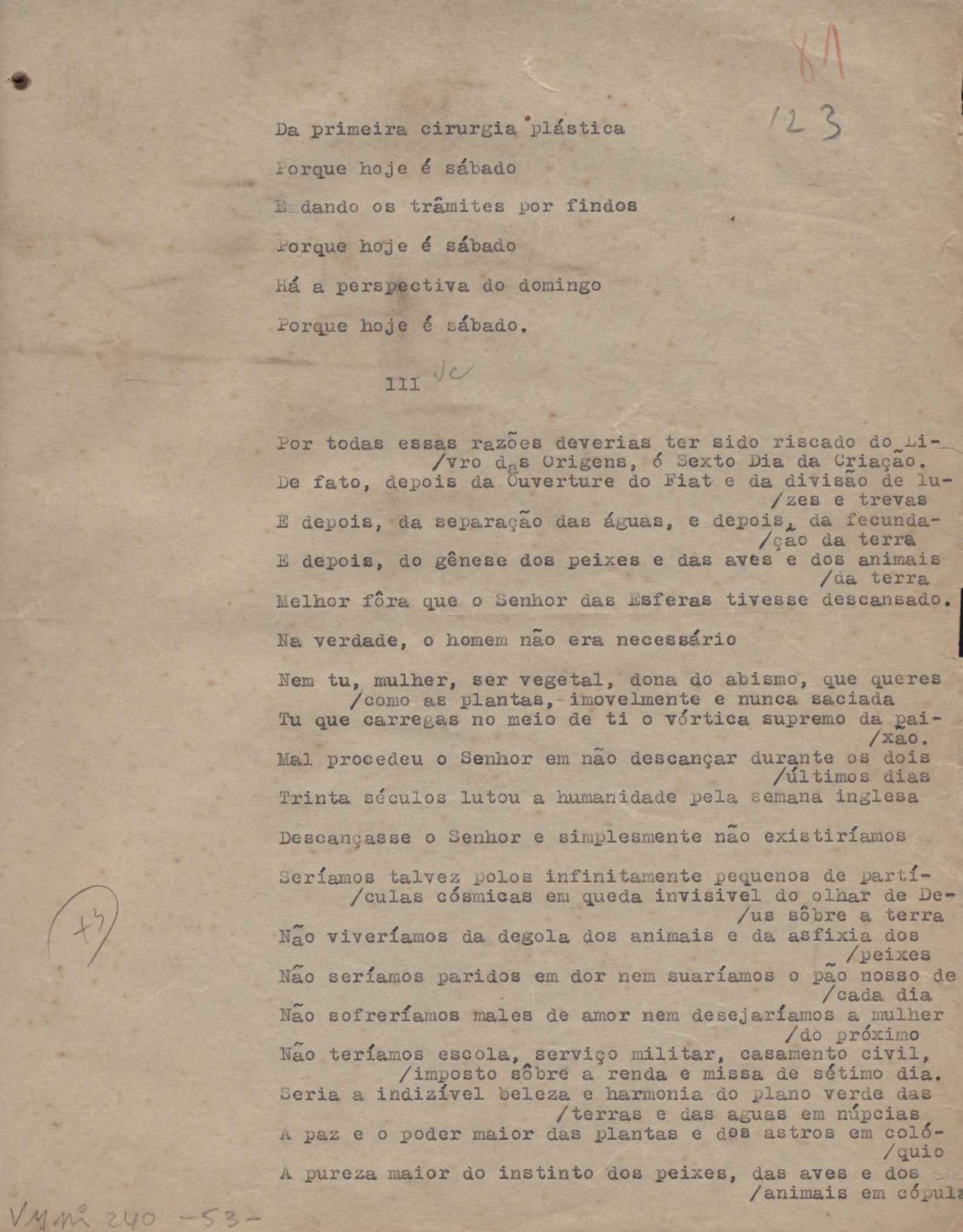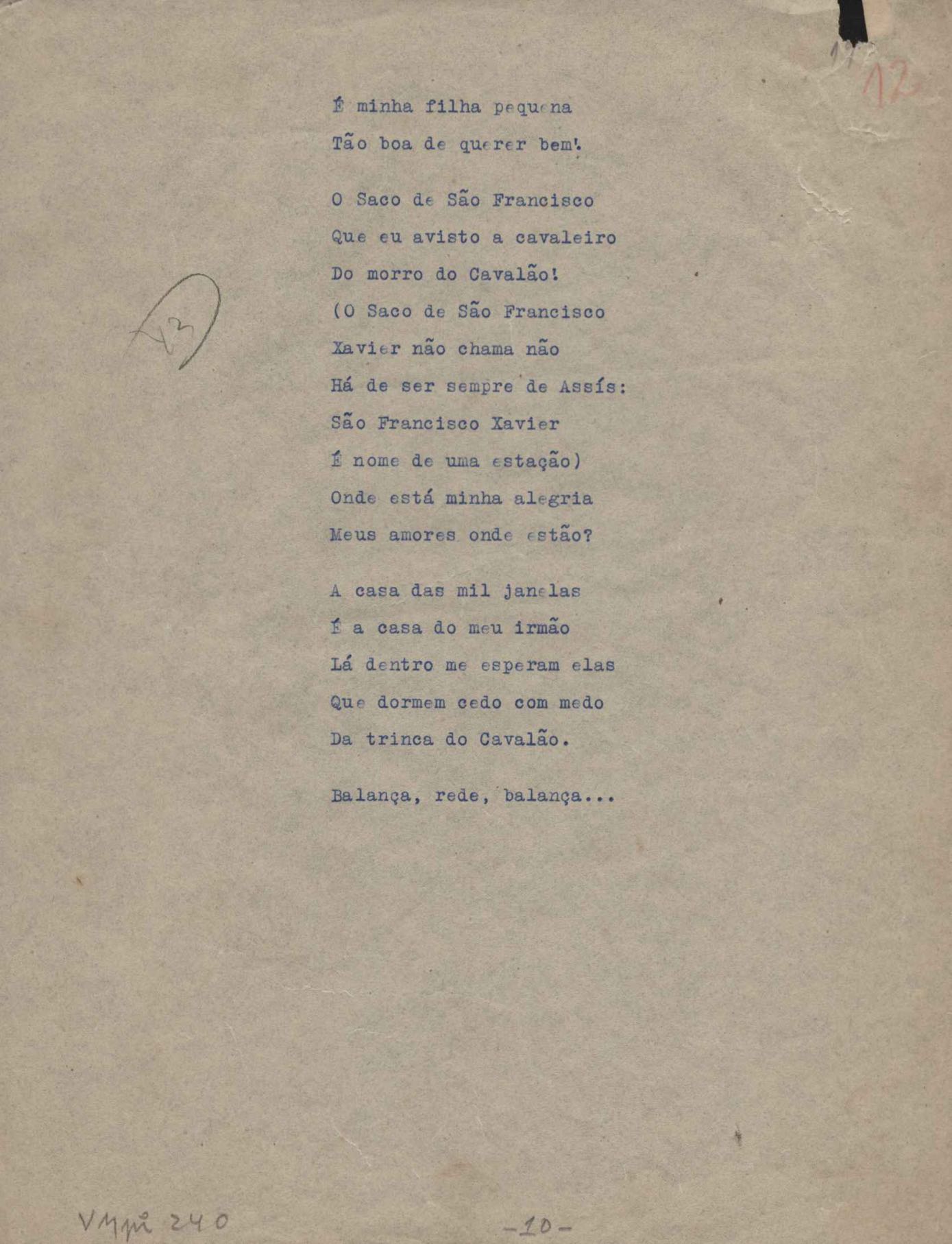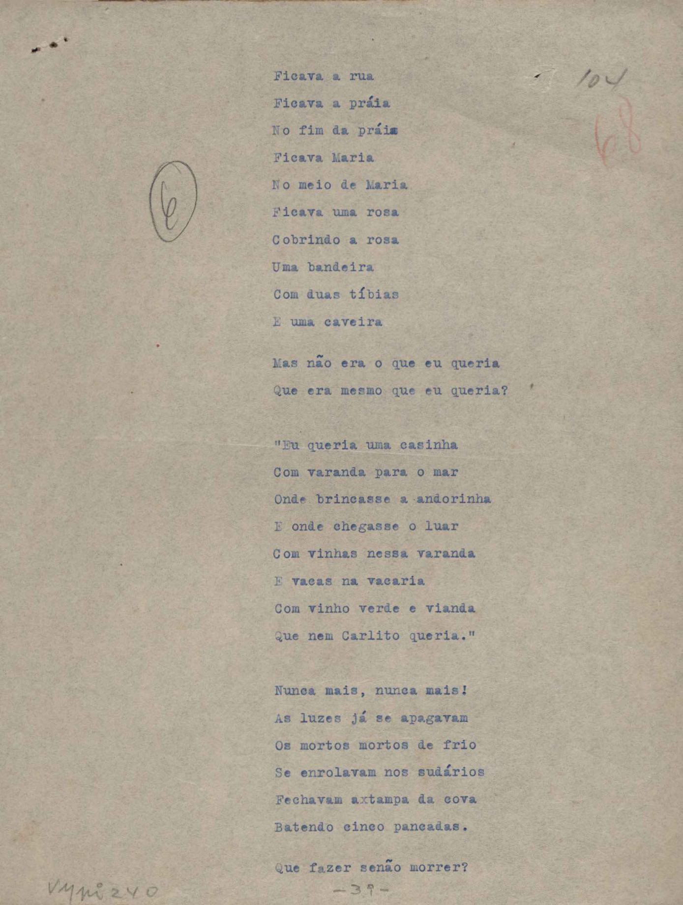 Poemas (52). "A um passarinho", "Os acrobatas", "Allegro", "O apelo", "Azul e branco", "balada da praia do Vidigal", "Balada das meninas de bicicleta", "Balada de Pedro Nava", "Balada do cavalão", "Balada do enterrado vivo", "Balada do mangue", "Barcarola", "Canção", "Cântico", "O dia da criação", "Epitáfio", "O escândalo da rosa", "Estrela polar", "Imitação de Rilke", "Lápide de Sinhazinha Ferreira", "Mar", "Marina", "Marinha", "A morte", "Notícia d'O Século", "Paisagem", "A partida", "Pescador", "Poema de Natal", "Quatro sonetos de meditação", "O riso", "Rosário", "Saudade de Manuel Bandeira", "Sinos de Oxford", "Sombra e luz", "Soneto a Otávio de Faria", "Soneto ao inverno", "Soneto da madrugada", "Soneto de Carnaval", "Soneto de despedida", "Soneto de fidelidade", "Soneto de Londres", "Soneto de quarta-feira de cinzas", "Soneto de separação", "Soneto de véspera", "Soneto do maior amor" e "Trecho". Anexo: 1. Prova tipográfica da primeira edição (incompleta); 2. Outras versões manuscritas e datilografadas, com emendas, exceto de: "Balada das meninas de bicicleta", "Marinha", "Notícia d'O Século", "Saudade de Manuel Bandeira" e "Soneto de despedida".