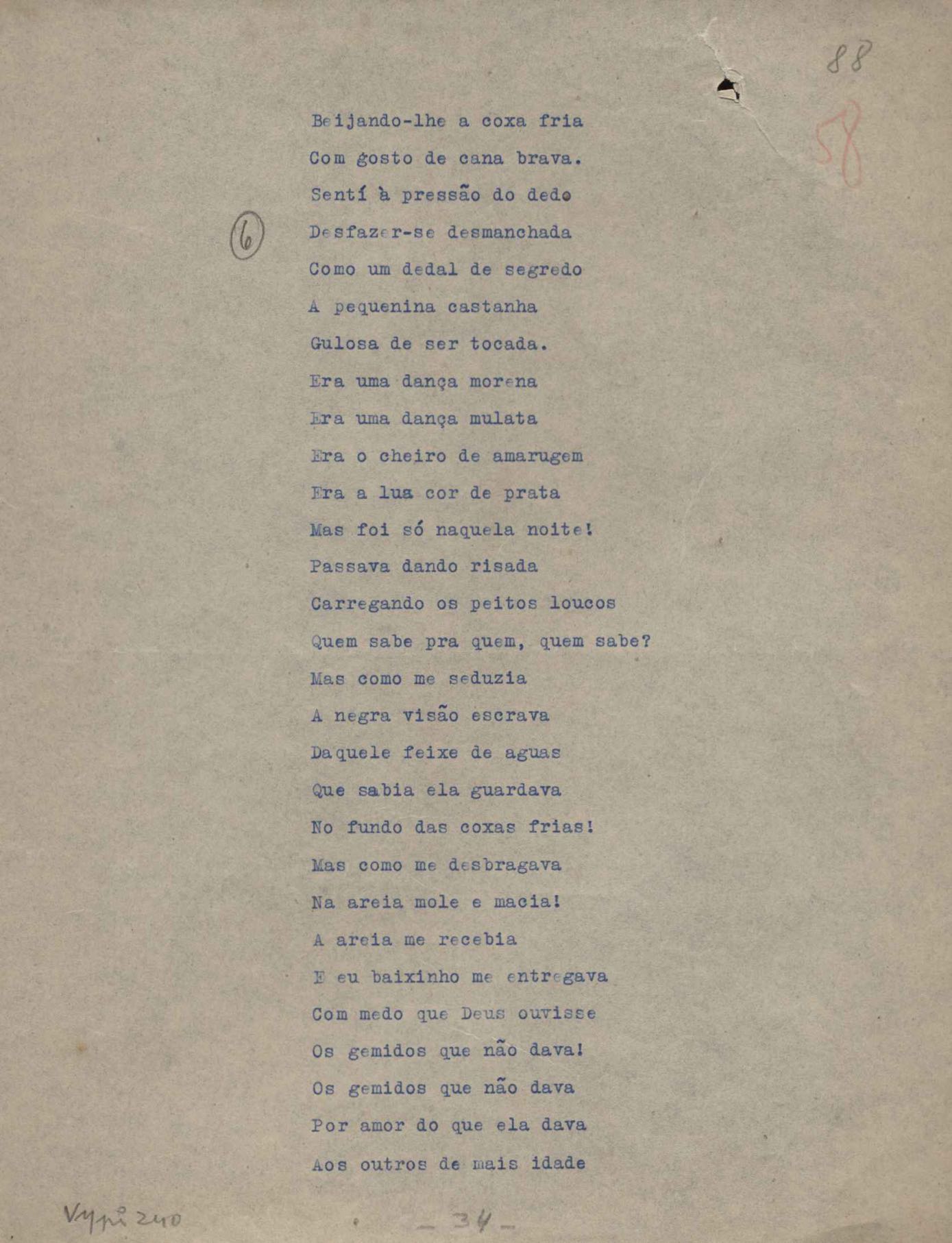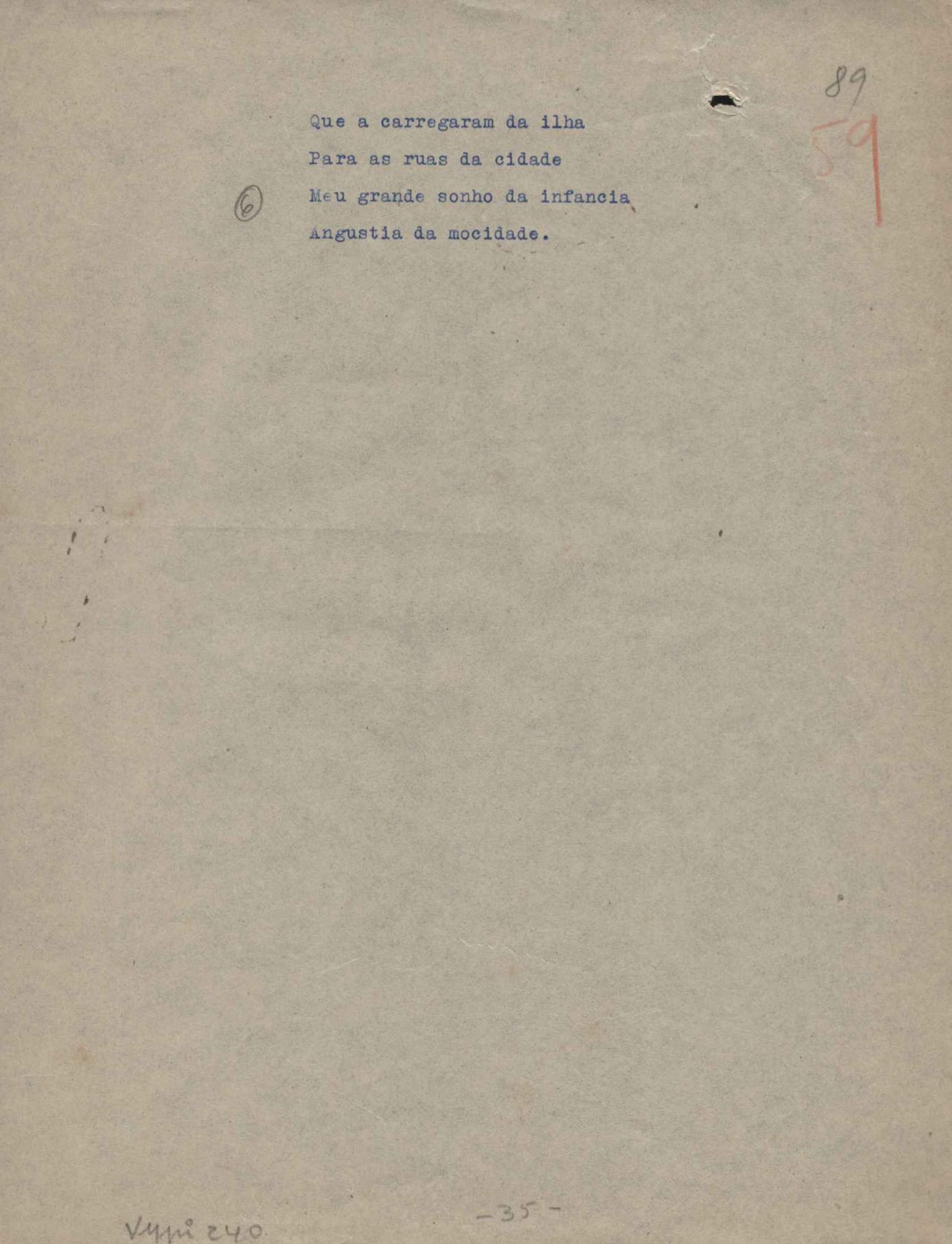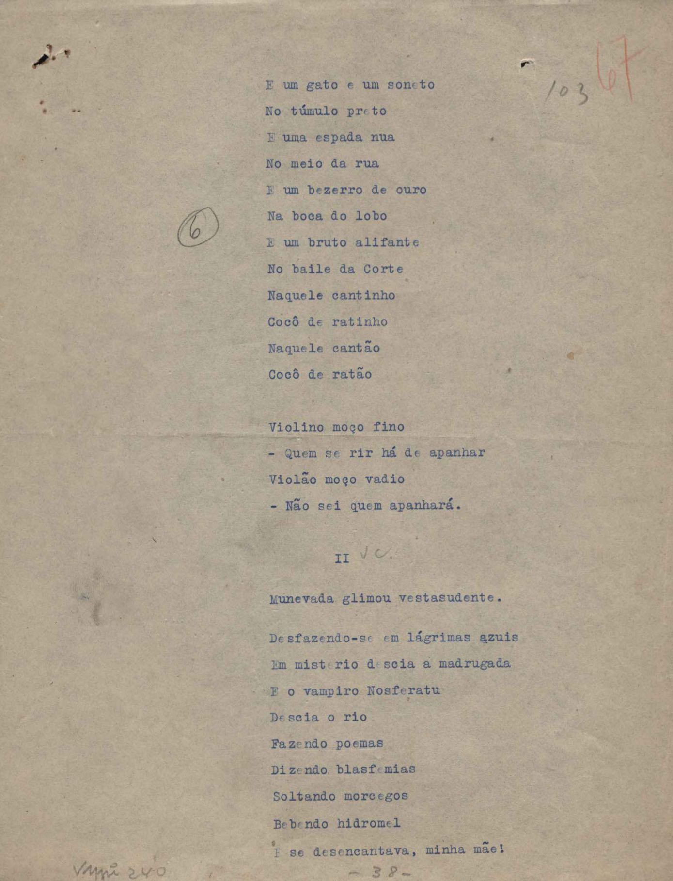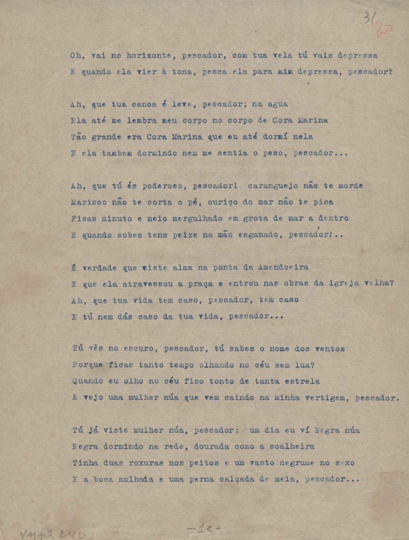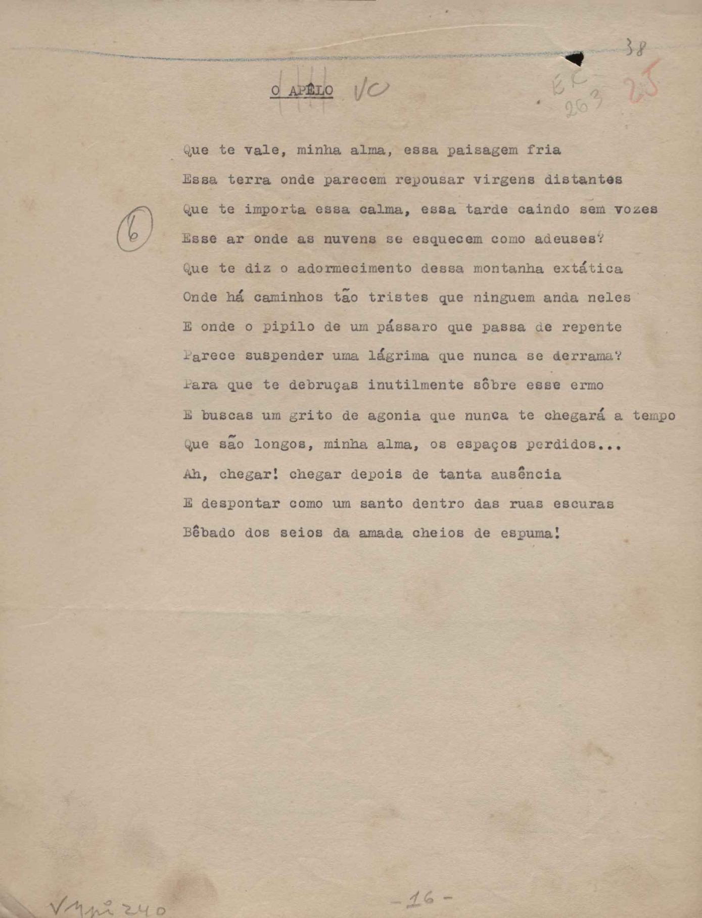 Poemas (52). "A um passarinho", "Os acrobatas", "Allegro", "O apelo", "Azul e branco", "balada da praia do Vidigal", "Balada das meninas de bicicleta", "Balada de Pedro Nava", "Balada do cavalão", "Balada do enterrado vivo", "Balada do mangue", "Barcarola", "Canção", "Cântico", "O dia da criação", "Epitáfio", "O escândalo da rosa", "Estrela polar", "Imitação de Rilke", "Lápide de Sinhazinha Ferreira", "Mar", "Marina", "Marinha", "A morte", "Notícia d'O Século", "Paisagem", "A partida", "Pescador", "Poema de Natal", "Quatro sonetos de meditação", "O riso", "Rosário", "Saudade de Manuel Bandeira", "Sinos de Oxford", "Sombra e luz", "Soneto a Otávio de Faria", "Soneto ao inverno", "Soneto da madrugada", "Soneto de Carnaval", "Soneto de despedida", "Soneto de fidelidade", "Soneto de Londres", "Soneto de quarta-feira de cinzas", "Soneto de separação", "Soneto de véspera", "Soneto do maior amor" e "Trecho". Anexo: 1. Prova tipográfica da primeira edição (incompleta); 2. Outras versões manuscritas e datilografadas, com emendas, exceto de: "Balada das meninas de bicicleta", "Marinha", "Notícia d'O Século", "Saudade de Manuel Bandeira" e "Soneto de despedida".