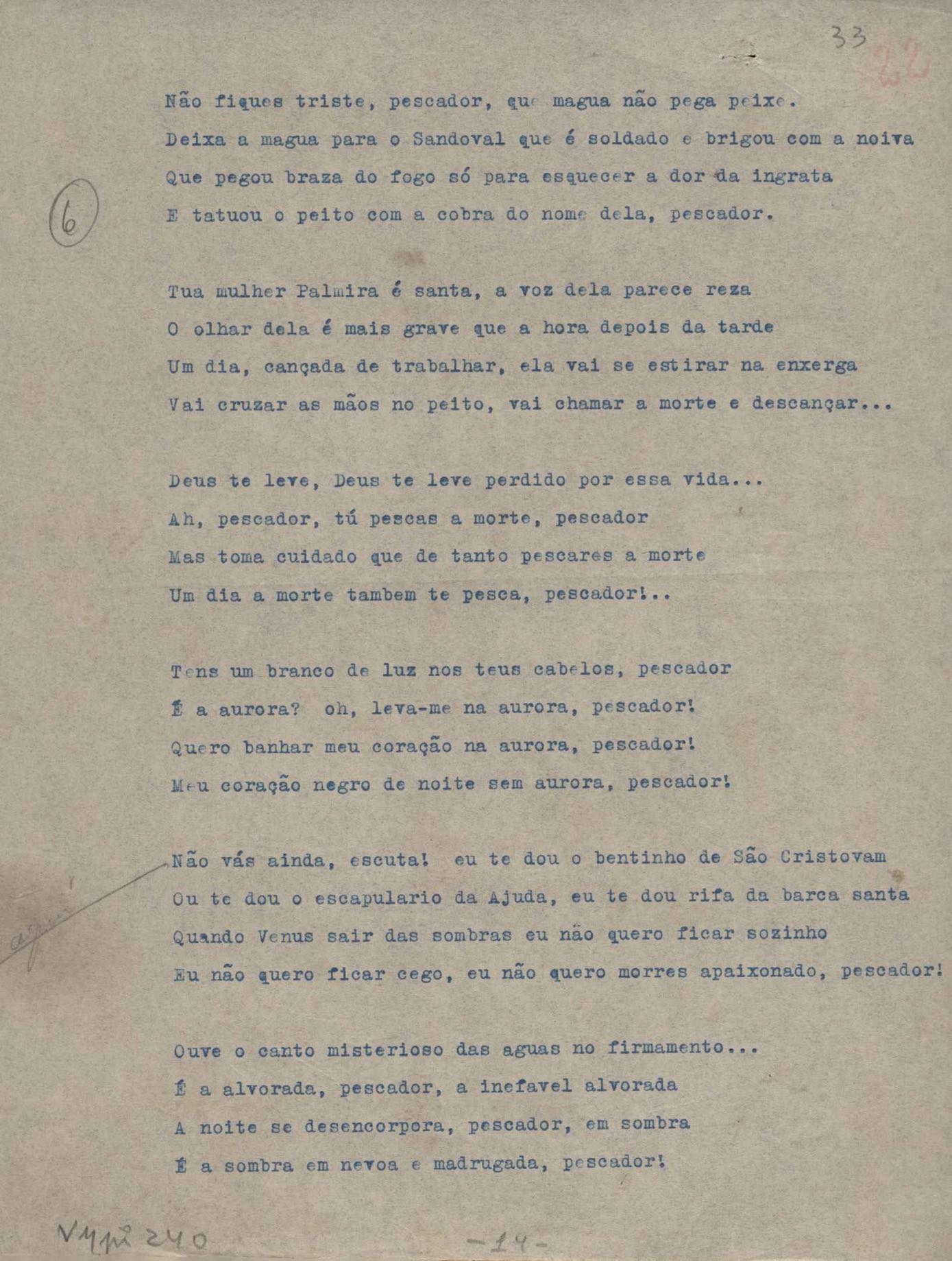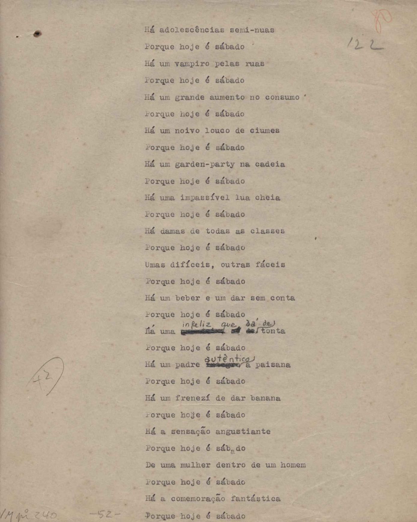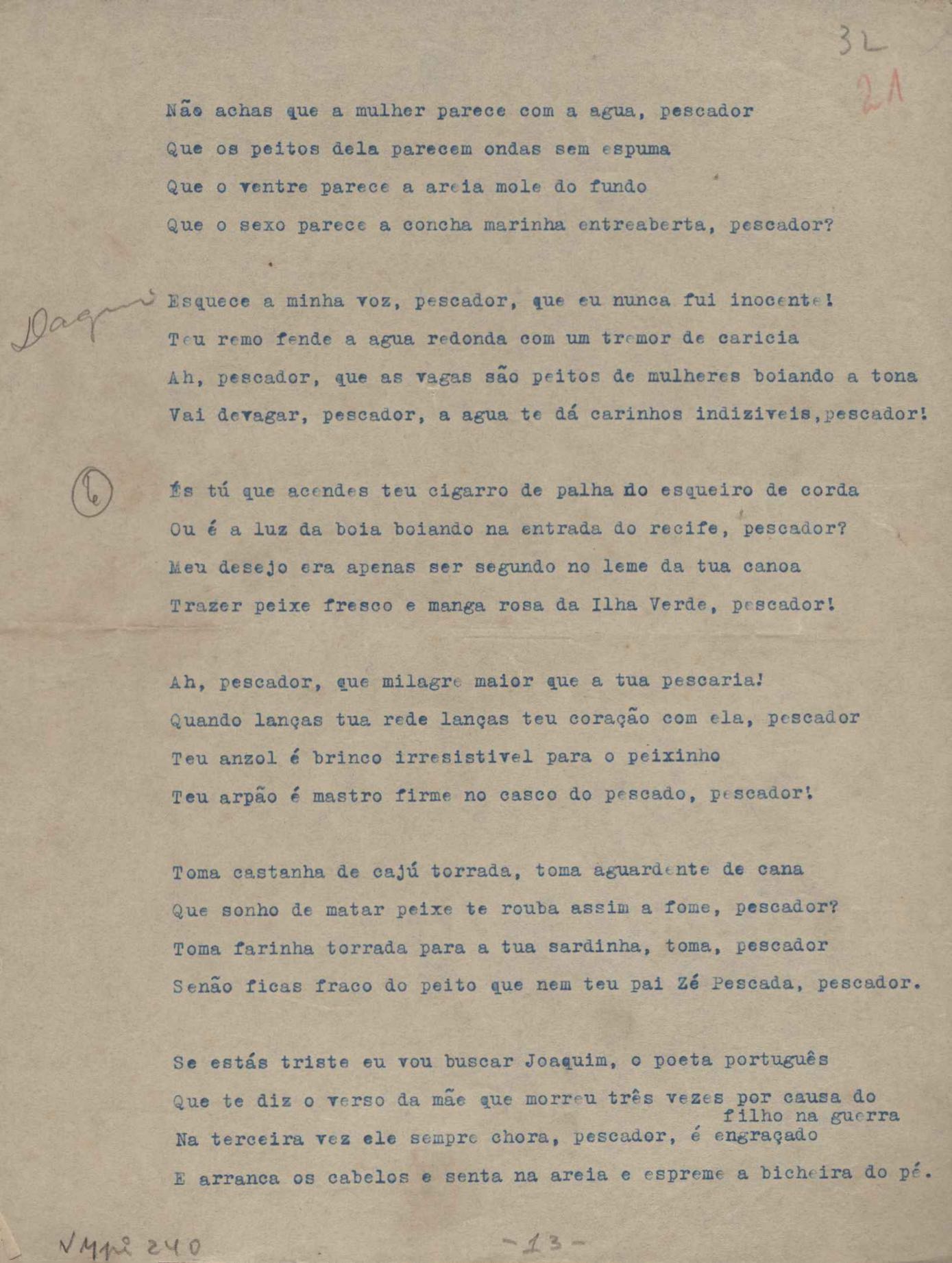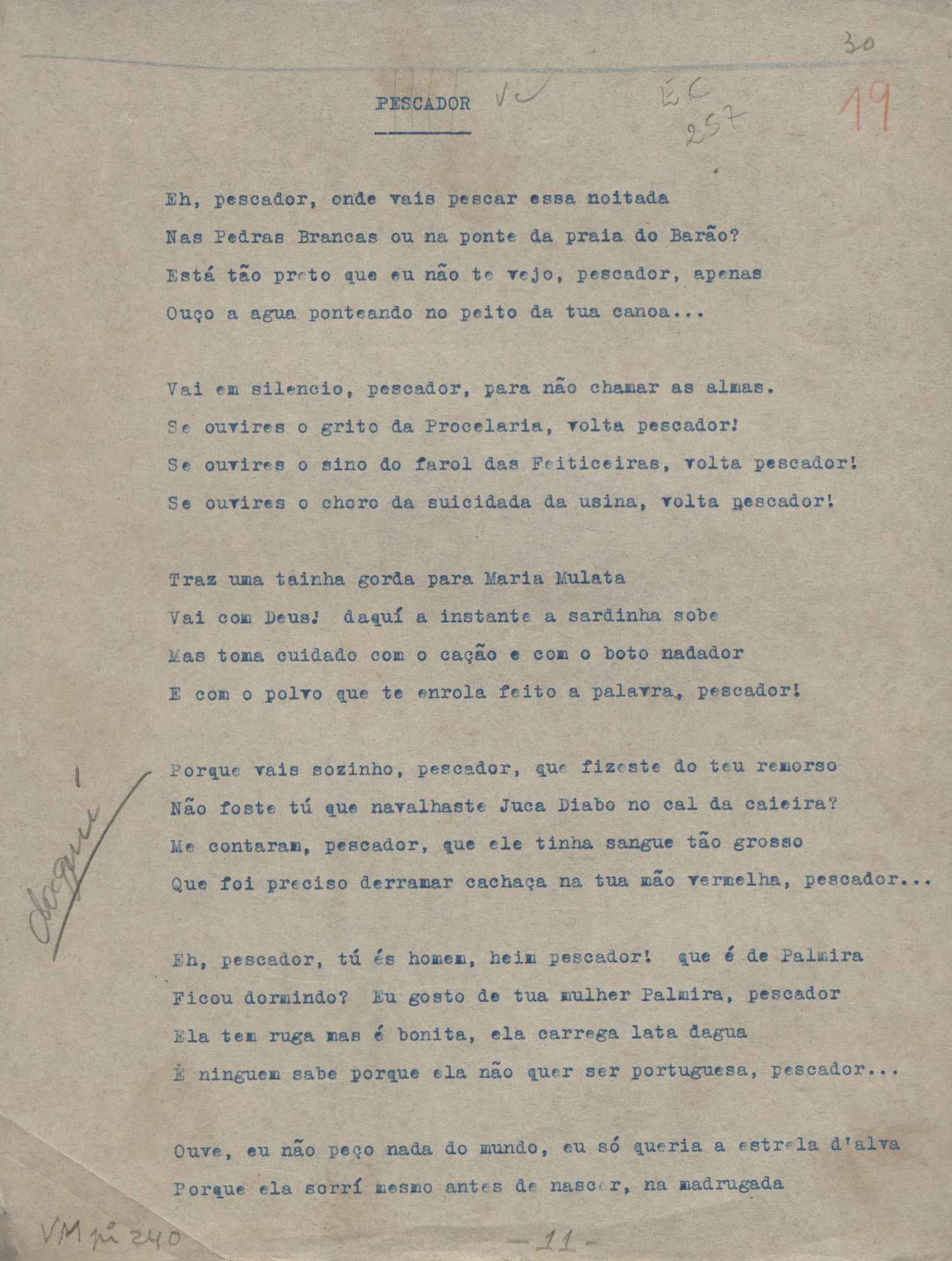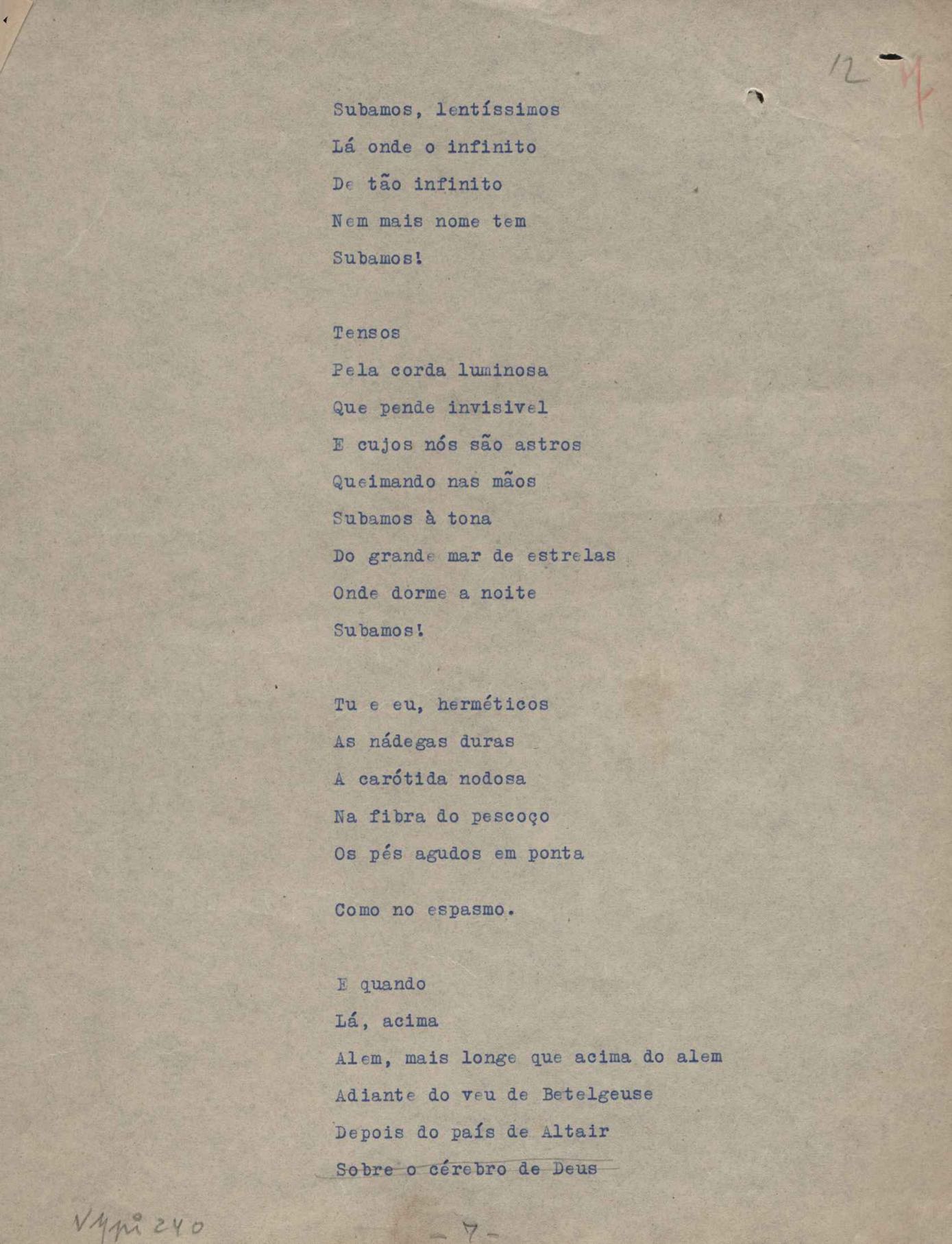 Poemas (52). "A um passarinho", "Os acrobatas", "Allegro", "O apelo", "Azul e branco", "balada da praia do Vidigal", "Balada das meninas de bicicleta", "Balada de Pedro Nava", "Balada do cavalão", "Balada do enterrado vivo", "Balada do mangue", "Barcarola", "Canção", "Cântico", "O dia da criação", "Epitáfio", "O escândalo da rosa", "Estrela polar", "Imitação de Rilke", "Lápide de Sinhazinha Ferreira", "Mar", "Marina", "Marinha", "A morte", "Notícia d'O Século", "Paisagem", "A partida", "Pescador", "Poema de Natal", "Quatro sonetos de meditação", "O riso", "Rosário", "Saudade de Manuel Bandeira", "Sinos de Oxford", "Sombra e luz", "Soneto a Otávio de Faria", "Soneto ao inverno", "Soneto da madrugada", "Soneto de Carnaval", "Soneto de despedida", "Soneto de fidelidade", "Soneto de Londres", "Soneto de quarta-feira de cinzas", "Soneto de separação", "Soneto de véspera", "Soneto do maior amor" e "Trecho". Anexo: 1. Prova tipográfica da primeira edição (incompleta); 2. Outras versões manuscritas e datilografadas, com emendas, exceto de: "Balada das meninas de bicicleta", "Marinha", "Notícia d'O Século", "Saudade de Manuel Bandeira" e "Soneto de despedida".