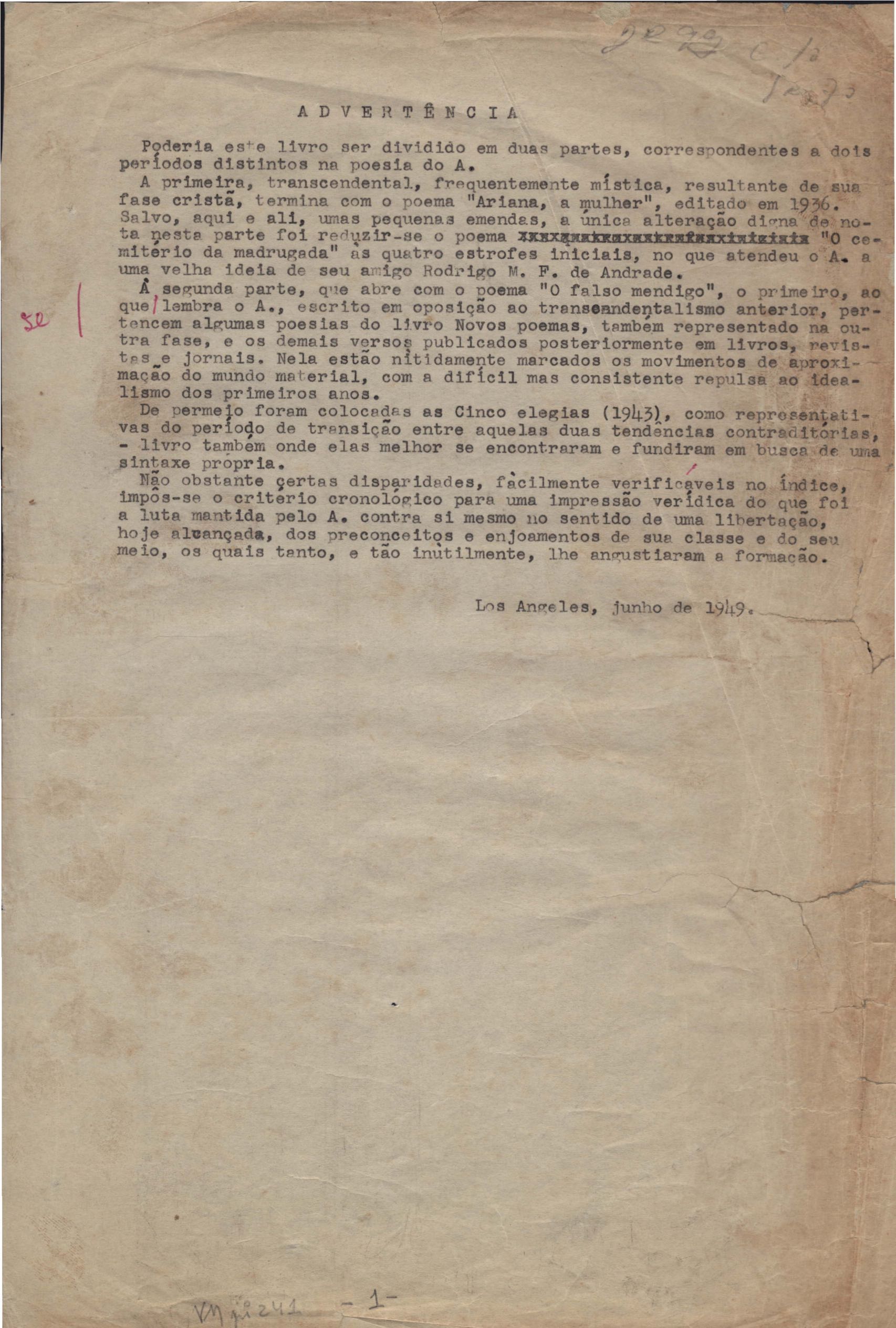 Poemas (125). "A um passarinho", "A uma mulher", "A Verlaine", "Os acrobatas", "Agonia", "Alba", "Allegro", "Ária para assovio", "Ariana, a mulher", "O assassino", "Aurora, com movimento", "Ausência", "A ausente", "Azul e branco", "Balada da moça do Miramar", "Balada da praia do Vidigal", "Balada das arquivistas", "Balada das meninas de bicicleta", "Balada de Pedro Nava", "Balada do cavalão", "Balada do enterrado vivo", "Balada do mangue", "Balada do morto vivo", "Balada dos mortos dos campos de concentração", "Balada feroz", "Balada para Maria", "Balanço do filho morto", "Bilhete a Baudelaire", "A bomba atômica", "A brusca poesia da mulher amada", "Canção", "Cântico", "O cemitério na madrugada", "Cinepoema", "Conjugação da ausente", "Crepúsculo em New York", "O crocodilo", "Desert hot spring", "Elegia ao primeiro amigo", "Elegia desesperada", "Elegia lírica", "Elegia na morte de Clodoaldo Pereira da Silva Moraes, poeta e cidadão" [inc.], "Elegia quase uma ode", "Epitáfio", "Epitalâmio", "O escândalo da rosa", "O escravo", "A estrela polar", "O falso mendigo", "O filho do homem", "História passional, Hollywood, Califórnia", "Ilha do Governador", "Imitação de Rilke", "O incriado", "Invocação à mulher única", "João Cabral, à sua maneira" [publ. "Retrato, à sua maneira"], "A legião dos úrias", "A manhã do morto", "Mar", "Marina", "Marinha", "A máscara da noite", "Mensagem à poesia", "Mensagem a Rubem Braga", "A morte", "A morte da madrugada", "A mulher na noite", "A mulher que passa", "A música das almas", "O olhar para trás", "Paisagem", "A paixão da carne", "A partida", "Pátria minha", "A aêra", "Pescador", "Poema enjoadinho", "Poema nº três em busca da essência", "Poema para todas as mulheres", "O poeta", "O poeta e a lua", "Poética", "Quatro sonetos de meditação", "Repto", "O rio", "O riso", "A rosa de Hiroshima", "Rosário", "O sacrifício da aurora", "Saudades de Manuel Bandeira", "Sinos de Oxford", "Solilóquio", "Sombra e luz", "Sonata do amor perdido" [Lamento nº 1, Intermédio, Lamento nº 2], "Soneto a Katherine Mansfield", "Soneto à lua", "Soneto a Otávio de Faria", "Soneto a Sergei Mikhailovich Eisenstein", "Soneto ao inverno", "Soneto da mulher inútil", "Soneto da rosa", "Soneto de agosto", "Soneto de aniversário", "Soneto de carnaval", "Soneto de contrição", "Soneto de despedida", "Soneto de devoção", "Soneto de fidelidade", "Soneto de intimidade", "Soneto de Londres", "Soneto de quarta-feira de cinzas", "Soneto de separação", "Soneto de véspera", "Soneto do maior amor", "Soneto do só ou parábola de Malte Laurids Brigge", "O tempo nos parques", "Ternura", "Trecho", "Três respostas em face de Deus", "A última elegia", "Valsa à mulher do povo", "Viagem à sombra", "Vida e poesia", "A vida vivida" e "A volta da mulher morena". Anexo: 1. Prova tipográfica da segunda edição publicada pela Editora do Autor, em 1960; 2. Duas versões da nota do autor [publ. "Advertência"]; 3. Duas capas do livro, publicado pela editora A Noite, em 1953; 4. Outra versão manuscrita e datilografada com emendas de: "Aurora, com movimento", "Balada da moça do Miramar", "Balada das arquivistas", "Balada do filho morto", "Balada do morto vivo", "Balada dos mortos dos campos de concentração", "Bilhete a Baudelaire", "Cinepoema", "Crepúsculo em New York", "O crocodilo", "Elegia na morte de Clodoaldo Pereira da Silva Moraes, poeta e cidadão", "Epitalâmio", "História passional, Hollywood, Califórnia", "João Cabral de Melo Neto" [publ. "Retrato, à sua maneira"], "A manhã do morto", "Mensagem à poesia", "Mensagem a Rubem Braga", "A morte de madrugada", "Ode à legítima esposa" [publ. "Canção da ausente"], "A paixão da Carne", "Parábola de Malte Laurids Brigge" [publ. "Soneto do só" ou "Parábola de Malte Laurids Brigge"], "Pátria minha", "A pêra", "Poema enjoadinho", "O poeta e a lua", "Poética", "Repto", "O Rio", "A Rosa de Hiroshima", "O sacrifício da aurora", "Soneto a Sergei Mikhailovich Eisenstein", "Soneto da mulher inútil", "Soneto de aniversário", "O tempo nos parques", "Valsa à mulher anônima" [publ. "Valsa à mulher do povo"], "O vampiro" [publ. "O assassino"].