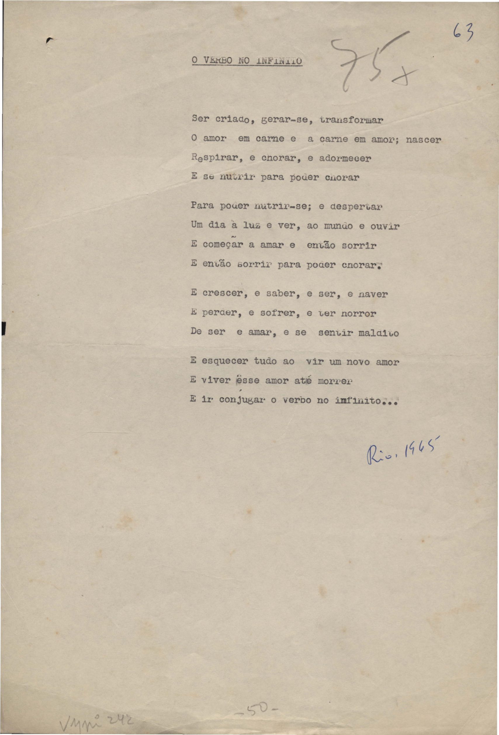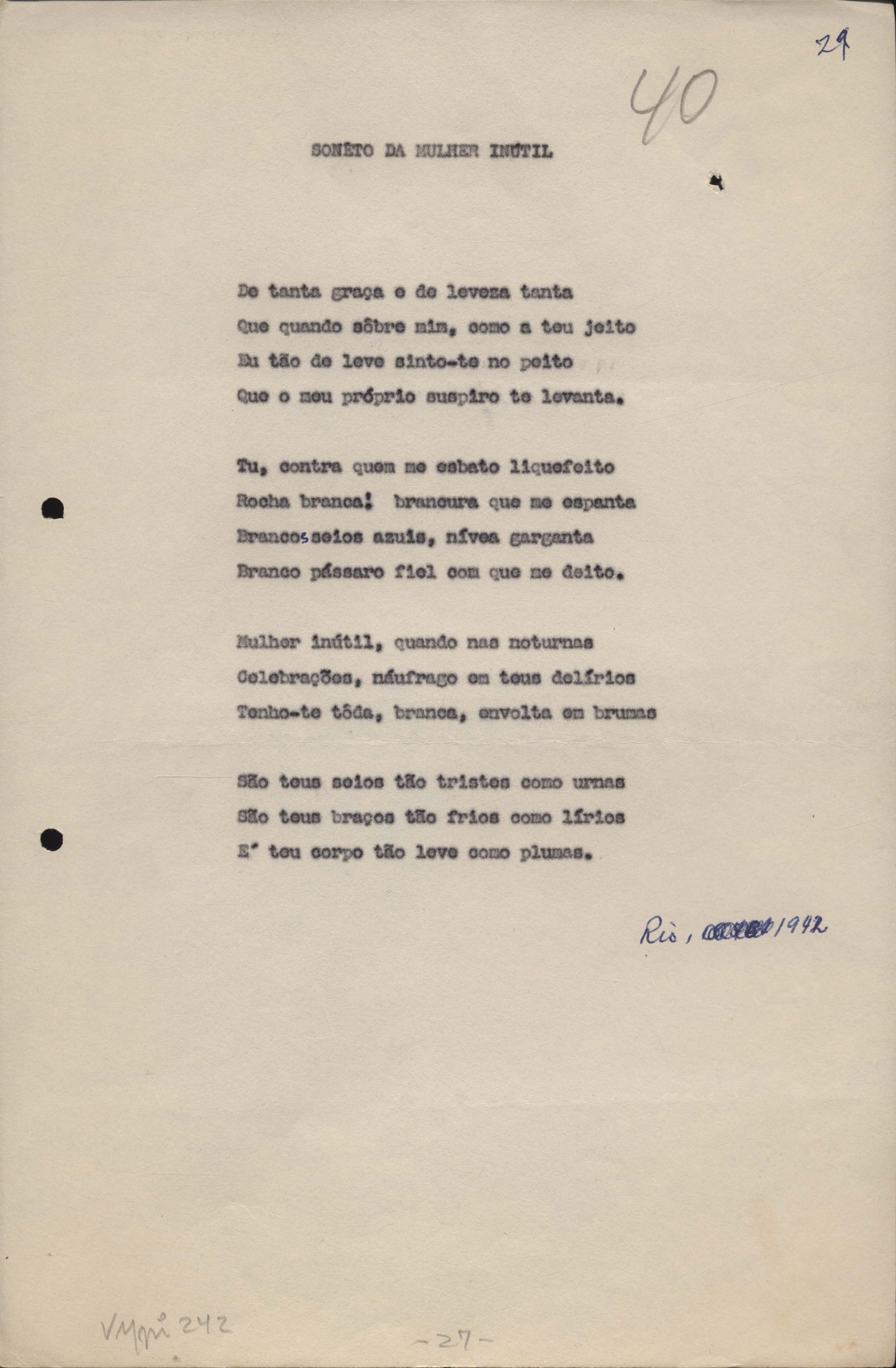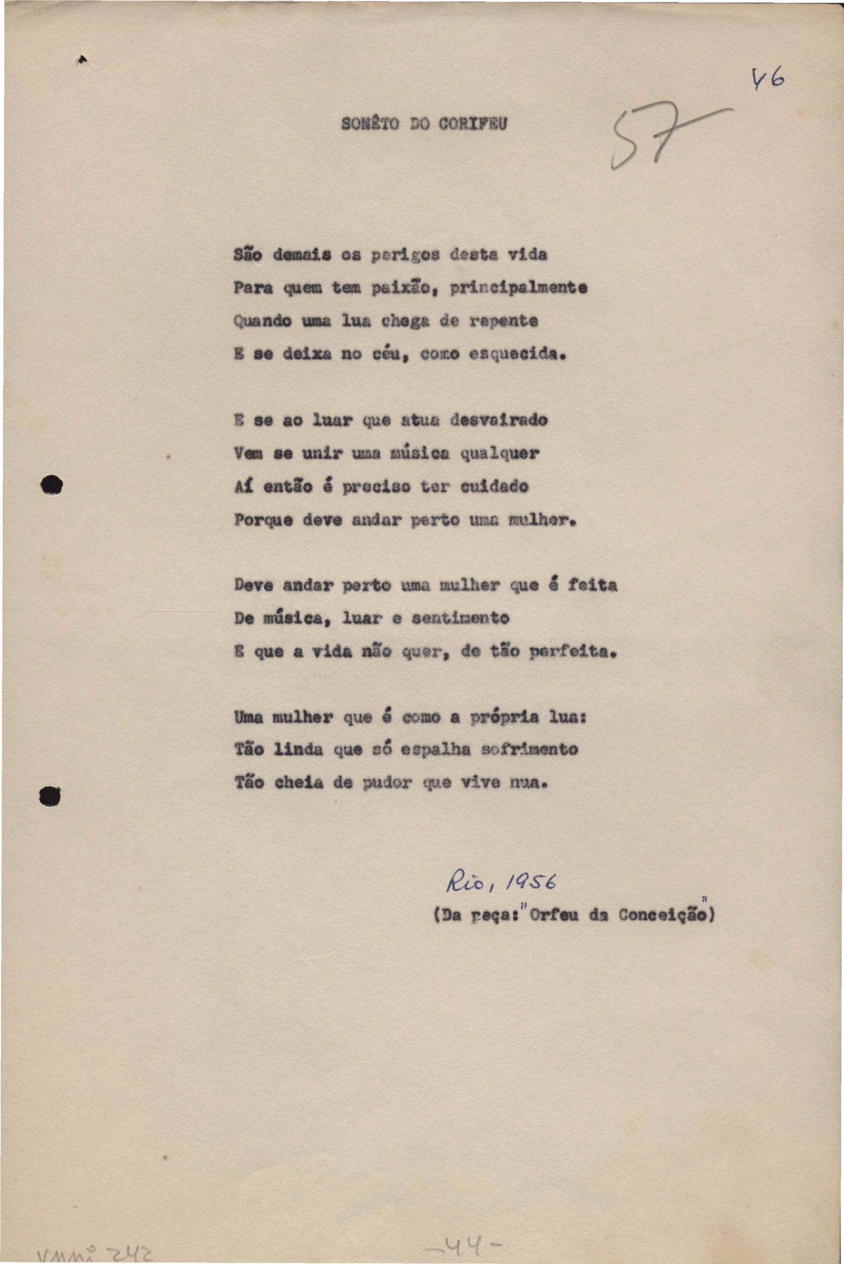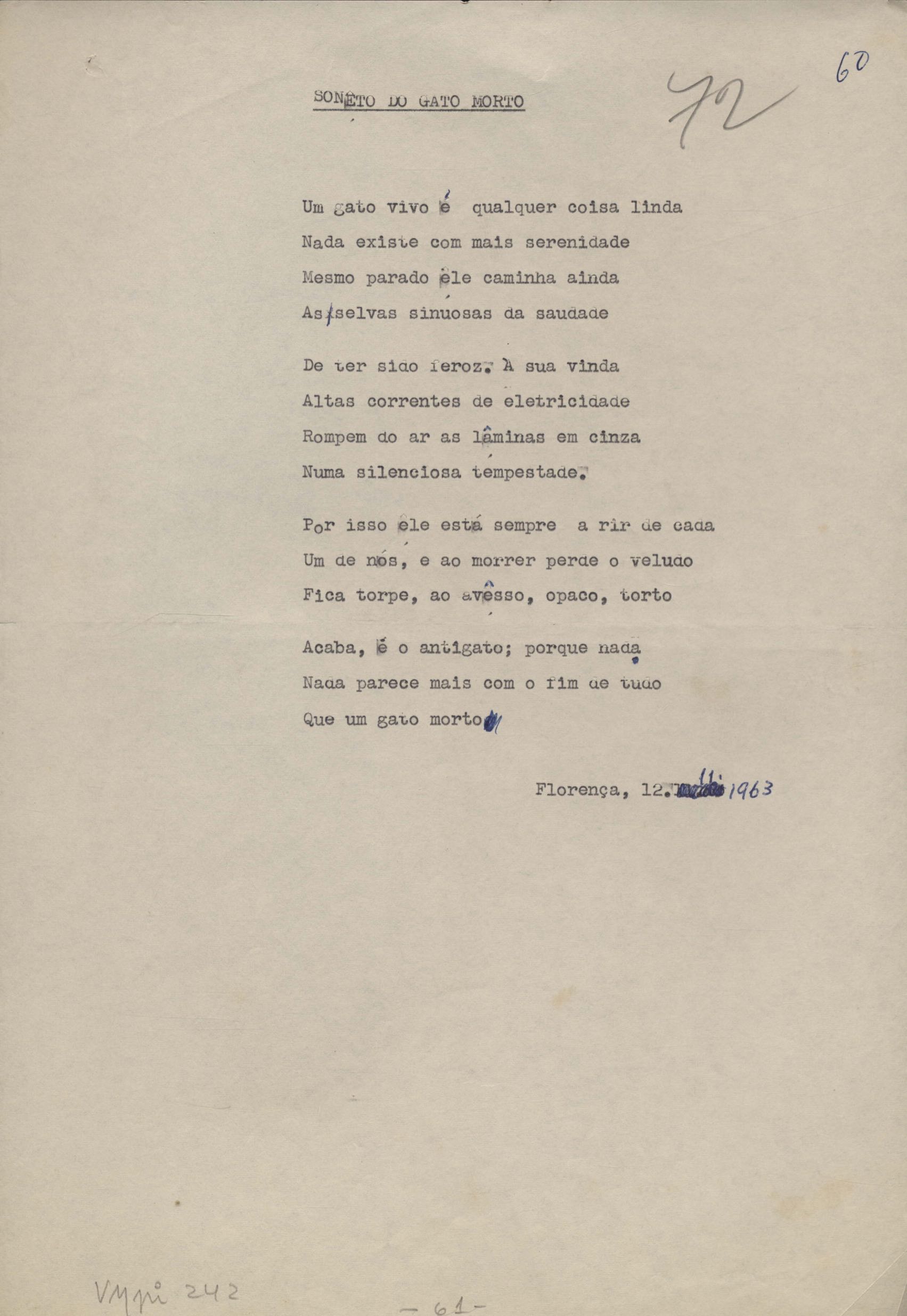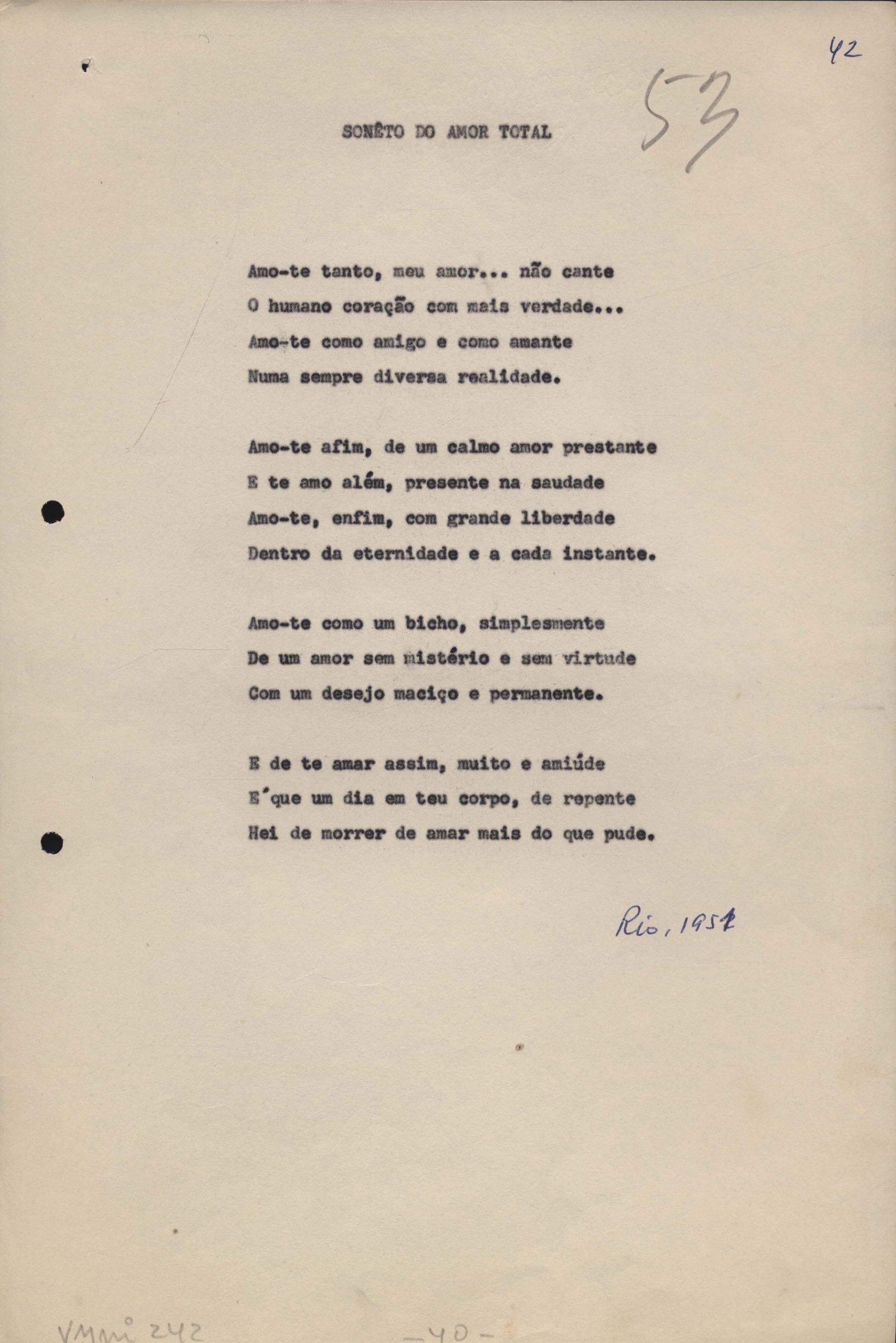"Soneto de véspera", "Soneto do amor como um rio", "Soneto do amor total", "Soneto do Corifeu", "Soneto do gato morto", "Soneto do maior amor", "Soneto do só ou parábola de Malte Laurids Brigge", "Soneto no sessentenário de Rafael Alberti" e "O verbo no infinito". Anexo: 1. Outras versões manuscritas e datilografadas, com emendas de: "Anfiguri", "O anjo das pernas tortas", "O espectro da rosa", "Máscara mortuária de Graciliano Ramos", "Não comerei da alface a verde pétala", "Poética (II)", "Pôr-do-sol em Itatiaia"; "Os quatro elementos, I - O fogo, III - O ar, IV- água", "Retrato de Maria Lúcia"; "Sonetinho a Portinari"; "Soneto a Florença"; "Soneto a Lasar Segall"; "Soneto a Pablo Neruda"; "Soneto da espera"; "Soneto da hora final"; "Soneto da hora tardia"; "Soneto de Montevidéu", "Soneto de Oxford"; "Soneto de um domingo"; "Soneto do amor como um rio", "Soneto do Corifeu"; "Soneto do gato morto"; "Soneto no sessentenário de Rafael Alberti", "Tríptico na morte de Sergei Mikhailovitch Eisenstein"; 2. Tradução em inglês de "Tríptico na morte de Sergei Mikhailovitch Eisenstein".