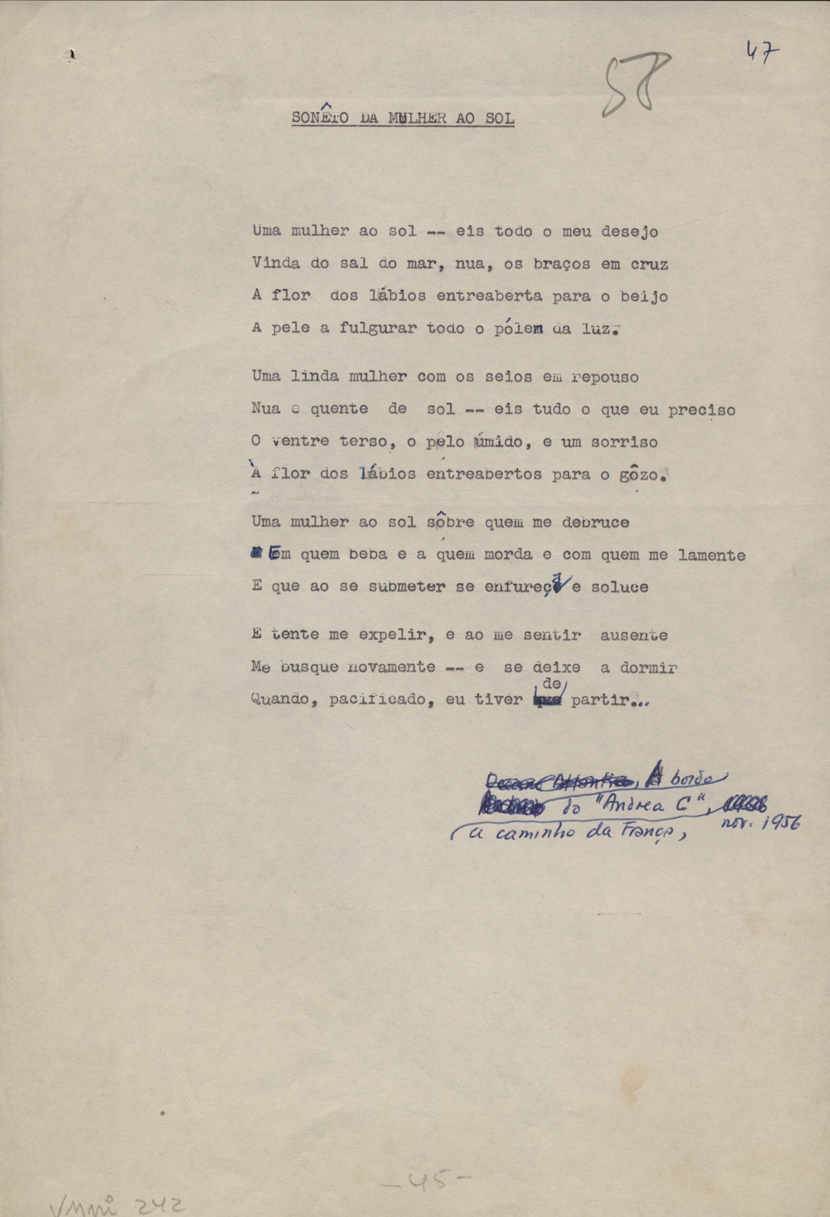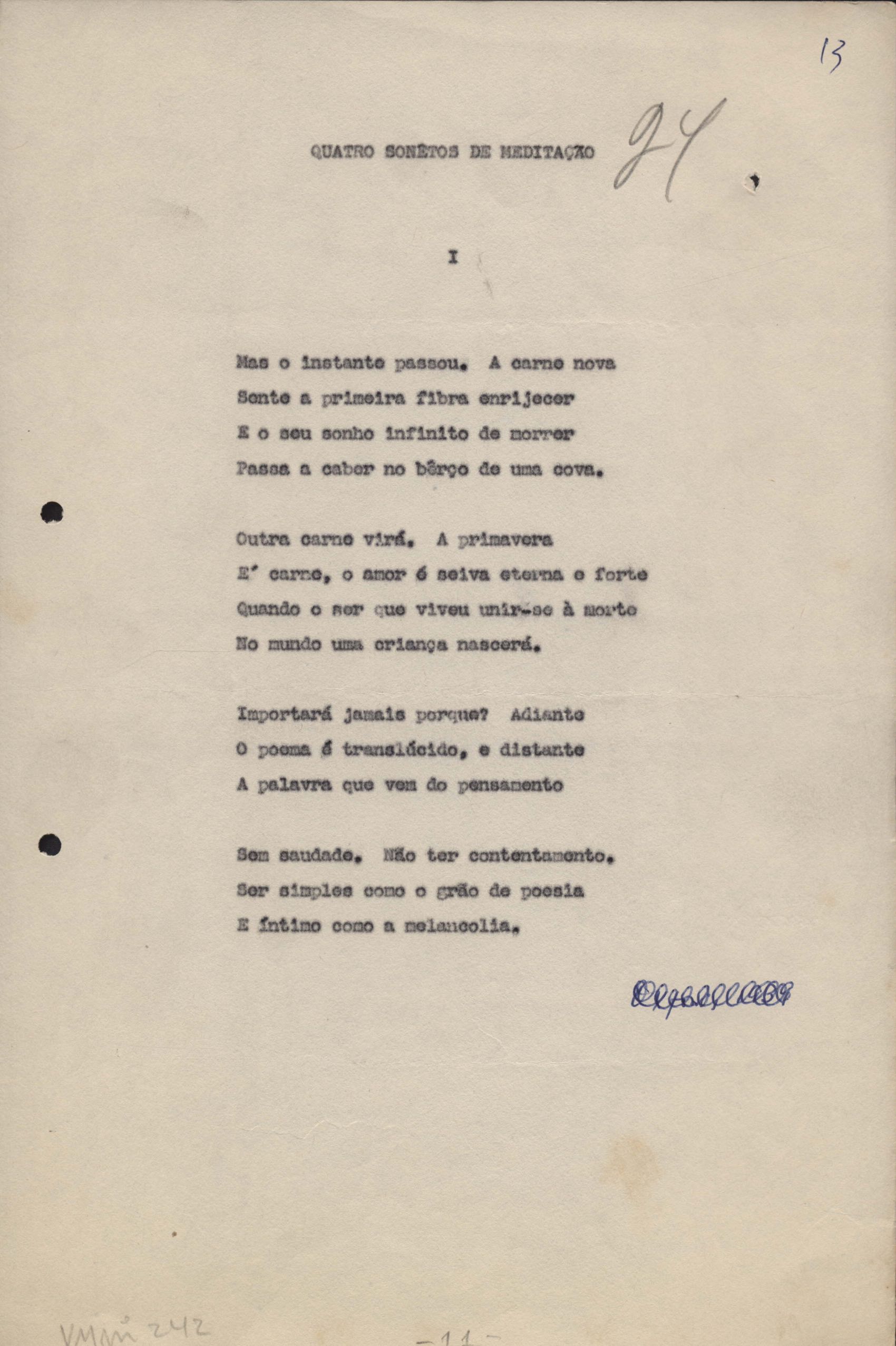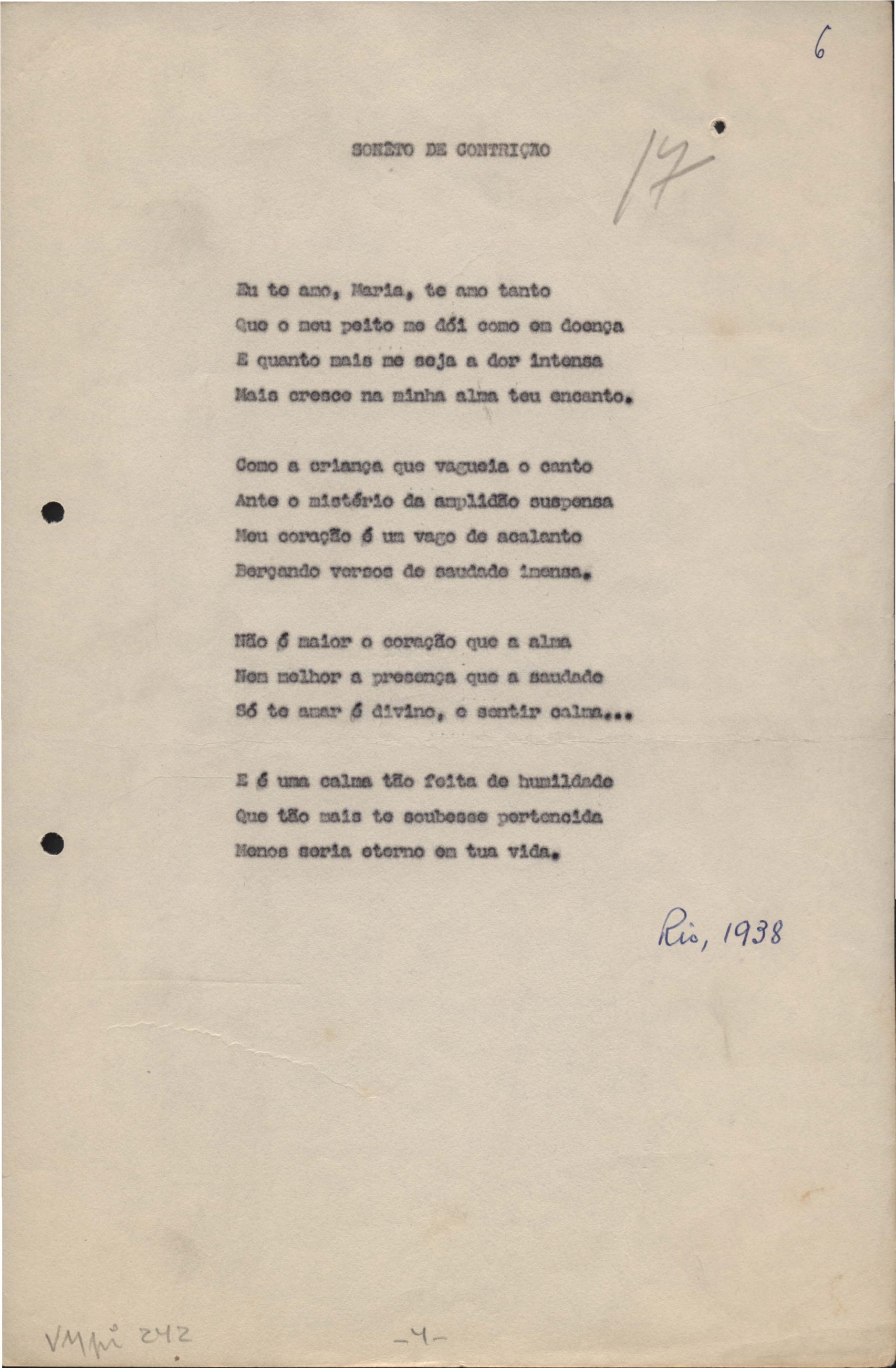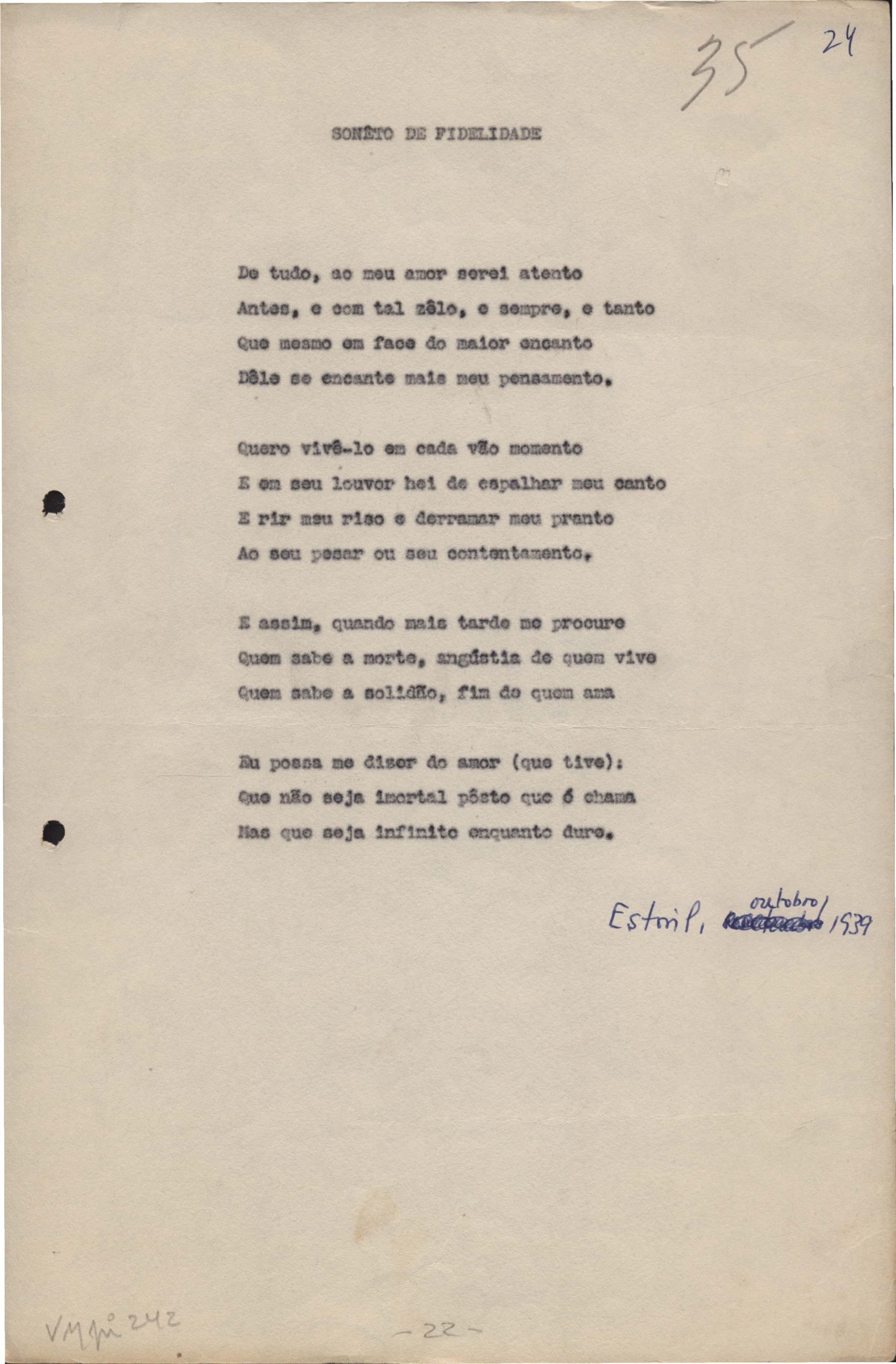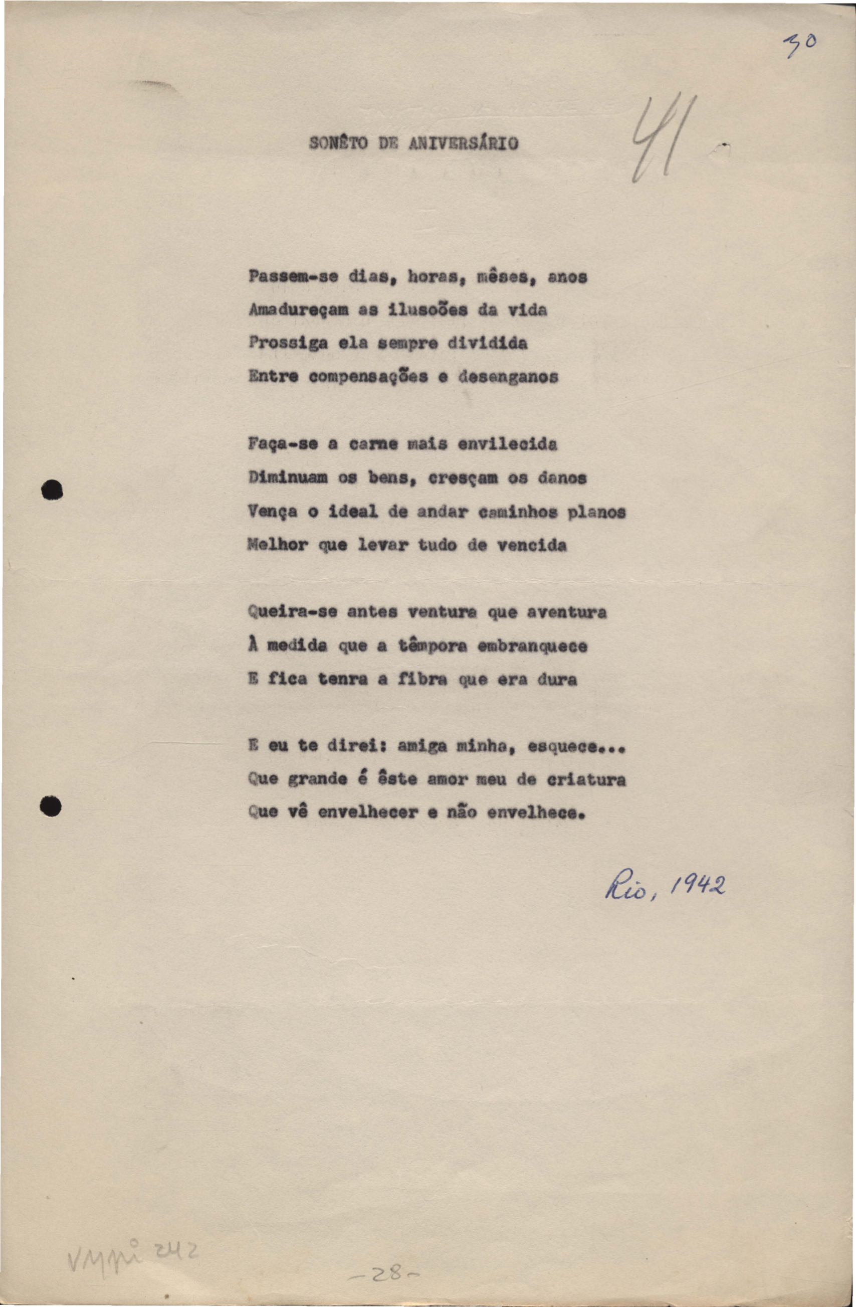 "Soneto de véspera", "Soneto do amor como um rio", "Soneto do amor total", "Soneto do Corifeu", "Soneto do gato morto", "Soneto do maior amor", "Soneto do só ou parábola de Malte Laurids Brigge", "Soneto no sessentenário de Rafael Alberti" e "O verbo no infinito". Anexo: 1. Outras versões manuscritas e datilografadas, com emendas de: "Anfiguri", "O anjo das pernas tortas", "O espectro da rosa", "Máscara mortuária de Graciliano Ramos", "Não comerei da alface a verde pétala", "Poética (II)", "Pôr-do-sol em Itatiaia"; "Os quatro elementos, I - O fogo, III - O ar, IV- água", "Retrato de Maria Lúcia"; "Sonetinho a Portinari"; "Soneto a Florença"; "Soneto a Lasar Segall"; "Soneto a Pablo Neruda"; "Soneto da espera"; "Soneto da hora final"; "Soneto da hora tardia"; "Soneto de Montevidéu", "Soneto de Oxford"; "Soneto de um domingo"; "Soneto do amor como um rio", "Soneto do Corifeu"; "Soneto do gato morto"; "Soneto no sessentenário de Rafael Alberti", "Tríptico na morte de Sergei Mikhailovitch Eisenstein"; 2. Tradução em inglês de "Tríptico na morte de Sergei Mikhailovitch Eisenstein".