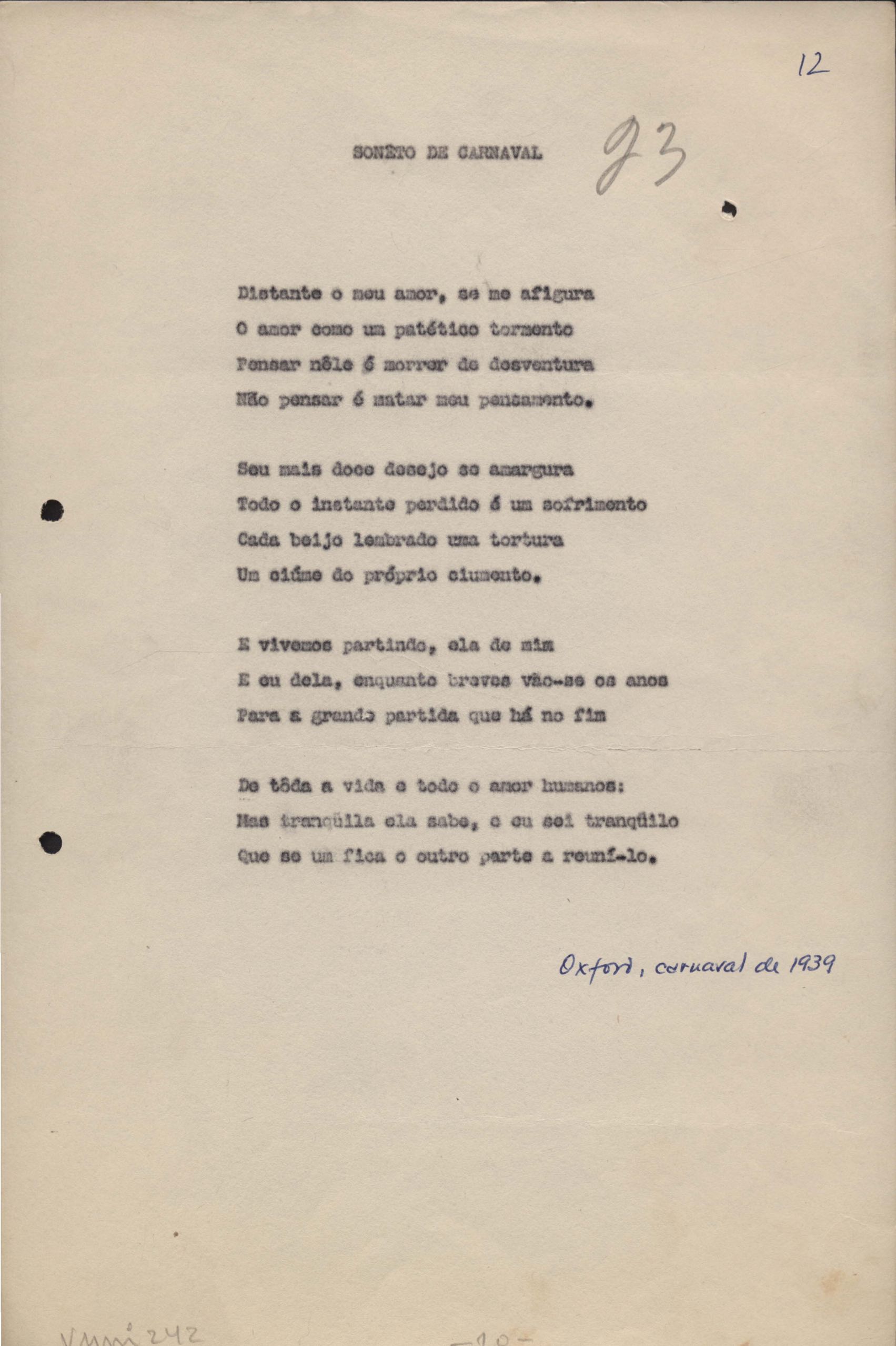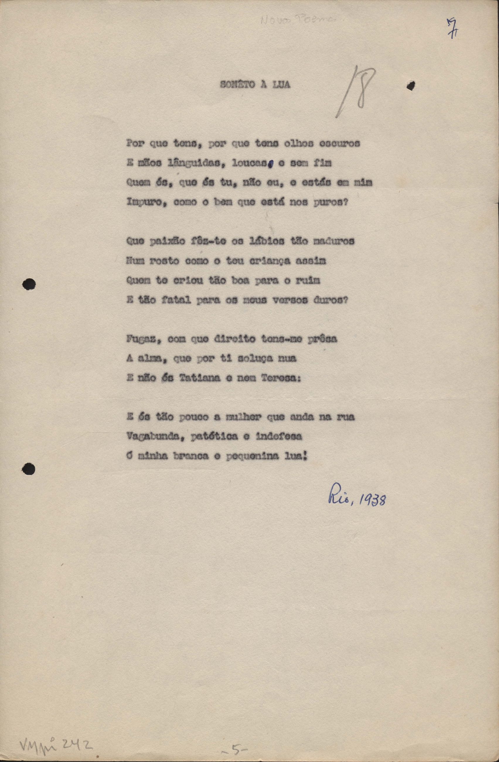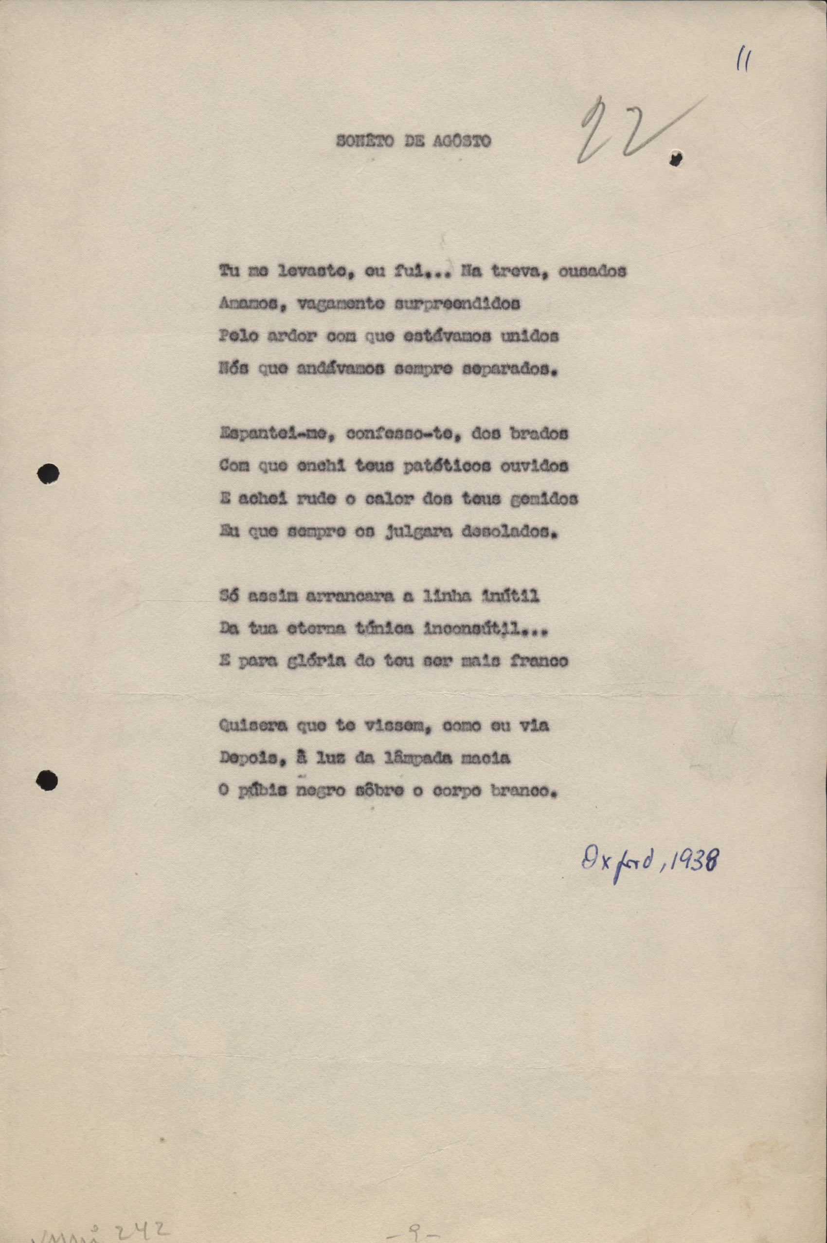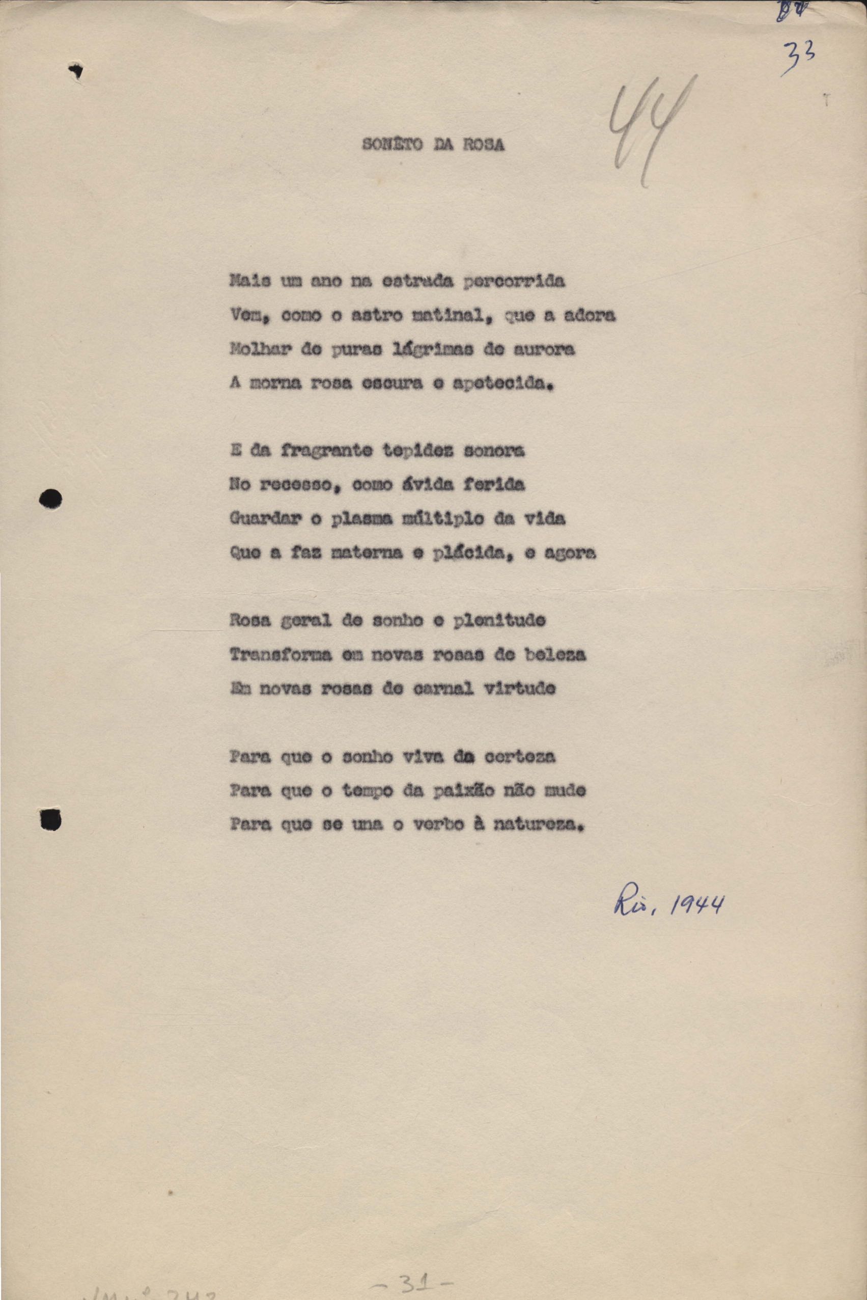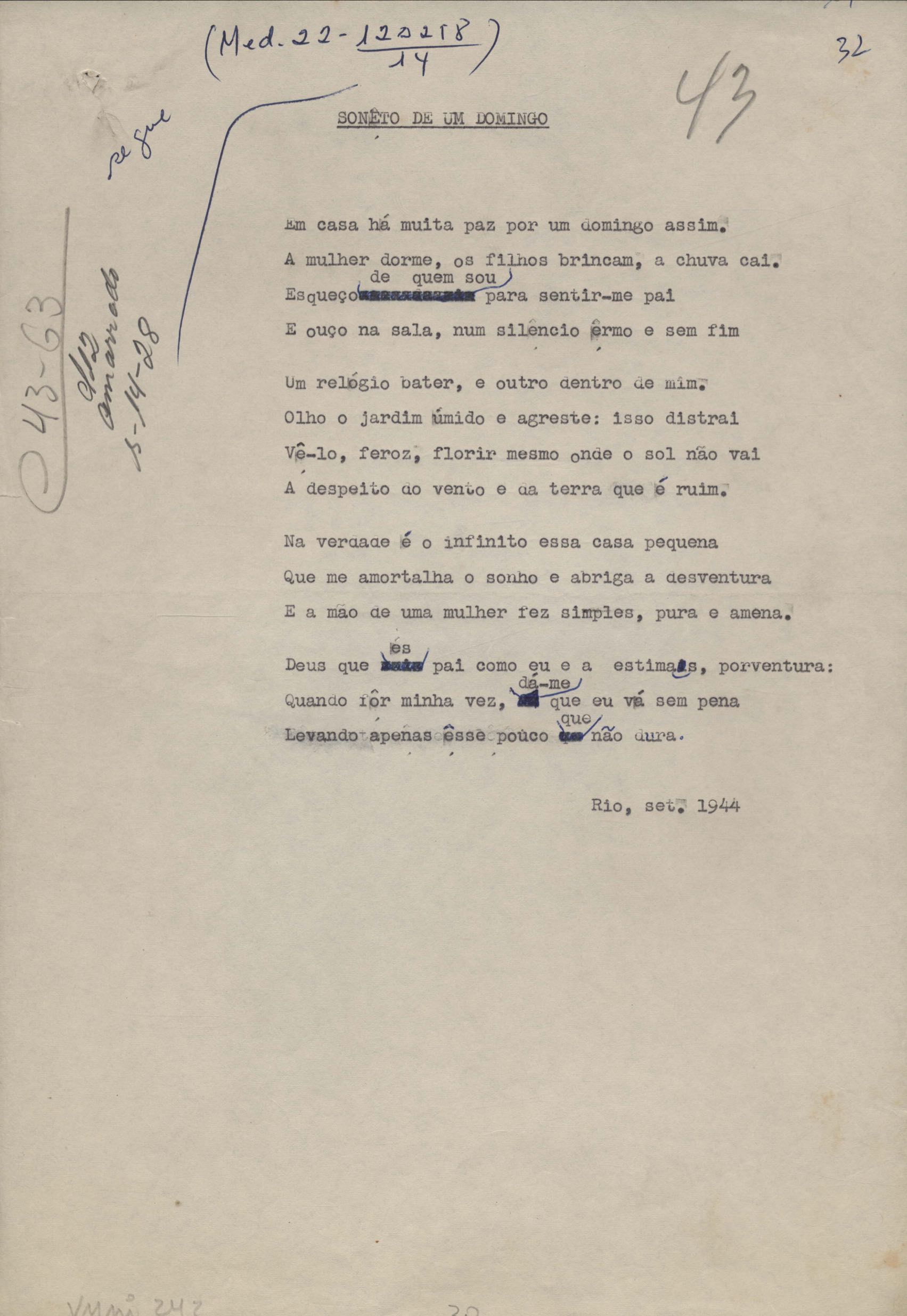 "Soneto de véspera", "Soneto do amor como um rio", "Soneto do amor total", "Soneto do Corifeu", "Soneto do gato morto", "Soneto do maior amor", "Soneto do só ou parábola de Malte Laurids Brigge", "Soneto no sessentenário de Rafael Alberti" e "O verbo no infinito". Anexo: 1. Outras versões manuscritas e datilografadas, com emendas de: "Anfiguri", "O anjo das pernas tortas", "O espectro da rosa", "Máscara mortuária de Graciliano Ramos", "Não comerei da alface a verde pétala", "Poética (II)", "Pôr-do-sol em Itatiaia"; "Os quatro elementos, I - O fogo, III - O ar, IV- água", "Retrato de Maria Lúcia"; "Sonetinho a Portinari"; "Soneto a Florença"; "Soneto a Lasar Segall"; "Soneto a Pablo Neruda"; "Soneto da espera"; "Soneto da hora final"; "Soneto da hora tardia"; "Soneto de Montevidéu", "Soneto de Oxford"; "Soneto de um domingo"; "Soneto do amor como um rio", "Soneto do Corifeu"; "Soneto do gato morto"; "Soneto no sessentenário de Rafael Alberti", "Tríptico na morte de Sergei Mikhailovitch Eisenstein"; 2. Tradução em inglês de "Tríptico na morte de Sergei Mikhailovitch Eisenstein".