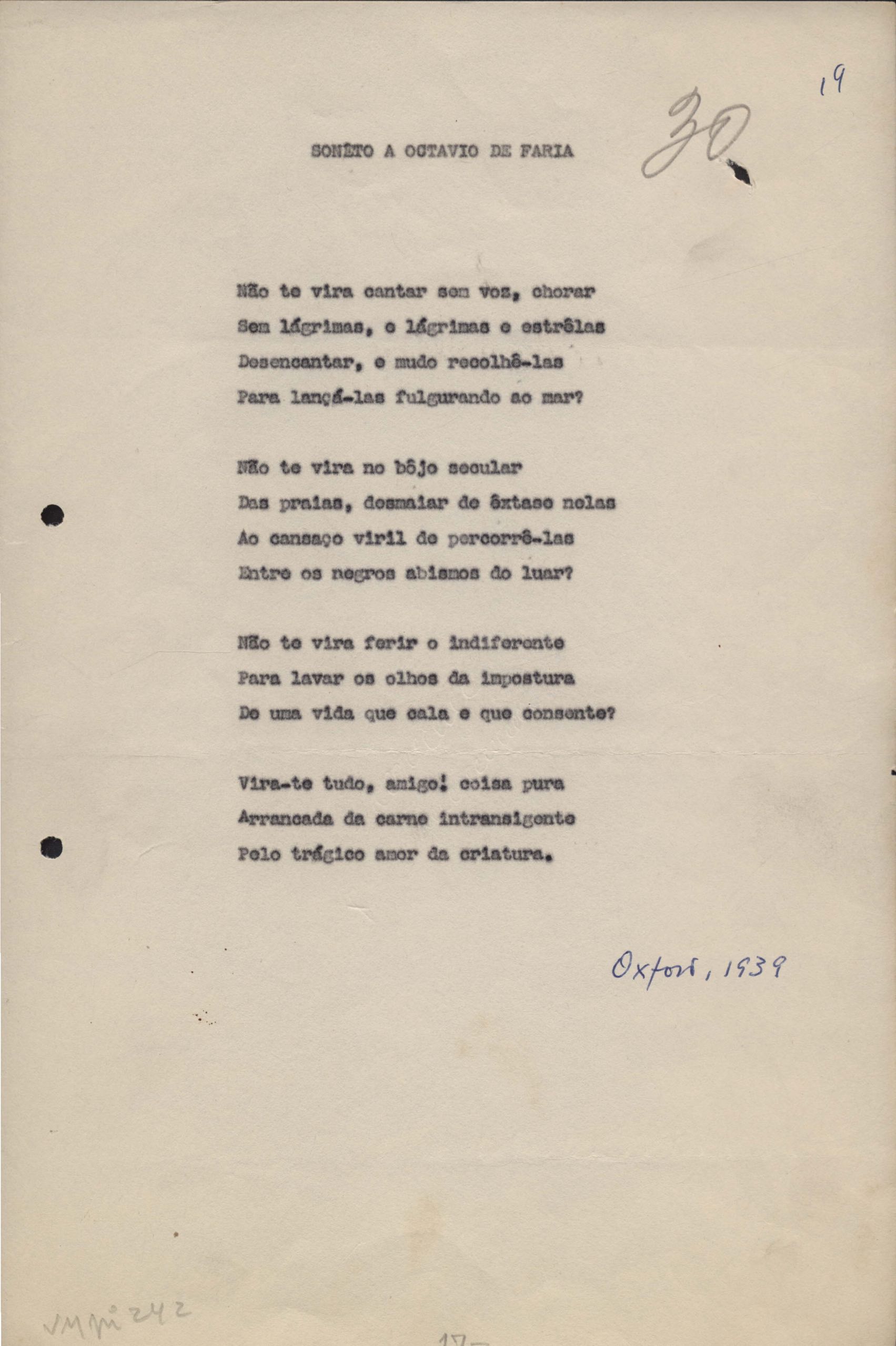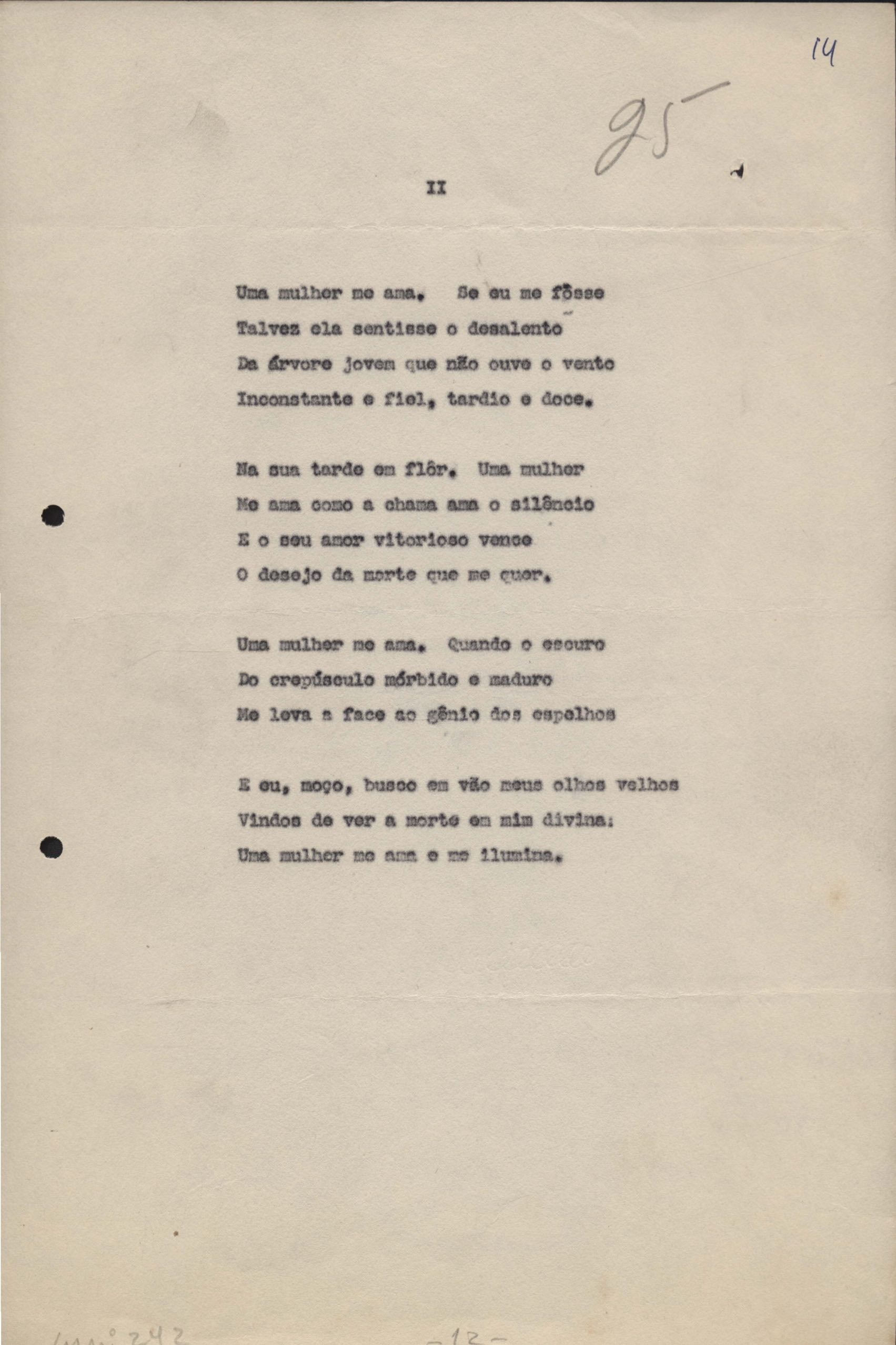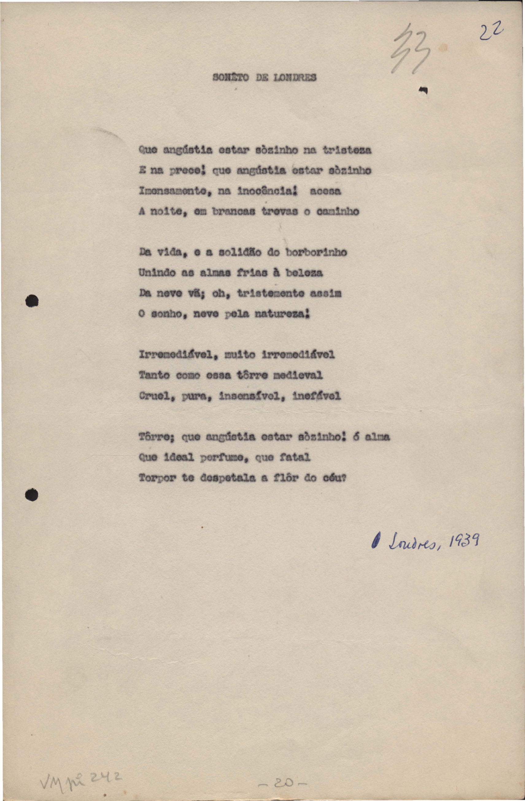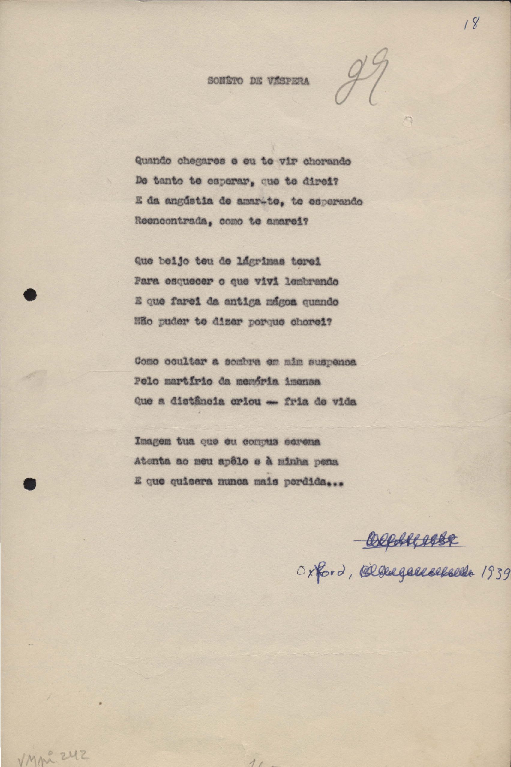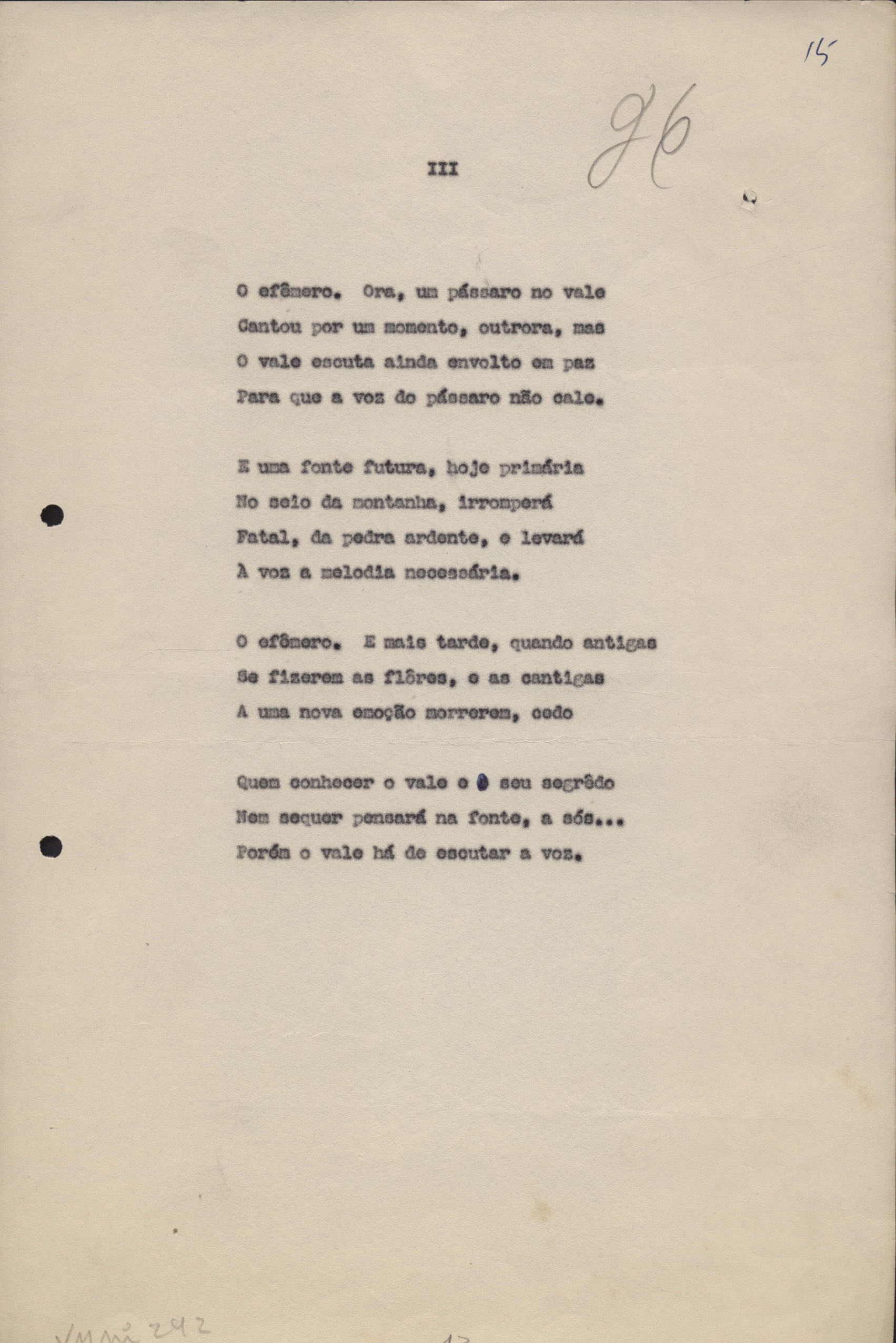 "Soneto de véspera", "Soneto do amor como um rio", "Soneto do amor total", "Soneto do Corifeu", "Soneto do gato morto", "Soneto do maior amor", "Soneto do só ou parábola de Malte Laurids Brigge", "Soneto no sessentenário de Rafael Alberti" e "O verbo no infinito". Anexo: 1. Outras versões manuscritas e datilografadas, com emendas de: "Anfiguri", "O anjo das pernas tortas", "O espectro da rosa", "Máscara mortuária de Graciliano Ramos", "Não comerei da alface a verde pétala", "Poética (II)", "Pôr-do-sol em Itatiaia"; "Os quatro elementos, I - O fogo, III - O ar, IV- água", "Retrato de Maria Lúcia"; "Sonetinho a Portinari"; "Soneto a Florença"; "Soneto a Lasar Segall"; "Soneto a Pablo Neruda"; "Soneto da espera"; "Soneto da hora final"; "Soneto da hora tardia"; "Soneto de Montevidéu", "Soneto de Oxford"; "Soneto de um domingo"; "Soneto do amor como um rio", "Soneto do Corifeu"; "Soneto do gato morto"; "Soneto no sessentenário de Rafael Alberti", "Tríptico na morte de Sergei Mikhailovitch Eisenstein"; 2. Tradução em inglês de "Tríptico na morte de Sergei Mikhailovitch Eisenstein".