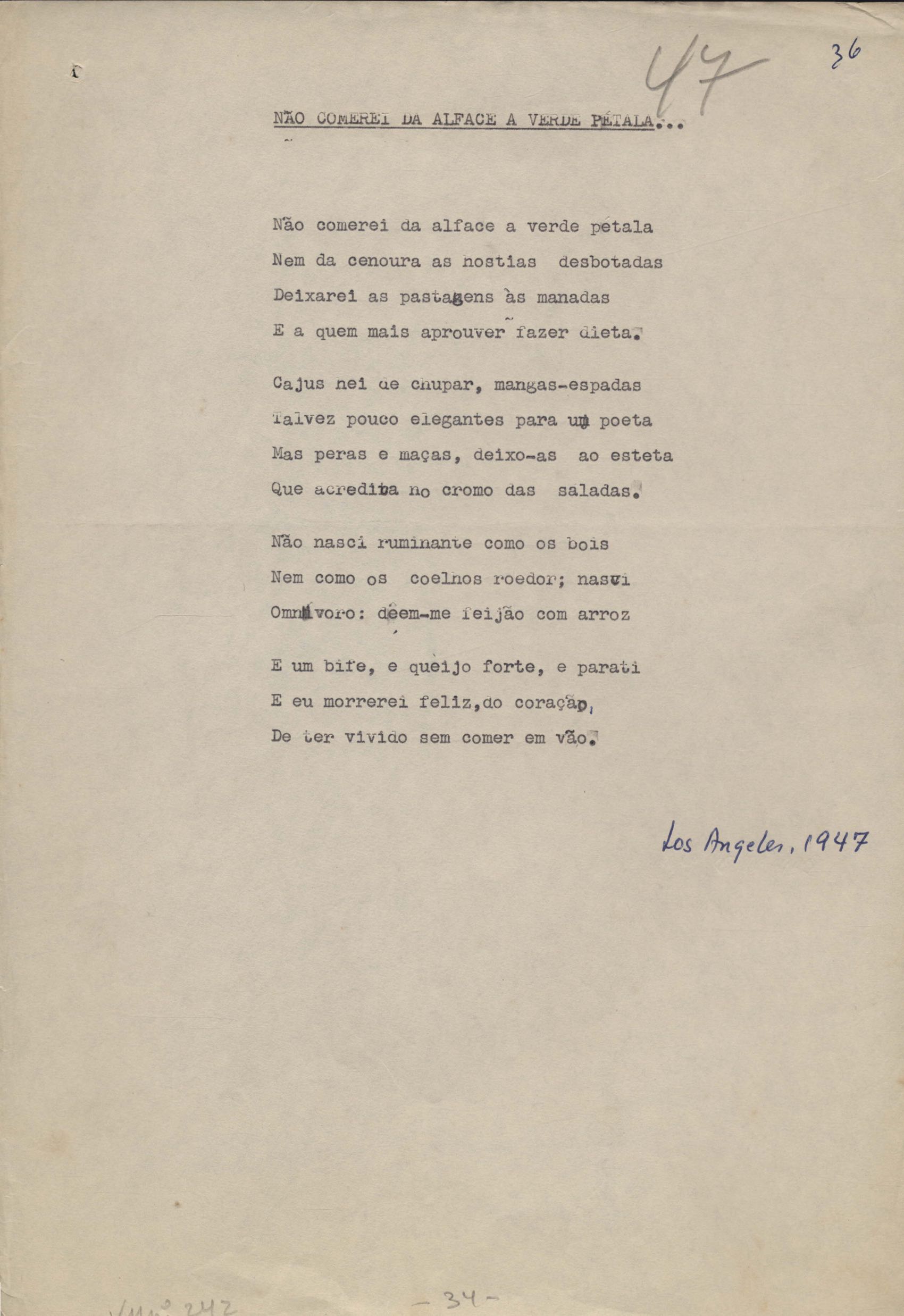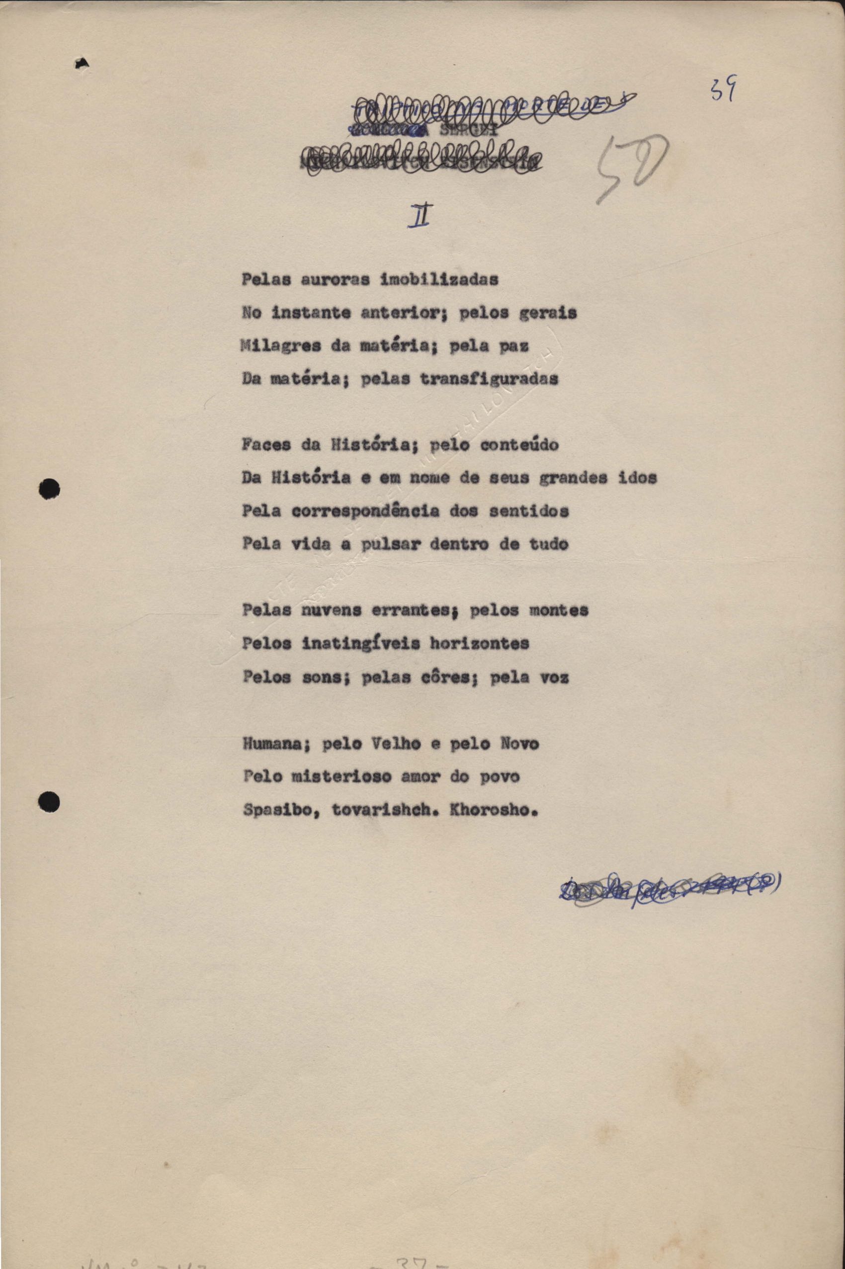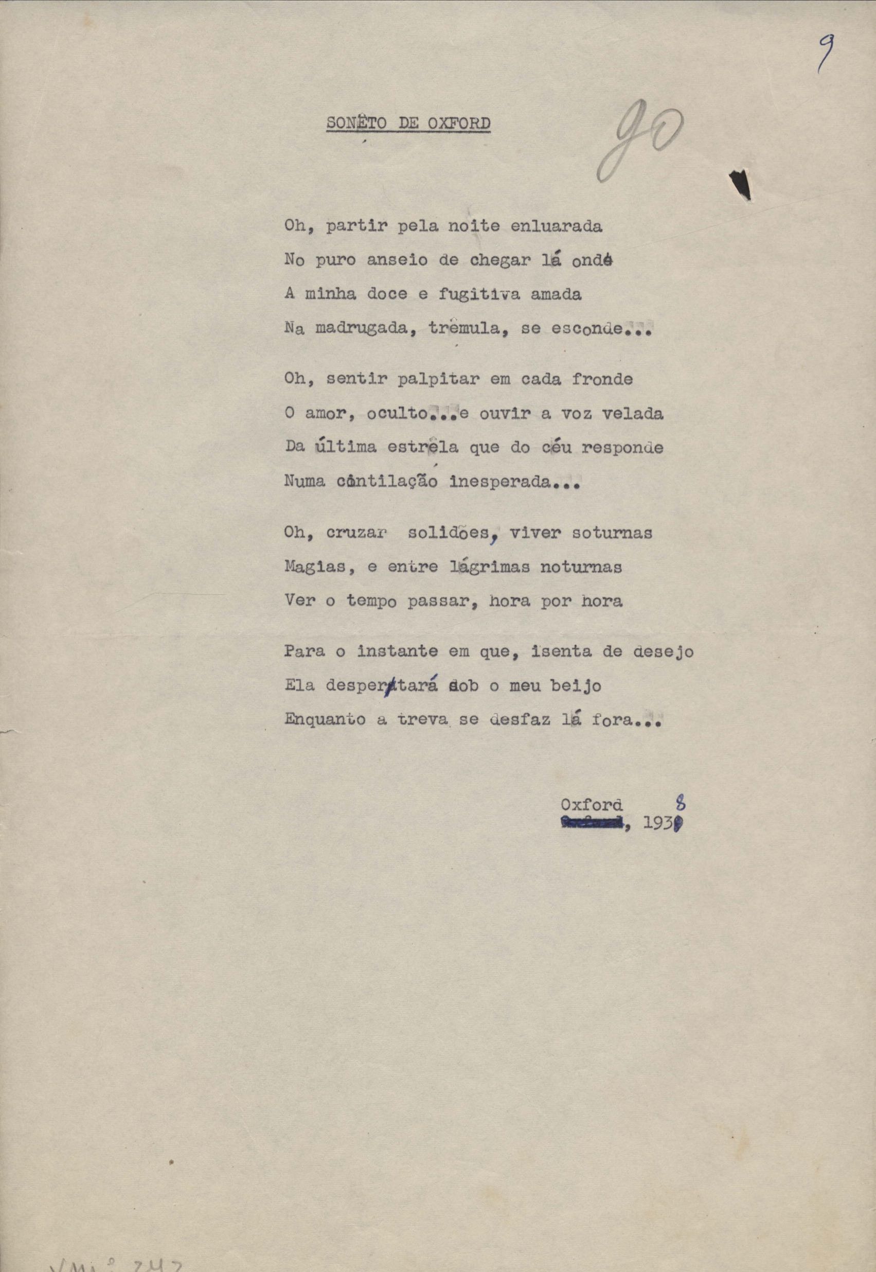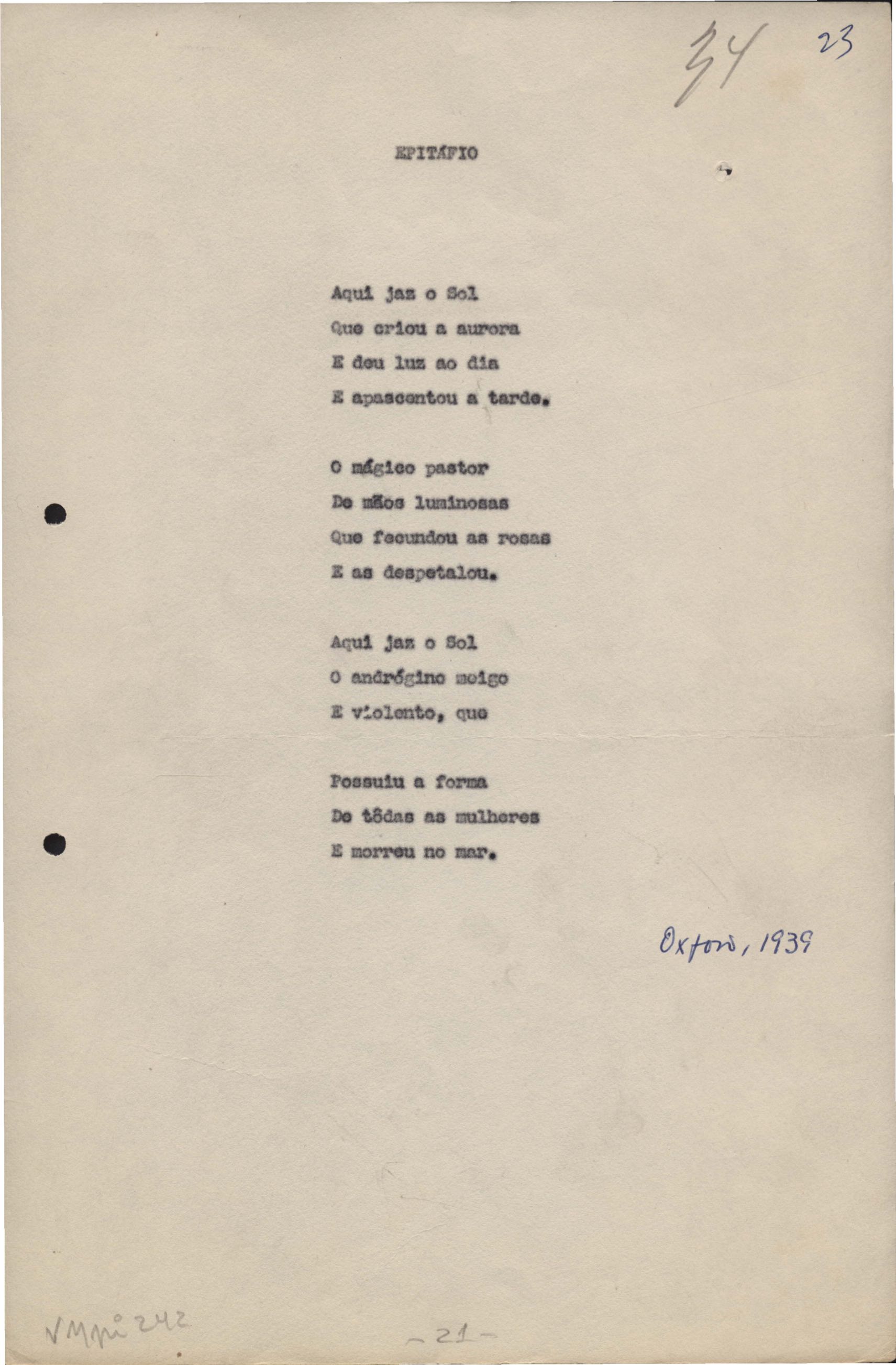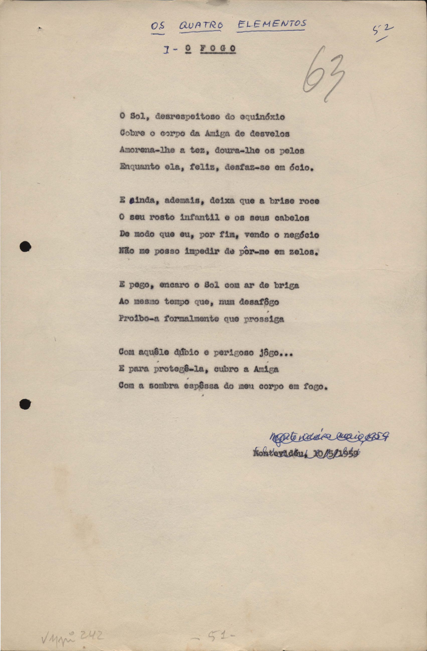 "Soneto de véspera", "Soneto do amor como um rio", "Soneto do amor total", "Soneto do Corifeu", "Soneto do gato morto", "Soneto do maior amor", "Soneto do só ou parábola de Malte Laurids Brigge", "Soneto no sessentenário de Rafael Alberti" e "O verbo no infinito". Anexo: 1. Outras versões manuscritas e datilografadas, com emendas de: "Anfiguri", "O anjo das pernas tortas", "O espectro da rosa", "Máscara mortuária de Graciliano Ramos", "Não comerei da alface a verde pétala", "Poética (II)", "Pôr-do-sol em Itatiaia"; "Os quatro elementos, I - O fogo, III - O ar, IV- água", "Retrato de Maria Lúcia"; "Sonetinho a Portinari"; "Soneto a Florença"; "Soneto a Lasar Segall"; "Soneto a Pablo Neruda"; "Soneto da espera"; "Soneto da hora final"; "Soneto da hora tardia"; "Soneto de Montevidéu", "Soneto de Oxford"; "Soneto de um domingo"; "Soneto do amor como um rio", "Soneto do Corifeu"; "Soneto do gato morto"; "Soneto no sessentenário de Rafael Alberti", "Tríptico na morte de Sergei Mikhailovitch Eisenstein"; 2. Tradução em inglês de "Tríptico na morte de Sergei Mikhailovitch Eisenstein".
