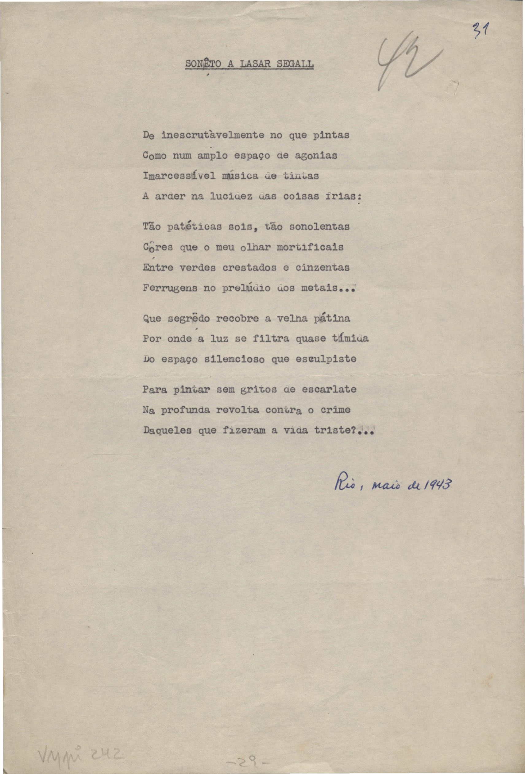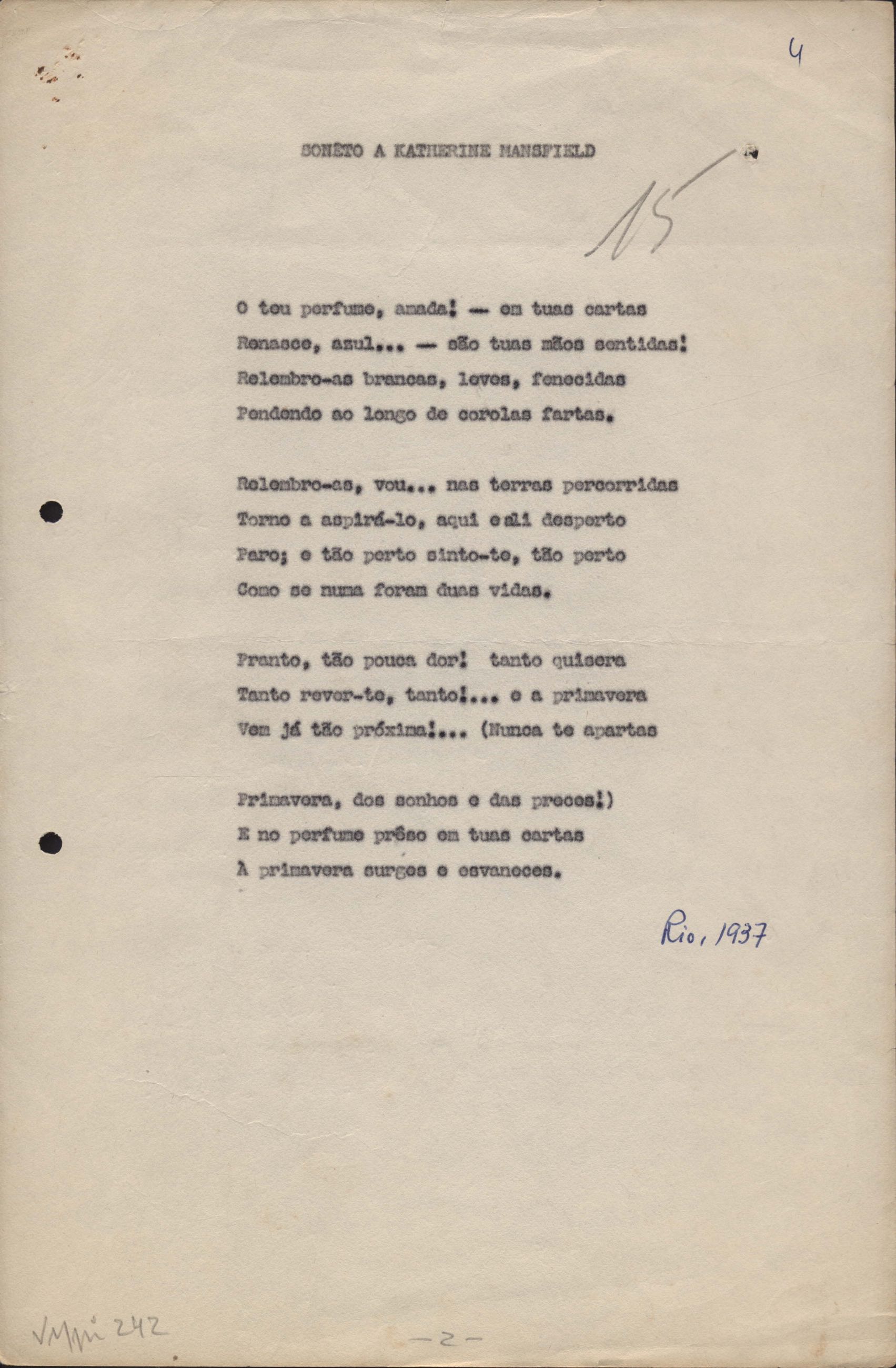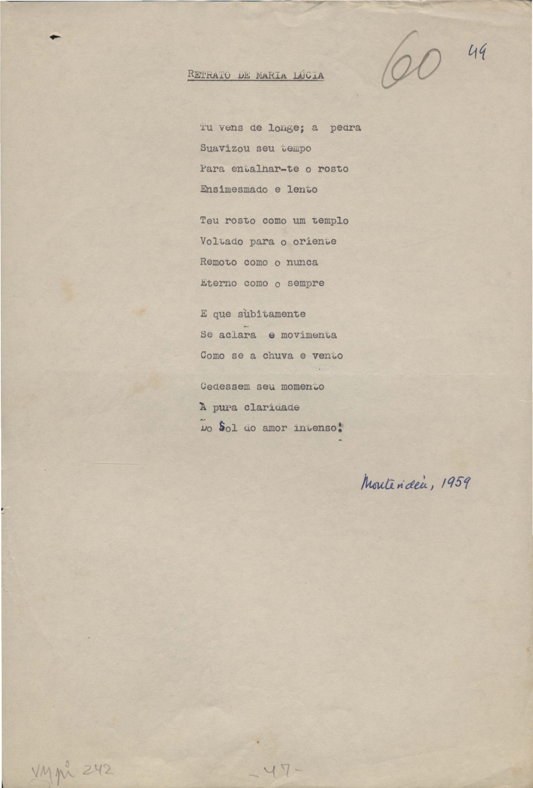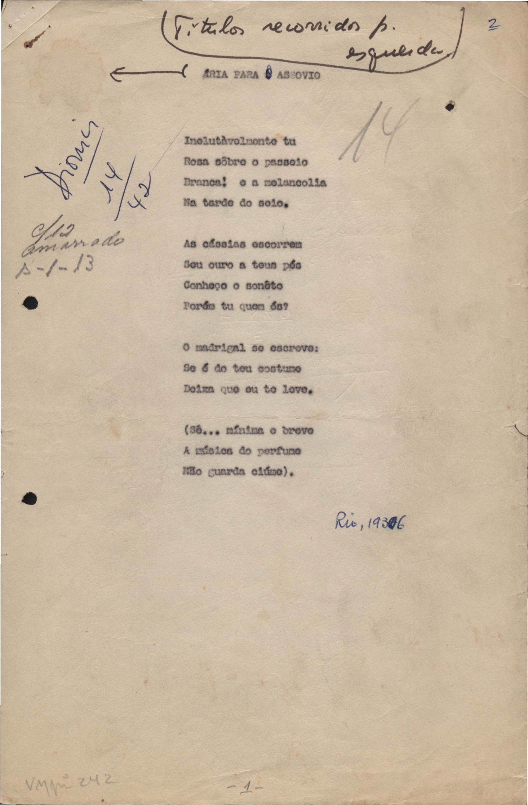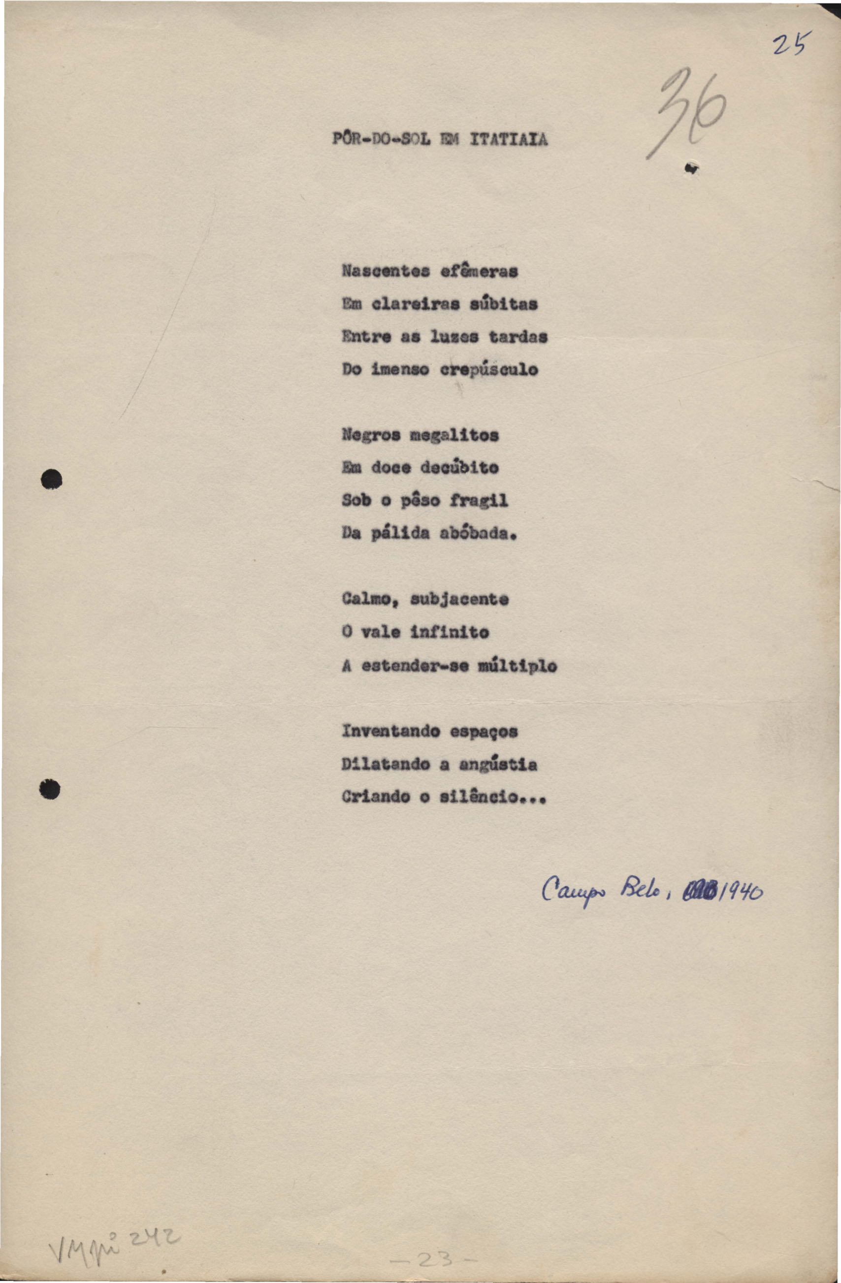 "Soneto de véspera", "Soneto do amor como um rio", "Soneto do amor total", "Soneto do Corifeu", "Soneto do gato morto", "Soneto do maior amor", "Soneto do só ou parábola de Malte Laurids Brigge", "Soneto no sessentenário de Rafael Alberti" e "O verbo no infinito". Anexo: 1. Outras versões manuscritas e datilografadas, com emendas de: "Anfiguri", "O anjo das pernas tortas", "O espectro da rosa", "Máscara mortuária de Graciliano Ramos", "Não comerei da alface a verde pétala", "Poética (II)", "Pôr-do-sol em Itatiaia"; "Os quatro elementos, I - O fogo, III - O ar, IV- água", "Retrato de Maria Lúcia"; "Sonetinho a Portinari"; "Soneto a Florença"; "Soneto a Lasar Segall"; "Soneto a Pablo Neruda"; "Soneto da espera"; "Soneto da hora final"; "Soneto da hora tardia"; "Soneto de Montevidéu", "Soneto de Oxford"; "Soneto de um domingo"; "Soneto do amor como um rio", "Soneto do Corifeu"; "Soneto do gato morto"; "Soneto no sessentenário de Rafael Alberti", "Tríptico na morte de Sergei Mikhailovitch Eisenstein"; 2. Tradução em inglês de "Tríptico na morte de Sergei Mikhailovitch Eisenstein".