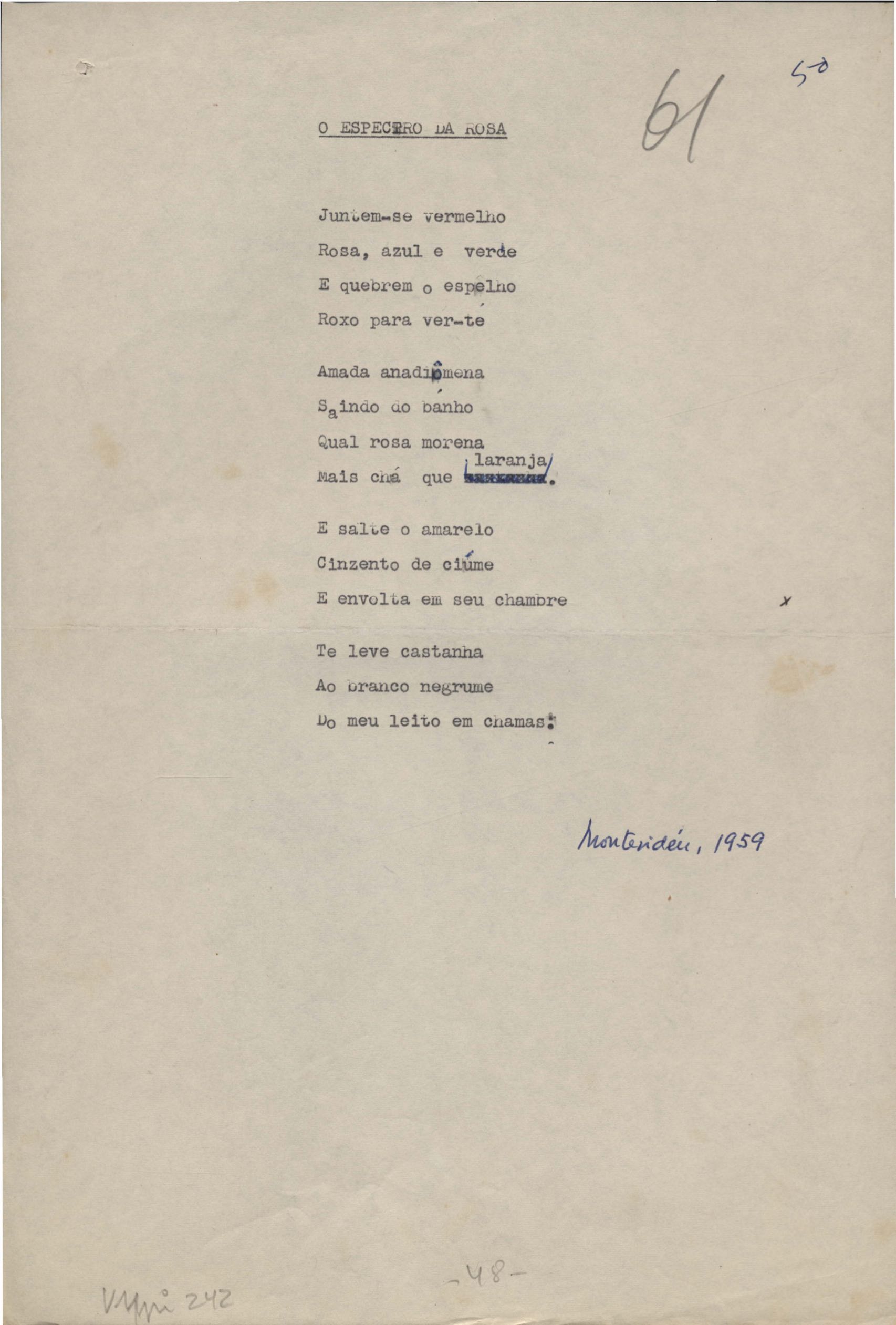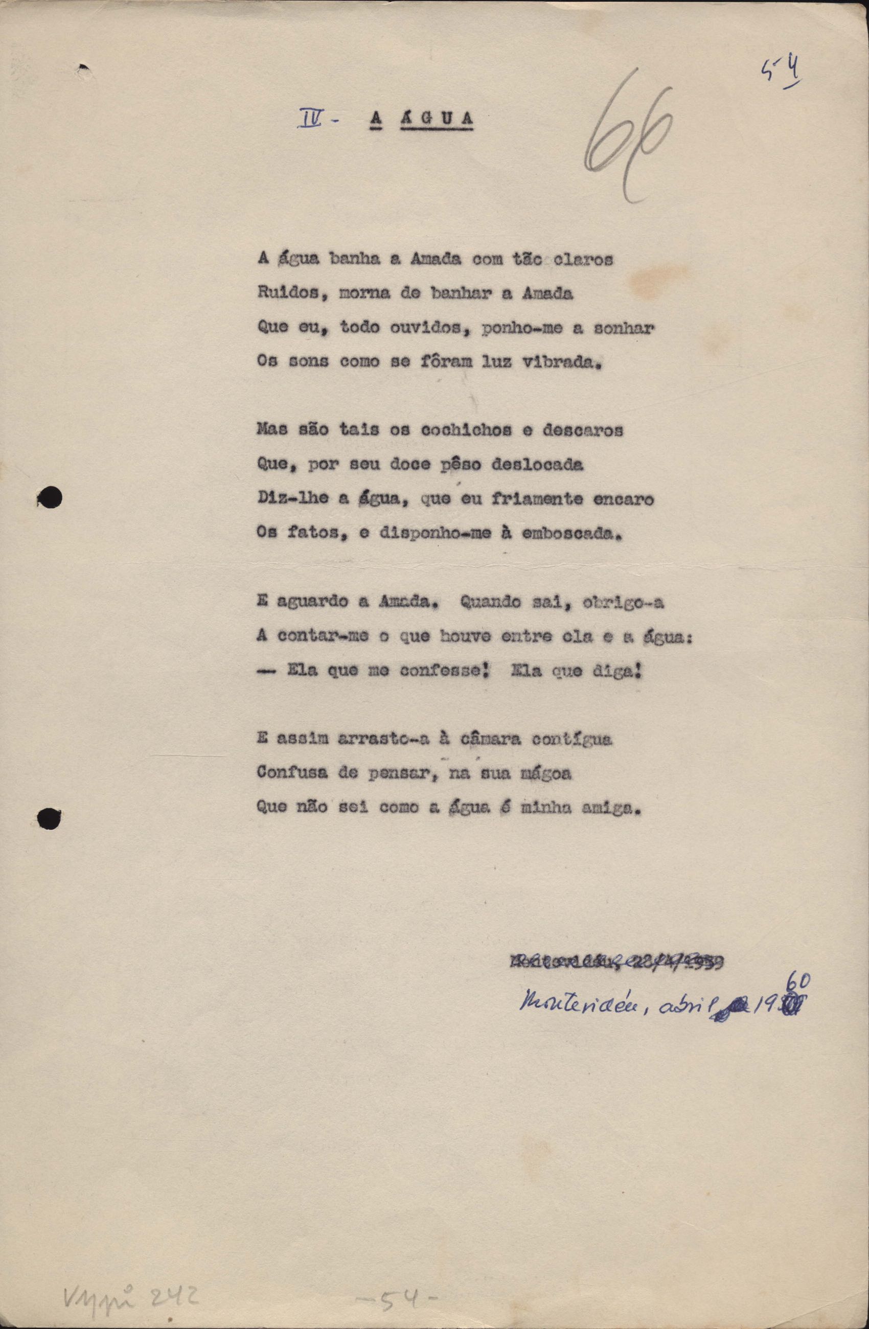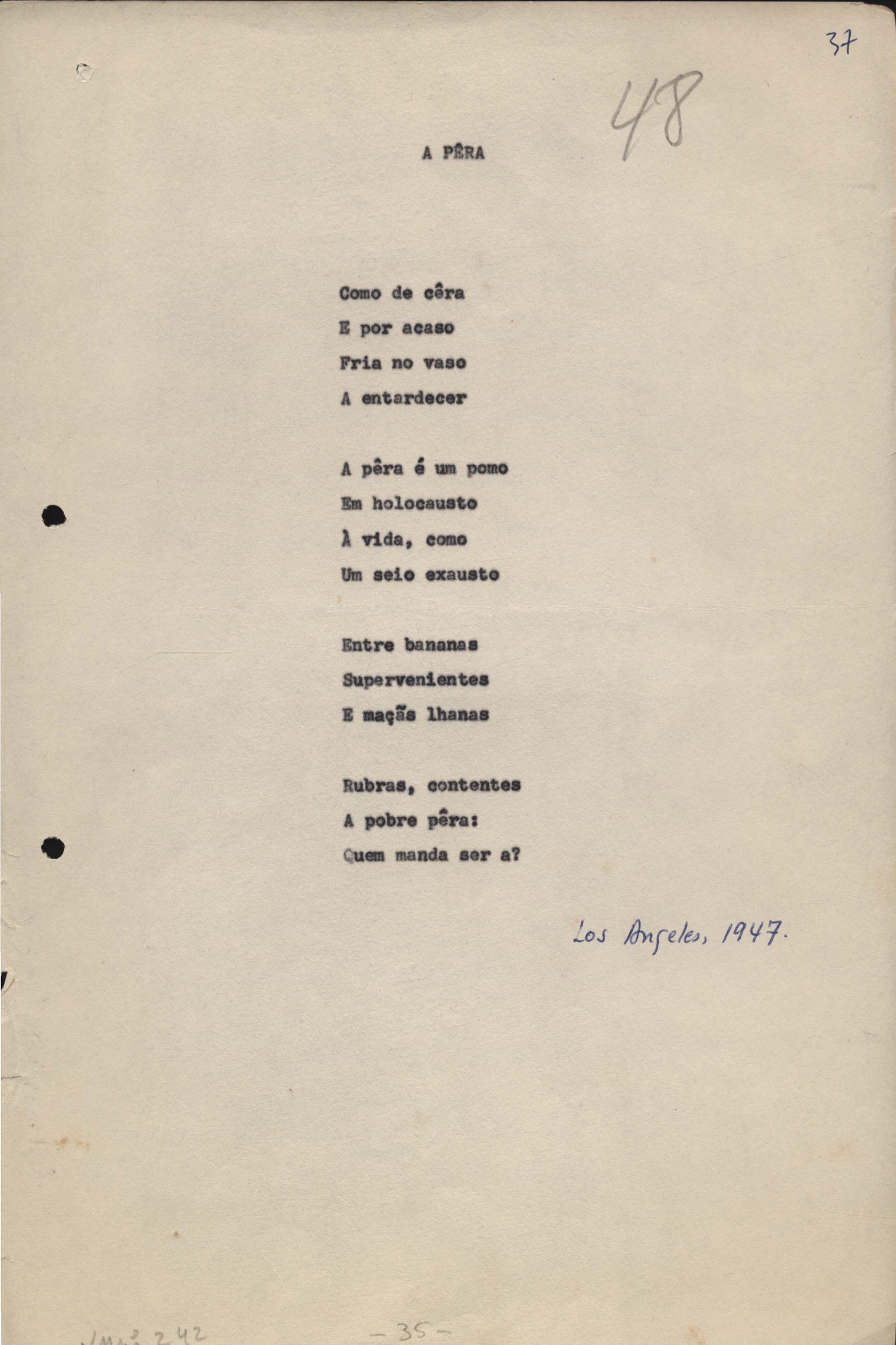 Poemas (54). "Allegro", "Anfiguri", "O anjo das pernas tortas", "Ária para assovio", "Bilhete a Baudelaire", "Epitáfio", "O escândalo da rosa", "O espectro da rosa", "Máscara mortuária de Graciliano Ramos", "Na morte de Sergei Mikhailovitch Eisenstein" [publ. "Tríptico na morte de Sergei Mikhailovitch Eisenstein"], "Não comerei da alface a verde pétala", "A pêra", "Poética", "Poética (II)", "Pôr-do-sol em Itatiaia", "Os quatro elementos: I - O fogo, II - A terra, III - O ar, IV - A água", "Quatro sonetos de meditação", "Retrato de Maria Lúcia", "Sonetinho a Portinari", "Soneto de um domingo", "Soneto a Florença", "Soneto a Katherine Mansfield", "Soneto a Lasar Segall", "Soneto à lua", "Soneto a Otávio de Faria", "Soneto a Pablo Neruda", "Soneto ao inverno", "Soneto da espera", "Soneto da hora final", "Soneto da mulher ao sol", "Soneto da mulher inútil", "Soneto da rosa", "Soneto de agosto", "Soneto de aniversário", "Soneto de carnaval", "Soneto de contrição", "Soneto de despedida", "Soneto de devoção", "Soneto de fidelidade", "Soneto de Londres", "Soneto de maioridade", "Soneto de Montevidéu", "Soneto de Oxford", "Soneto de quarta-Feira de cinzas", "Soneto de separação",