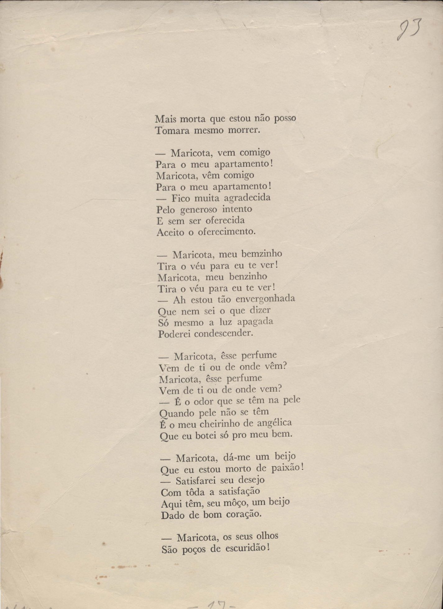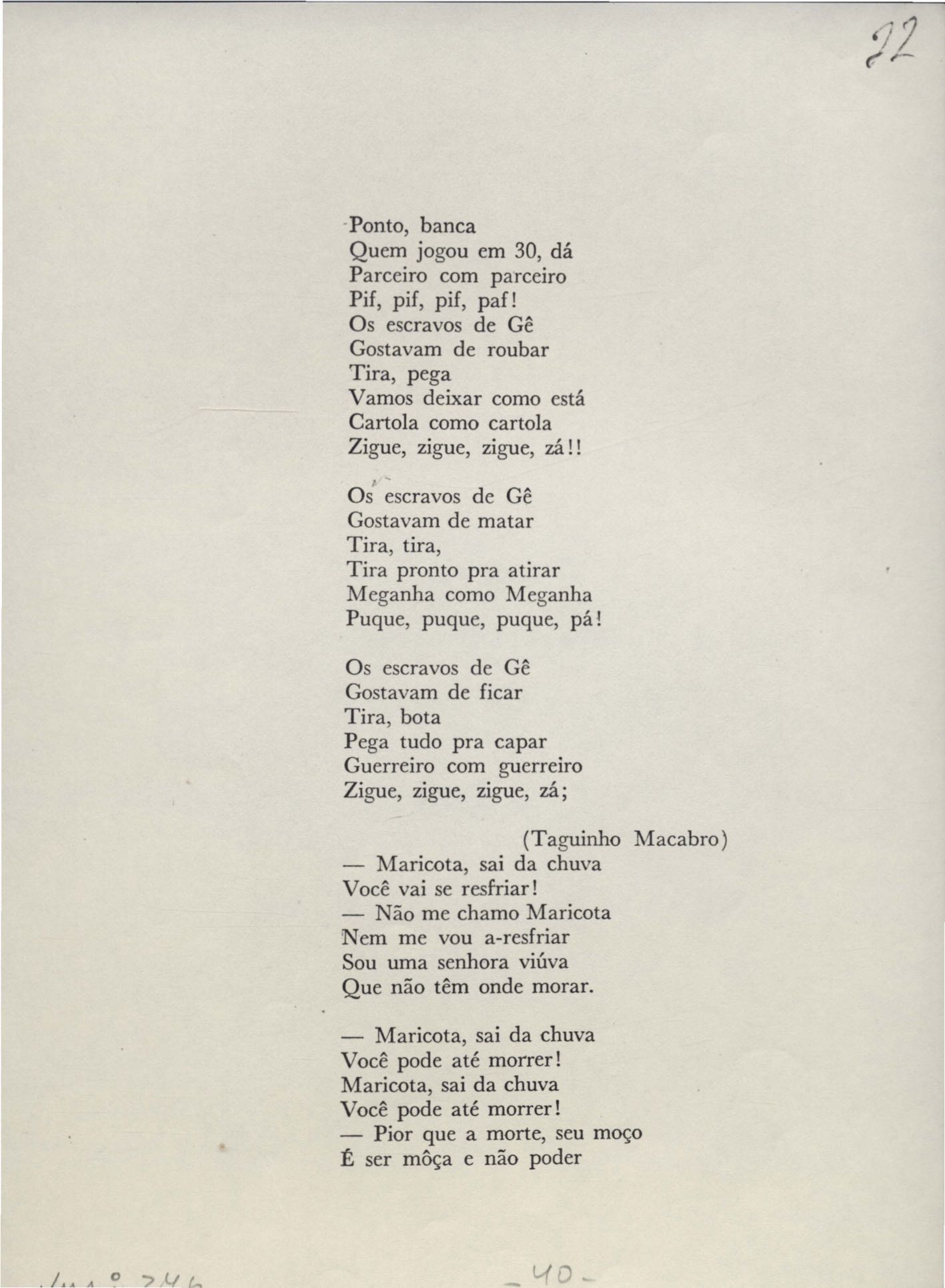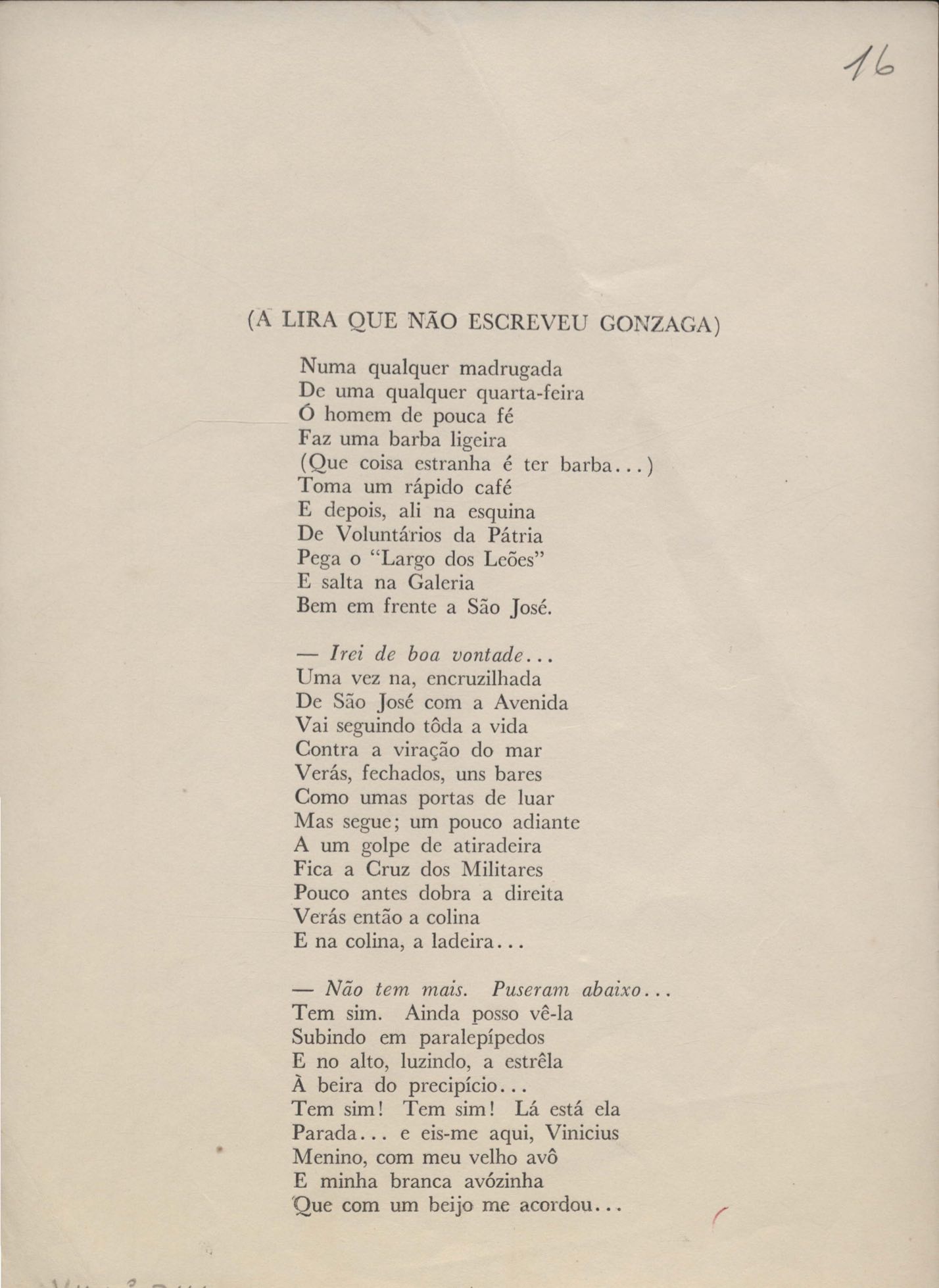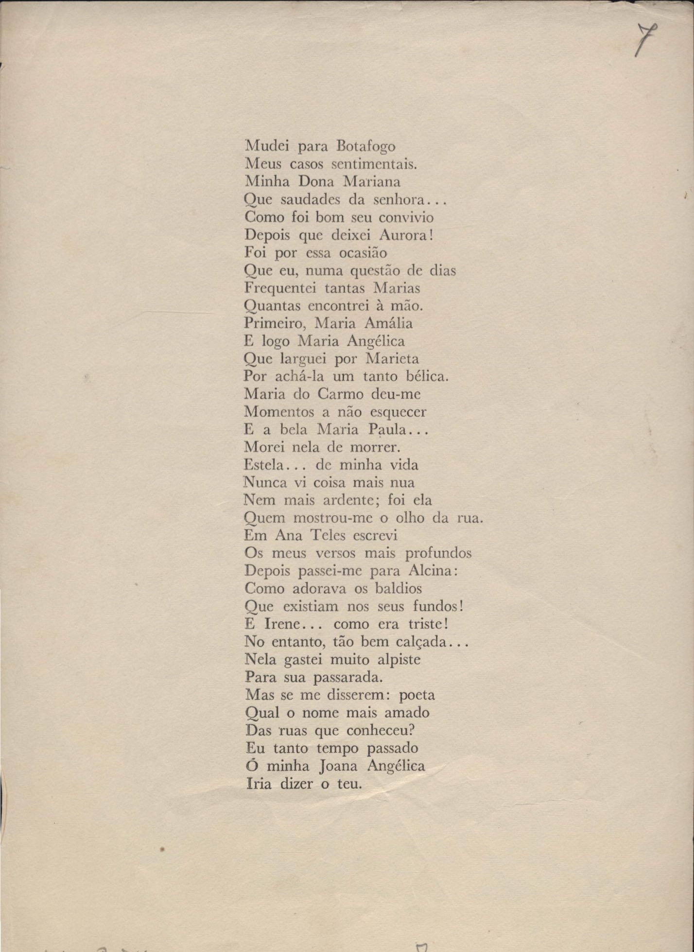 Poemas (31). "Avenida Rio Branco", "Balada das lavadeiras", "Balada de Botafogo", "Balada de Di Cavalcanti", "Balada do bumba-meu-boi", "Cartão", "Cartão-postal", "Cidadão da Gávea", "A cidade antiga", "A cidade em progresso", "Copacabana", "O corta-jaca", "História do samba", "Ilha do Governador (meio-dia em Cocotá)", "Jogo de empurra", "Jogos e folguedos I" [publ. "Jogos e folguedos: Maria Mulata"], "Jogos e folguedos II: rua Conde de Lage", "Lembrete", "Lira que não escreveu Gonzaga" [publ. "O morro do castelo (A lira que não escreveu Gonzaga)"], "Lopes Quintas (a rua onde nasci)", "As mimosas cravinas", "Minha Lapa (Lapa do desterro ou de Bandeira)", "Modinha", "A mulher carioca", "O namorado das ruas", "A primeira namorada", "Redondilhas a Laranjeiras", "Rua das Acácias", "Rua do Catete", "Soneto do Café Lamas" e "Tanguinho macabro". Anexo: 1. Outras versões manuscritas e datilografadas; 2. Prova tipográfica.