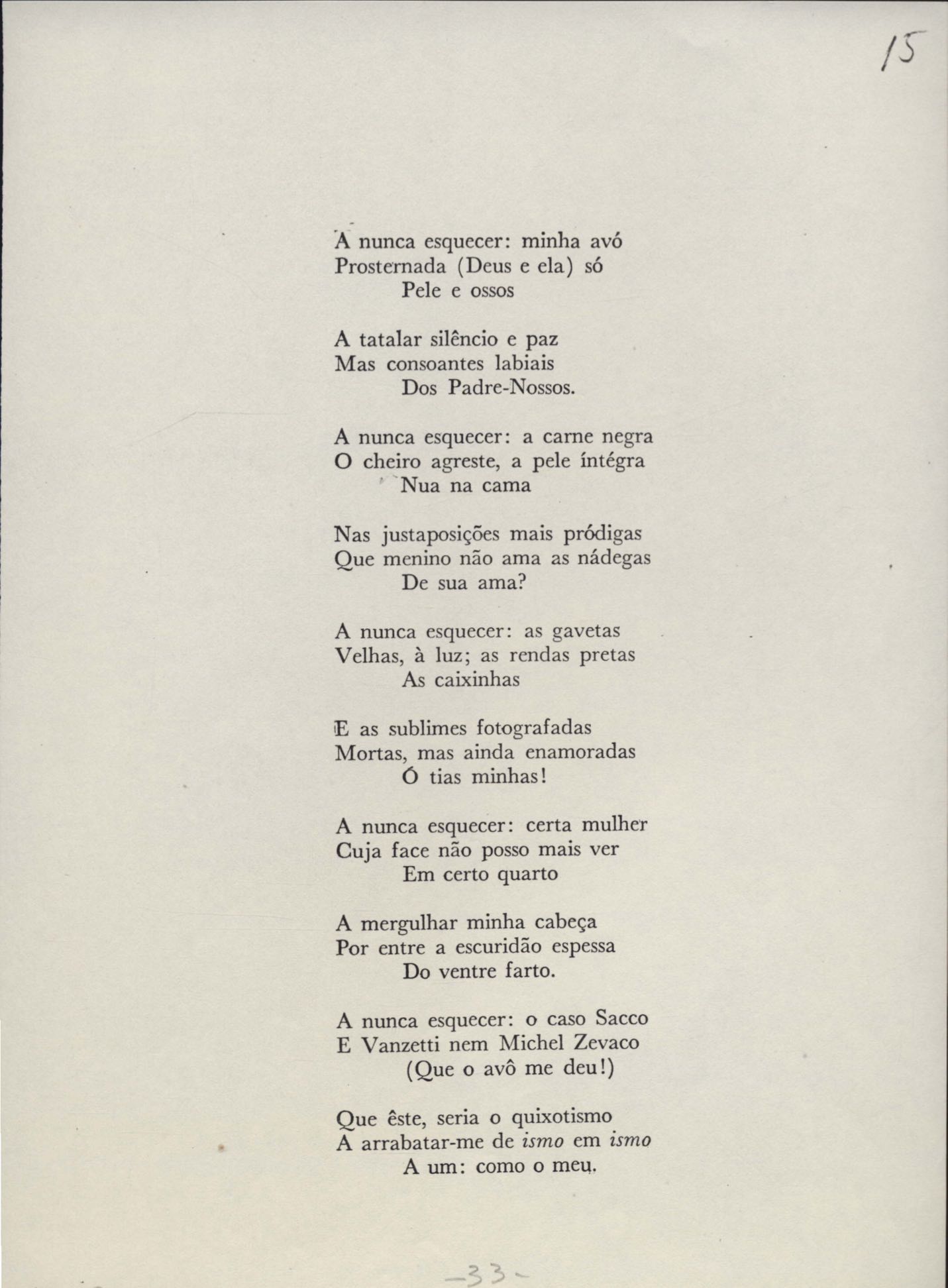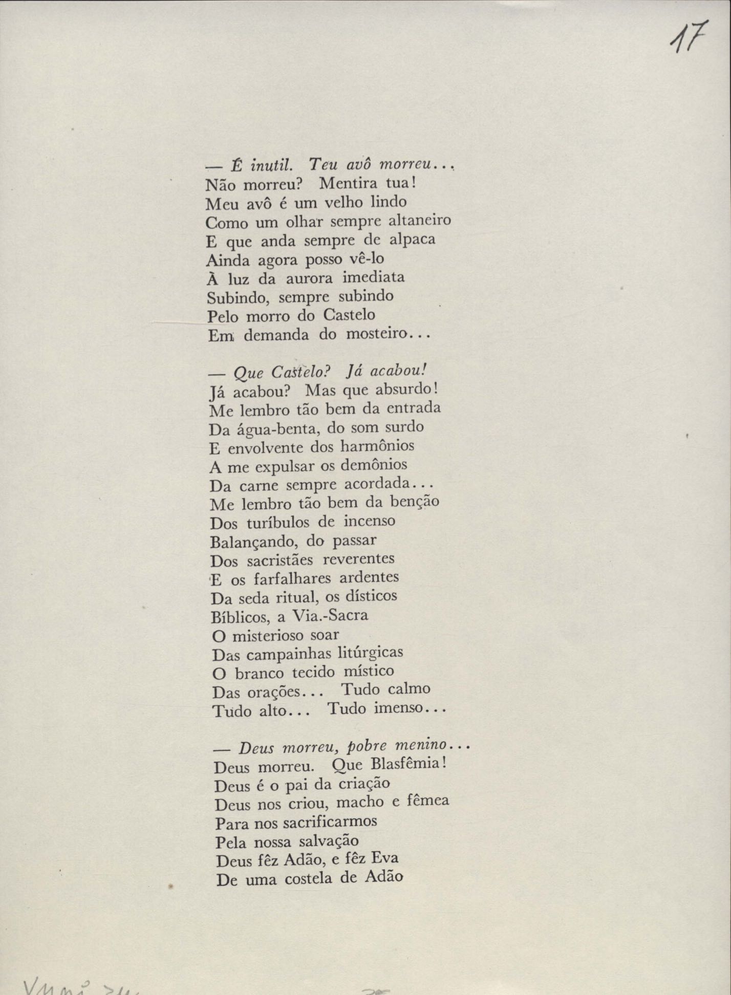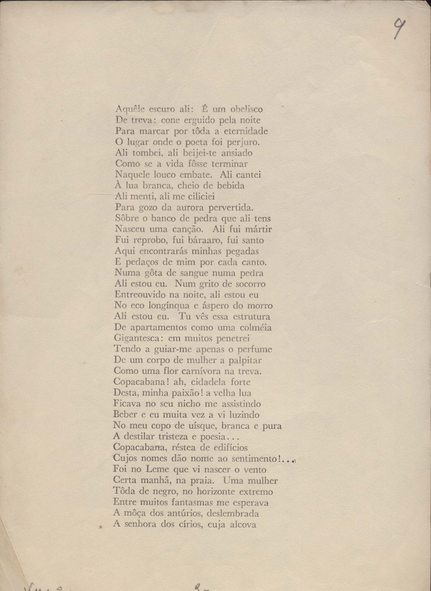 Dossiê dividido em seis partes. A prova tipográfica está incompleta. "Copacabana" aparece também em Novos poemas II e "Rua da Amargura" aparece também em O caminho para a distância.