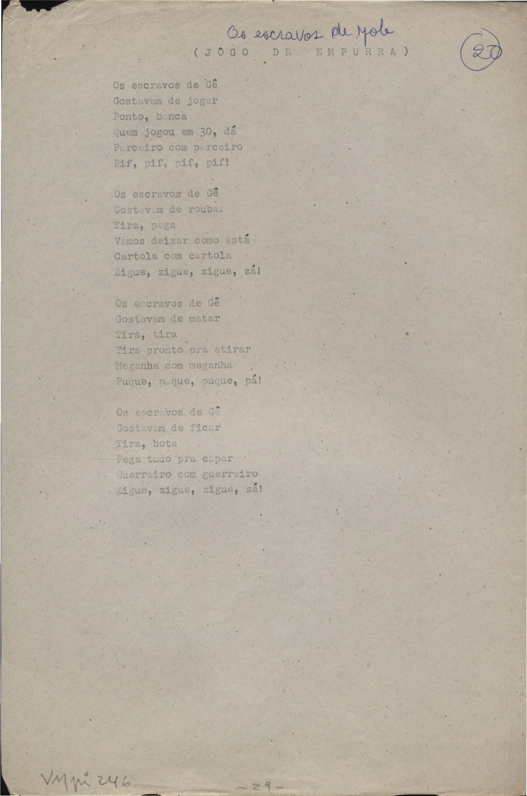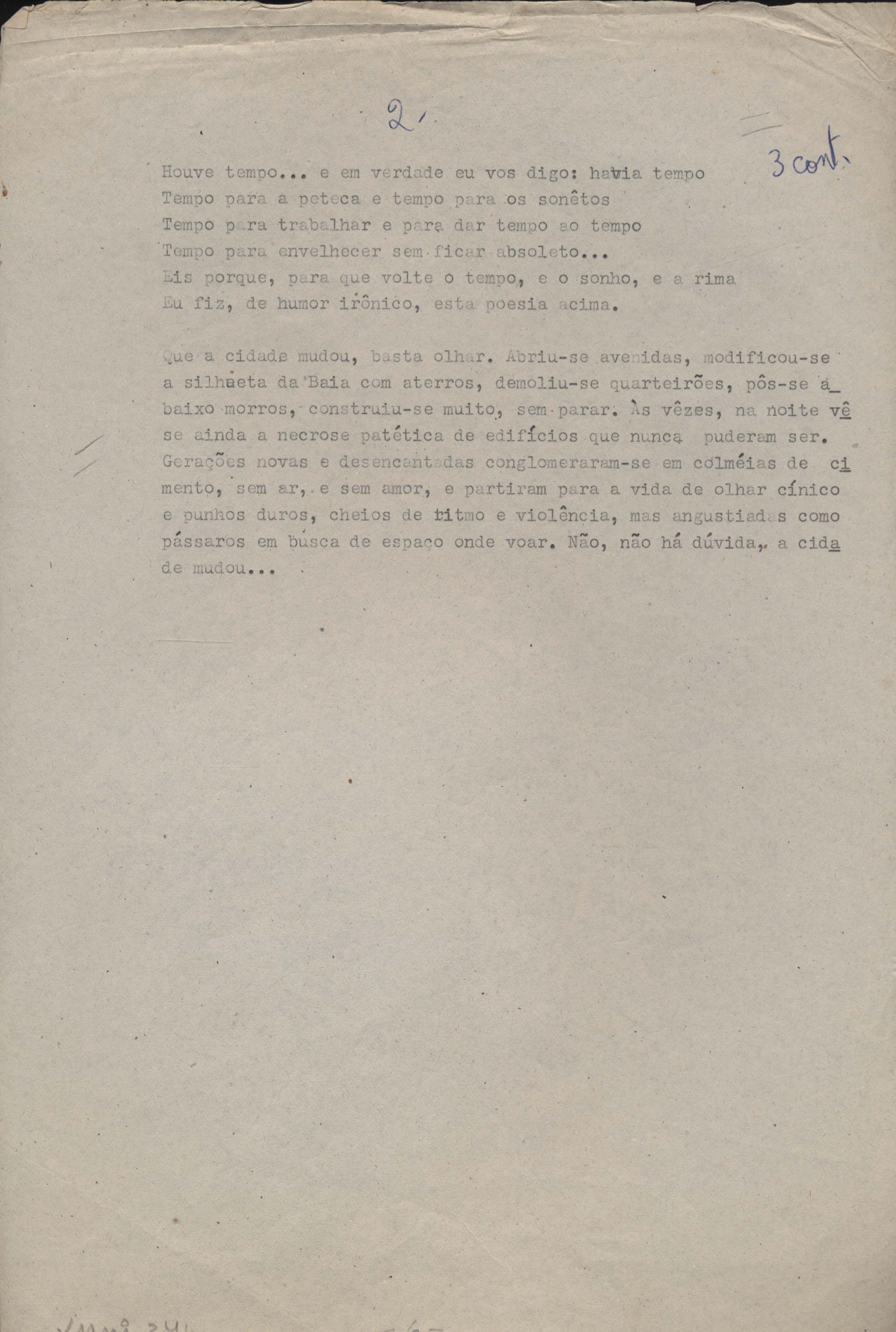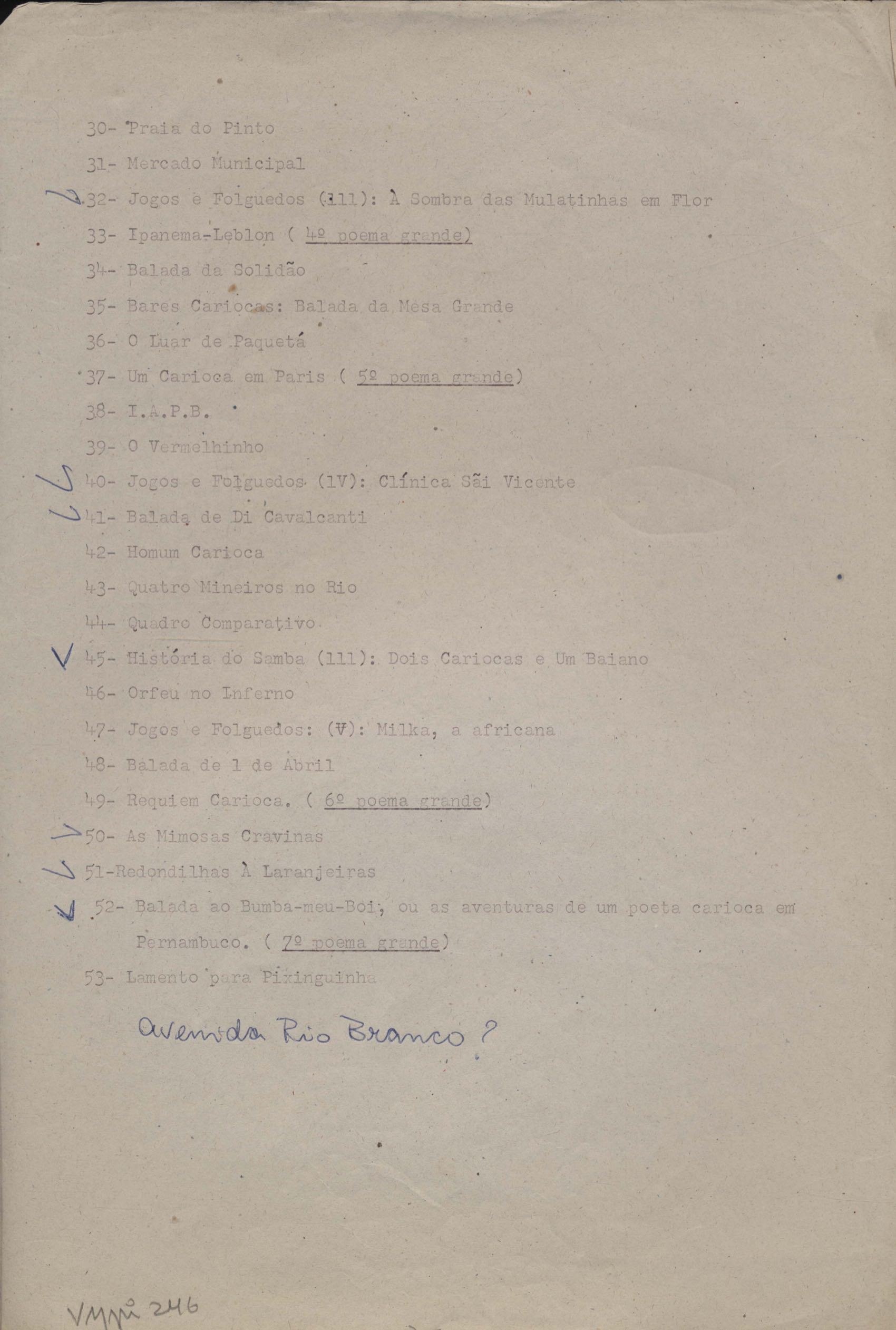 Poemas (31). "Avenida Rio Branco", "Balada das lavadeiras", "Balada de Botafogo", "Balada de Di Cavalcanti", "Balada do bumba-meu-boi", "Cartão", "Cartão-postal", "Cidadão da Gávea", "A cidade antiga", "A cidade em progresso", "Copacabana", "O corta-jaca", "História do samba", "Ilha do Governador (meio-dia em Cocotá)", "Jogo de empurra", "Jogos e folguedos I" [publ. "Jogos e folguedos: Maria Mulata"], "Jogos e folguedos II: rua Conde de Lage", "Lembrete", "Lira que não escreveu Gonzaga" [publ. "O morro do castelo (A lira que não escreveu Gonzaga)"], "Lopes Quintas (a rua onde nasci)", "As mimosas cravinas", "Minha Lapa (Lapa do desterro ou de Bandeira)", "Modinha", "A mulher carioca", "O namorado das ruas", "A primeira namorada", "Redondilhas a Laranjeiras", "Rua das Acácias", "Rua do Catete", "Soneto do Café Lamas" e "Tanguinho macabro". Anexo: 1. Outras versões manuscritas e datilografadas; 2. Prova tipográfica.