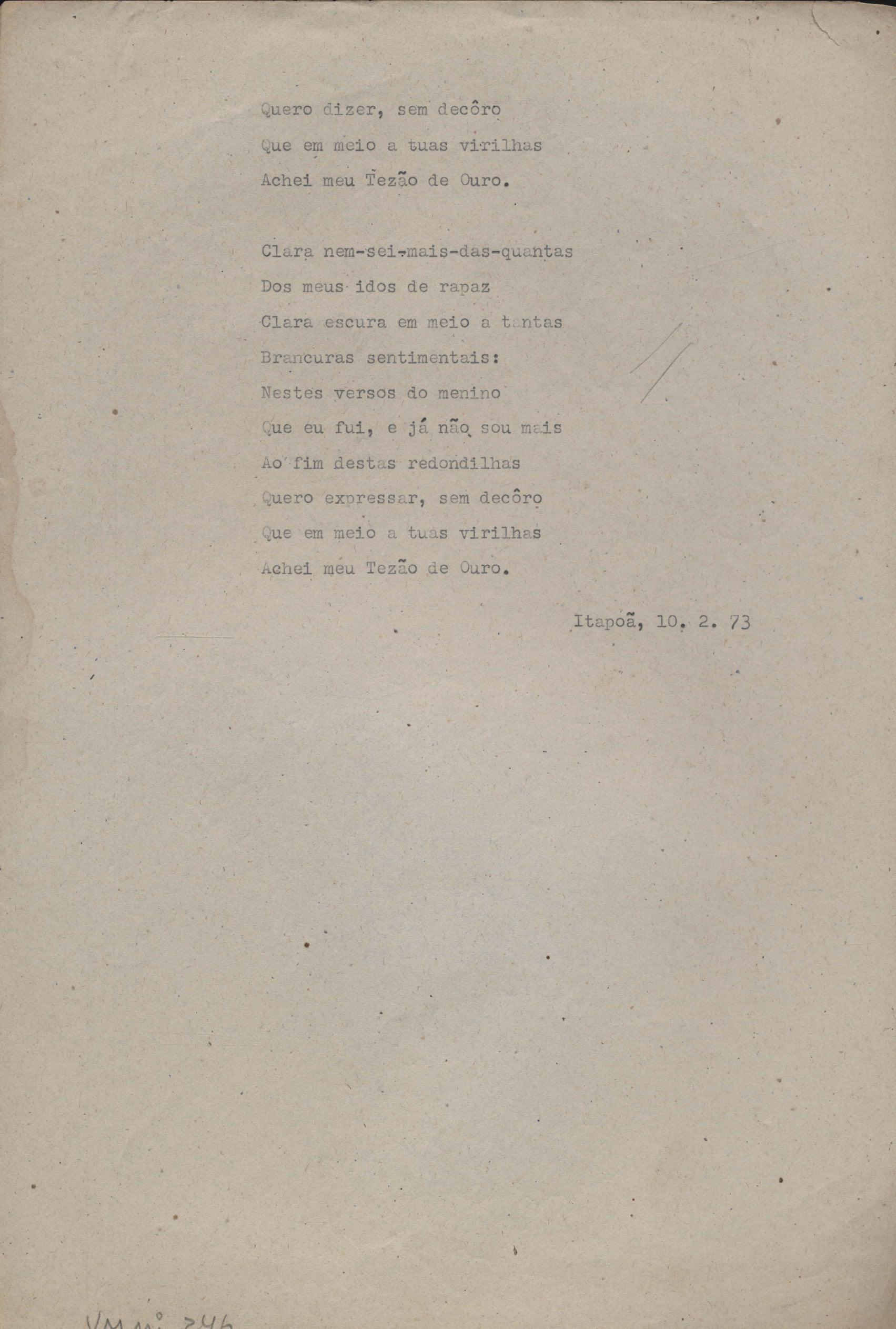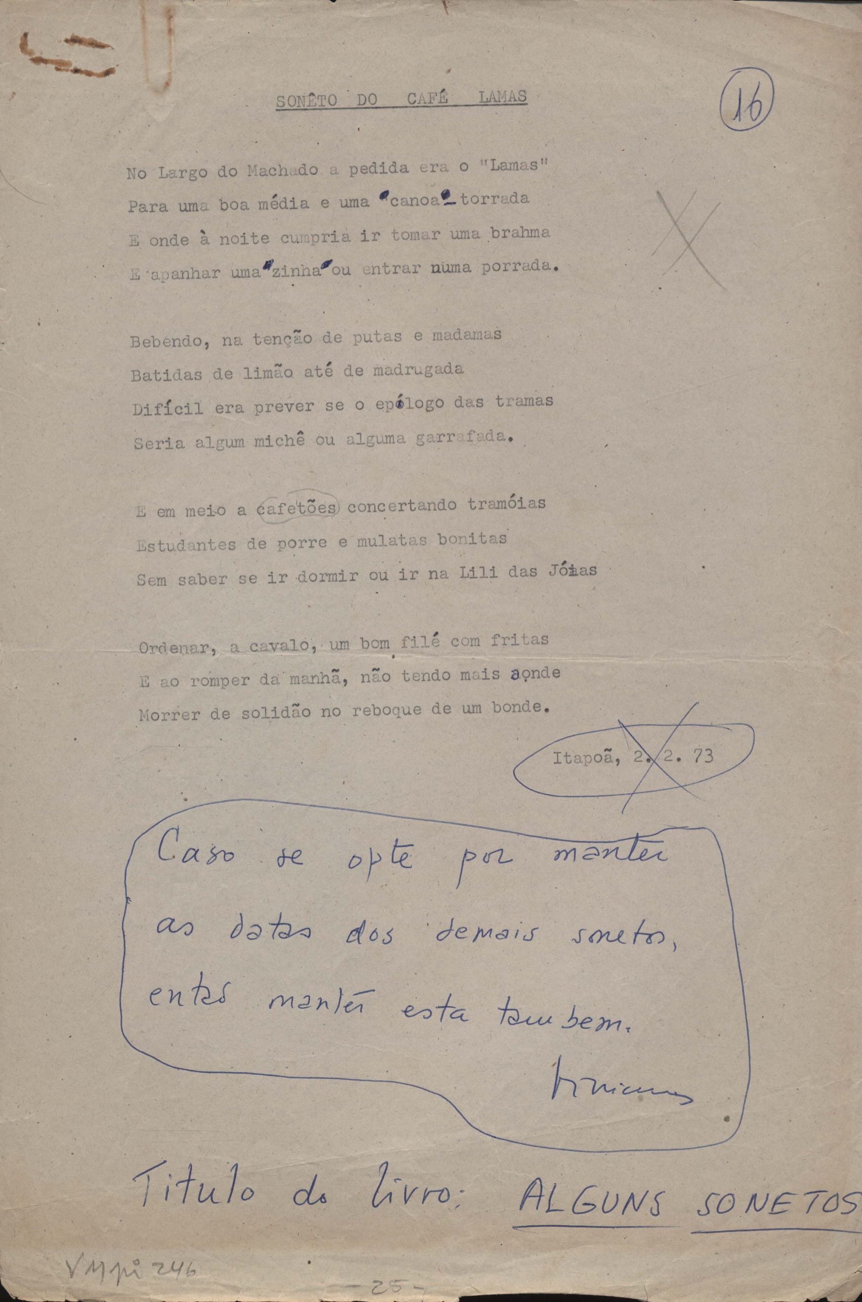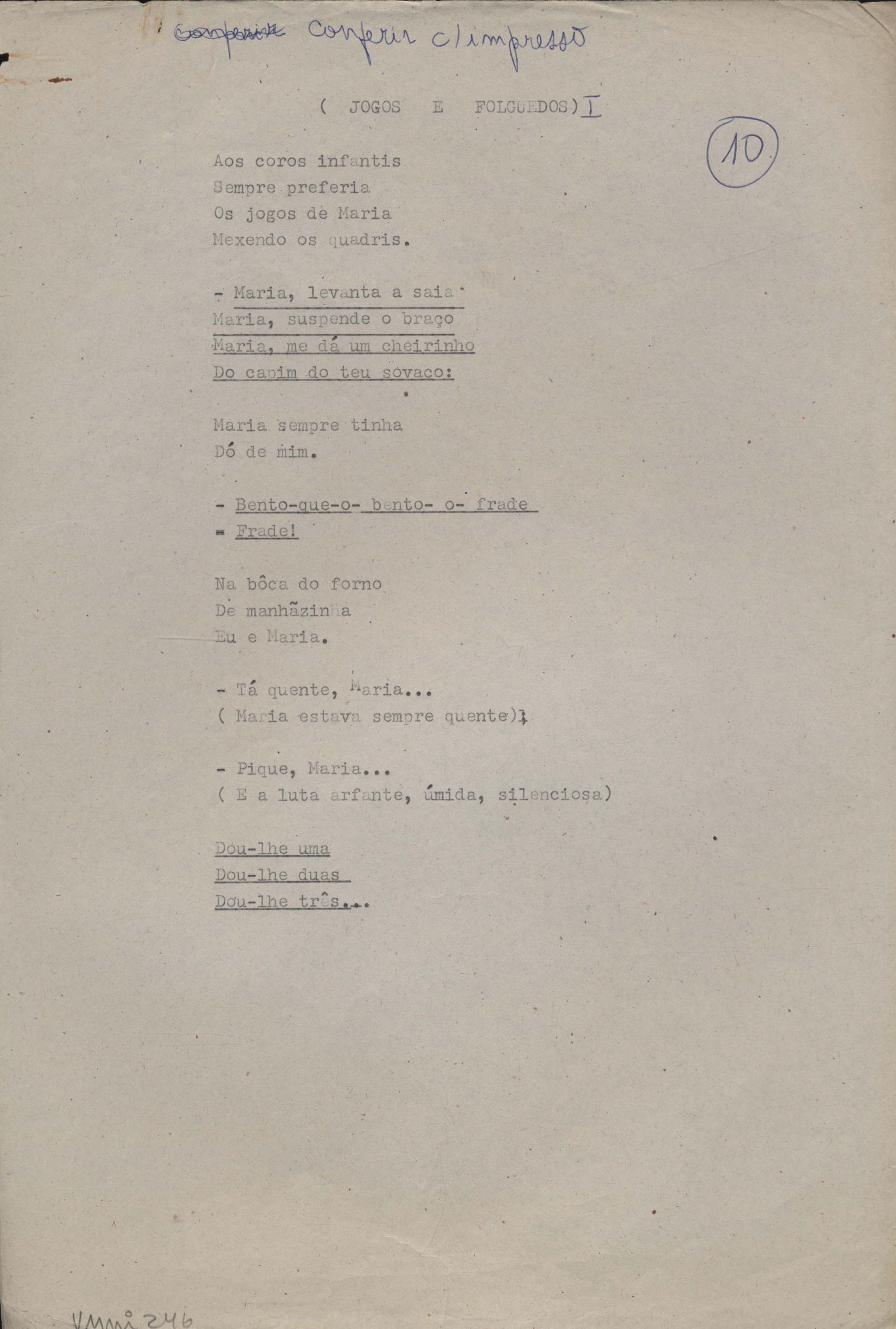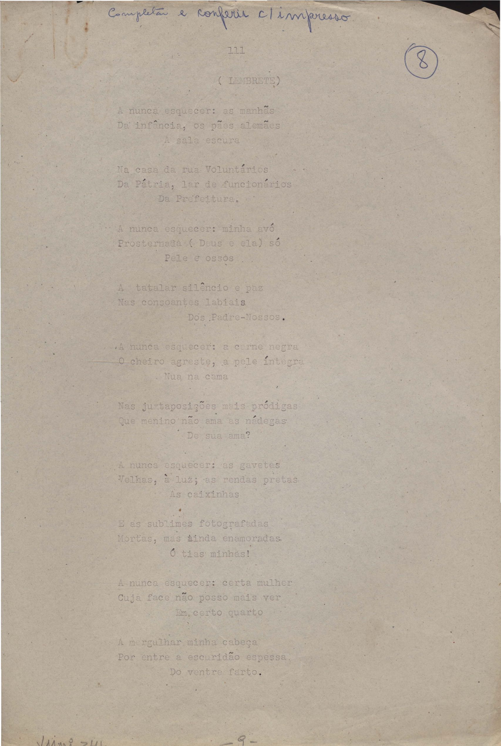 Dossiê dividido em seis partes. A prova tipográfica está incompleta. "Copacabana" aparece também em Novos poemas II e "Rua da Amargura" aparece também em O caminho para a distância.