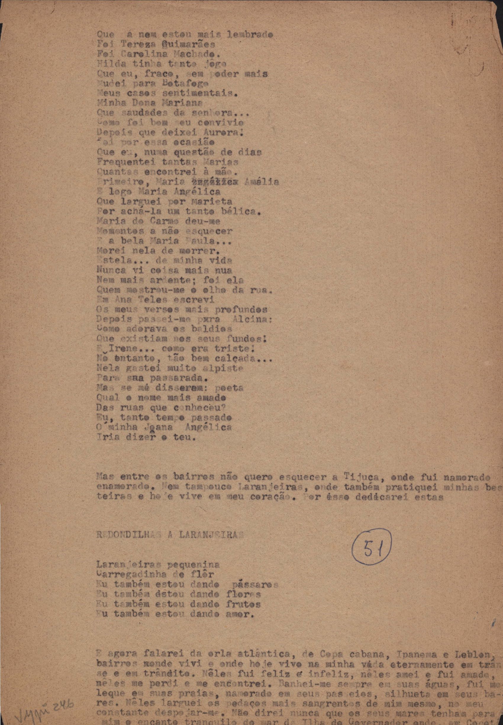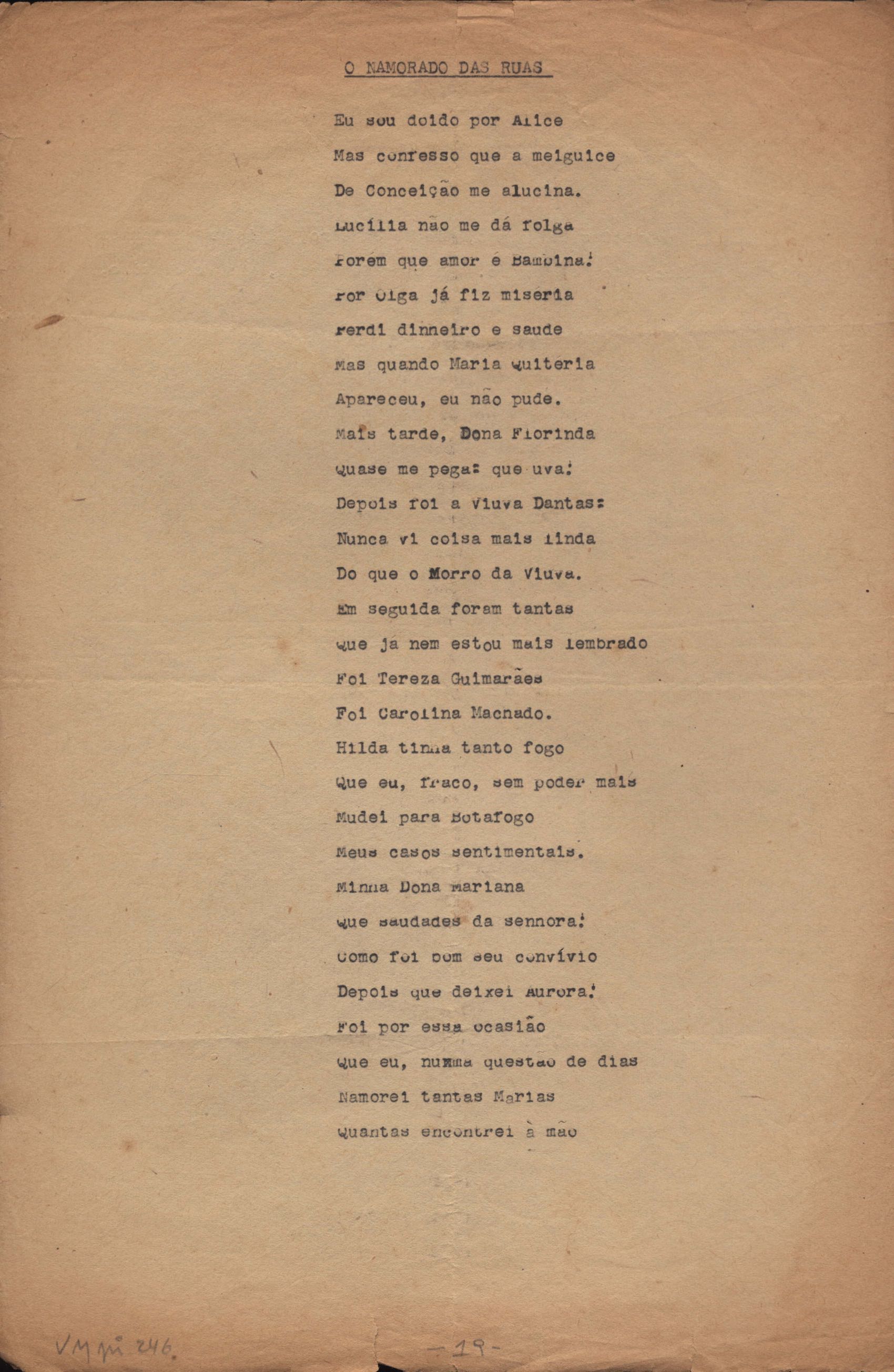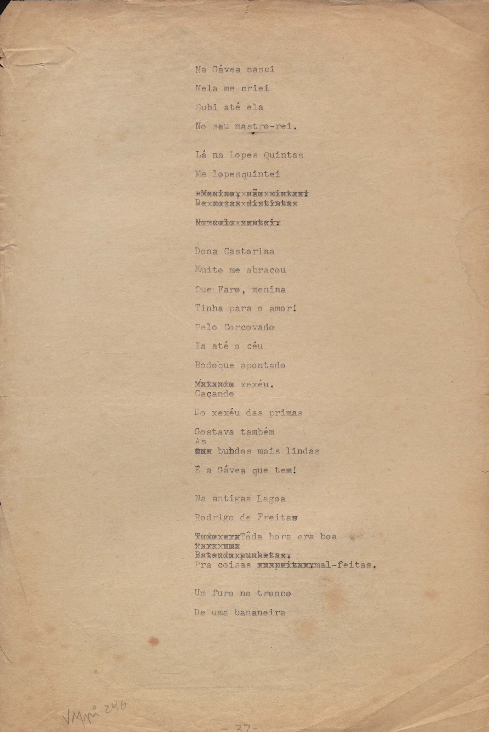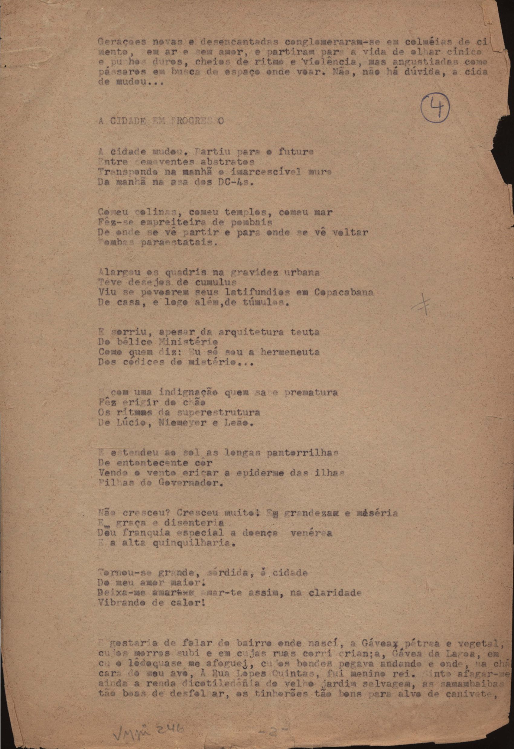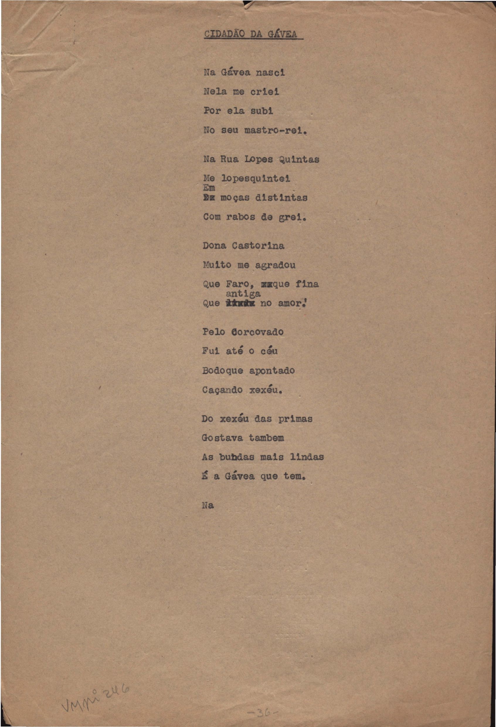 Poemas (31). "Avenida Rio Branco", "Balada das lavadeiras", "Balada de Botafogo", "Balada de Di Cavalcanti", "Balada do bumba-meu-boi", "Cartão", "Cartão-postal", "Cidadão da Gávea", "A cidade antiga", "A cidade em progresso", "Copacabana", "O corta-jaca", "História do samba", "Ilha do Governador (meio-dia em Cocotá)", "Jogo de empurra", "Jogos e folguedos I" [publ. "Jogos e folguedos: Maria Mulata"], "Jogos e folguedos II: rua Conde de Lage", "Lembrete", "Lira que não escreveu Gonzaga" [publ. "O morro do castelo (A lira que não escreveu Gonzaga)"], "Lopes Quintas (a rua onde nasci)", "As mimosas cravinas", "Minha Lapa (Lapa do desterro ou de Bandeira)", "Modinha", "A mulher carioca", "O namorado das ruas", "A primeira namorada", "Redondilhas a Laranjeiras", "Rua das Acácias", "Rua do Catete", "Soneto do Café Lamas" e "Tanguinho macabro". Anexo: 1. Outras versões manuscritas e datilografadas; 2. Prova tipográfica.