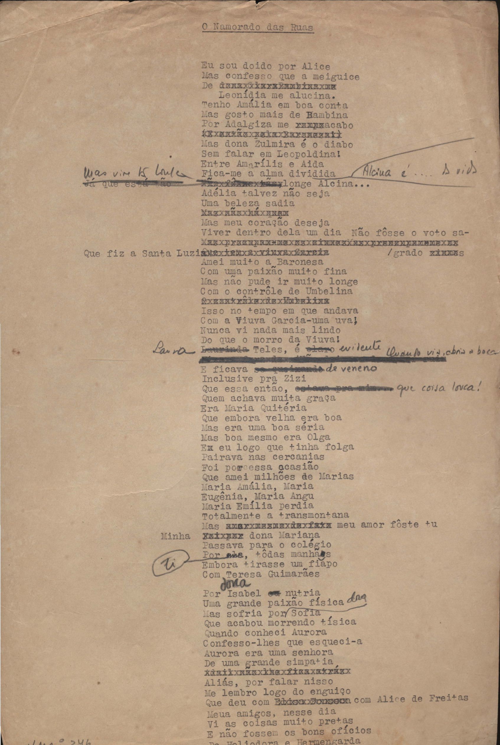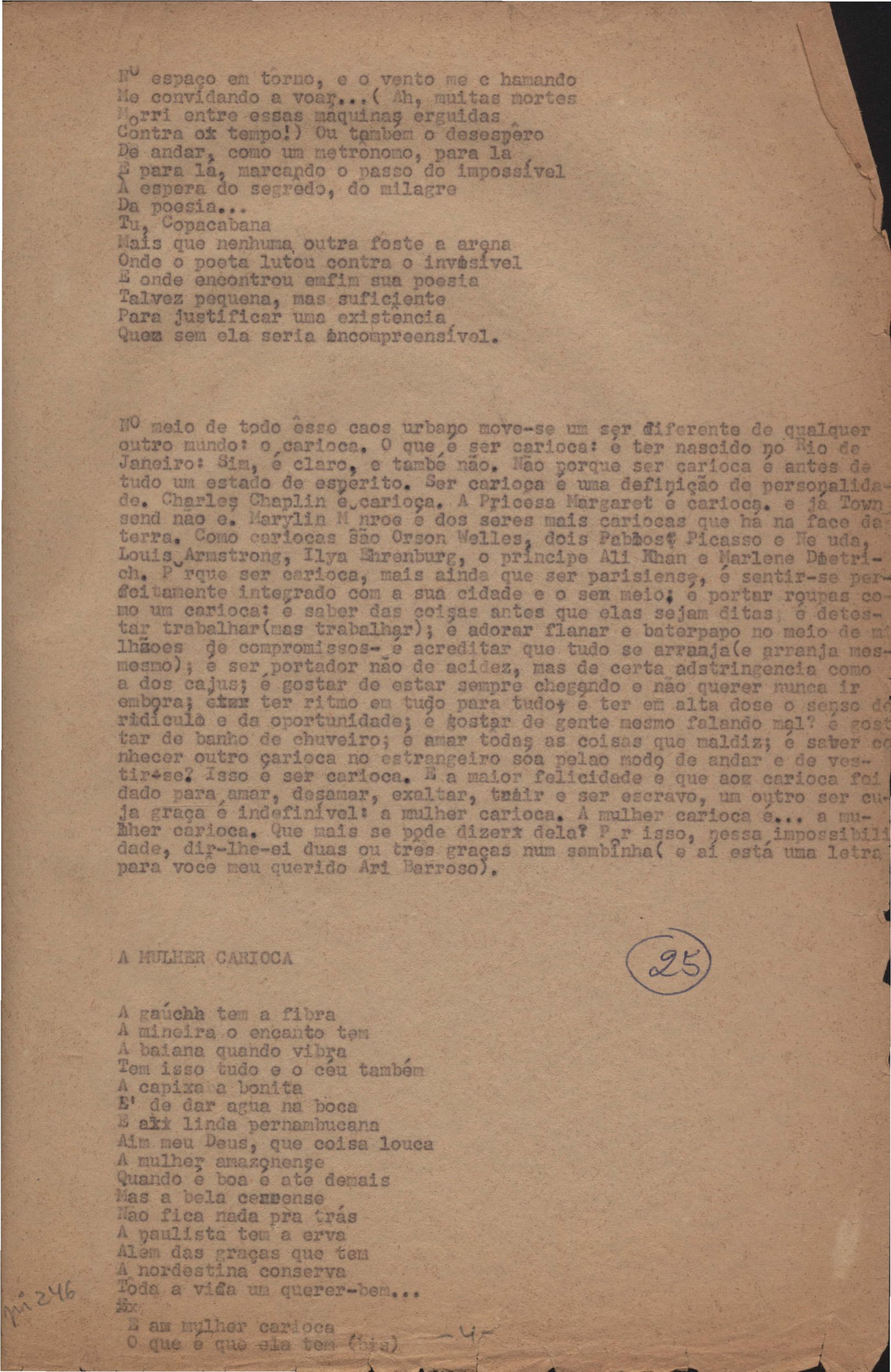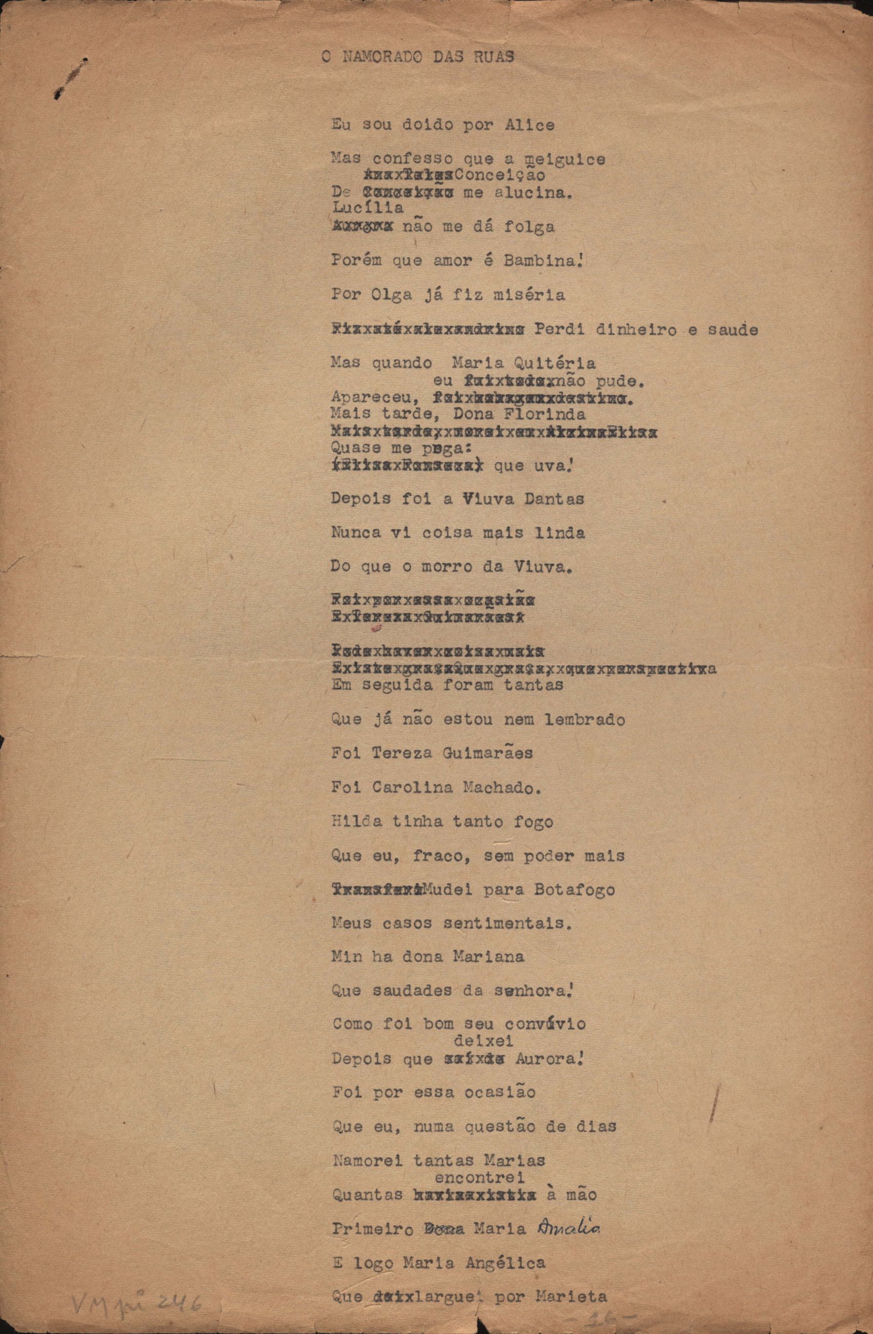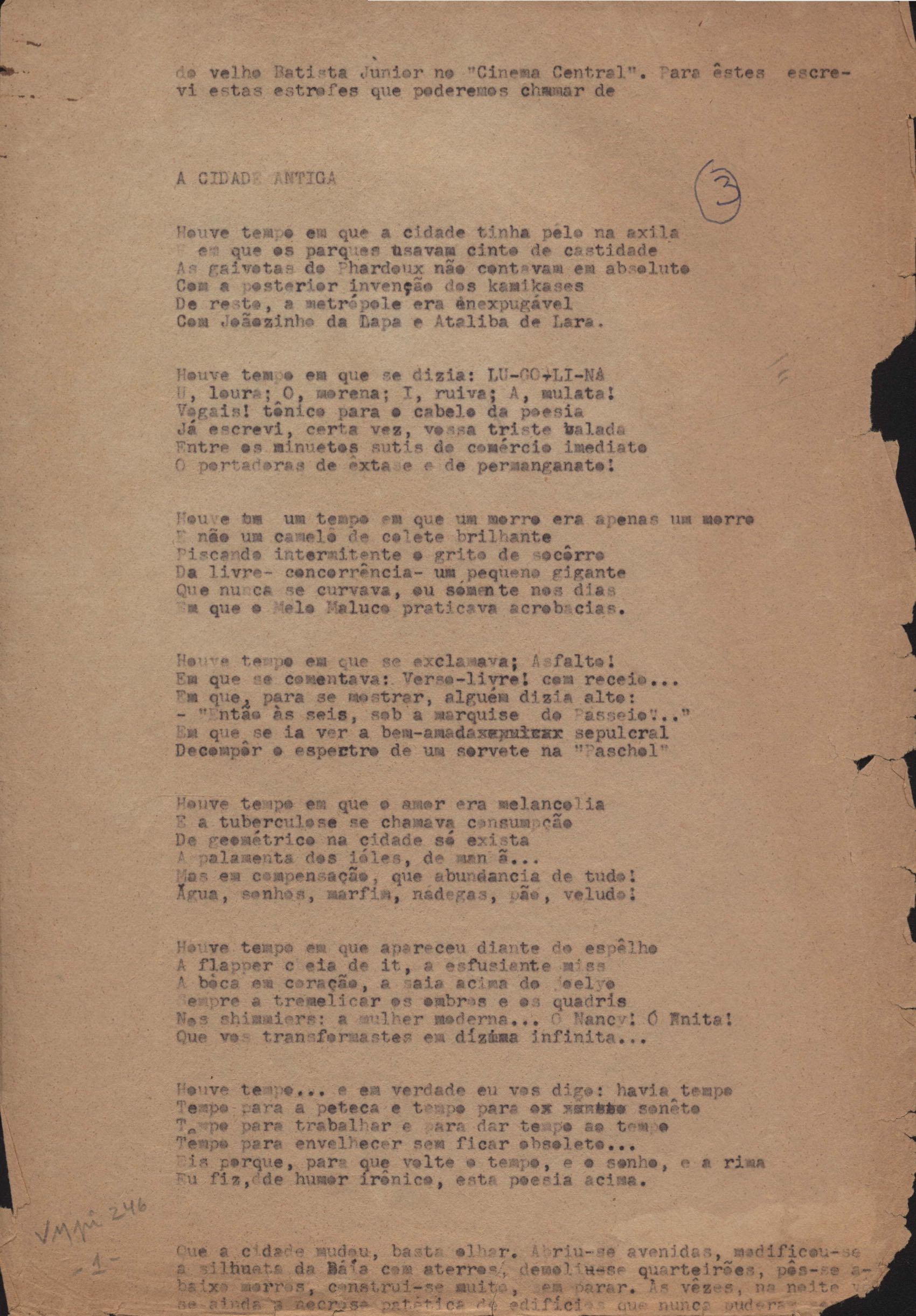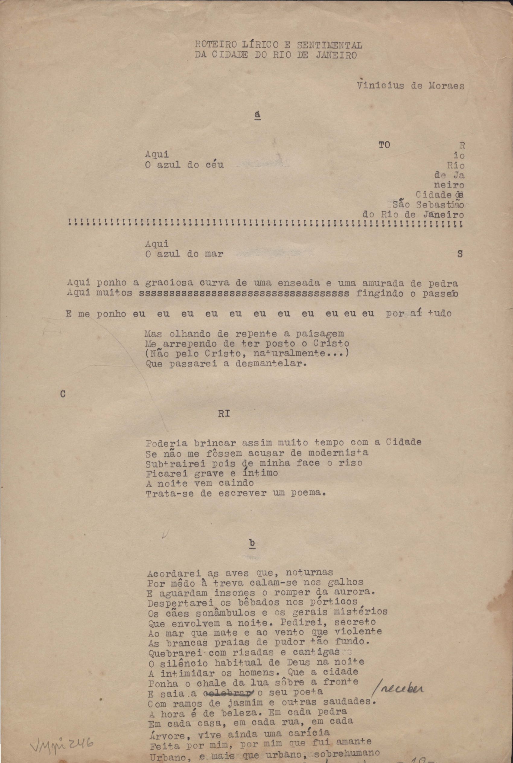 Poemas (31). "Avenida Rio Branco", "Balada das lavadeiras", "Balada de Botafogo", "Balada de Di Cavalcanti", "Balada do bumba-meu-boi", "Cartão", "Cartão-postal", "Cidadão da Gávea", "A cidade antiga", "A cidade em progresso", "Copacabana", "O corta-jaca", "História do samba", "Ilha do Governador (meio-dia em Cocotá)", "Jogo de empurra", "Jogos e folguedos I" [publ. "Jogos e folguedos: Maria Mulata"], "Jogos e folguedos II: rua Conde de Lage", "Lembrete", "Lira que não escreveu Gonzaga" [publ. "O morro do castelo (A lira que não escreveu Gonzaga)"], "Lopes Quintas (a rua onde nasci)", "As mimosas cravinas", "Minha Lapa (Lapa do desterro ou de Bandeira)", "Modinha", "A mulher carioca", "O namorado das ruas", "A primeira namorada", "Redondilhas a Laranjeiras", "Rua das Acácias", "Rua do Catete", "Soneto do Café Lamas" e "Tanguinho macabro". Anexo: 1. Outras versões manuscritas e datilografadas; 2. Prova tipográfica.