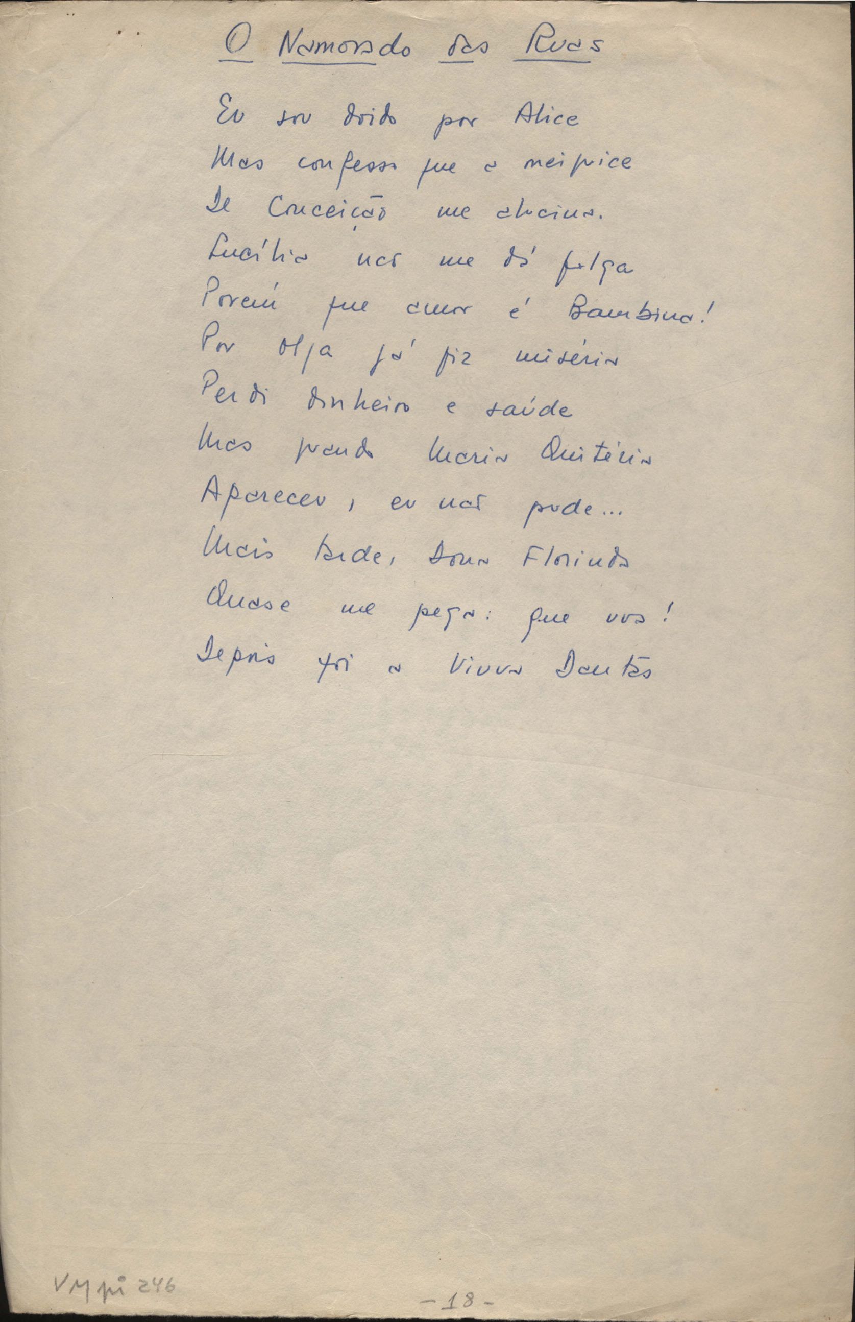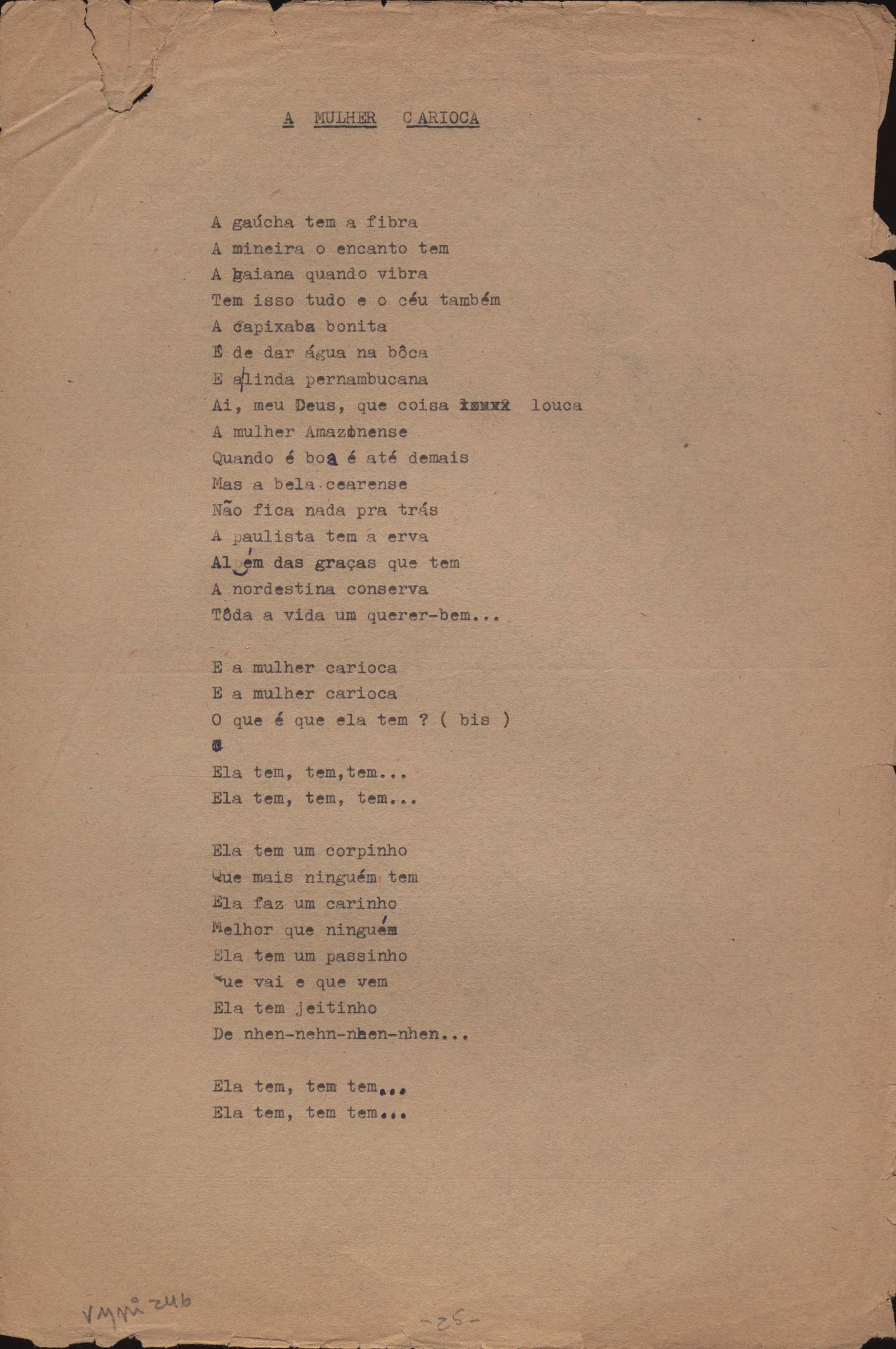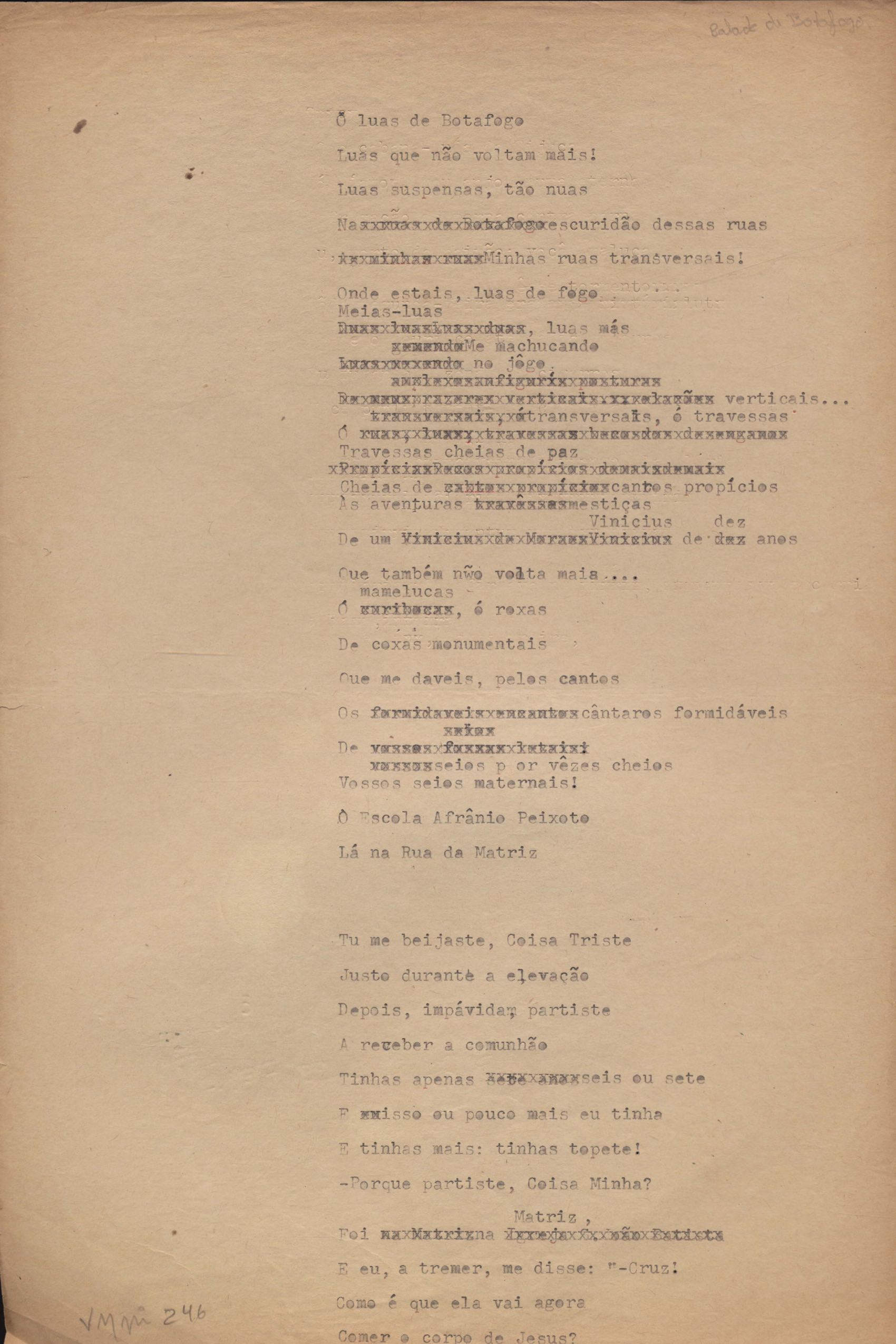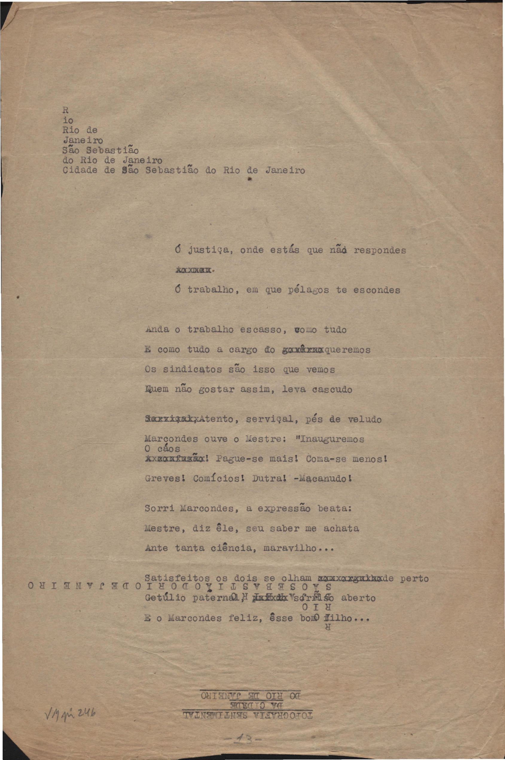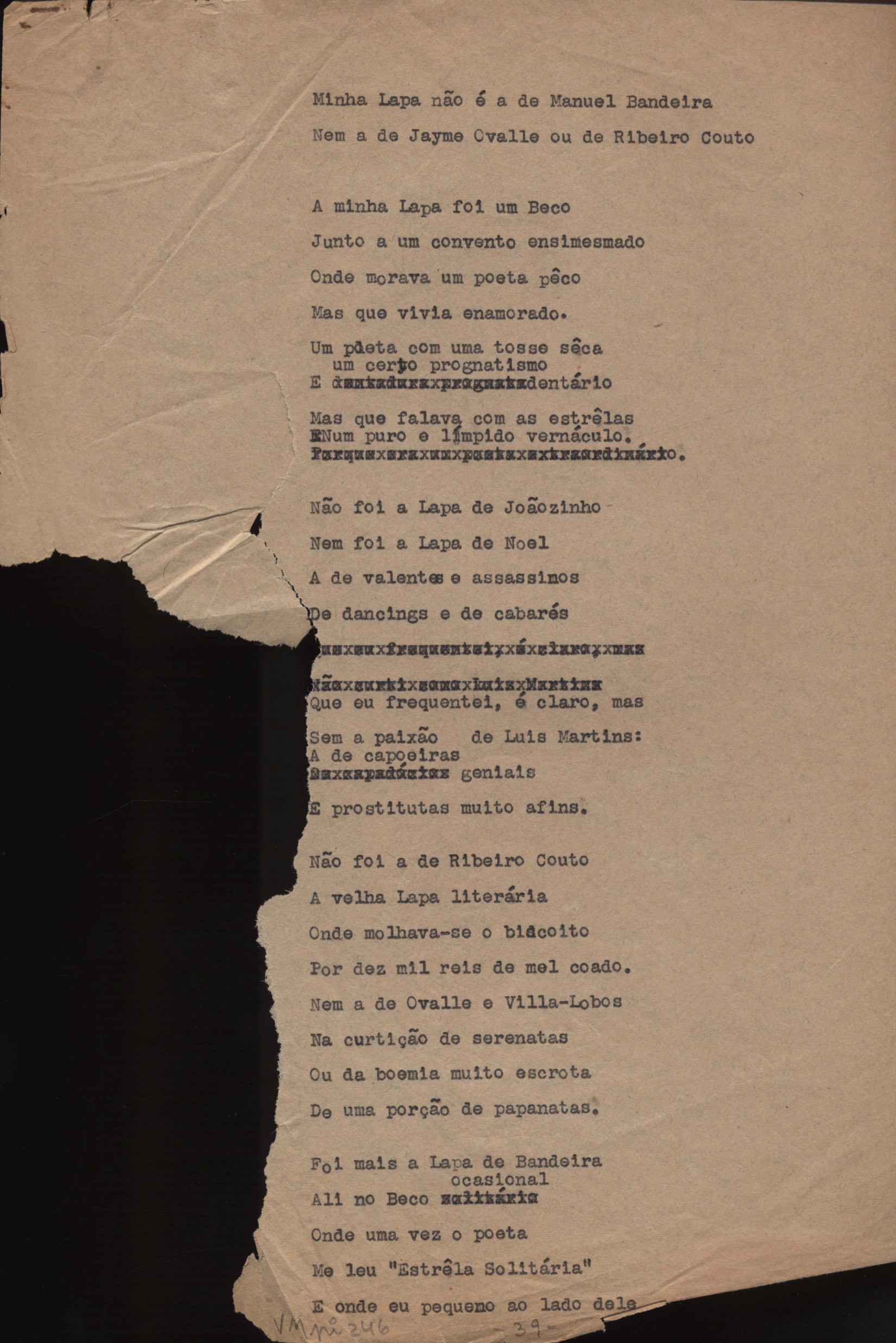Poemas (31). "Avenida Rio Branco", "Balada das lavadeiras", "Balada de Botafogo", "Balada de Di Cavalcanti", "Balada do bumba-meu-boi", "Cartão", "Cartão-postal", "Cidadão da Gávea", "A cidade antiga", "A cidade em progresso", "Copacabana", "O corta-jaca", "História do samba", "Ilha do Governador (meio-dia em Cocotá)", "Jogo de empurra", "Jogos e folguedos I" [publ. "Jogos e folguedos: Maria Mulata"], "Jogos e folguedos II: rua Conde de Lage", "Lembrete", "Lira que não escreveu Gonzaga" [publ. "O morro do castelo (A lira que não escreveu Gonzaga)"], "Lopes Quintas (a rua onde nasci)", "As mimosas cravinas", "Minha Lapa (Lapa do desterro ou de Bandeira)", "Modinha", "A mulher carioca", "O namorado das ruas", "A primeira namorada", "Redondilhas a Laranjeiras", "Rua das Acácias", "Rua do Catete", "Soneto do Café Lamas" e "Tanguinho macabro". Anexo: 1. Outras versões manuscritas e datilografadas; 2. Prova tipográfica.