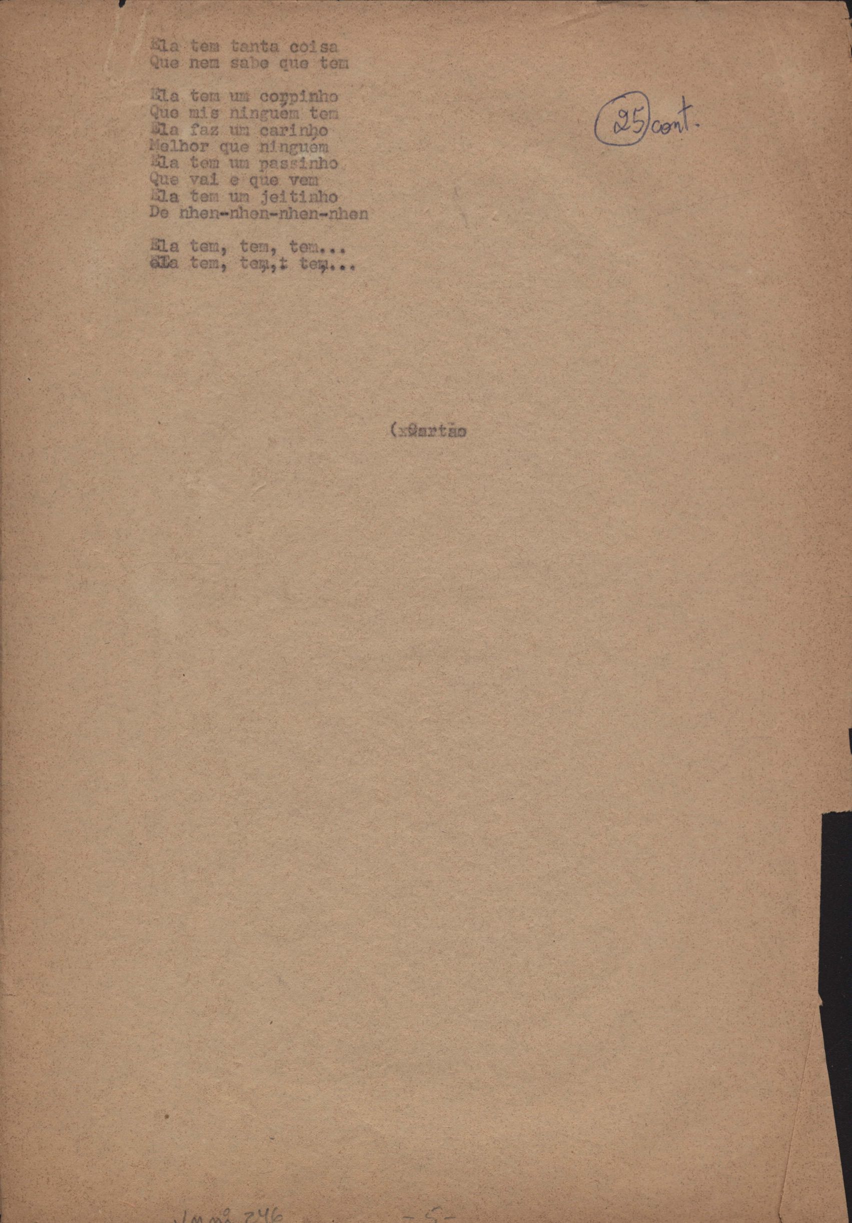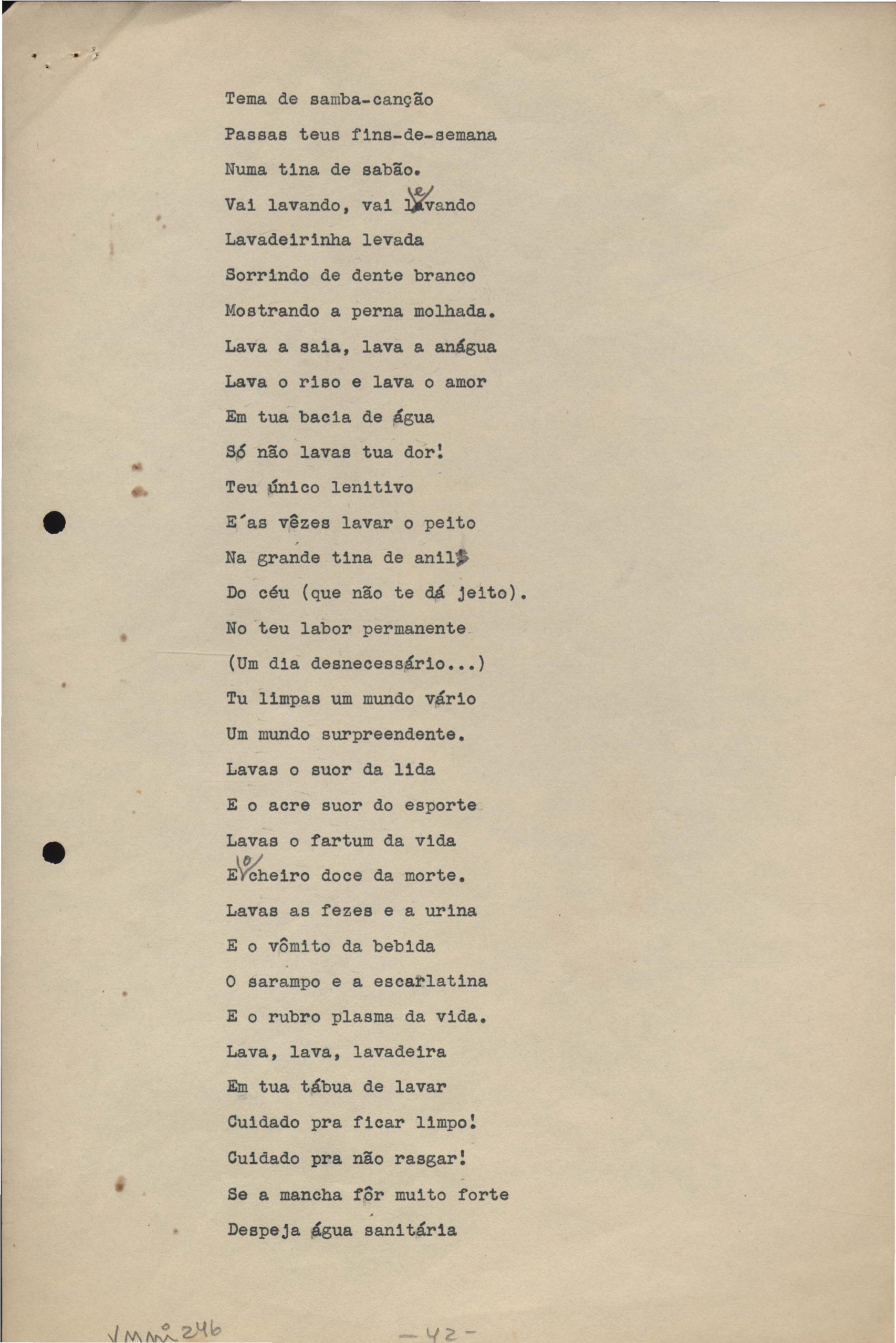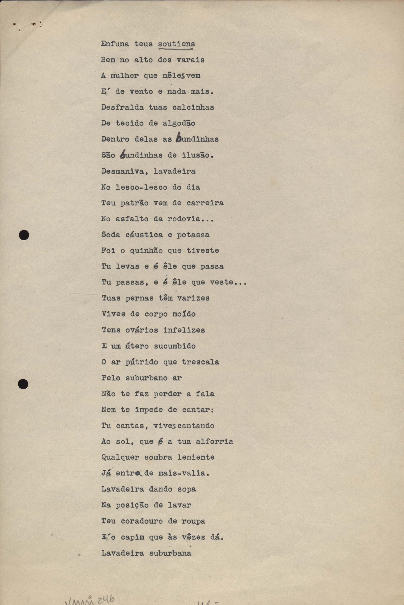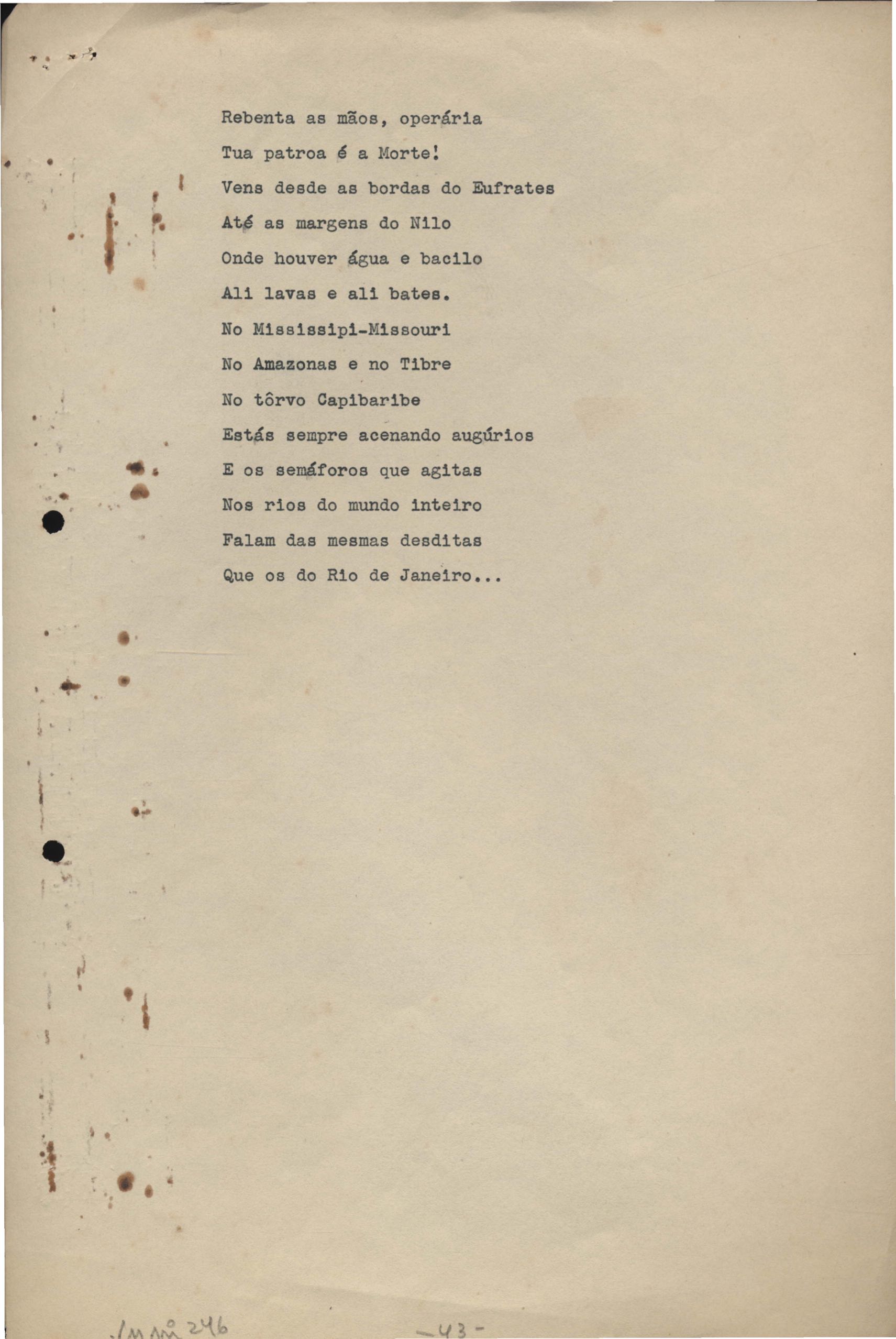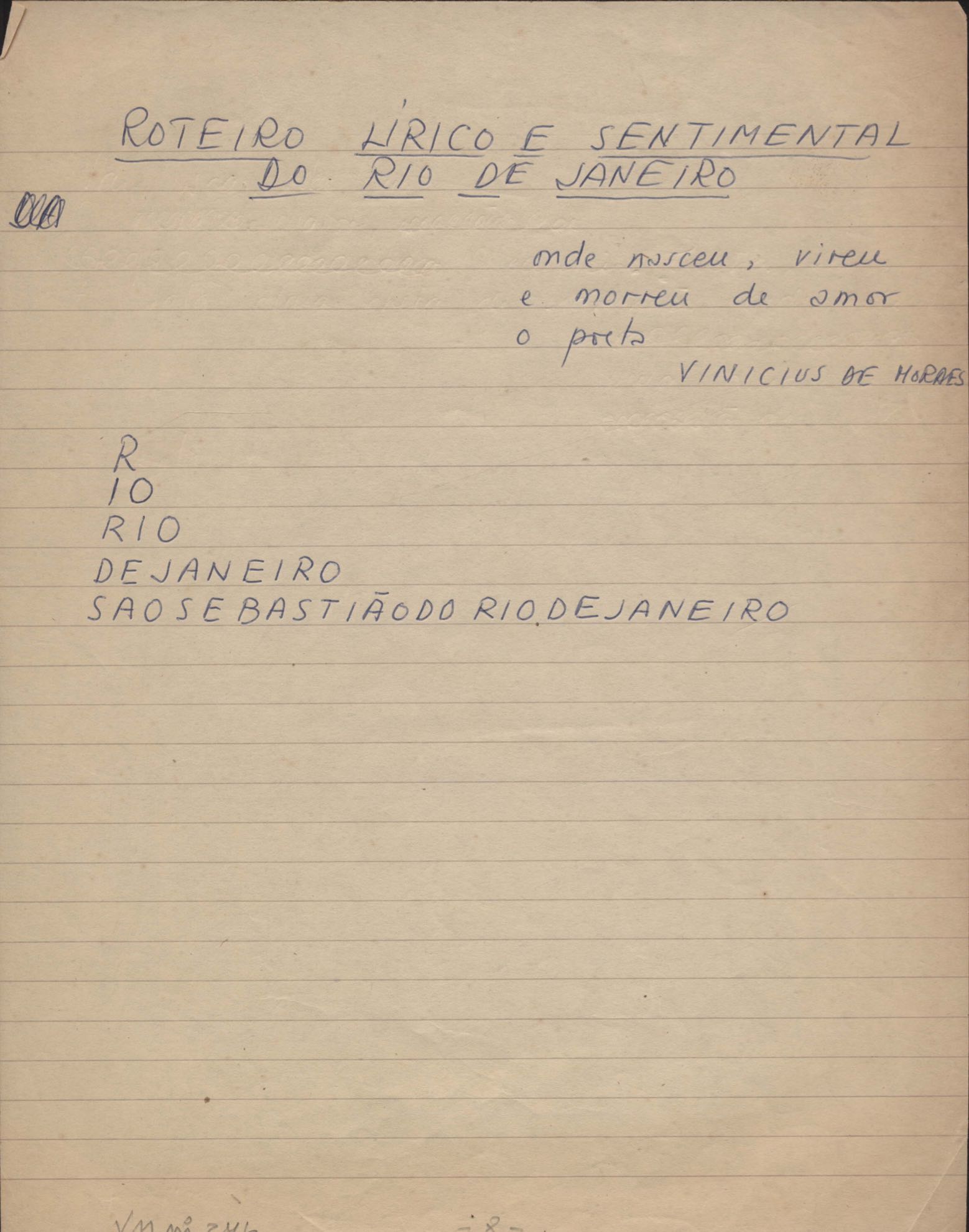 Poemas (31). "Avenida Rio Branco", "Balada das lavadeiras", "Balada de Botafogo", "Balada de Di Cavalcanti", "Balada do bumba-meu-boi", "Cartão", "Cartão-postal", "Cidadão da Gávea", "A cidade antiga", "A cidade em progresso", "Copacabana", "O corta-jaca", "História do samba", "Ilha do Governador (meio-dia em Cocotá)", "Jogo de empurra", "Jogos e folguedos I" [publ. "Jogos e folguedos: Maria Mulata"], "Jogos e folguedos II: rua Conde de Lage", "Lembrete", "Lira que não escreveu Gonzaga" [publ. "O morro do castelo (A lira que não escreveu Gonzaga)"], "Lopes Quintas (a rua onde nasci)", "As mimosas cravinas", "Minha Lapa (Lapa do desterro ou de Bandeira)", "Modinha", "A mulher carioca", "O namorado das ruas", "A primeira namorada", "Redondilhas a Laranjeiras", "Rua das Acácias", "Rua do Catete", "Soneto do Café Lamas" e "Tanguinho macabro". Anexo: 1. Outras versões manuscritas e datilografadas; 2. Prova tipográfica.