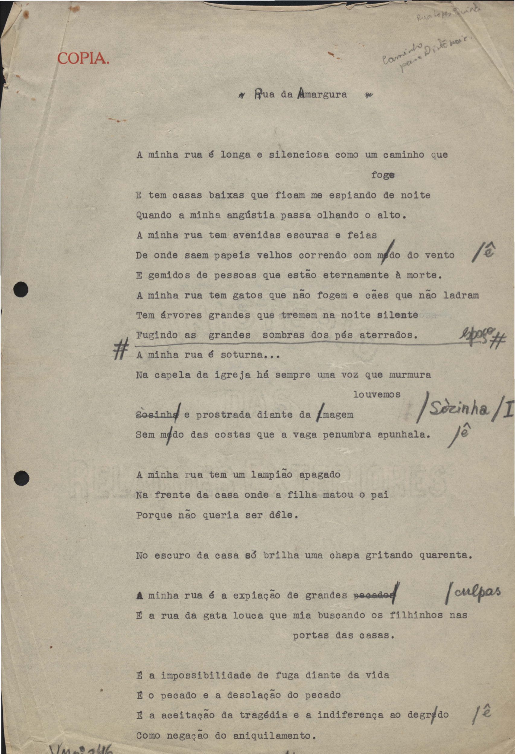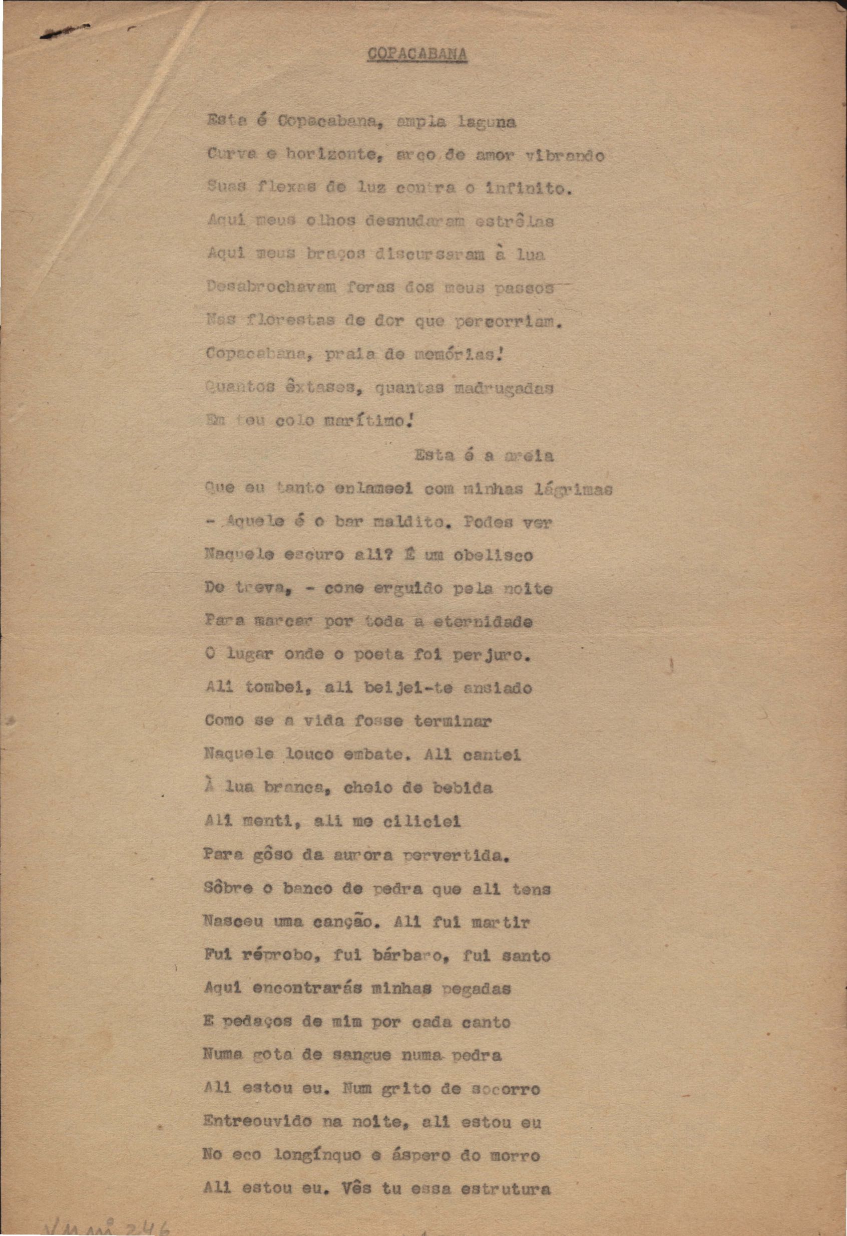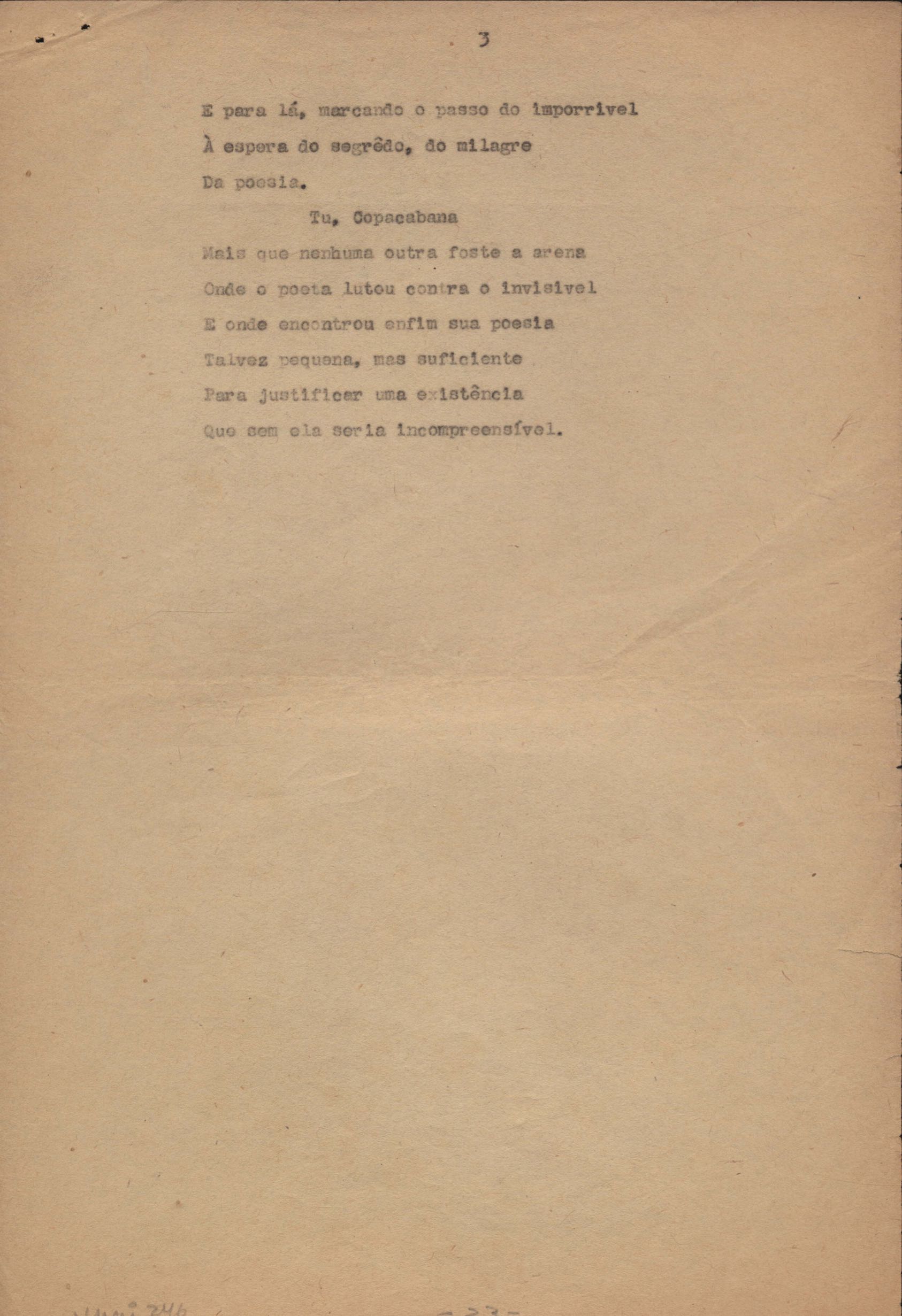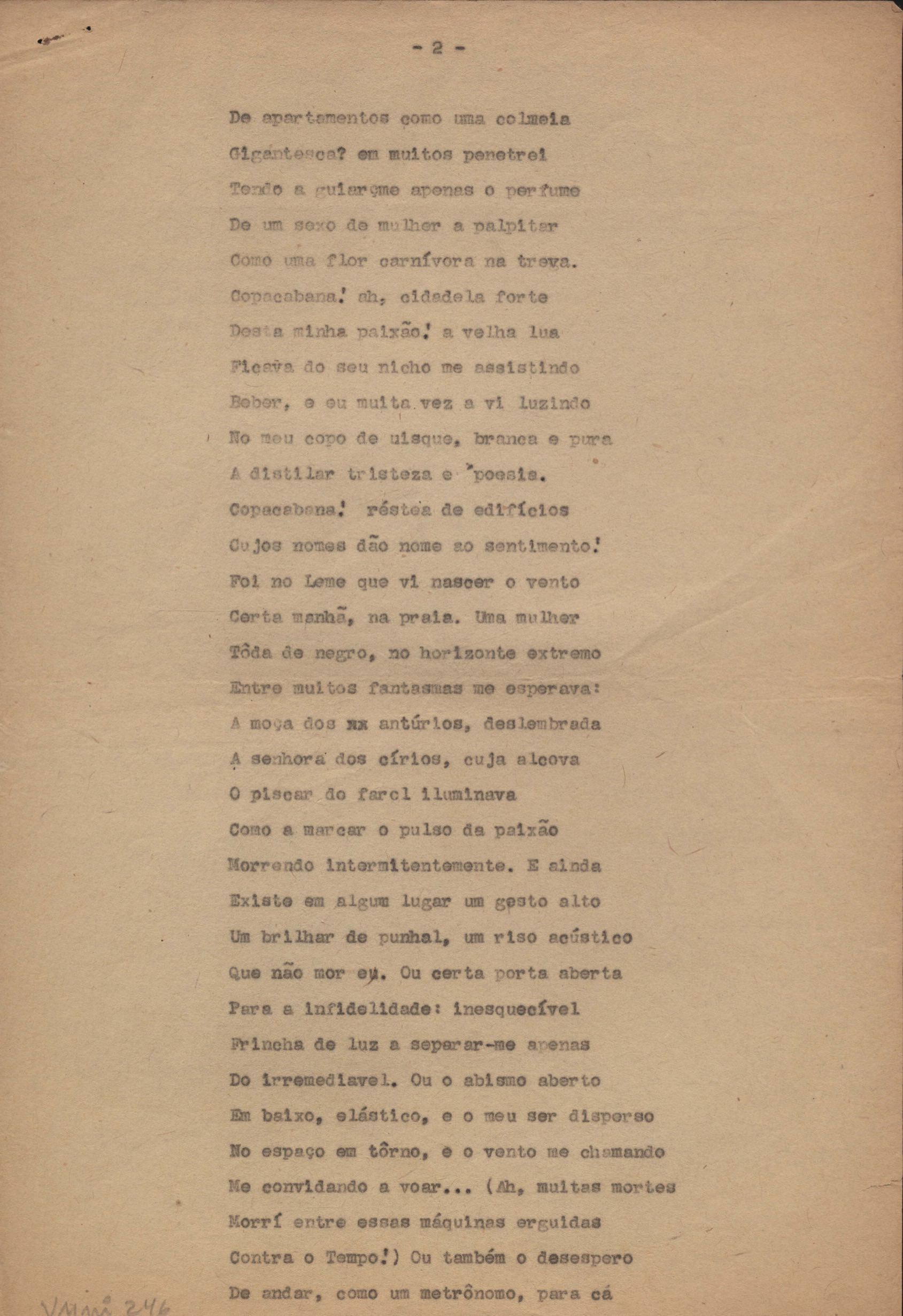 Dossiê dividido em seis partes. A prova tipográfica está incompleta. "Copacabana" aparece também em Novos poemas II e "Rua da Amargura" aparece também em O caminho para a distância.