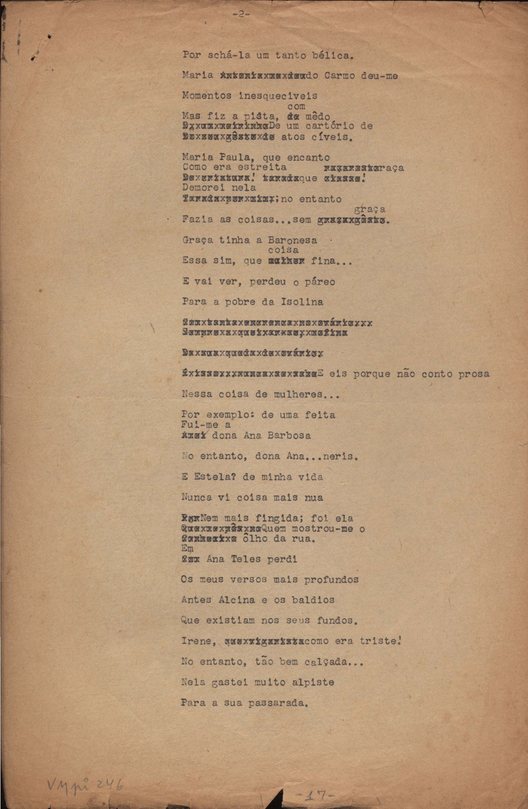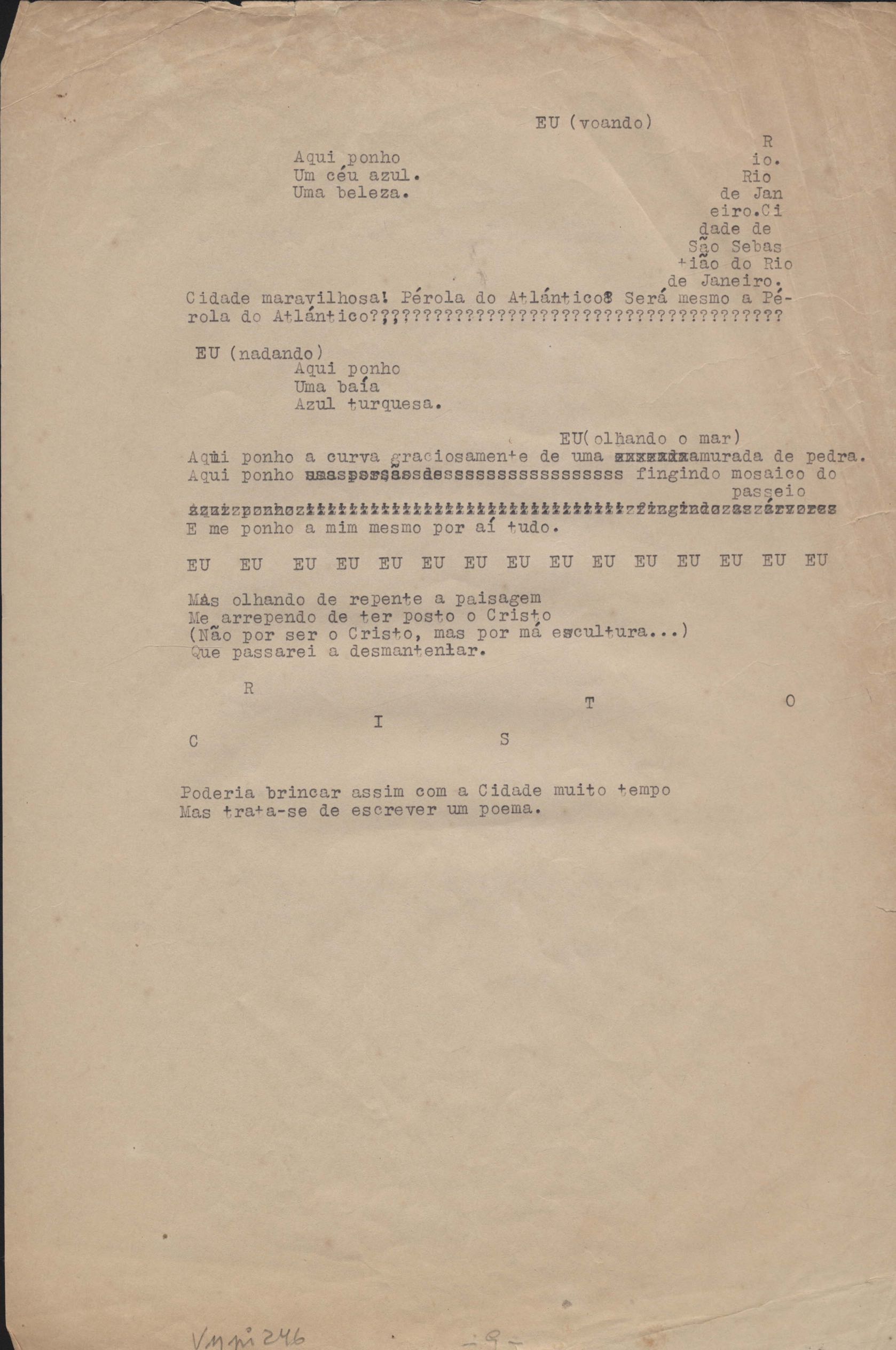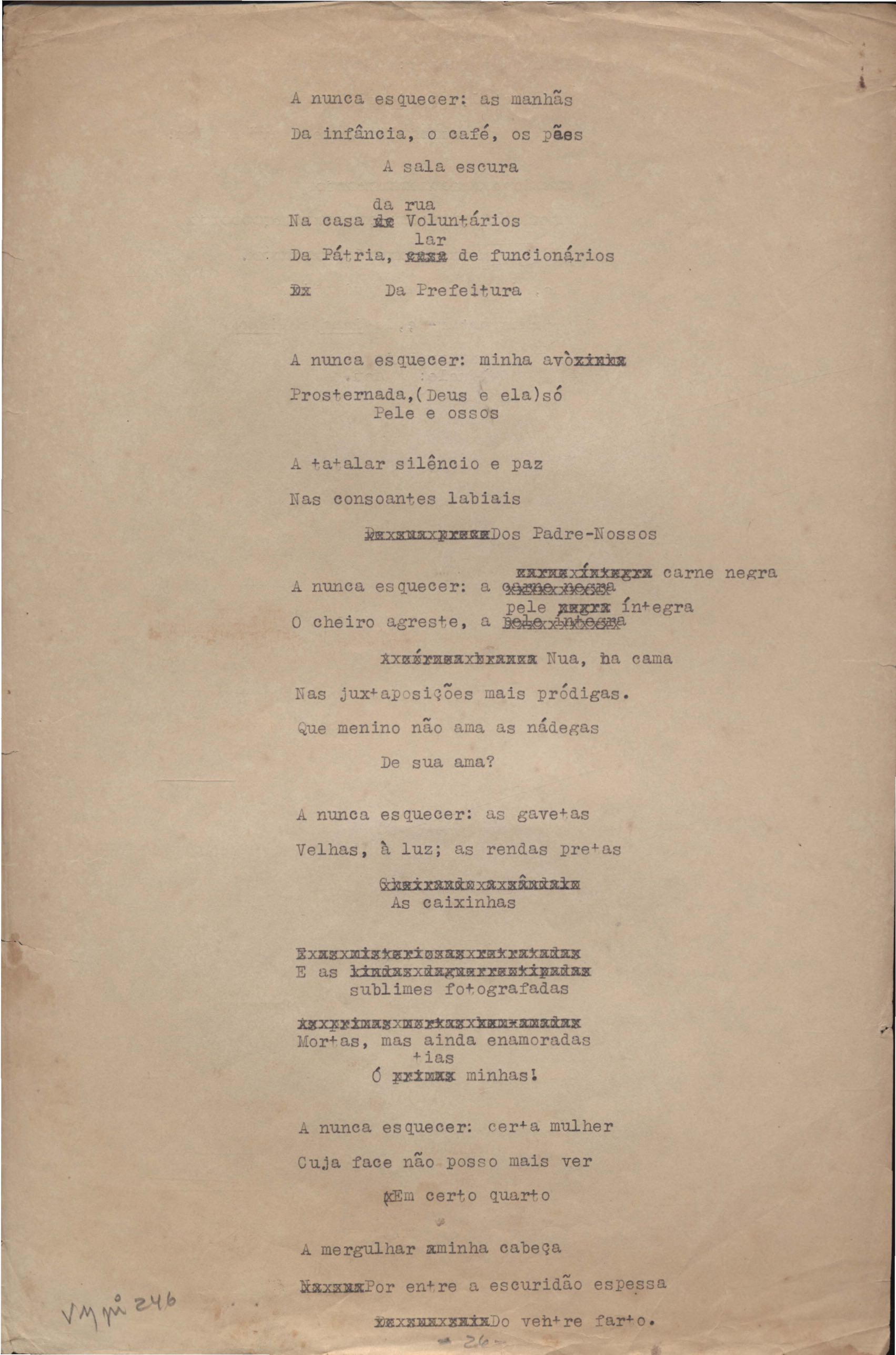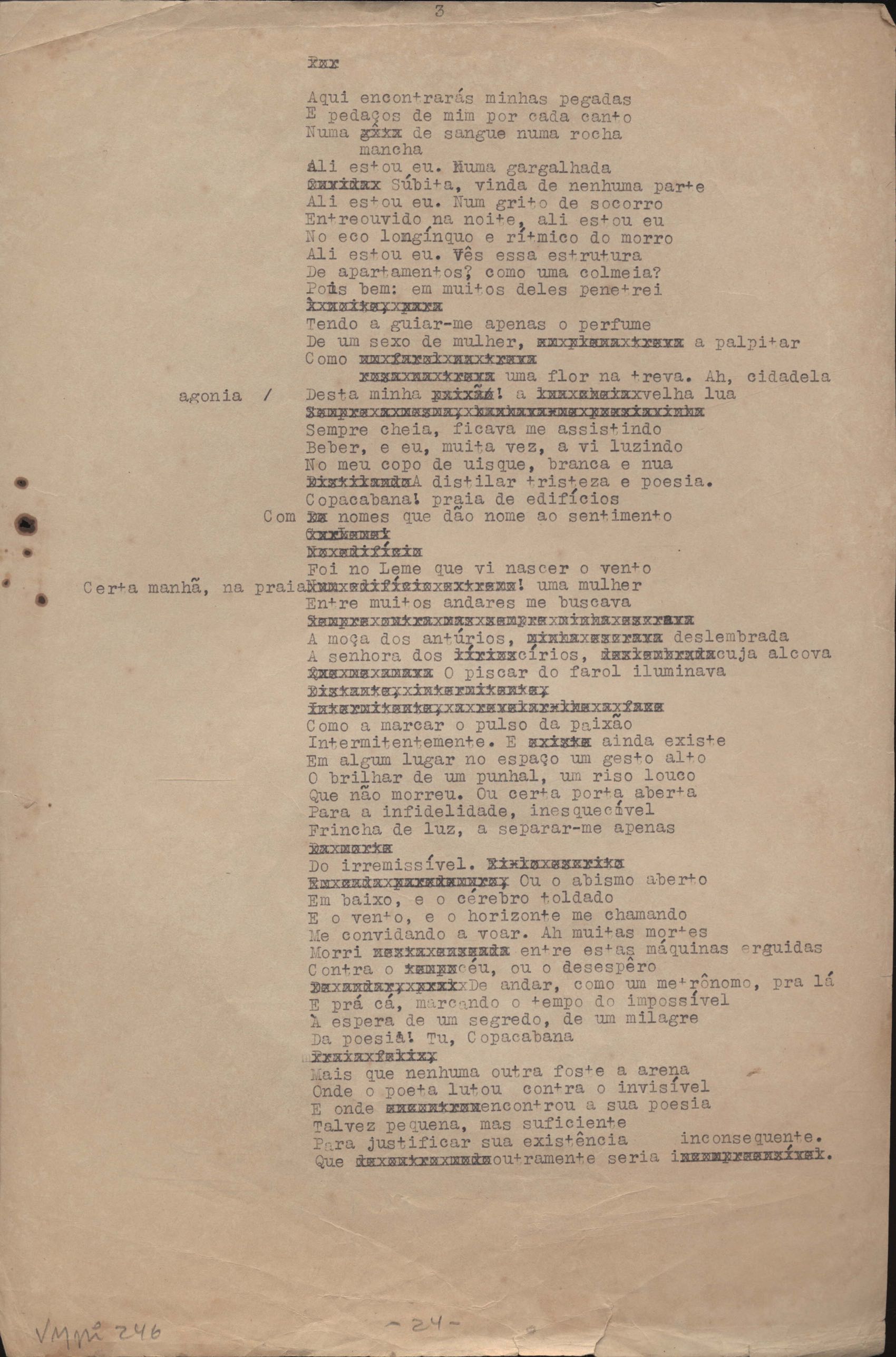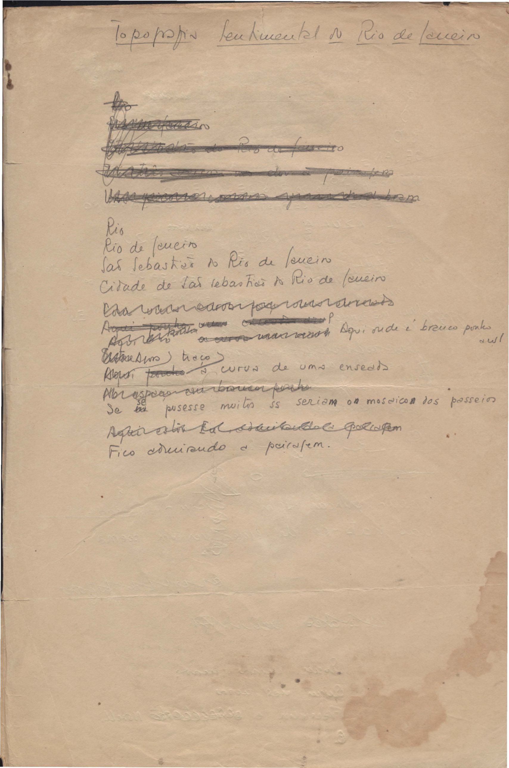 Dossiê dividido em seis partes. A prova tipográfica está incompleta. "Copacabana" aparece também em Novos poemas II e "Rua da Amargura" aparece também em O caminho para a distância.