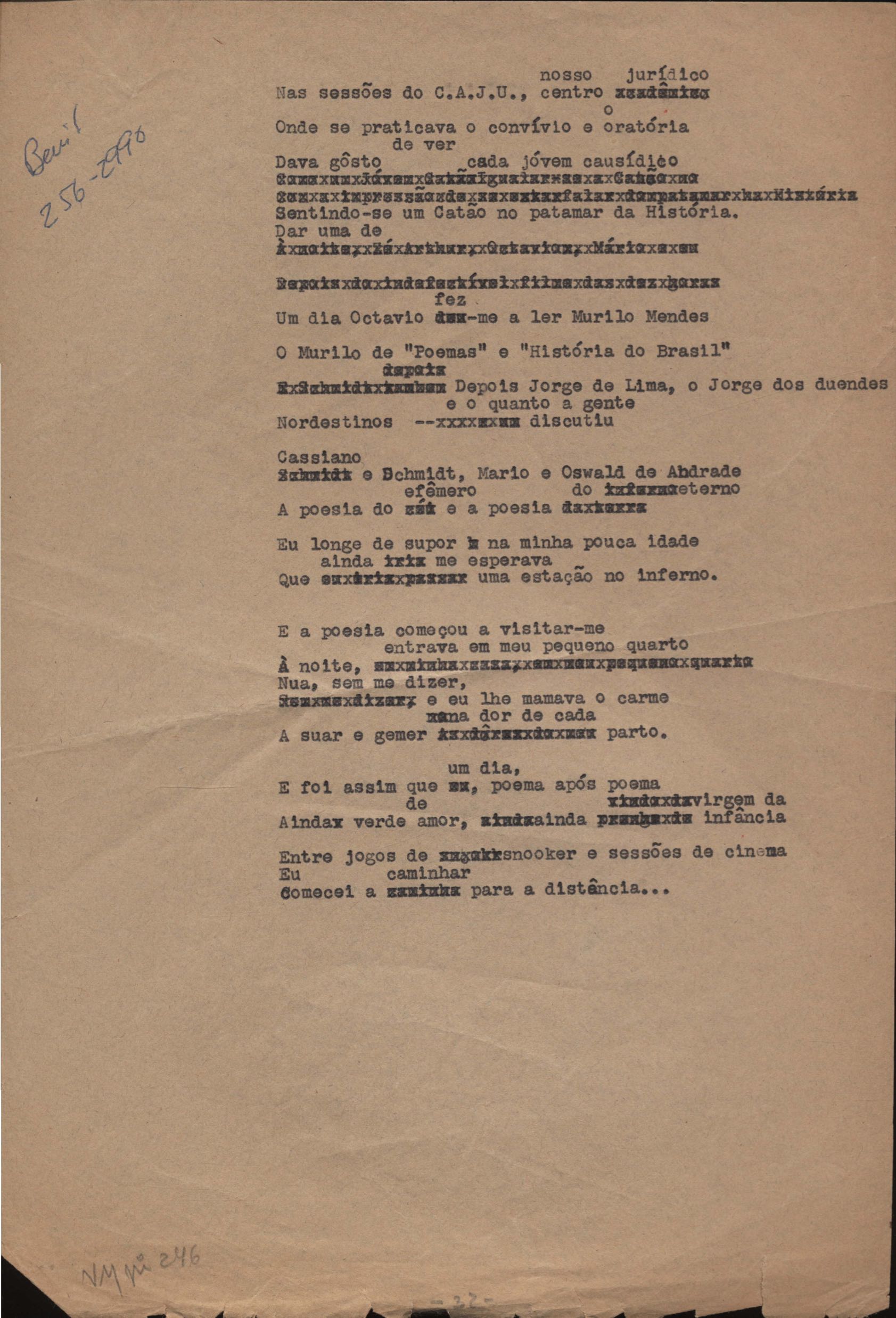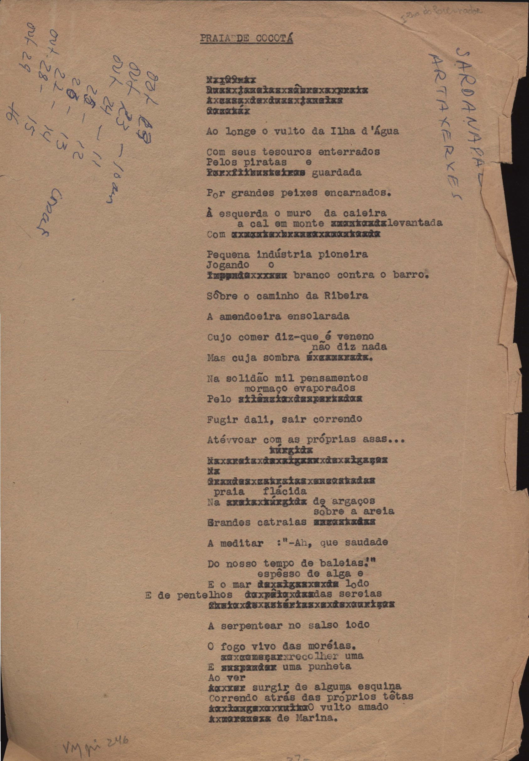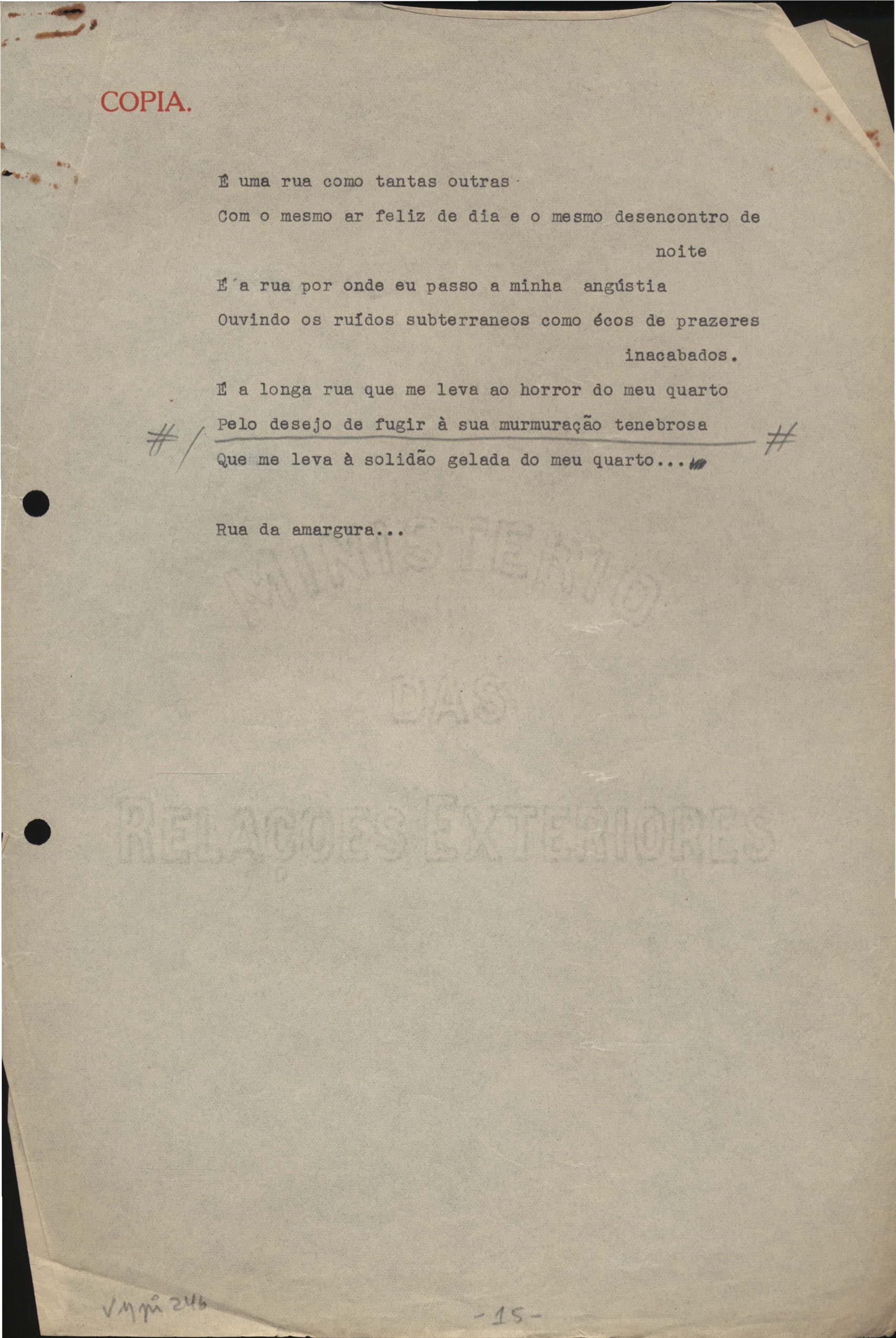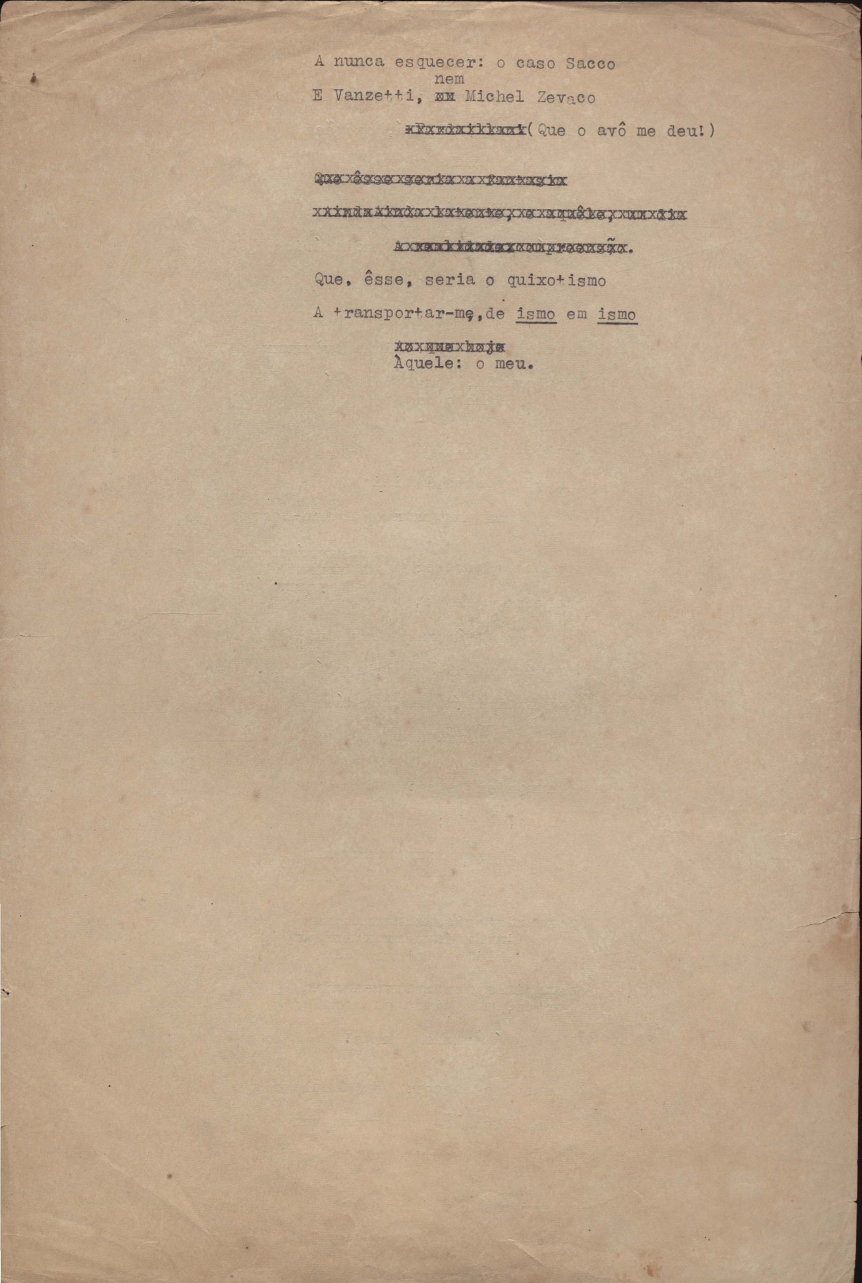 Dossiê dividido em seis partes. A prova tipográfica está incompleta. "Copacabana" aparece também em Novos poemas II e "Rua da Amargura" aparece também em O caminho para a distância.