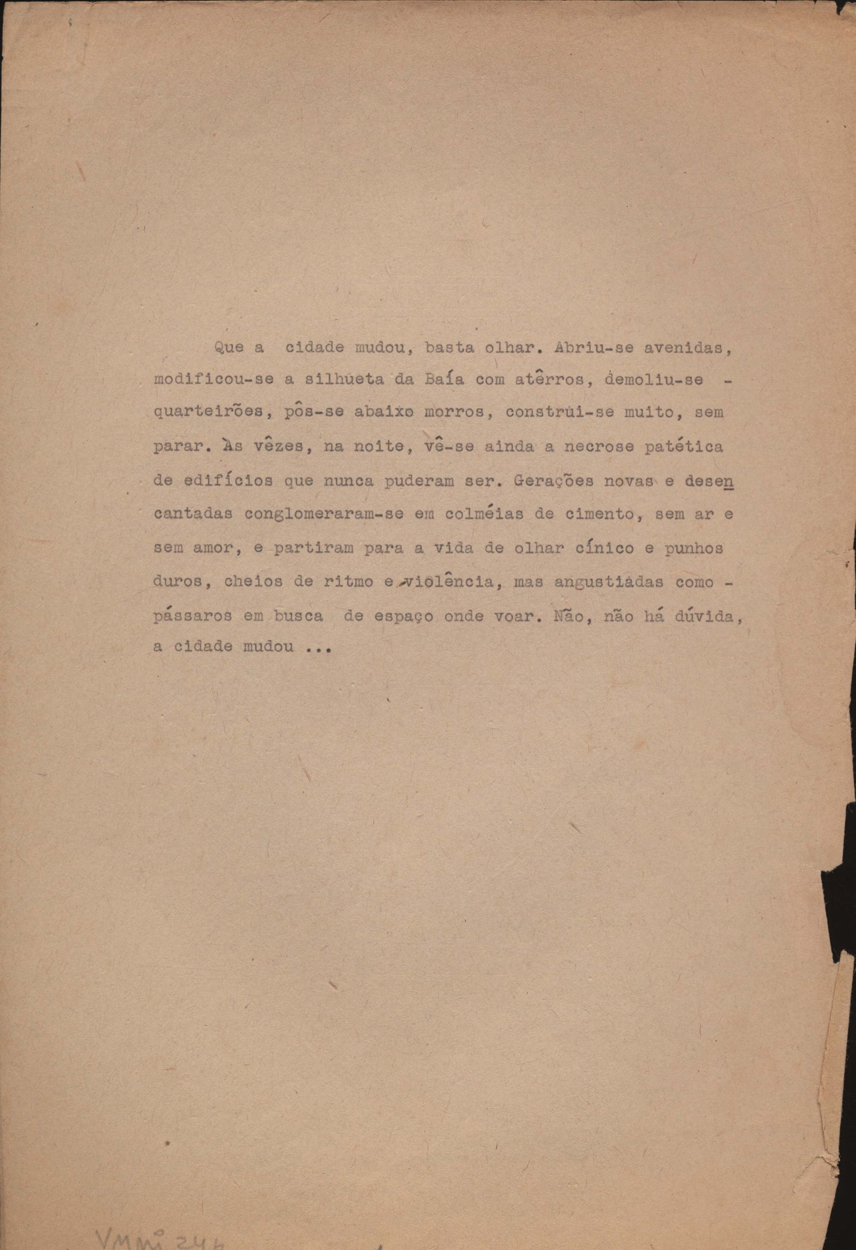 Poemas (31). "Avenida Rio Branco", "Balada das lavadeiras", "Balada de Botafogo", "Balada de Di Cavalcanti", "Balada do bumba-meu-boi", "Cartão", "Cartão-postal", "Cidadão da Gávea", "A cidade antiga", "A cidade em progresso", "Copacabana", "O corta-jaca", "História do samba", "Ilha do Governador (meio-dia em Cocotá)", "Jogo de empurra", "Jogos e folguedos I" [publ. "Jogos e folguedos: Maria Mulata"], "Jogos e folguedos II: rua Conde de Lage", "Lembrete", "Lira que não escreveu Gonzaga" [publ. "O morro do castelo (A lira que não escreveu Gonzaga)"], "Lopes Quintas (a rua onde nasci)", "As mimosas cravinas", "Minha Lapa (Lapa do desterro ou de Bandeira)", "Modinha", "A mulher carioca", "O namorado das ruas", "A primeira namorada", "Redondilhas a Laranjeiras", "Rua das Acácias", "Rua do Catete", "Soneto do Café Lamas" e "Tanguinho macabro". Anexo: 1. Outras versões manuscritas e datilografadas; 2. Prova tipográfica.