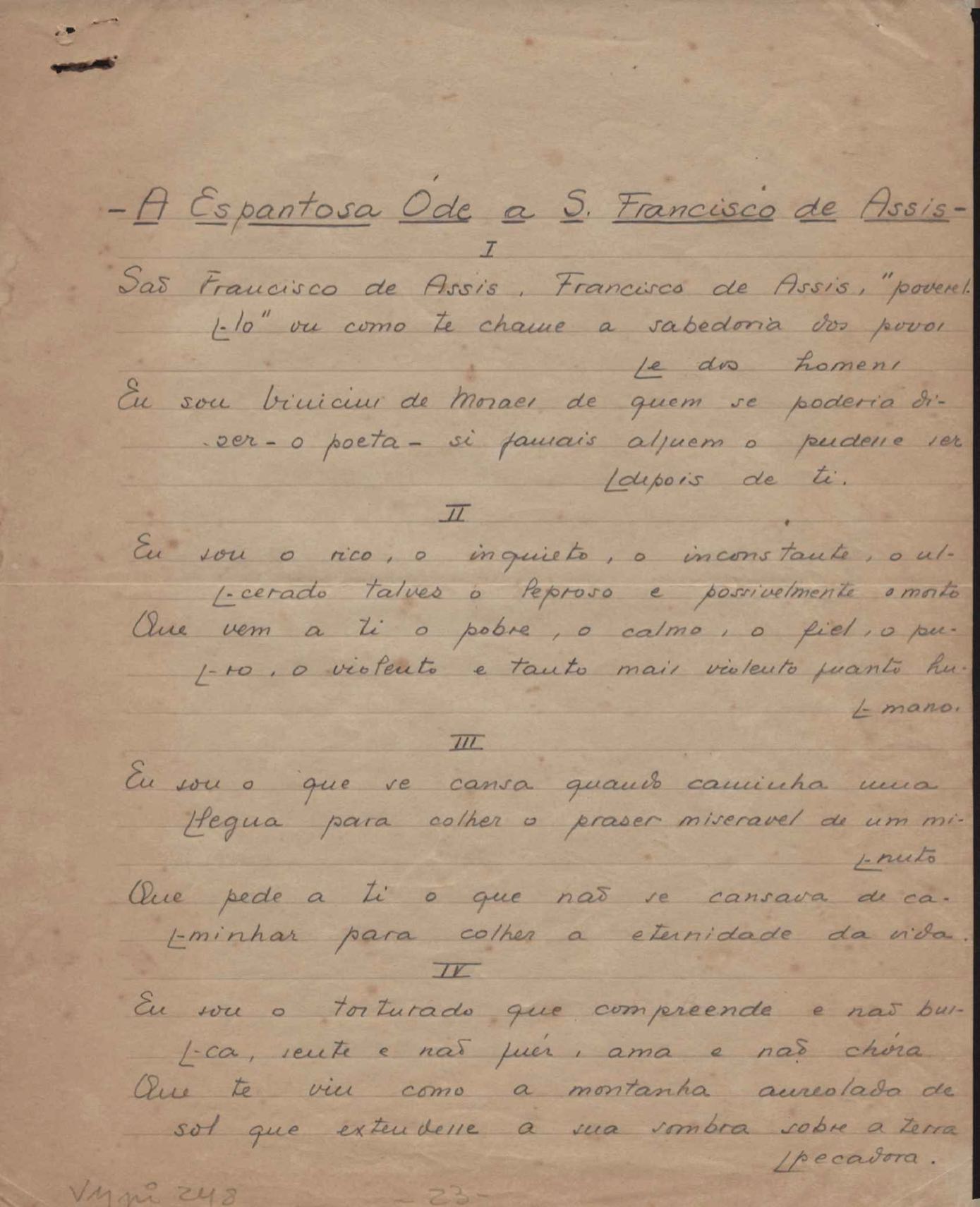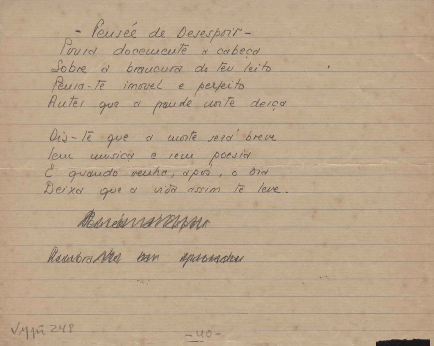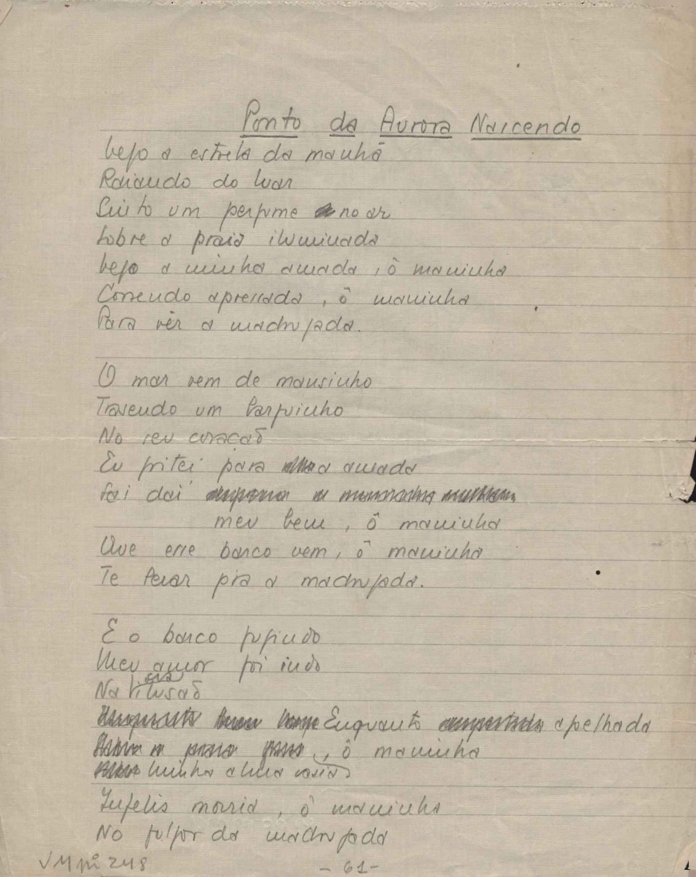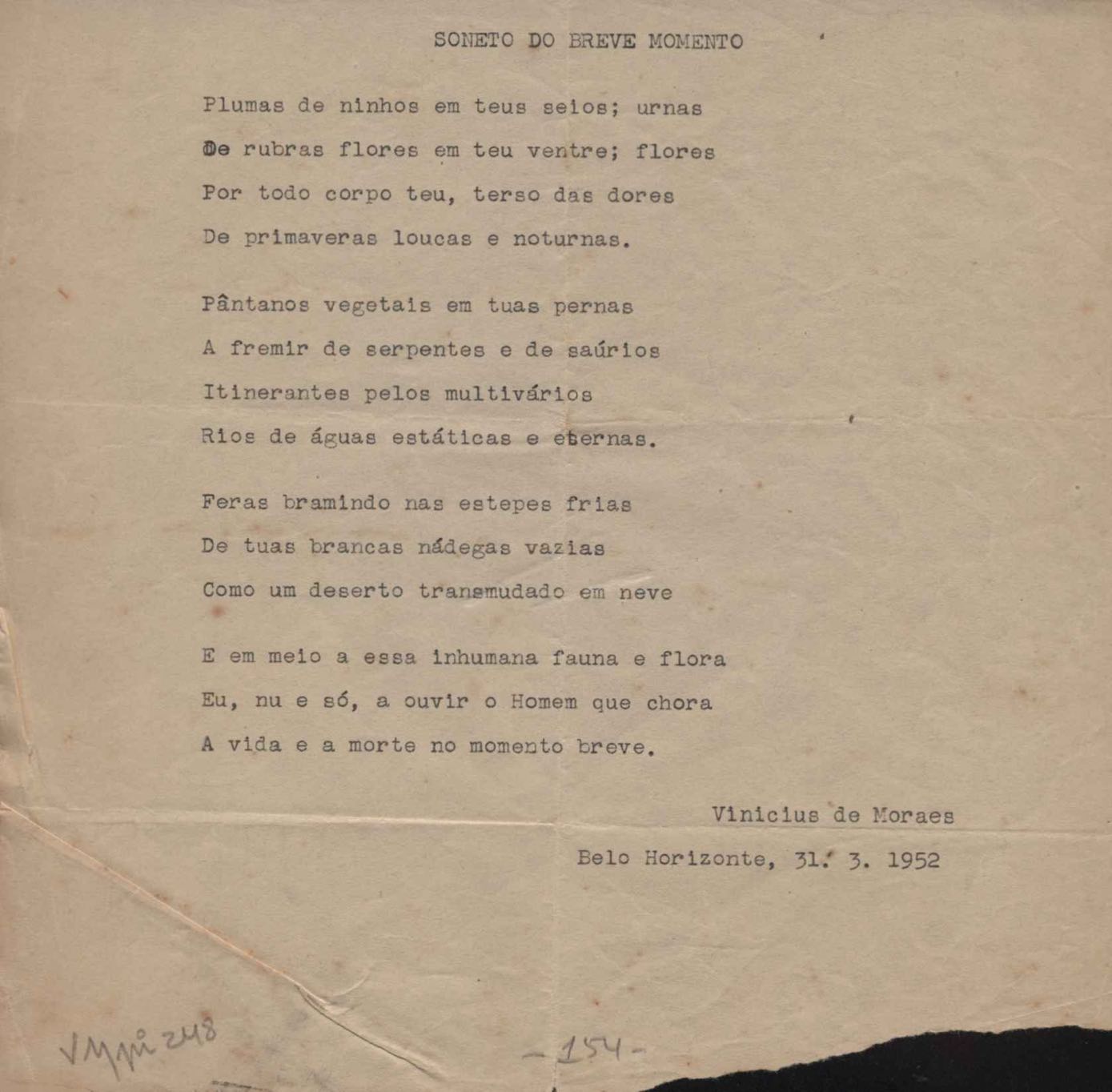 Dossiê dividido em nove partes. Outras observações: 1. Alguns poemas estão incompletos; 2. No verso de "O cântico das águas" encontra-se "A legenda do príncipe poeta" e no de "Verdade", "Plagiando o poeta..."; 3. Há dois poemas com o título de "Elegia de Paris", de "Legenda", de "Madrigal" e de "Trovas"; 4. "Cantiga XI" está publicada na Obra poética com o título de "Duas canções de silêncio II"; 5. Na mesma folha que "Pressentimento" encontram-se "Legenda" e "O bilhar", na mesma de "Romance da morena" temos "Não te dou perdão", e na de "Canto", "Última primavera", na de "Poema feito para chegar aos ouvidos de S. Teresa", outra versão de "Fala íntima"; 6. "O soneto a quatro mãos" foi escrito por VM e Paulo Mendes Campos e "Os acadêmicos... das 5 horas", por VM e Moacir Veloso de Oliveira; 7. Há dois poemas com o título de "A miragem"; 8. Destes poemas, 401 são esboços e não possuem título.
