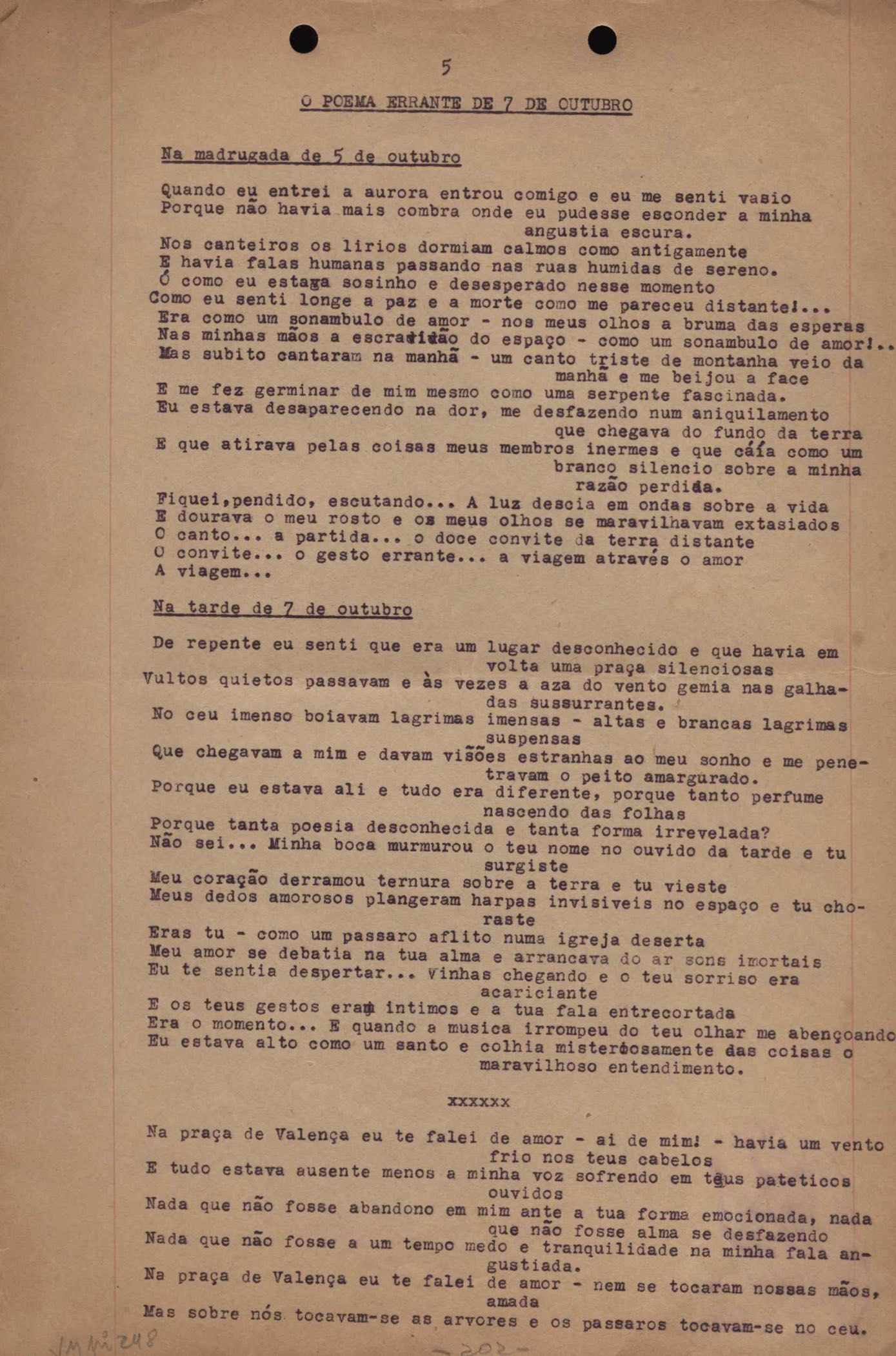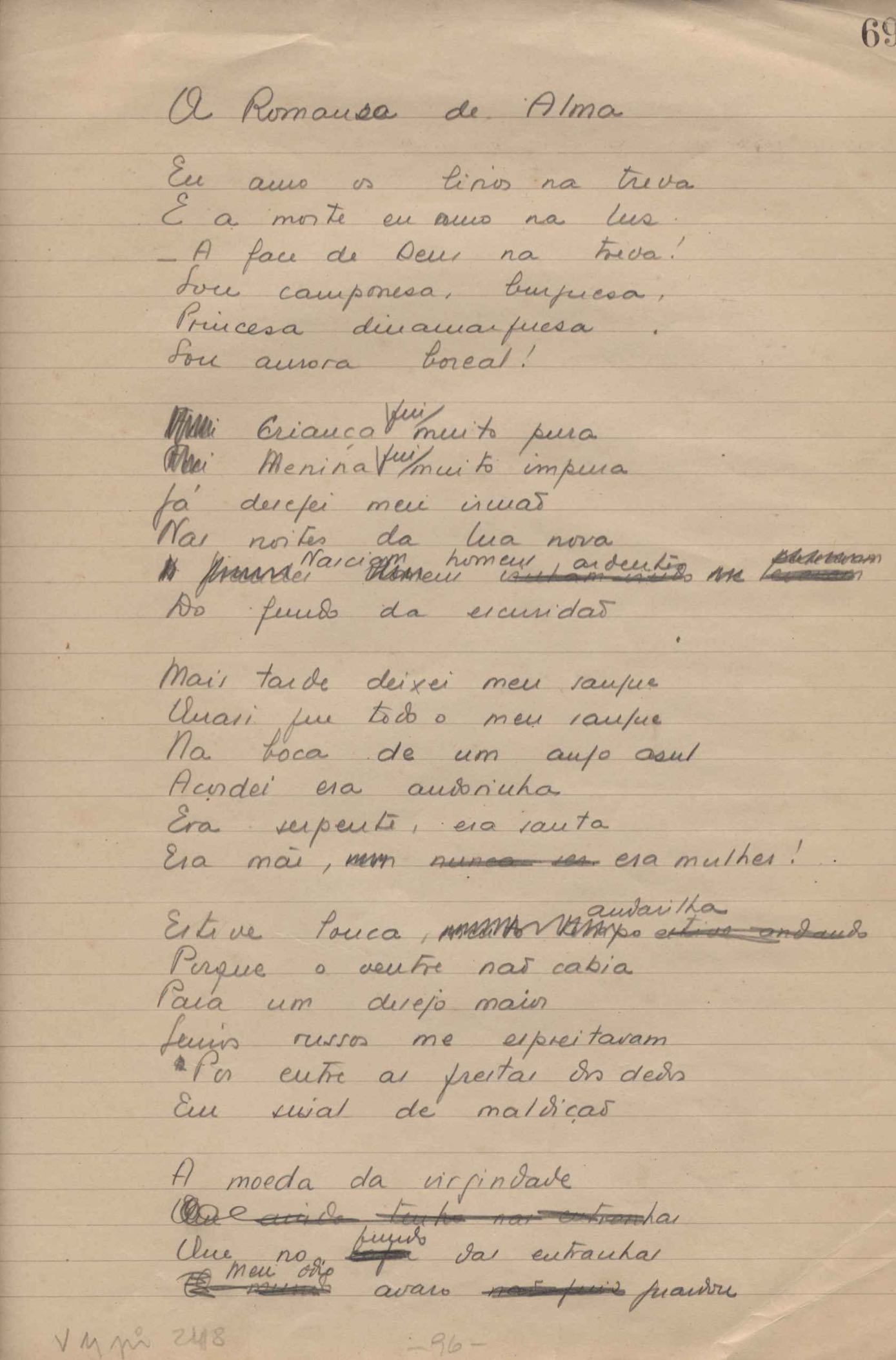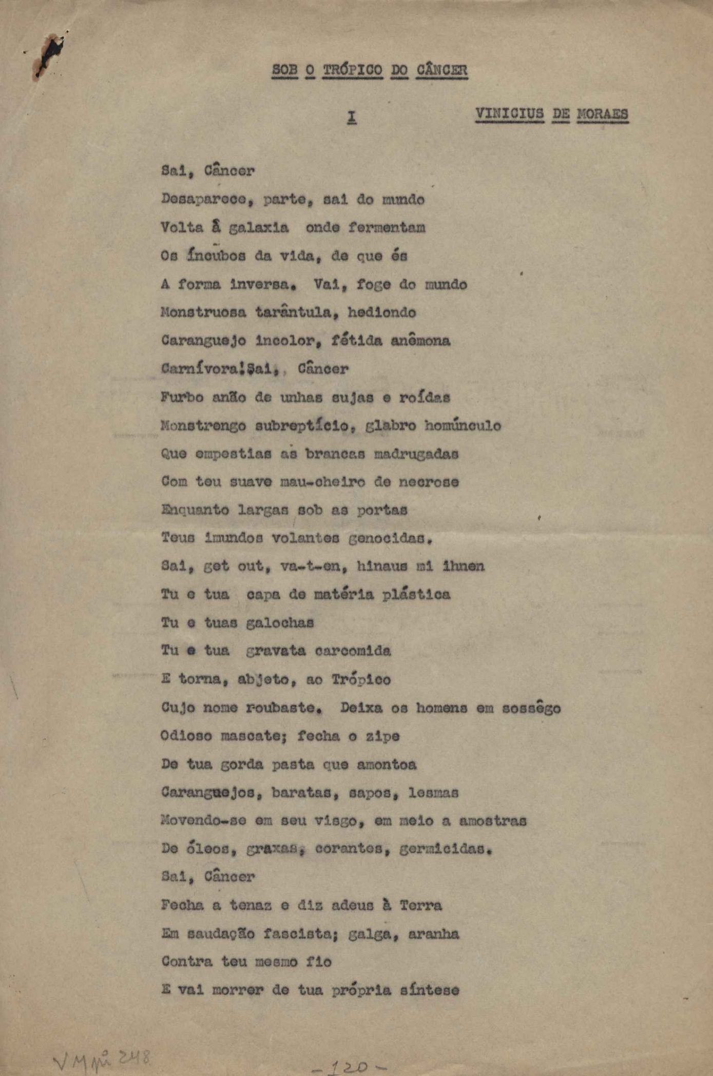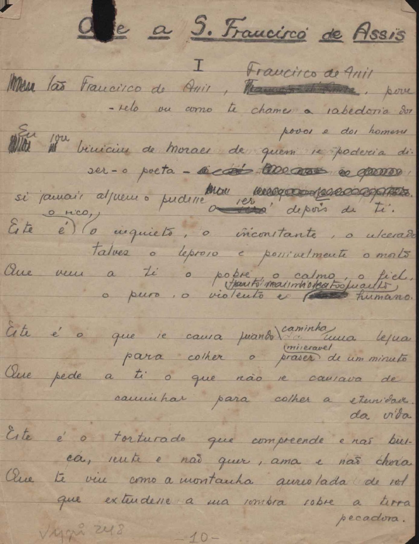 Dossiê dividido em nove partes. Outras observações: 1. Alguns poemas estão incompletos; 2. No verso de "O cântico das águas" encontra-se "A legenda do príncipe poeta" e no de "Verdade", "Plagiando o poeta..."; 3. Há dois poemas com o título de "Elegia de Paris", de "Legenda", de "Madrigal" e de "Trovas"; 4. "Cantiga XI" está publicada na Obra poética com o título de "Duas canções de silêncio II"; 5. Na mesma folha que "Pressentimento" encontram-se "Legenda" e "O bilhar", na mesma de "Romance da morena" temos "Não te dou perdão", e na de "Canto", "Última primavera", na de "Poema feito para chegar aos ouvidos de S. Teresa", outra versão de "Fala íntima"; 6. "O soneto a quatro mãos" foi escrito por VM e Paulo Mendes Campos e "Os acadêmicos... das 5 horas", por VM e Moacir Veloso de Oliveira; 7. Há dois poemas com o título de "A miragem"; 8. Destes poemas, 401 são esboços e não possuem título.
