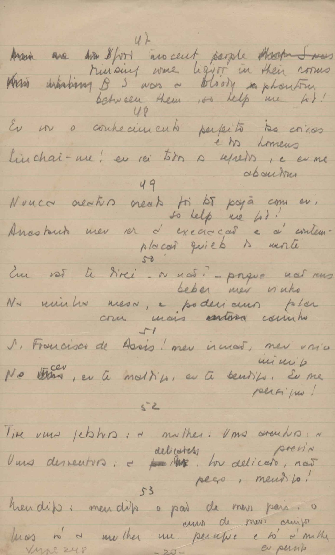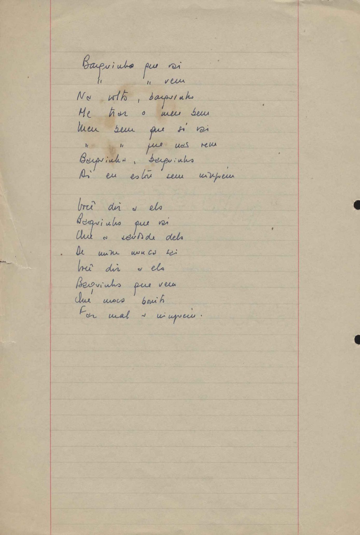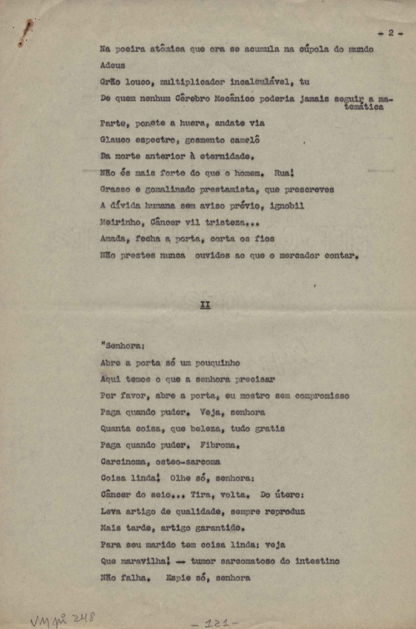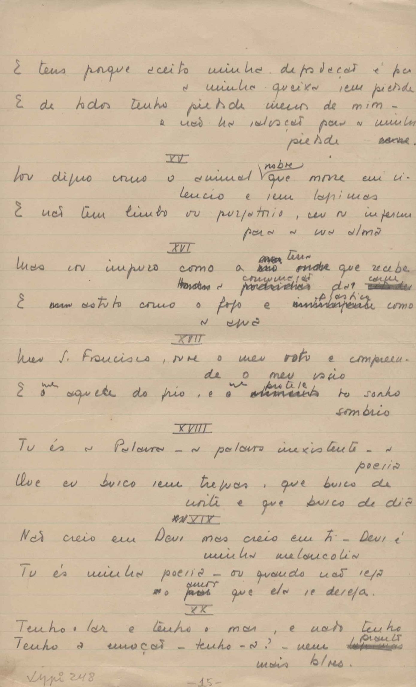 Dossiê dividido em nove partes. Outras observações: 1. Alguns poemas estão incompletos; 2. No verso de "O cântico das águas" encontra-se "A legenda do príncipe poeta" e no de "Verdade", "Plagiando o poeta..."; 3. Há dois poemas com o título de "Elegia de Paris", de "Legenda", de "Madrigal" e de "Trovas"; 4. "Cantiga XI" está publicada na Obra poética com o título de "Duas canções de silêncio II"; 5. Na mesma folha que "Pressentimento" encontram-se "Legenda" e "O bilhar", na mesma de "Romance da morena" temos "Não te dou perdão", e na de "Canto", "Última primavera", na de "Poema feito para chegar aos ouvidos de S. Teresa", outra versão de "Fala íntima"; 6. "O soneto a quatro mãos" foi escrito por VM e Paulo Mendes Campos e "Os acadêmicos... das 5 horas", por VM e Moacir Veloso de Oliveira; 7. Há dois poemas com o título de "A miragem"; 8. Destes poemas, 401 são esboços e não possuem título.