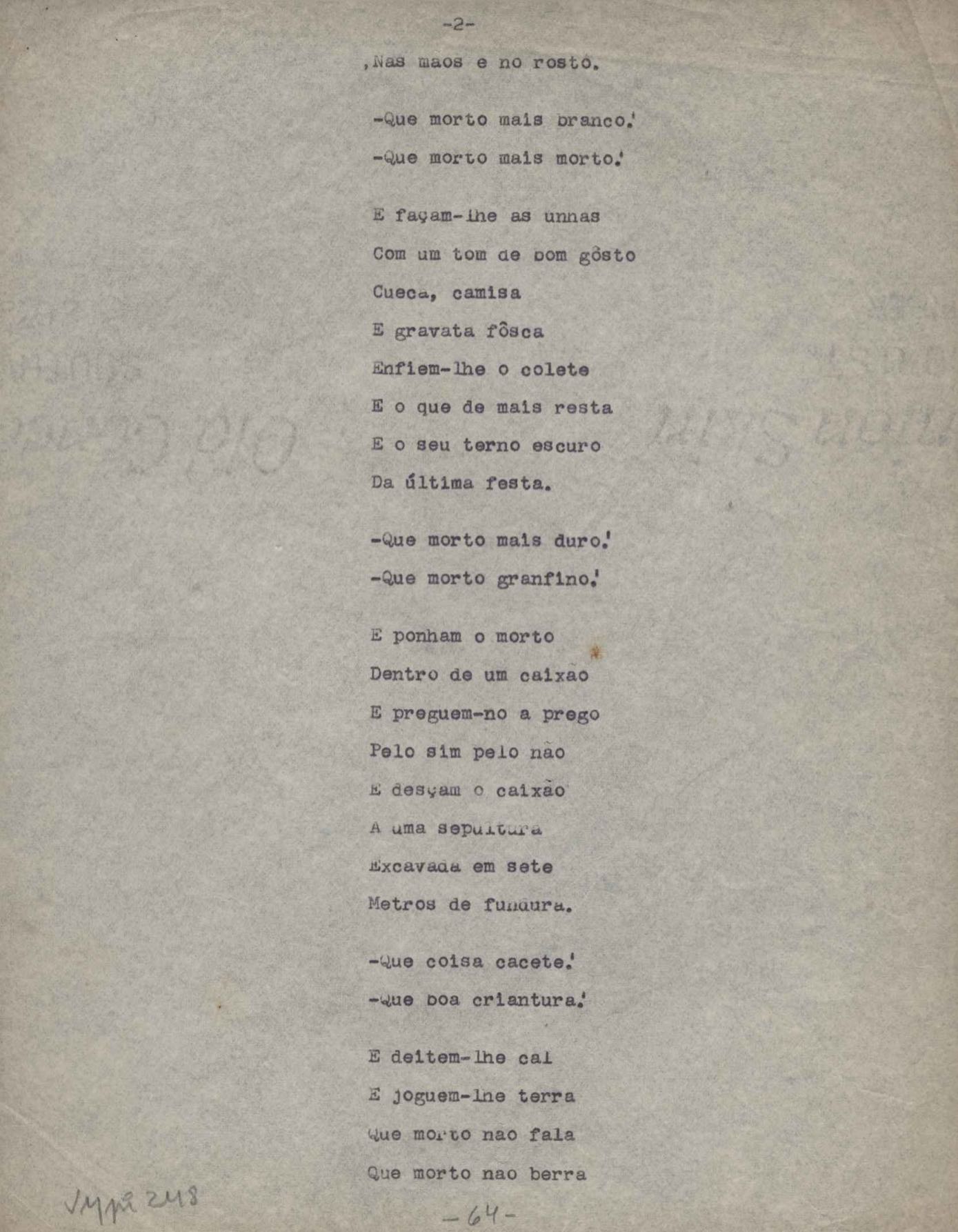 Poemas (231). "A Berlim", "A você, com amor", "Abecedê dos bichos", "Os acadêmicos… das 5 horas", "Acalanto do tirano", "Acontecimento", "Adeus, amigos meus", "Alexandra, a caçadora", "Alexandrinos a Florença", "O alfaiate", "Amor", "Angina pultácea", "O anjo e o túmulo", "Anistia", "Antônia, as flores e os cactos", "Aos de casa", "Aribe", "Áries", "Ave Susana", "Aventuras de Zorinha", "Balada da perna ortopédica", "Balada de Santa Luzia", "Balada do Rei Gê Tule", "Balada dos tecelões", "Balango das debutantes", "Banho", "Beethoven", "Beleza do corpo da amiga", "Bellum omnia contra omnes", "Os bens imóveis", "O bilhar", "Bola", "A cabeça em chamas", "A cabritinha", "Cadenza no poema a Eisenstein", "O caipora", "Canção da alta irrealidade", "Canção da esposa", "Canção do Tinhá", "Canção em lágrimas na morte de Manuel Bandeira", "O candiru", "O cântico das águas", "Cantiga do ausente", "Cantiga X", "Cantiga XI", "Cantiga XIII", "Canto", "Canto V", "Canto VI", "Canto VII", "Canto do deserto", "Canto do desespero", "Canto do soldado desconhecido", "Canto triste", "O caso Sacco e Vanzetti", "Cemitério marinho", "China minha", "Coma alcóolico", "Conhecimento", "Cotidiano nº 2 ou como já dizia o Chico…", "Cromo", "Da fidelidade", "Desafio", "O desespero da caridade", "Desolação", "Dia de Oxalá", "Dobrado de mestre cucas", "Dois sonetos com avião", "Elba, Elbinha, Elbita", "Elegia a Chaplin Calvero Chaplin", "Elegia de Belém do Pará", "Elegia de Paris", "Elegia fúnebre para minha prima", "O eleito", "Eliana", "Em algum lugar", "Em Montevidéu", "Enigma", "Epitalâmio", "Esboço", "Estâncias a minha filha", "Estava triste o pinguim?", "Estudo", "Eu, cá por mim, odeio paradoxos", "Explicando", "Eu nasci marcado pela paixão…", "Exumação de Mário de Andrade", "Fala íntima", "A formiga", "A freirinha", "Frevo do barão", "Fuga e adágio", "Fui andando por um caminho…", "O general", "O haver", "High barbaree", "Himeneu", "Hino da Escola Monteiro Lobato", "História de alma", "O homem do chapéu de coco foi visto andando pelas cercanias", "Os homens da terra", "Idílio", "A infância do poeta", "José", "Lázaro", "Legenda", "A legenda do príncipe poeta", "Little bird", "Little mohee", "Lua do trópico", "Lullaby to Susana", "Madrigal", "Mãe", "O maestro Villa-Lobos fixa-se na eternidade", "O mal de Nava", "Marcha", "Marcha da Guanabara", "Mário", "Marlene", "Medo de amar", "A melhor amiga", "Menino de roça", "O menino no cemitério", "Mensagem a minha amiga Danuza Leão Wainer", "A miragem", "My darling’s Batel", "Modinha de Natal para a bem-amada", "A morte de meu carneirinho", "A morte do pintainho", "A mosca", "O mosquito", "Na esperança de teus olhos", "Não me fales de adeus", "Não te dou perdão", "Nature boy", "Natureza humana", "Noturno de Genebra", "Numa noite de luar", "O que disseram as flores a respeito de uma outra chamada Virgínia", "Ode a maio", "Ode a S. Francisco de Assis", "Ode no octontenário de Manuel Bandeira", "Oferenda", "Otávio", "P(b)a(o)i", "Padre nosso", "O pai", "O passante", "O pastor", "Patético", "Paulinho Garcez", "Pensée de desespoir", "A perdida esperança", "Pescador", "Petite histoire naturelle", "Plagiando o poeta…", "Poema de ano novo", "Poema erótico para Isabel", "O poema errante de 7 de outubro", "Poema feito para chegar aos ouvidos de S. Teresa", "Poema na morte de meu compadre Carlos Echenique", "Poesia de água doce feita com água salgada às dez e meia", "O poeta diz adeus a sua amiga", "A ponte de Van Gogh", "Ponto da aurora nascendo", "Por você", "O pranteado", "O presente", "Pressentimento", "Princípio", "As procelárias", "Quadrinha", "Quando um peixe-espada", "Quase um adeus", "Quem és", "Quem nunca comeu melado", "Quem parte não reparte", "Questões de cinema", "Quiromancia", "Realidade", "Redondilhas pra Tati", "A retirada", "Retrato de Carlos Drummond de Andrade", "Retrato de Maria Lúcia (II)", "Romance da amada e da morte", "Romance da morena", "Romanza de alma", "A rosa", "Os rouxinóis", "O sacrifício do vinho", "Sagitário", "A santa de Sabará", "Santo Antônio", "Saudade de você", "Sinos", "Sob o trópico de câncer", "O soldado", "Soneto", "Soneto a Oxford", "Soneto a quatro mãos", "Soneto ao Caju", "Soneto da desesperança", "Soneto da Ilha", "Soneto da primavera", "Soneto da criação", "Soneto de luz e treva", "Soneto de um casamento", "Soneto do amigo", "Soneto do amor demais", "Soneto do breve momento", "Soneto na morte de José Artur da Frota Moreira", "Soneto sentimental à cidade de São Paulo", "Souvenir", "Stelas…", "A tartaruga da paz", "Tatiografia", "Teorema poético", "Touro", "A transfiguração da montanha", "Trovas", "A última música", "Última primavera", "O último liberto", "Unção", "A vã pergunta", "Valsa suburbana", "Verdade", "Você não é de nada mesmo", "Volta" e "A volta de Lázaro". Anexo: 1. Outras versões manuscritas e datilografadas de "Adeus, amigos meus", "Alexandra, a caçadora", "Alexandrinos a Florença", "O anjo e o túmulo", "Ave Susana", "Aventuras de Zorinha", "Os bens imóveis", "Canção do Tinhá", "Canção em lágrimas na morte de Manuel Bandeira", "Canto triste", "Da fidelidade", "O desespero da caridade", "Dois sonetos com avião", "Elba, Elbinha, Elbita", "Elegia fúnebre para minha prima", "Esboço", "Estâncias a minha filha", "Exumação de Mário de Andrade", "Fala íntima", "Frevo do barão", "O haver", "Os homens da terra", "Mãe", "O menino no cemitério", "A miragem", "A morte do pintainho", "Na esperança de teus olhos", "Ode a São Francisco", "Patético", "Poema de ano novo", "Poema na morte de meu compadre Carlos Echenique", "O poeta aprendiz [homônimo]", "As procelárias", "O que disseram as flores a respeito de uma outra chamada Virgínia", "Quase um adeus", "Retrato de Carlos Drummond de Andrade", "A santa de Sabará", "Sinos", "Sob o Trópico do Câncer", "Soneto a Oxford", "Soneto ao Caju", "So