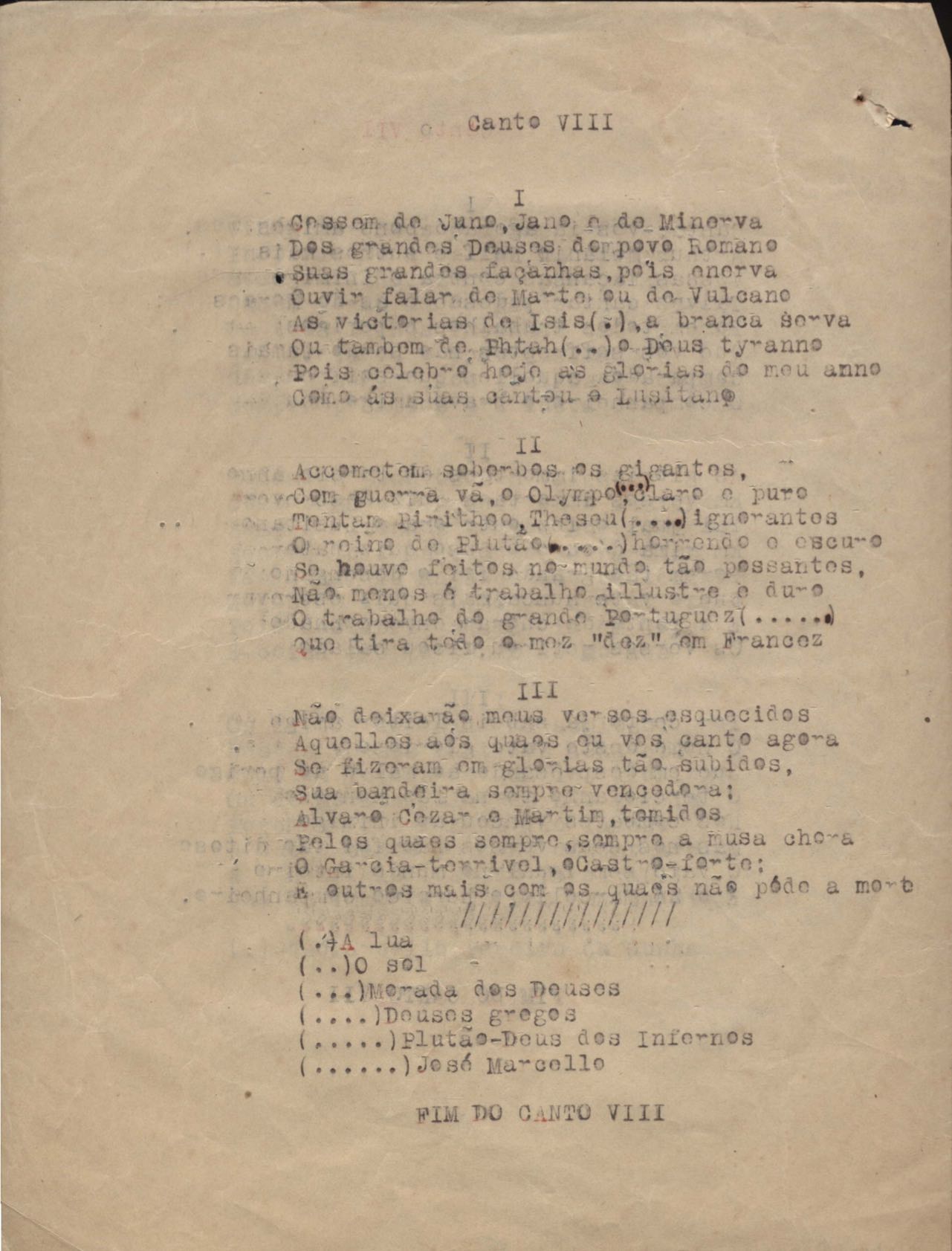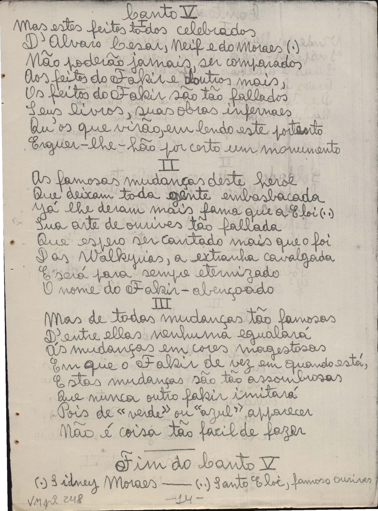 Dossiê dividido em nove partes. Outras observações: 1. Alguns poemas estão incompletos; 2. No verso de "O cântico das águas" encontra-se "A legenda do príncipe poeta" e no de "Verdade", "Plagiando o poeta..."; 3. Há dois poemas com o título de "Elegia de Paris", de "Legenda", de "Madrigal" e de "Trovas"; 4. "Cantiga XI" está publicada na Obra poética com o título de "Duas canções de silêncio II"; 5. Na mesma folha que "Pressentimento" encontram-se "Legenda" e "O bilhar", na mesma de "Romance da morena" temos "Não te dou perdão", e na de "Canto", "Última primavera", na de "Poema feito para chegar aos ouvidos de S. Teresa", outra versão de "Fala íntima"; 6. "O soneto a quatro mãos" foi escrito por VM e Paulo Mendes Campos e "Os acadêmicos... das 5 horas", por VM e Moacir Veloso de Oliveira; 7. Há dois poemas com o título de "A miragem"; 8. Destes poemas, 401 são esboços e não possuem título.