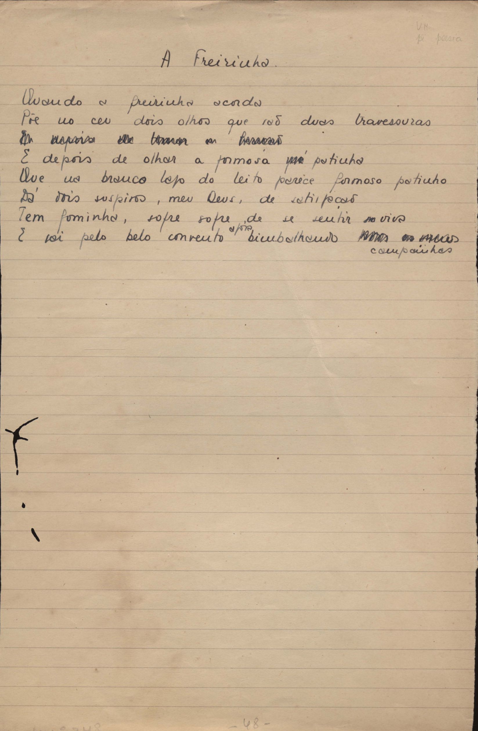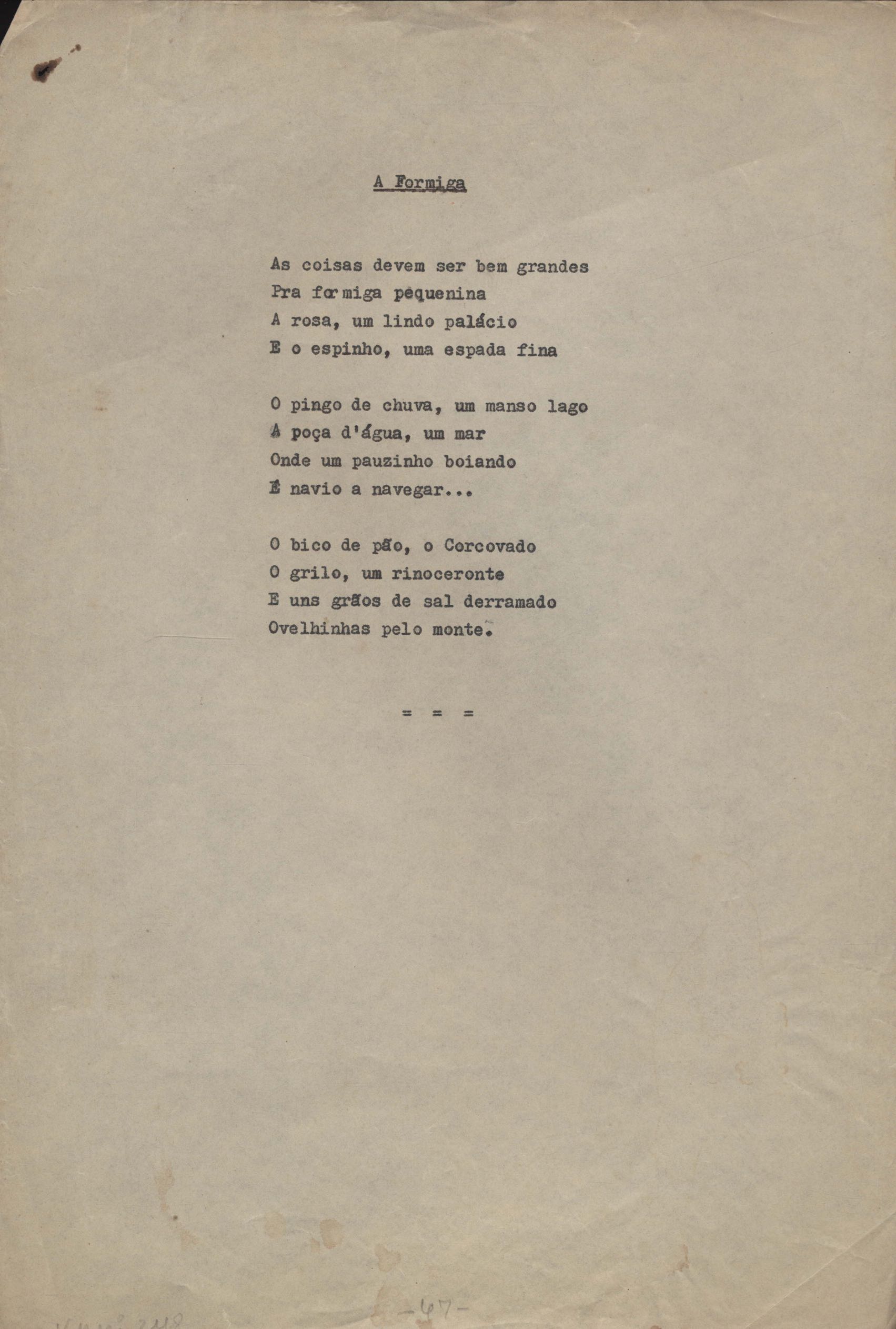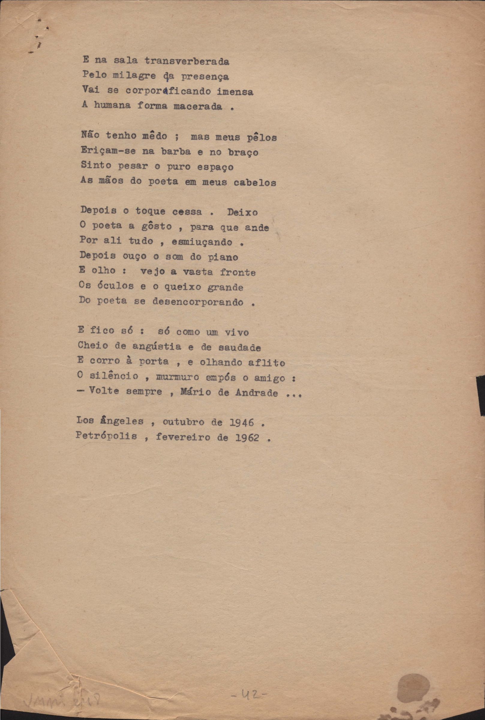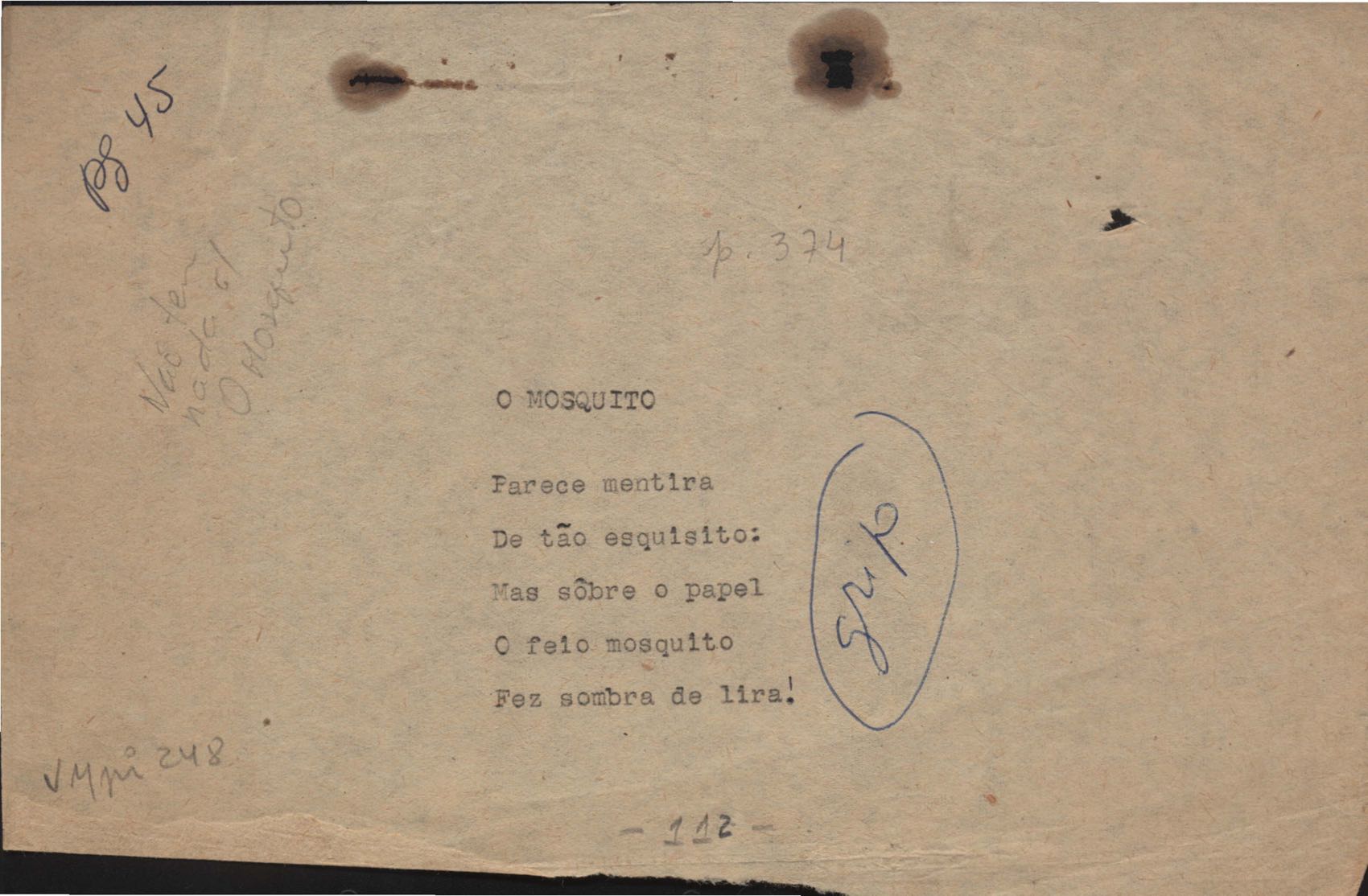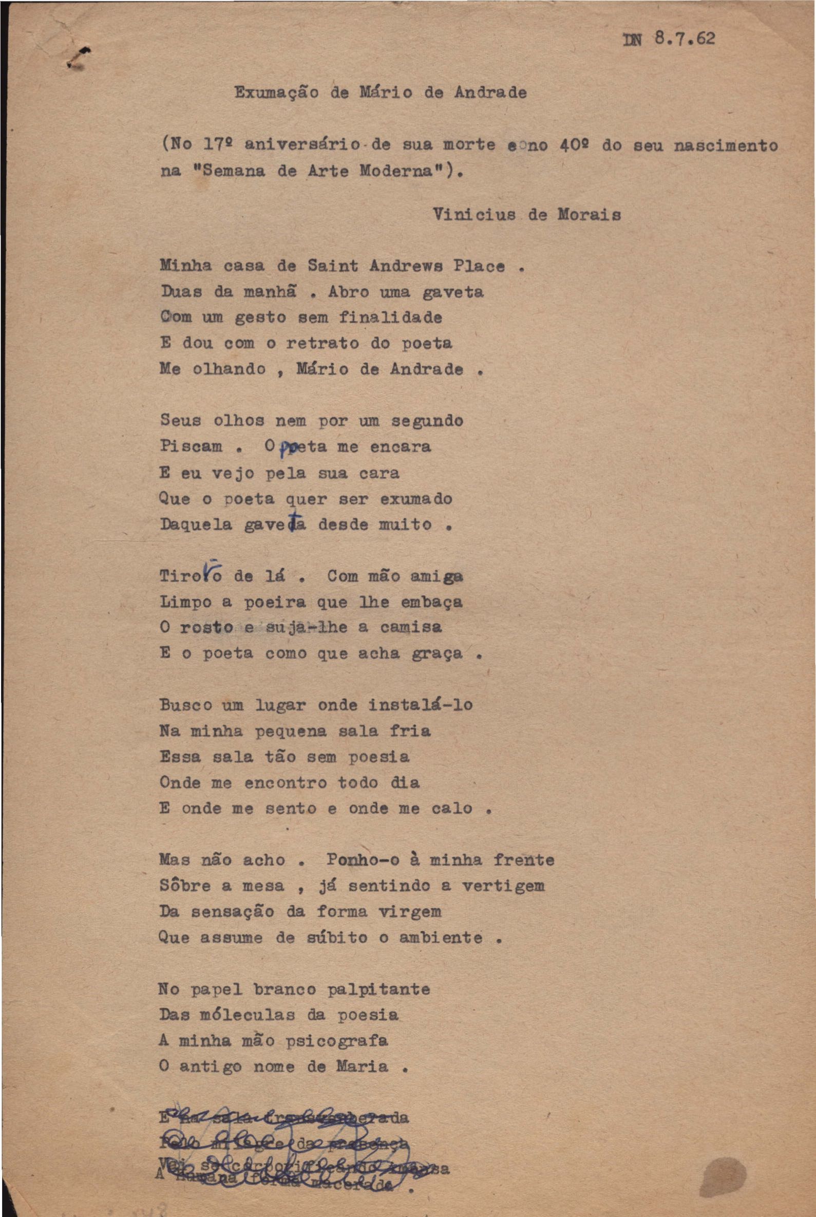 Dossiê dividido em nove partes. Outras observações: 1. Alguns poemas estão incompletos; 2. No verso de "O cântico das águas" encontra-se "A legenda do príncipe poeta" e no de "Verdade", "Plagiando o poeta..."; 3. Há dois poemas com o título de "Elegia de Paris", de "Legenda", de "Madrigal" e de "Trovas"; 4. "Cantiga XI" está publicada na Obra poética com o título de "Duas canções de silêncio II"; 5. Na mesma folha que "Pressentimento" encontram-se "Legenda" e "O bilhar", na mesma de "Romance da morena" temos "Não te dou perdão", e na de "Canto", "Última primavera", na de "Poema feito para chegar aos ouvidos de S. Teresa", outra versão de "Fala íntima"; 6. "O soneto a quatro mãos" foi escrito por VM e Paulo Mendes Campos e "Os acadêmicos... das 5 horas", por VM e Moacir Veloso de Oliveira; 7. Há dois poemas com o título de "A miragem"; 8. Destes poemas, 401 são esboços e não possuem título.
