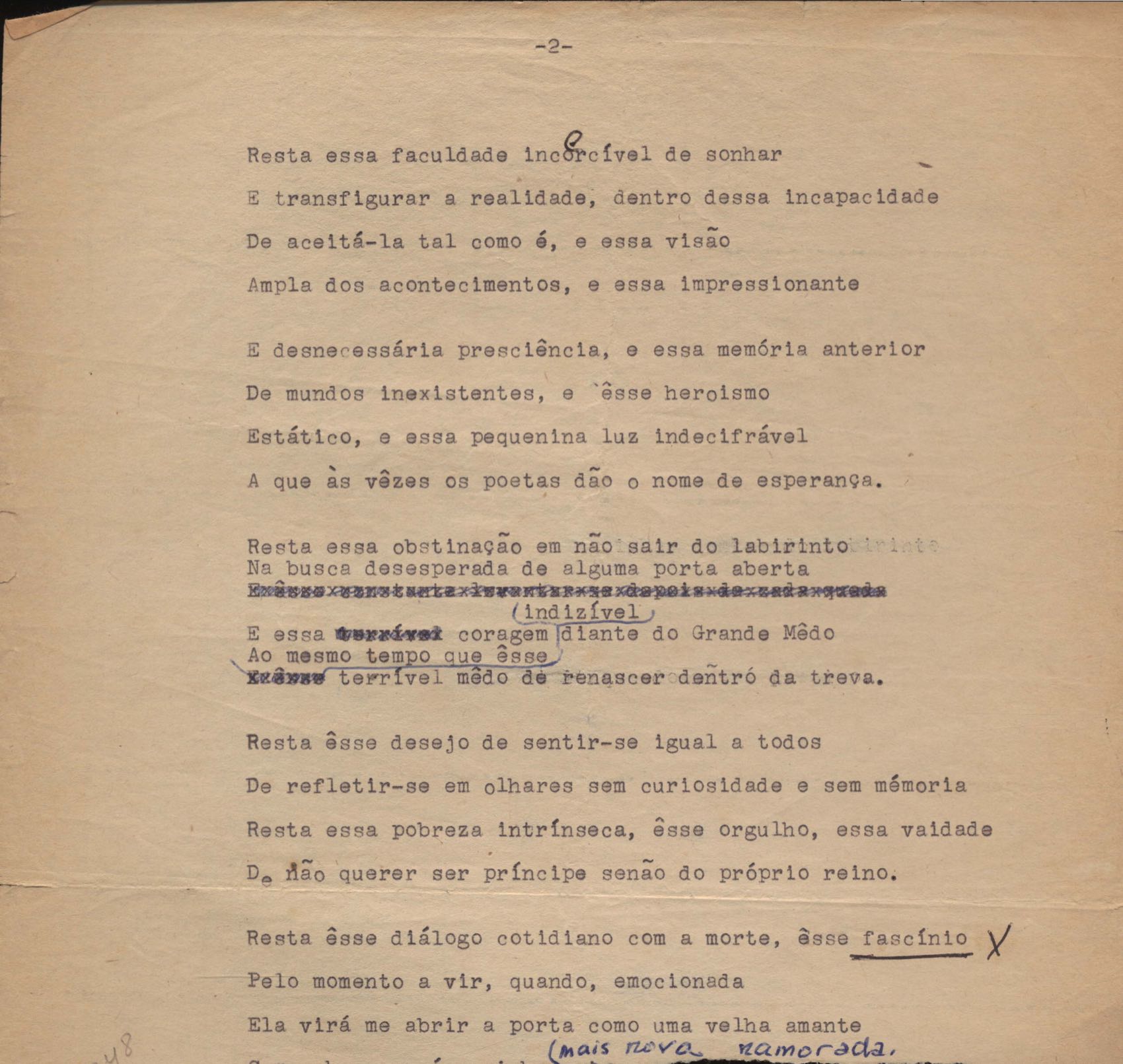 Poemas (231). "A Berlim", "A você, com amor", "Abecedê dos bichos", "Os acadêmicos… das 5 horas", "Acalanto do tirano", "Acontecimento", "Adeus, amigos meus", "Alexandra, a caçadora", "Alexandrinos a Florença", "O alfaiate", "Amor", "Angina pultácea", "O anjo e o túmulo", "Anistia", "Antônia, as flores e os cactos", "Aos de casa", "Aribe", "Áries", "Ave Susana", "Aventuras de Zorinha", "Balada da perna ortopédica", "Balada de Santa Luzia", "Balada do Rei Gê Tule", "Balada dos tecelões", "Balango das debutantes", "Banho", "Beethoven", "Beleza do corpo da amiga", "Bellum omnia contra omnes", "Os bens imóveis", "O bilhar", "Bola", "A cabeça em chamas", "A cabritinha", "Cadenza no poema a Eisenstein", "O caipora", "Canção da alta irrealidade", "Canção da esposa", "Canção do Tinhá", "Canção em lágrimas na morte de Manuel Bandeira", "O candiru", "O cântico das águas", "Cantiga do ausente", "Cantiga X", "Cantiga XI", "Cantiga XIII", "Canto", "Canto V", "Canto VI", "Canto VII", "Canto do deserto", "Canto do desespero", "Canto do soldado desconhecido", "Canto triste", "O caso Sacco e Vanzetti", "Cemitério marinho", "China minha", "Coma alcóolico", "Conhecimento", "Cotidiano nº 2 ou como já dizia o Chico…", "Cromo", "Da fidelidade", "Desafio", "O desespero da caridade", "Desolação", "Dia de Oxalá", "Dobrado de mestre cucas", "Dois sonetos com avião", "Elba, Elbinha, Elbita", "Elegia a Chaplin Calvero Chaplin", "Elegia de Belém do Pará", "Elegia de Paris", "Elegia fúnebre para minha prima", "O eleito", "Eliana", "Em algum lugar", "Em Montevidéu", "Enigma", "Epitalâmio", "Esboço", "Estâncias a minha filha", "Estava triste o pinguim?", "Estudo", "Eu, cá por mim, odeio paradoxos", "Explicando", "Eu nasci marcado pela paixão…", "Exumação de Mário de Andrade", "Fala íntima", "A formiga", "A freirinha", "Frevo do barão", "Fuga e adágio", "Fui andando por um caminho…", "O general", "O haver", "High barbaree", "Himeneu", "Hino da Escola Monteiro Lobato", "História de alma", "O homem do chapéu de coco foi visto andando pelas cercanias", "Os homens da terra", "Idílio", "A infância do poeta", "José", "Lázaro", "Legenda", "A legenda do príncipe poeta", "Little bird", "Little mohee", "Lua do trópico", "Lullaby to Susana", "Madrigal", "Mãe", "O maestro Villa-Lobos fixa-se na eternidade", "O mal de Nava", "Marcha", "Marcha da Guanabara", "Mário", "Marlene", "Medo de amar", "A melhor amiga", "Menino de roça", "O menino no cemitério", "Mensagem a minha amiga Danuza Leão Wainer", "A miragem", "My darling’s Batel", "Modinha de Natal para a bem-amada", "A morte de meu carneirinho", "A morte do pintainho", "A mosca", "O mosquito", "Na esperança de teus olhos", "Não me fales de adeus", "Não te dou perdão", "Nature boy", "Natureza humana", "Noturno de Genebra", "Numa noite de luar", "O que disseram as flores a respeito de uma outra chamada Virgínia", "Ode a maio", "Ode a S. Francisco de Assis", "Ode no octontenário de Manuel Bandeira", "Oferenda", "Otávio", "P(b)a(o)i", "Padre nosso", "O pai", "O passante", "O pastor", "Patético", "Paulinho Garcez", "Pensée de desespoir", "A perdida esperança", "Pescador", "Petite histoire naturelle", "Plagiando o poeta…", "Poema de ano novo", "Poema erótico para Isabel", "O poema errante de 7 de outubro", "Poema feito para chegar aos ouvidos de S. Teresa", "Poema na morte de meu compadre Carlos Echenique", "Poesia de água doce feita com água salgada às dez e meia", "O poeta diz adeus a sua amiga", "A ponte de Van Gogh", "Ponto da aurora nascendo", "Por você", "O pranteado", "O presente", "Pressentimento", "Princípio", "As procelárias", "Quadrinha", "Quando um peixe-espada", "Quase um adeus", "Quem és", "Quem nunca comeu melado", "Quem parte não reparte", "Questões de cinema", "Quiromancia", "Realidade", "Redondilhas pra Tati", "A retirada", "Retrato de Carlos Drummond de Andrade", "Retrato de Maria Lúcia (II)", "Romance da amada e da morte", "Romance da morena", "Romanza de alma", "A rosa", "Os rouxinóis", "O sacrifício do vinho", "Sagitário", "A santa de Sabará", "Santo Antônio", "Saudade de você", "Sinos", "Sob o trópico de câncer", "O soldado", "Soneto", "Soneto a Oxford", "Soneto a quatro mãos", "Soneto ao Caju", "Soneto da desesperança", "Soneto da Ilha", "Soneto da primavera", "Soneto da criação", "Soneto de luz e treva", "Soneto de um casamento", "Soneto do amigo", "Soneto do amor demais", "Soneto do breve momento", "Soneto na morte de José Artur da Frota Moreira", "Soneto sentimental à cidade de São Paulo", "Souvenir", "Stelas…", "A tartaruga da paz", "Tatiografia", "Teorema poético", "Touro", "A transfiguração da montanha", "Trovas", "A última música", "Última primavera", "O último liberto", "Unção", "A vã pergunta", "Valsa suburbana", "Verdade", "Você não é de nada mesmo", "Volta" e "A volta de Lázaro". Anexo: 1. Outras versões manuscritas e datilografadas de "Adeus, amigos meus", "Alexandra, a caçadora", "Alexandrinos a Florença", "O anjo e o túmulo", "Ave Susana", "Aventuras de Zorinha", "Os bens imóveis", "Canção do Tinhá", "Canção em lágrimas na morte de Manuel Bandeira", "Canto triste", "Da fidelidade", "O desespero da caridade", "Dois sonetos com avião", "Elba, Elbinha, Elbita", "Elegia fúnebre para minha prima", "Esboço", "Estâncias a minha filha", "Exumação de Mário de Andrade", "Fala íntima", "Frevo do barão", "O haver", "Os homens da terra", "Mãe", "O menino no cemitério", "A miragem", "A morte do pintainho", "Na esperança de teus olhos", "Ode a São Francisco", "Patético", "Poema de ano novo", "Poema na morte de meu compadre Carlos Echenique", "O poeta aprendiz [homônimo]", "As procelárias", "O que disseram as flores a respeito de uma outra chamada Virgínia", "Quase um adeus", "Retrato de Carlos Drummond de Andrade", "A santa de Sabará", "Sinos", "Sob o Trópico do Câncer", "Soneto a Oxford", "Soneto ao Caju", "So