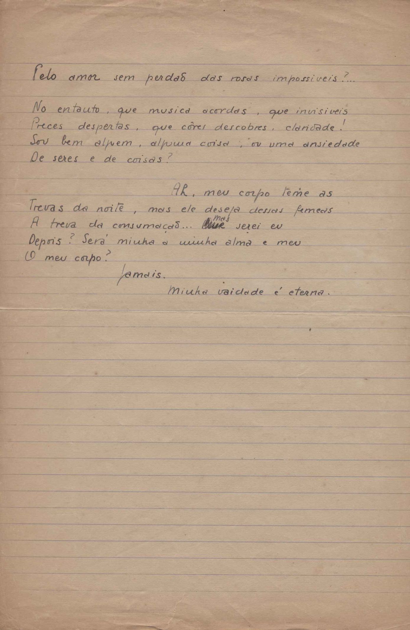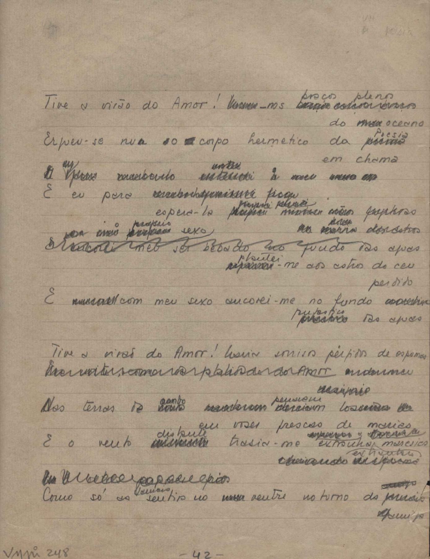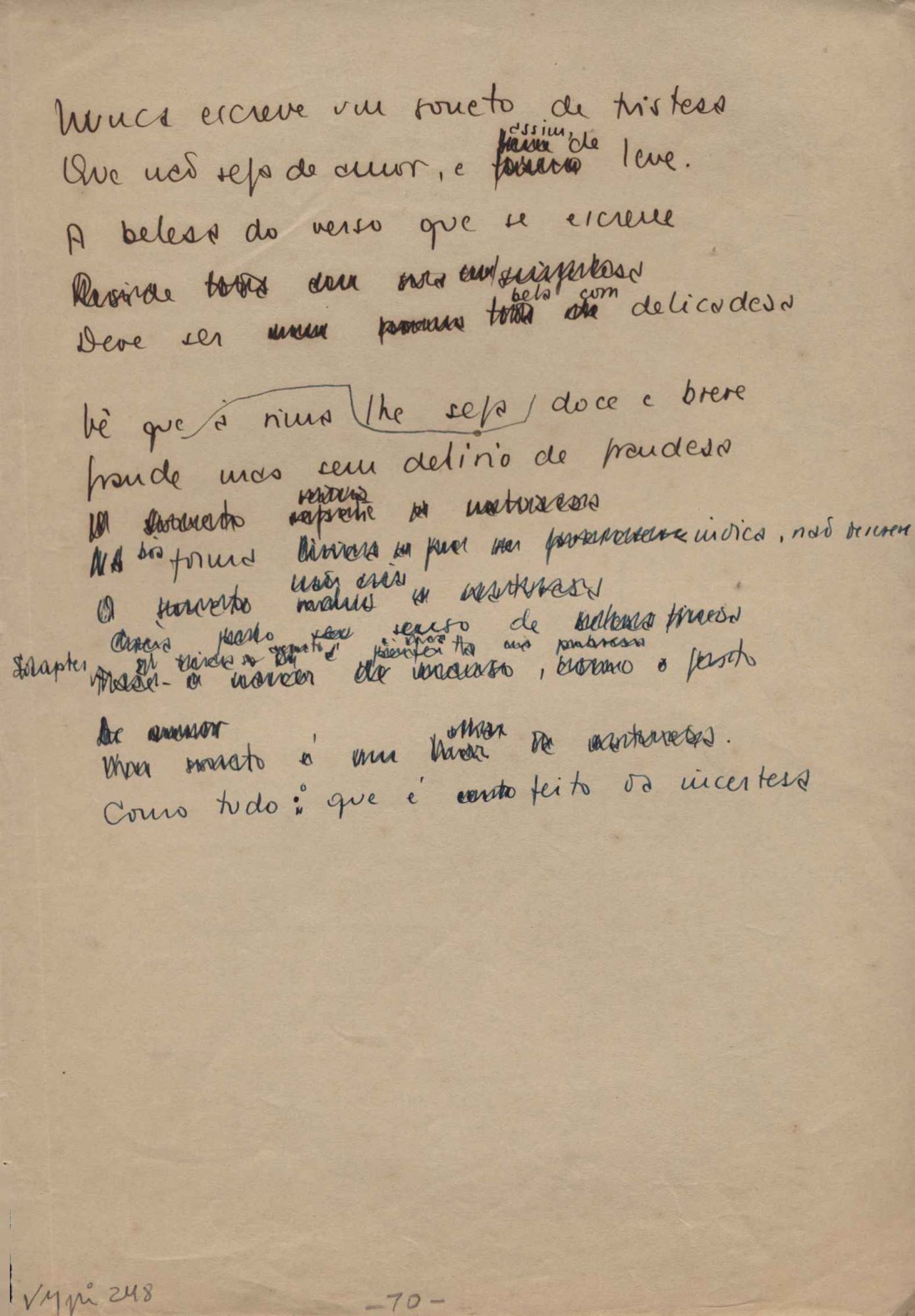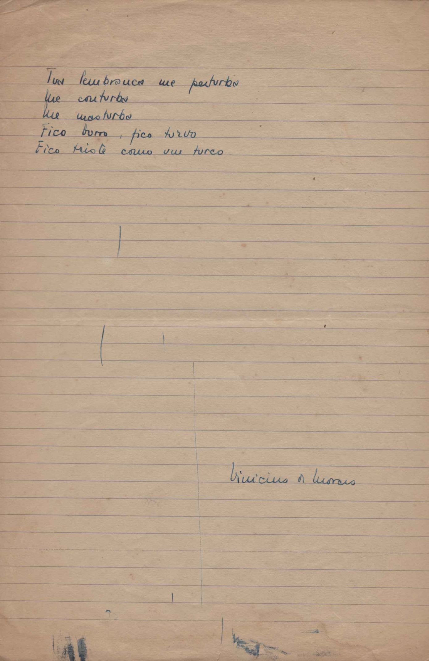 Dossiê dividido em nove partes. Outras observações: 1. Alguns poemas estão incompletos; 2. No verso de "O cântico das águas" encontra-se "A legenda do príncipe poeta" e no de "Verdade", "Plagiando o poeta..."; 3. Há dois poemas com o título de "Elegia de Paris", de "Legenda", de "Madrigal" e de "Trovas"; 4. "Cantiga XI" está publicada na Obra poética com o título de "Duas canções de silêncio II"; 5. Na mesma folha que "Pressentimento" encontram-se "Legenda" e "O bilhar", na mesma de "Romance da morena" temos "Não te dou perdão", e na de "Canto", "Última primavera", na de "Poema feito para chegar aos ouvidos de S. Teresa", outra versão de "Fala íntima"; 6. "O soneto a quatro mãos" foi escrito por VM e Paulo Mendes Campos e "Os acadêmicos... das 5 horas", por VM e Moacir Veloso de Oliveira; 7. Há dois poemas com o título de "A miragem"; 8. Destes poemas, 401 são esboços e não possuem título.