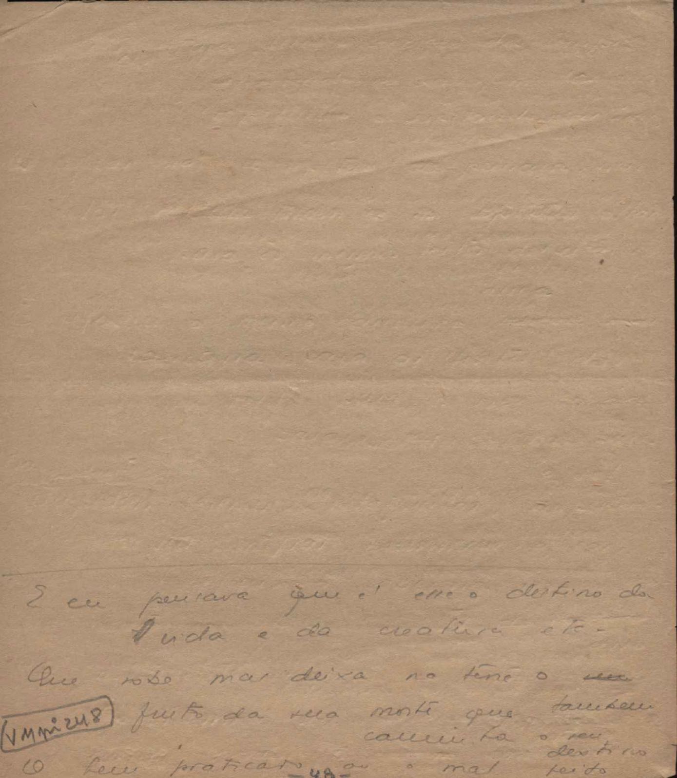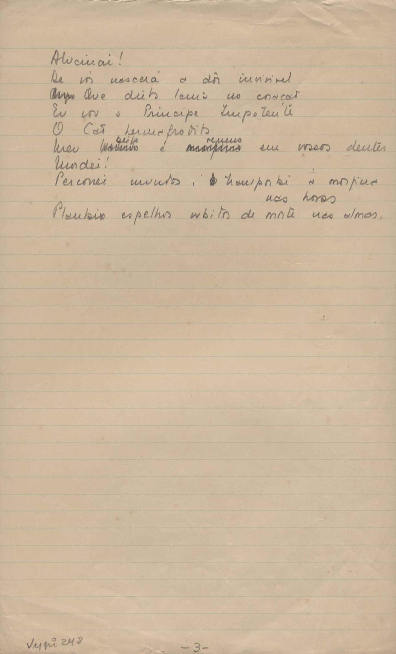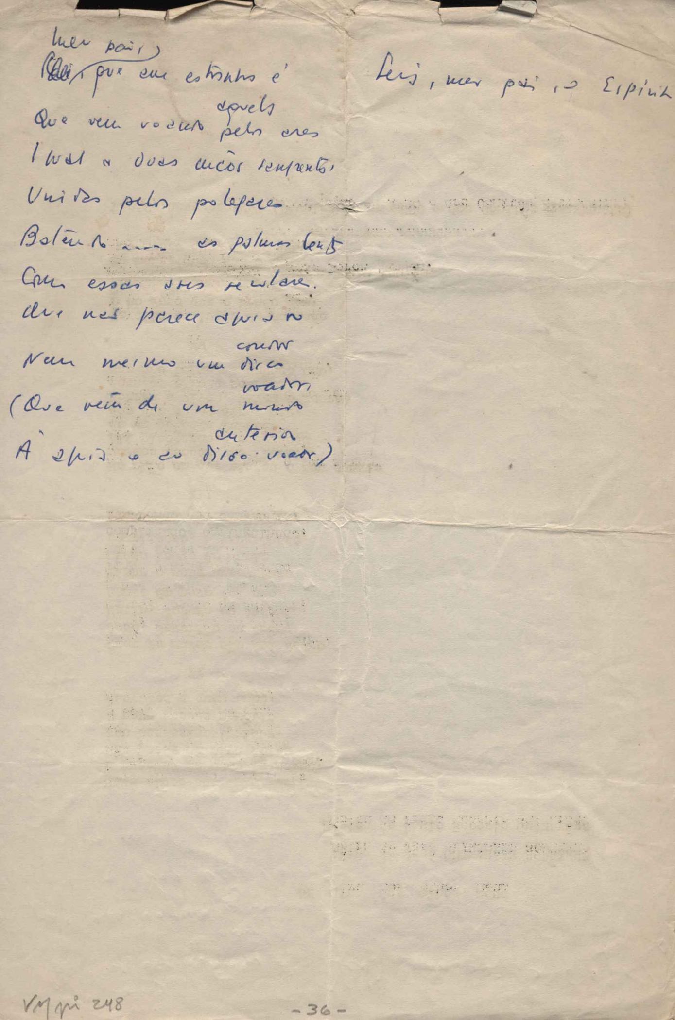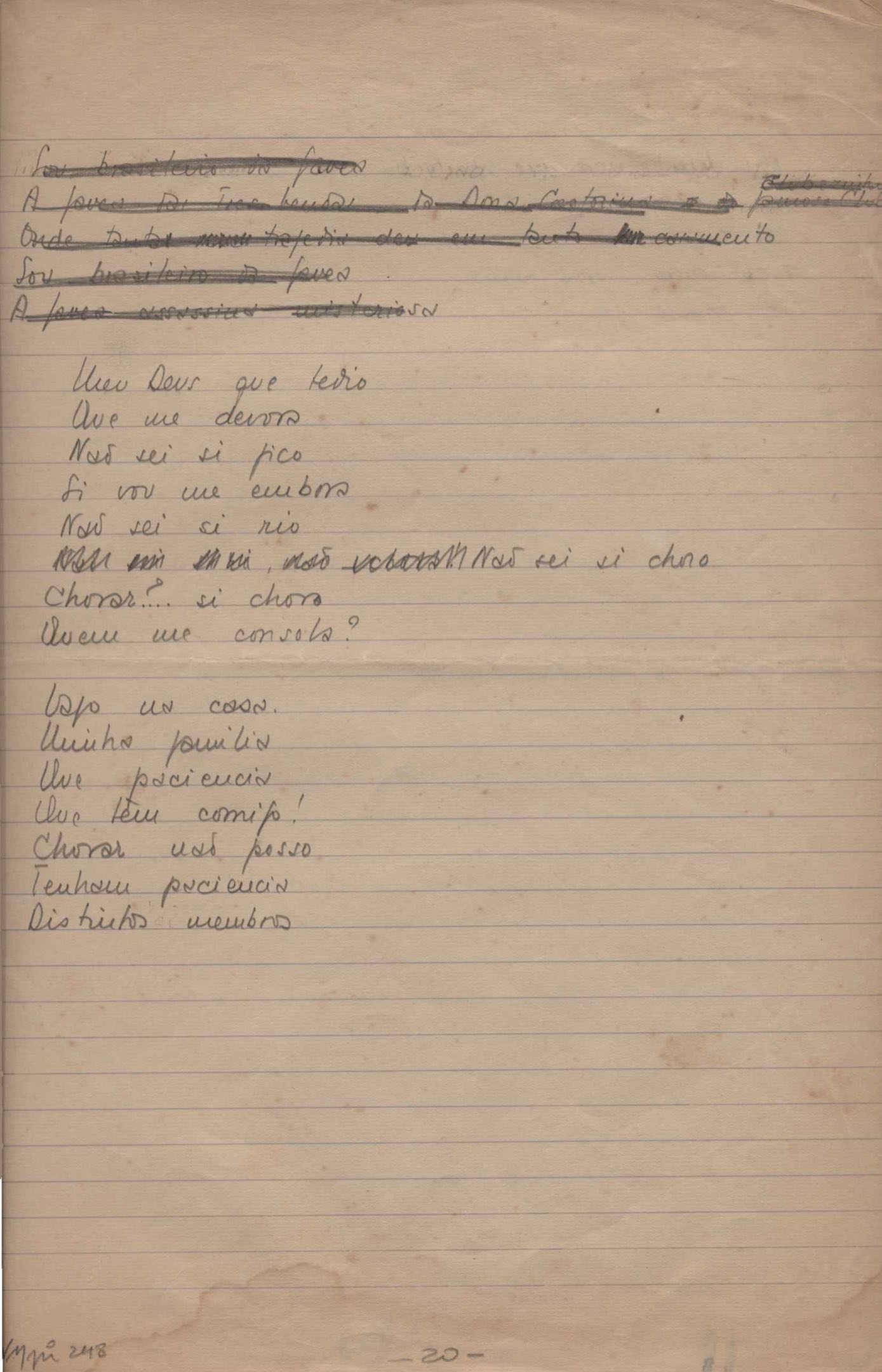 Dossiê dividido em nove partes. Outras observações: 1. Alguns poemas estão incompletos; 2. No verso de "O cântico das águas" encontra-se "A legenda do príncipe poeta" e no de "Verdade", "Plagiando o poeta..."; 3. Há dois poemas com o título de "Elegia de Paris", de "Legenda", de "Madrigal" e de "Trovas"; 4. "Cantiga XI" está publicada na Obra poética com o título de "Duas canções de silêncio II"; 5. Na mesma folha que "Pressentimento" encontram-se "Legenda" e "O bilhar", na mesma de "Romance da morena" temos "Não te dou perdão", e na de "Canto", "Última primavera", na de "Poema feito para chegar aos ouvidos de S. Teresa", outra versão de "Fala íntima"; 6. "O soneto a quatro mãos" foi escrito por VM e Paulo Mendes Campos e "Os acadêmicos... das 5 horas", por VM e Moacir Veloso de Oliveira; 7. Há dois poemas com o título de "A miragem"; 8. Destes poemas, 401 são esboços e não possuem título.