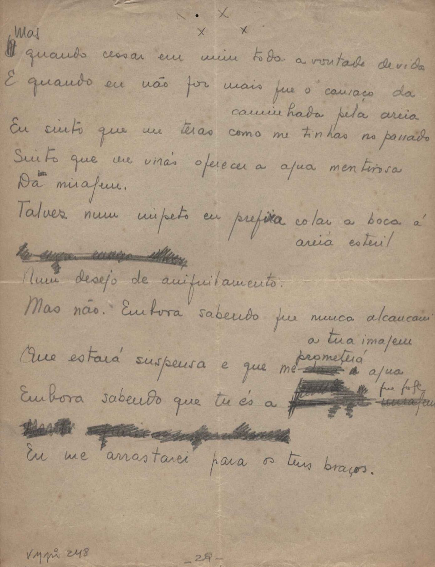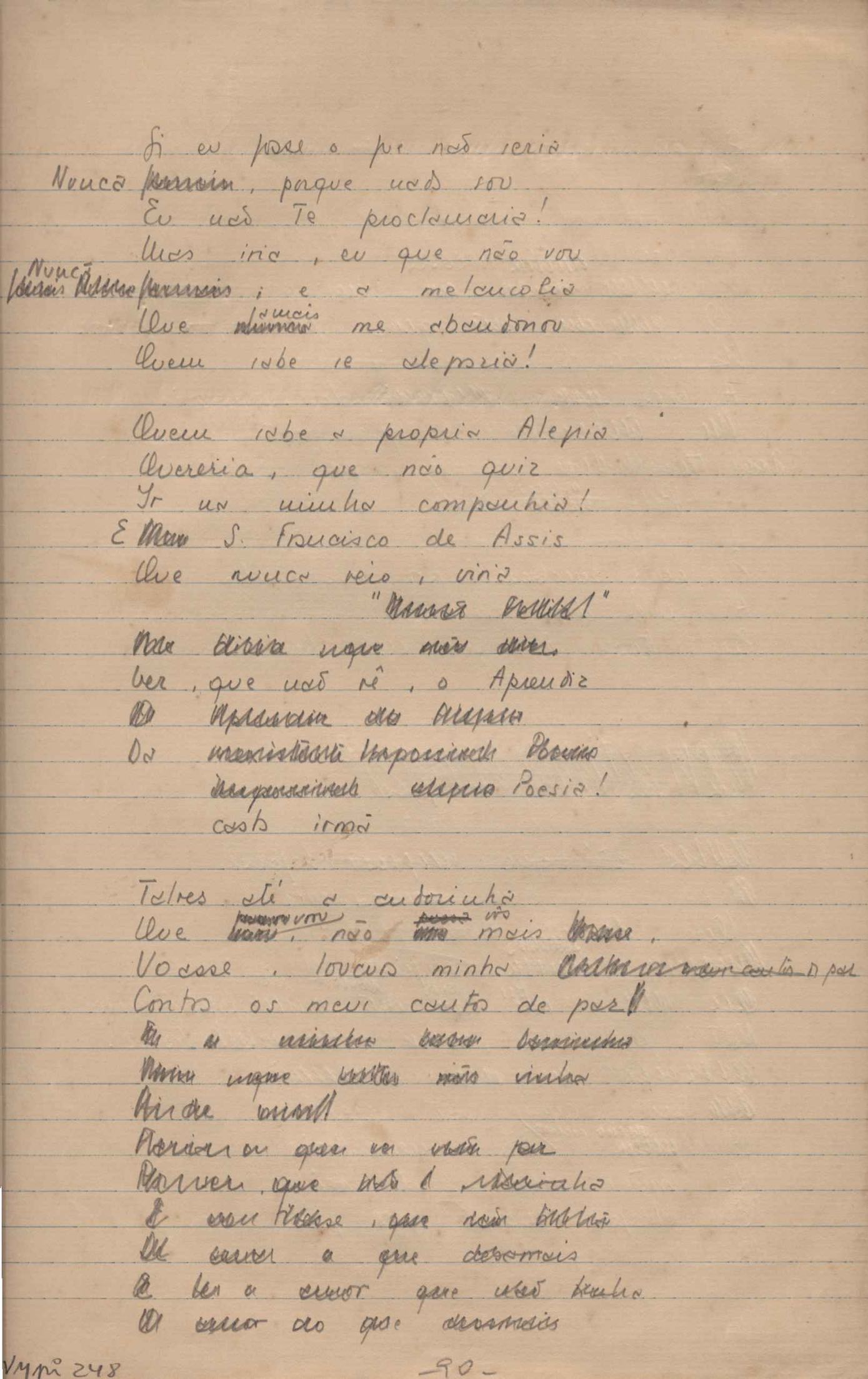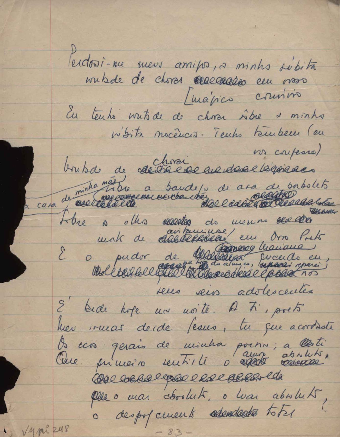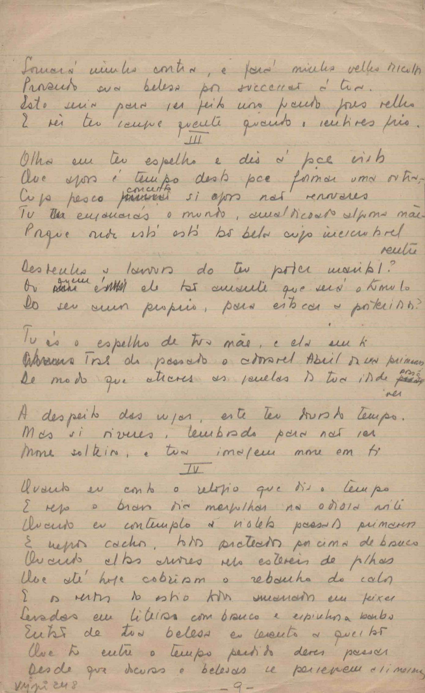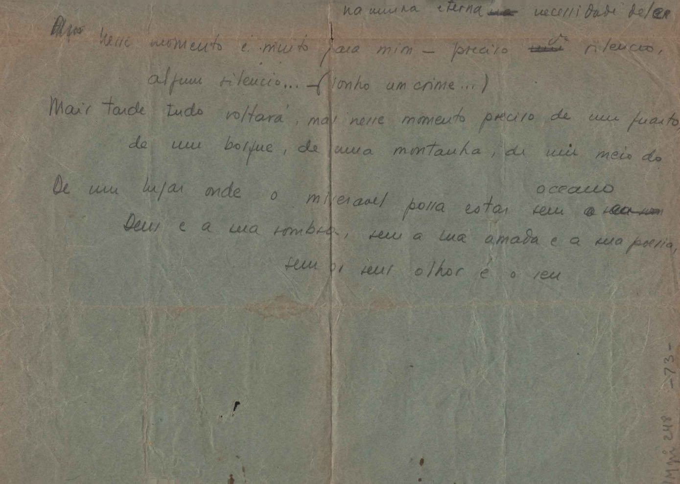 Dossiê dividido em nove partes. Outras observações: 1. Alguns poemas estão incompletos; 2. No verso de "O cântico das águas" encontra-se "A legenda do príncipe poeta" e no de "Verdade", "Plagiando o poeta..."; 3. Há dois poemas com o título de "Elegia de Paris", de "Legenda", de "Madrigal" e de "Trovas"; 4. "Cantiga XI" está publicada na Obra poética com o título de "Duas canções de silêncio II"; 5. Na mesma folha que "Pressentimento" encontram-se "Legenda" e "O bilhar", na mesma de "Romance da morena" temos "Não te dou perdão", e na de "Canto", "Última primavera", na de "Poema feito para chegar aos ouvidos de S. Teresa", outra versão de "Fala íntima"; 6. "O soneto a quatro mãos" foi escrito por VM e Paulo Mendes Campos e "Os acadêmicos... das 5 horas", por VM e Moacir Veloso de Oliveira; 7. Há dois poemas com o título de "A miragem"; 8. Destes poemas, 401 são esboços e não possuem título.