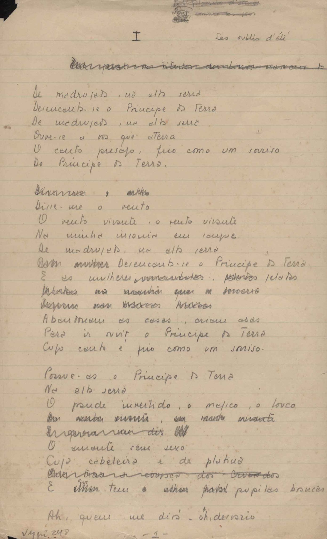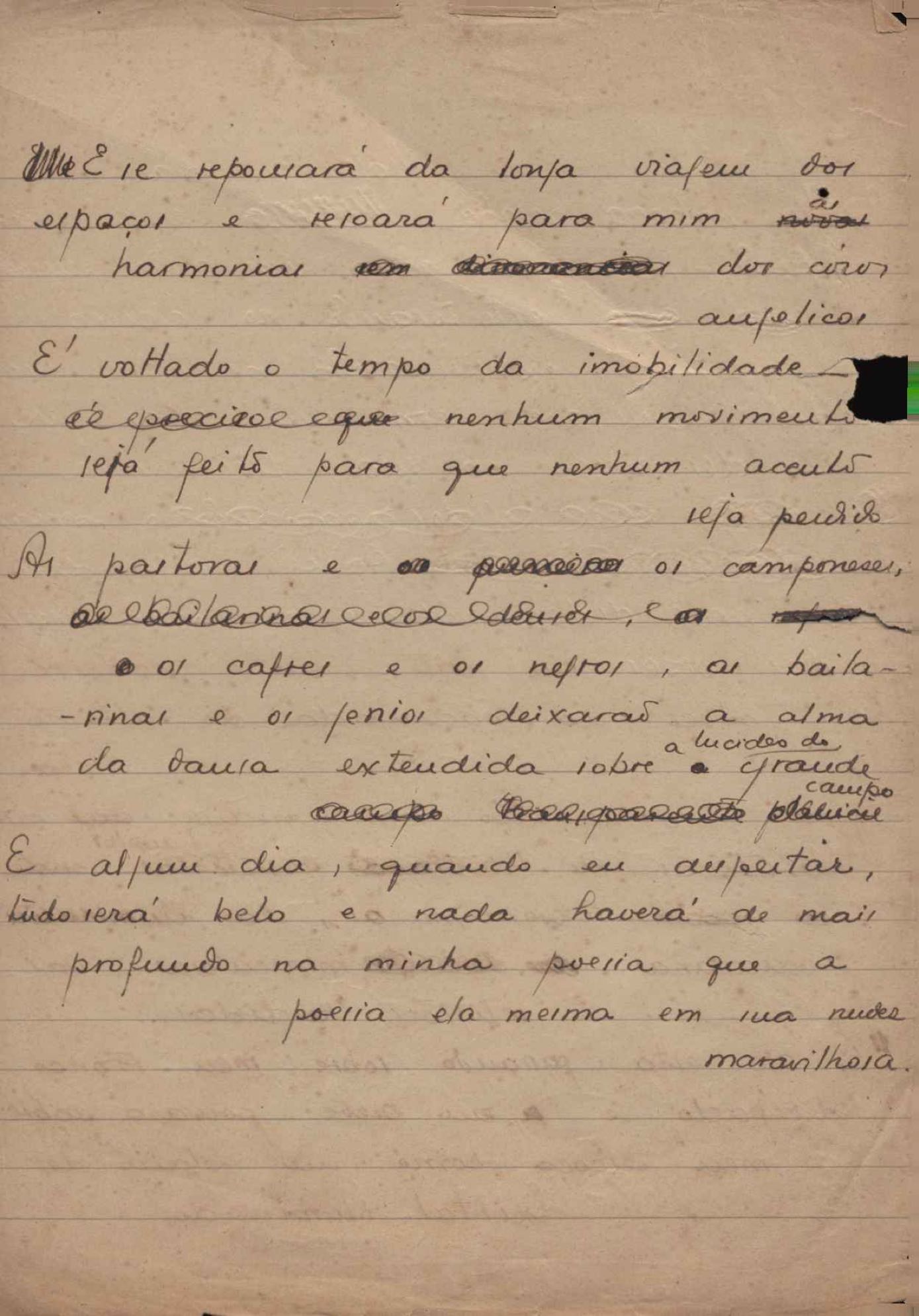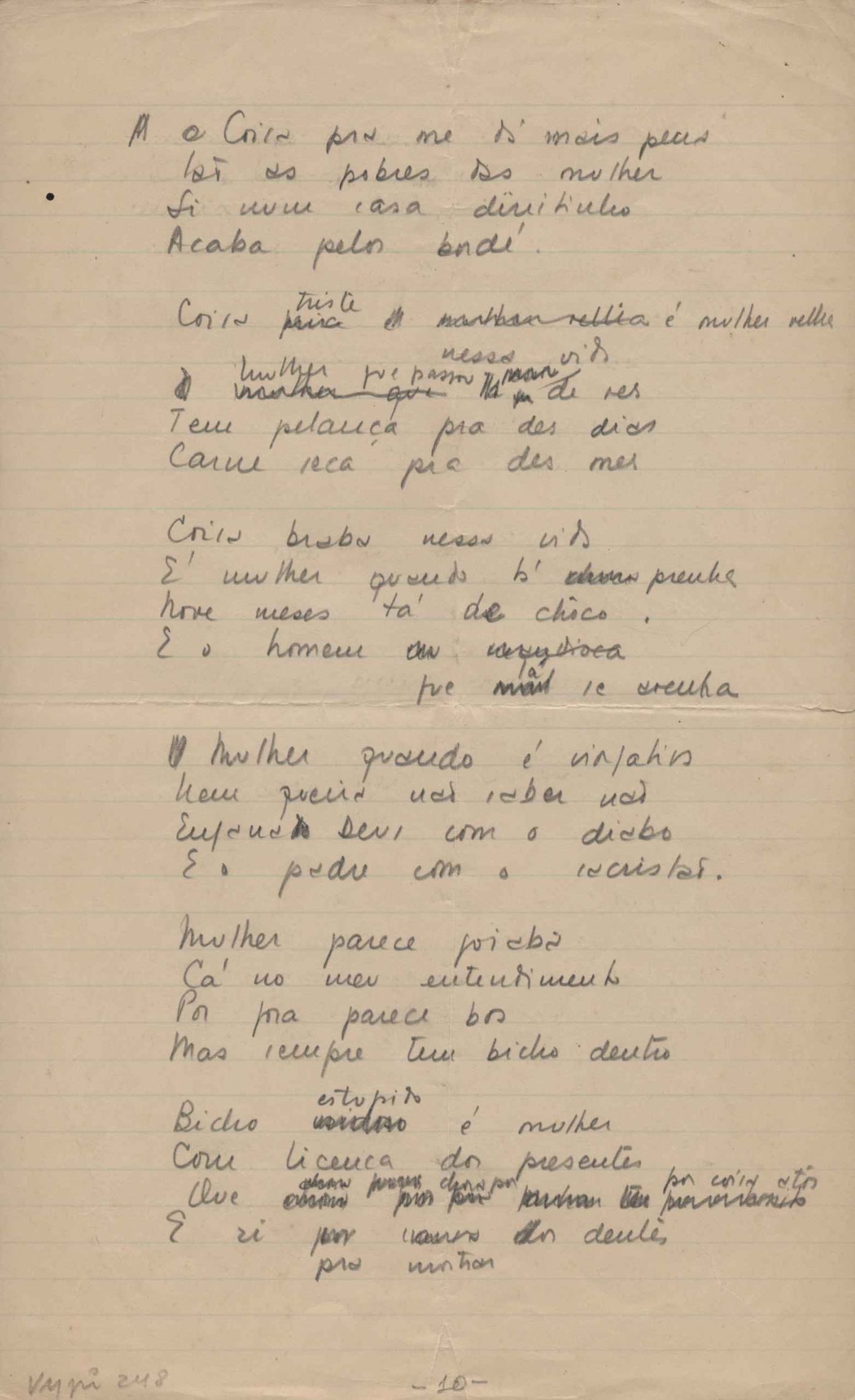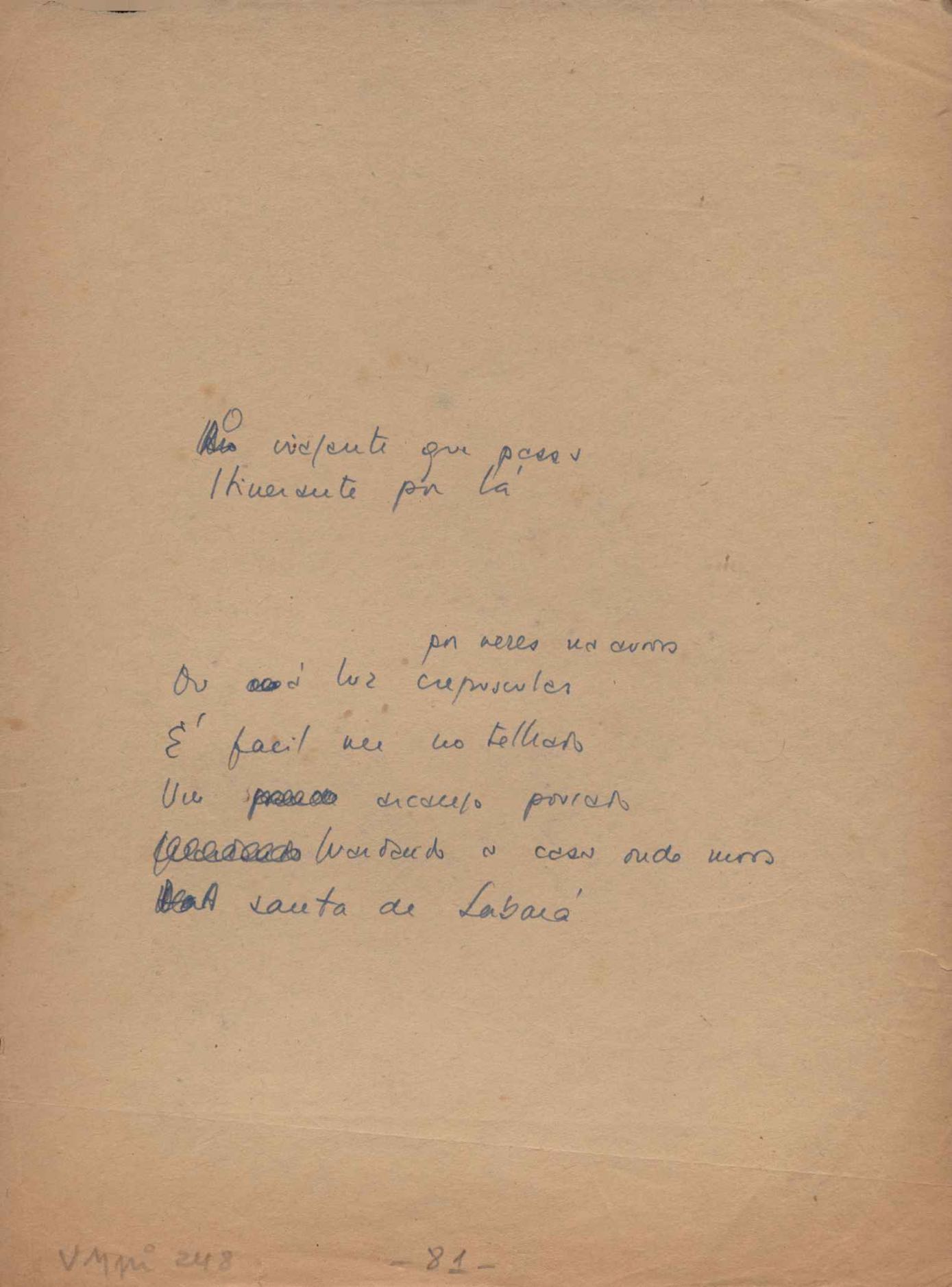 Dossiê dividido em nove partes. Outras observações: 1. Alguns poemas estão incompletos; 2. No verso de "O cântico das águas" encontra-se "A legenda do príncipe poeta" e no de "Verdade", "Plagiando o poeta..."; 3. Há dois poemas com o título de "Elegia de Paris", de "Legenda", de "Madrigal" e de "Trovas"; 4. "Cantiga XI" está publicada na Obra poética com o título de "Duas canções de silêncio II"; 5. Na mesma folha que "Pressentimento" encontram-se "Legenda" e "O bilhar", na mesma de "Romance da morena" temos "Não te dou perdão", e na de "Canto", "Última primavera", na de "Poema feito para chegar aos ouvidos de S. Teresa", outra versão de "Fala íntima"; 6. "O soneto a quatro mãos" foi escrito por VM e Paulo Mendes Campos e "Os acadêmicos... das 5 horas", por VM e Moacir Veloso de Oliveira; 7. Há dois poemas com o título de "A miragem"; 8. Destes poemas, 401 são esboços e não possuem título.