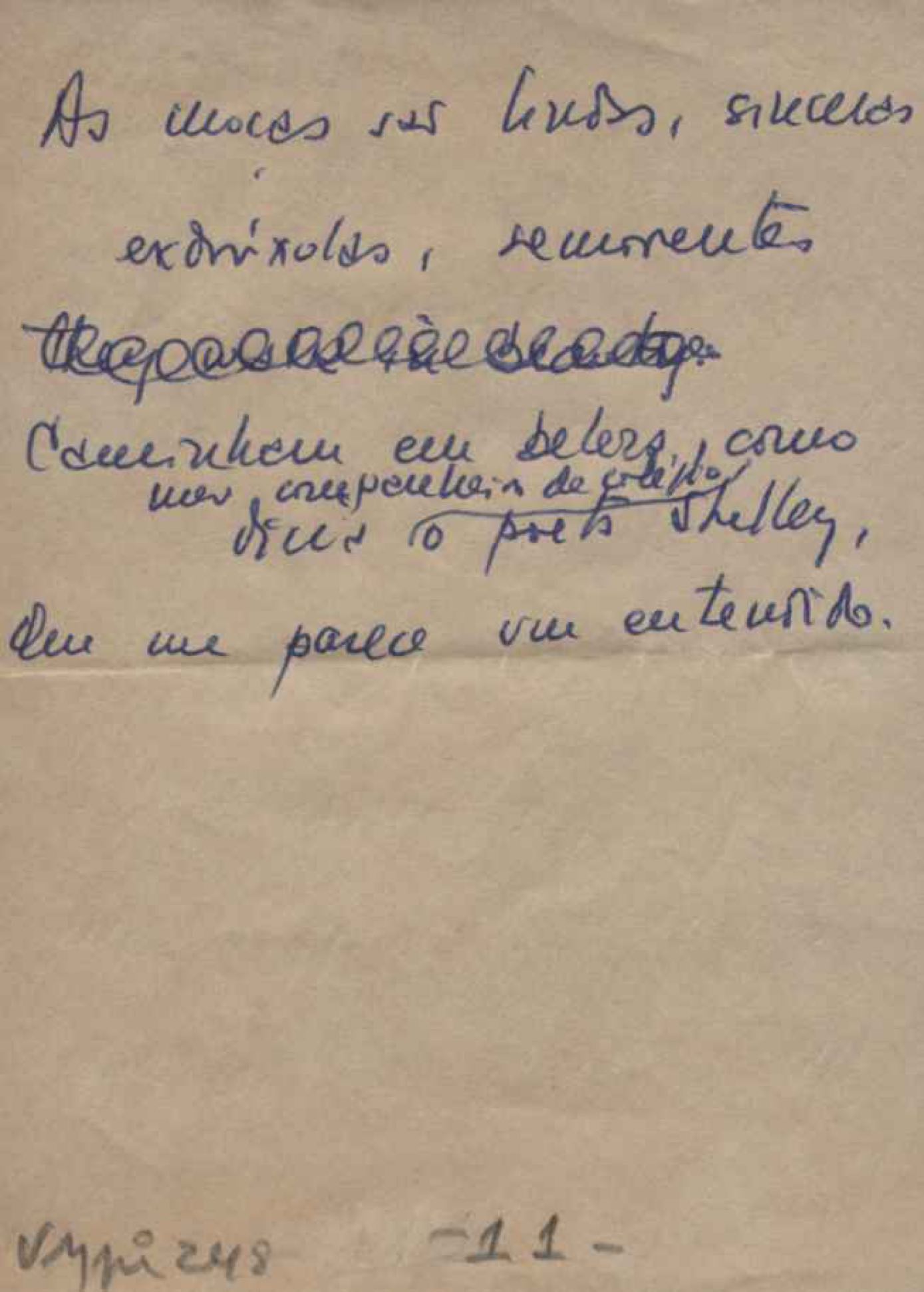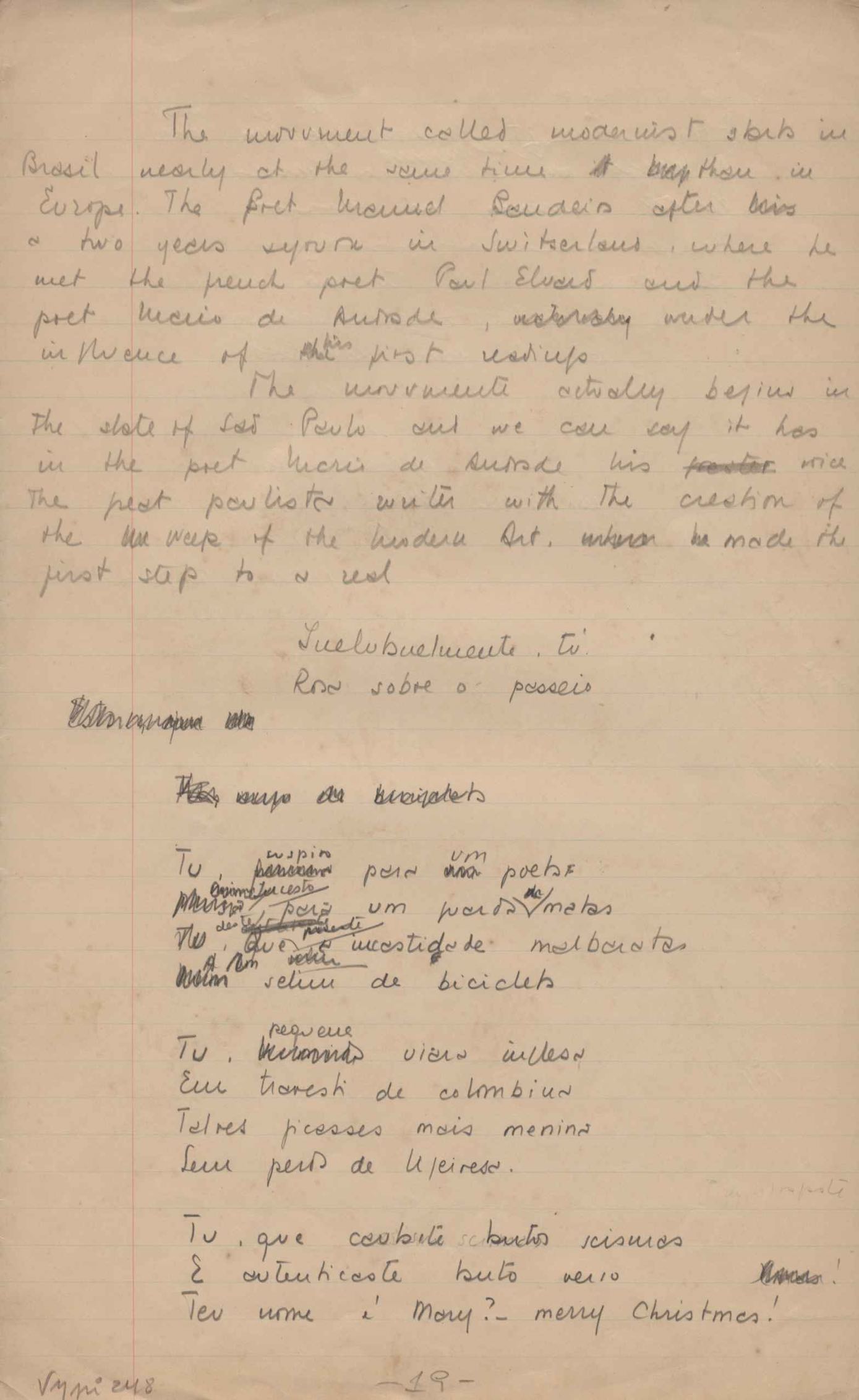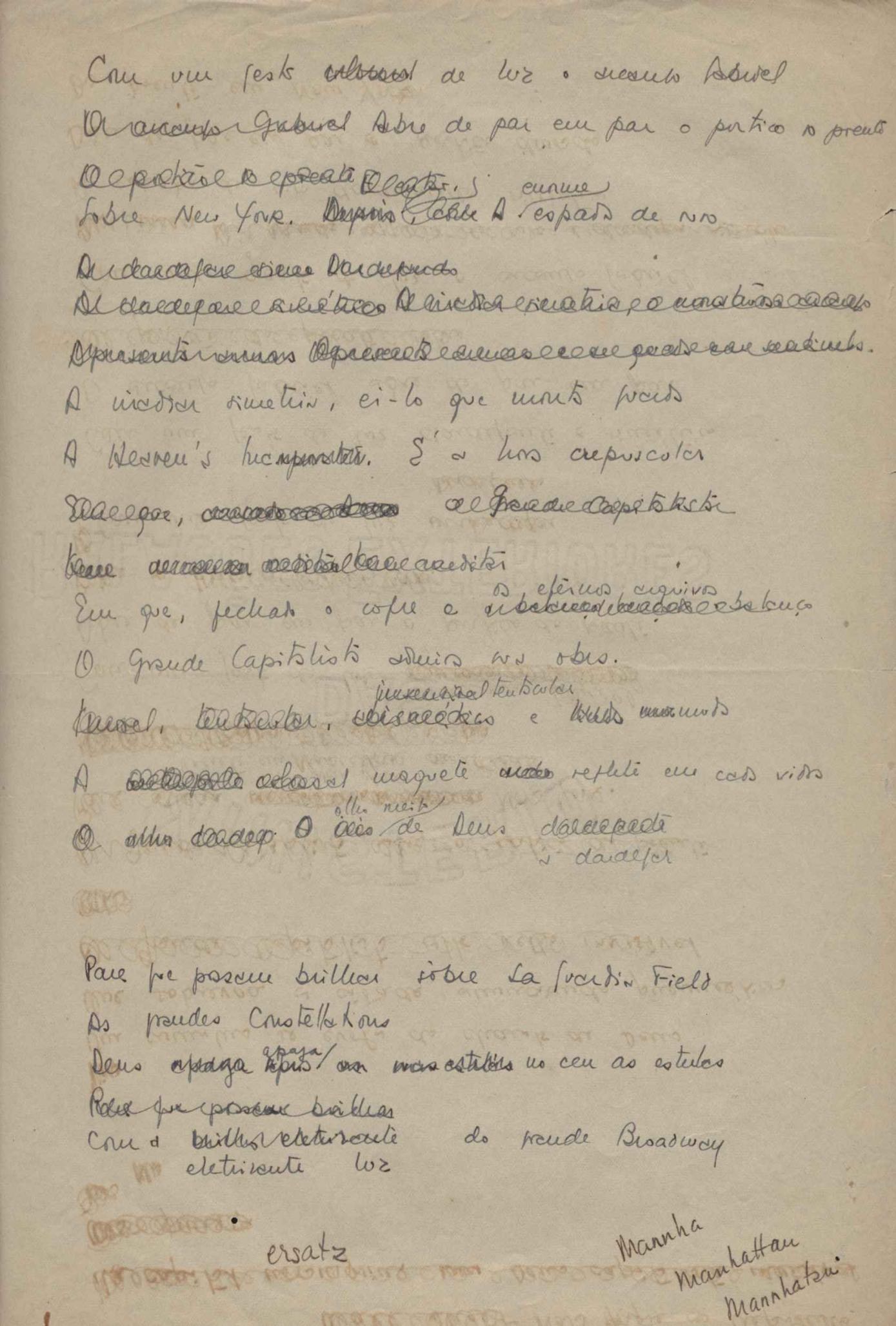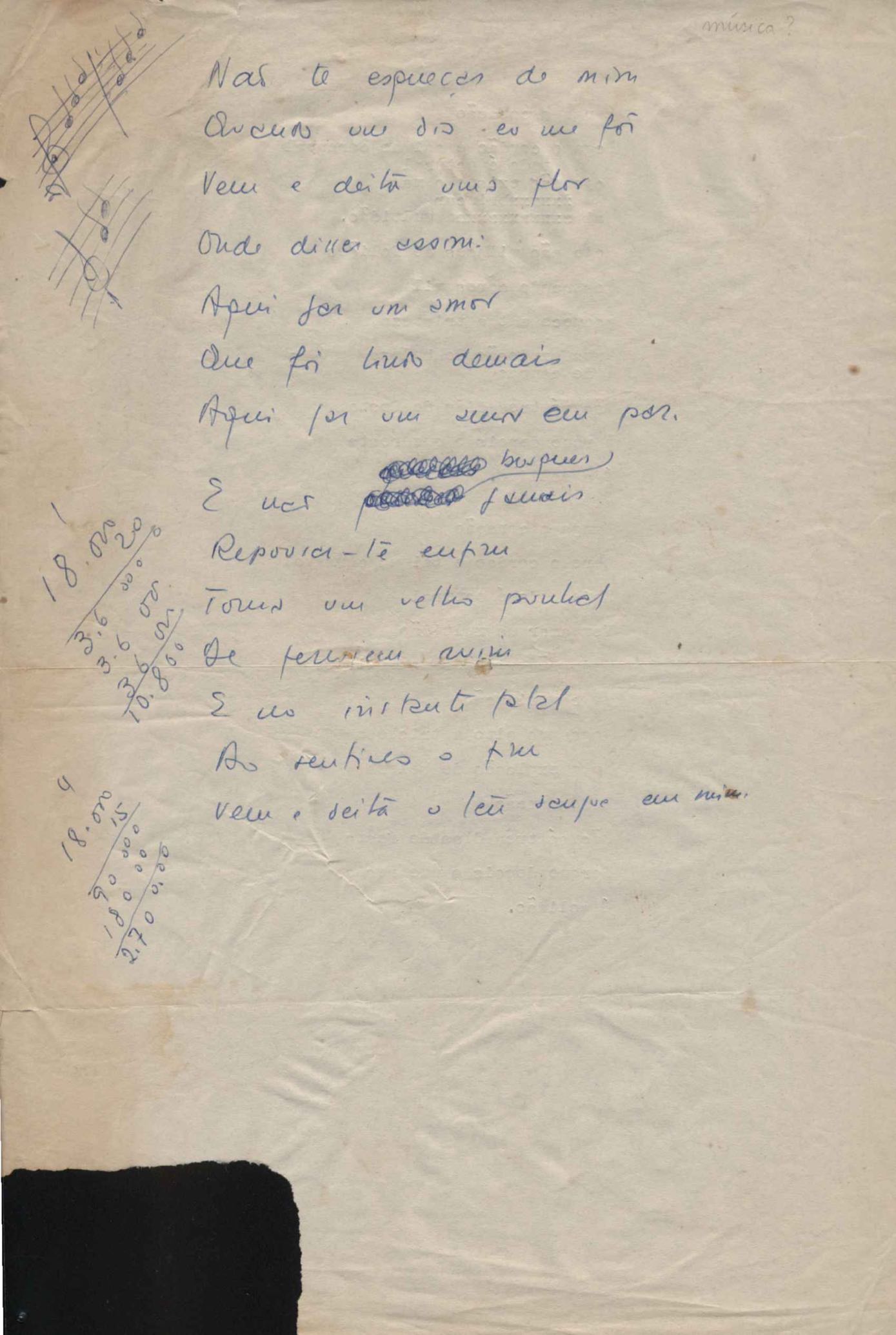 Dossiê dividido em nove partes. Outras observações: 1. Alguns poemas estão incompletos; 2. No verso de "O cântico das águas" encontra-se "A legenda do príncipe poeta" e no de "Verdade", "Plagiando o poeta..."; 3. Há dois poemas com o título de "Elegia de Paris", de "Legenda", de "Madrigal" e de "Trovas"; 4. "Cantiga XI" está publicada na Obra poética com o título de "Duas canções de silêncio II"; 5. Na mesma folha que "Pressentimento" encontram-se "Legenda" e "O bilhar", na mesma de "Romance da morena" temos "Não te dou perdão", e na de "Canto", "Última primavera", na de "Poema feito para chegar aos ouvidos de S. Teresa", outra versão de "Fala íntima"; 6. "O soneto a quatro mãos" foi escrito por VM e Paulo Mendes Campos e "Os acadêmicos... das 5 horas", por VM e Moacir Veloso de Oliveira; 7. Há dois poemas com o título de "A miragem"; 8. Destes poemas, 401 são esboços e não possuem título.