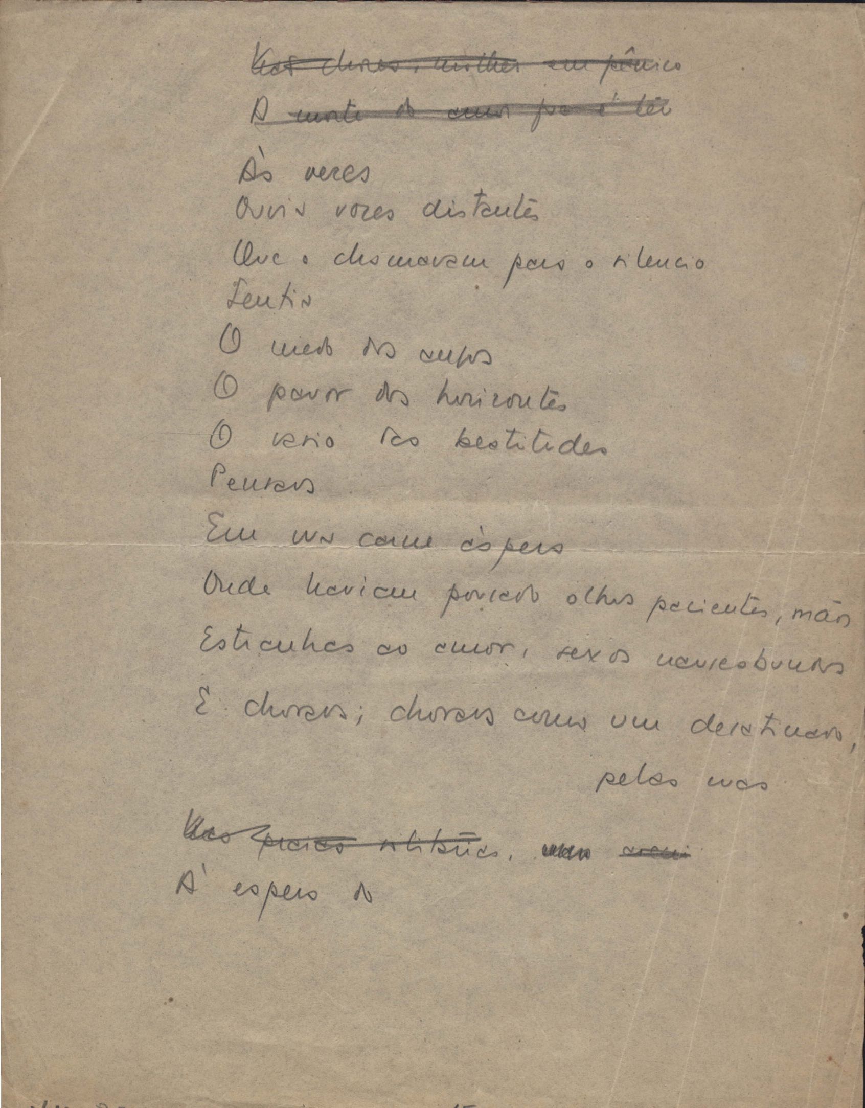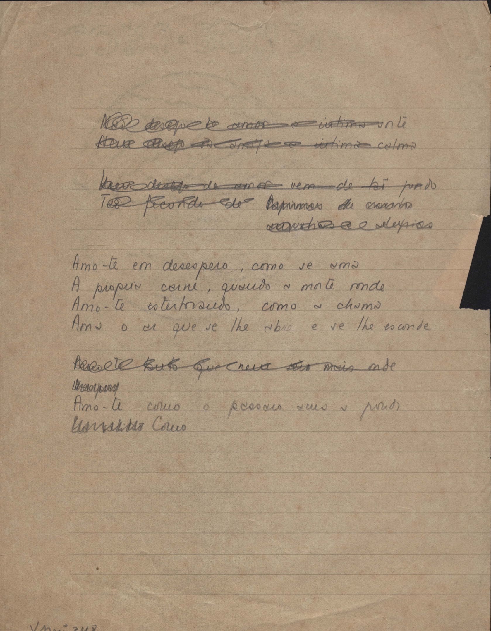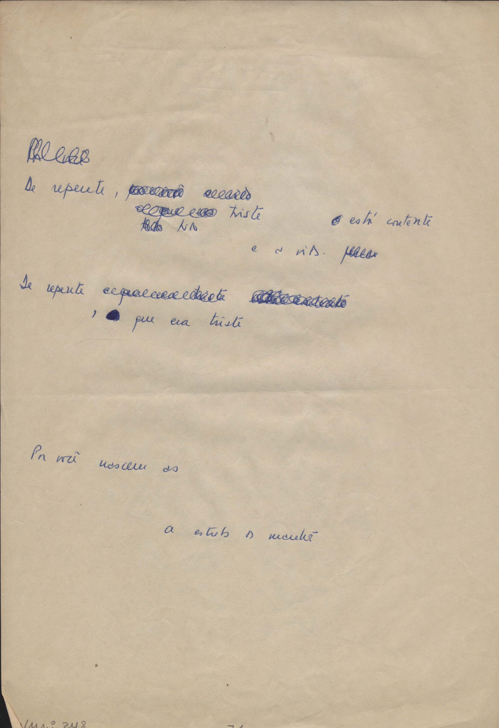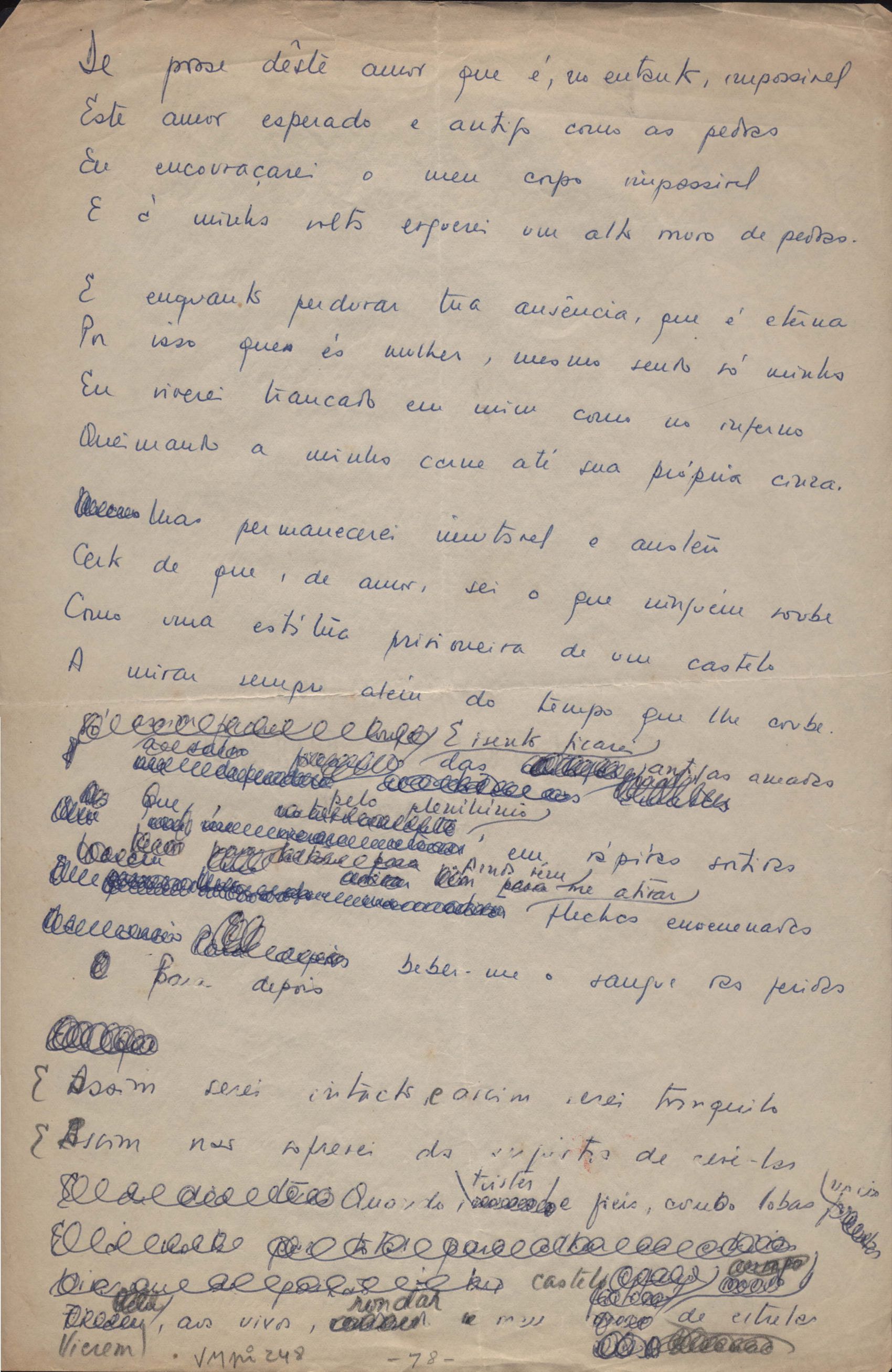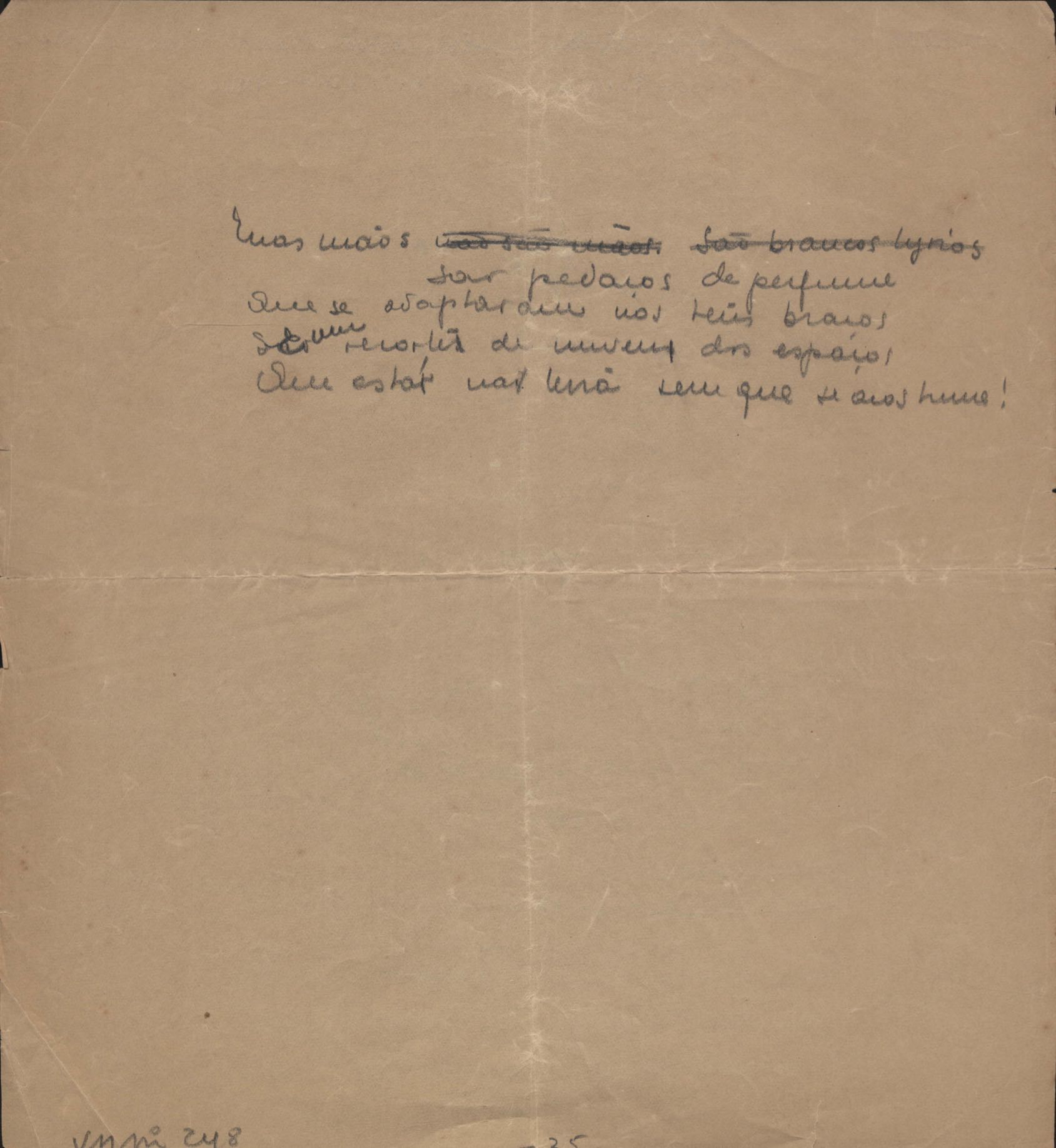 Dossiê dividido em nove partes. Outras observações: 1. Alguns poemas estão incompletos; 2. No verso de "O cântico das águas" encontra-se "A legenda do príncipe poeta" e no de "Verdade", "Plagiando o poeta..."; 3. Há dois poemas com o título de "Elegia de Paris", de "Legenda", de "Madrigal" e de "Trovas"; 4. "Cantiga XI" está publicada na Obra poética com o título de "Duas canções de silêncio II"; 5. Na mesma folha que "Pressentimento" encontram-se "Legenda" e "O bilhar", na mesma de "Romance da morena" temos "Não te dou perdão", e na de "Canto", "Última primavera", na de "Poema feito para chegar aos ouvidos de S. Teresa", outra versão de "Fala íntima"; 6. "O soneto a quatro mãos" foi escrito por VM e Paulo Mendes Campos e "Os acadêmicos... das 5 horas", por VM e Moacir Veloso de Oliveira; 7. Há dois poemas com o título de "A miragem"; 8. Destes poemas, 401 são esboços e não possuem título.