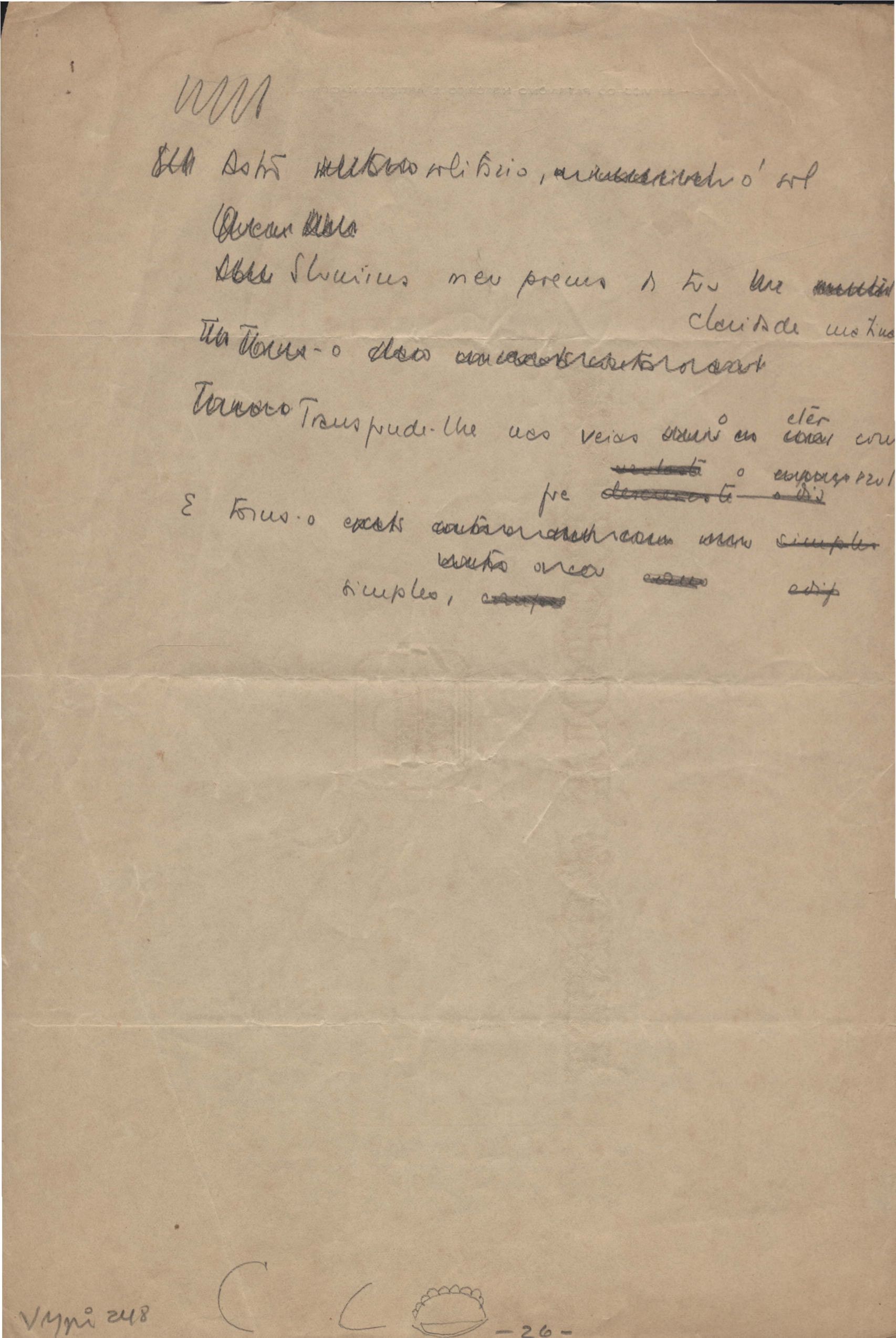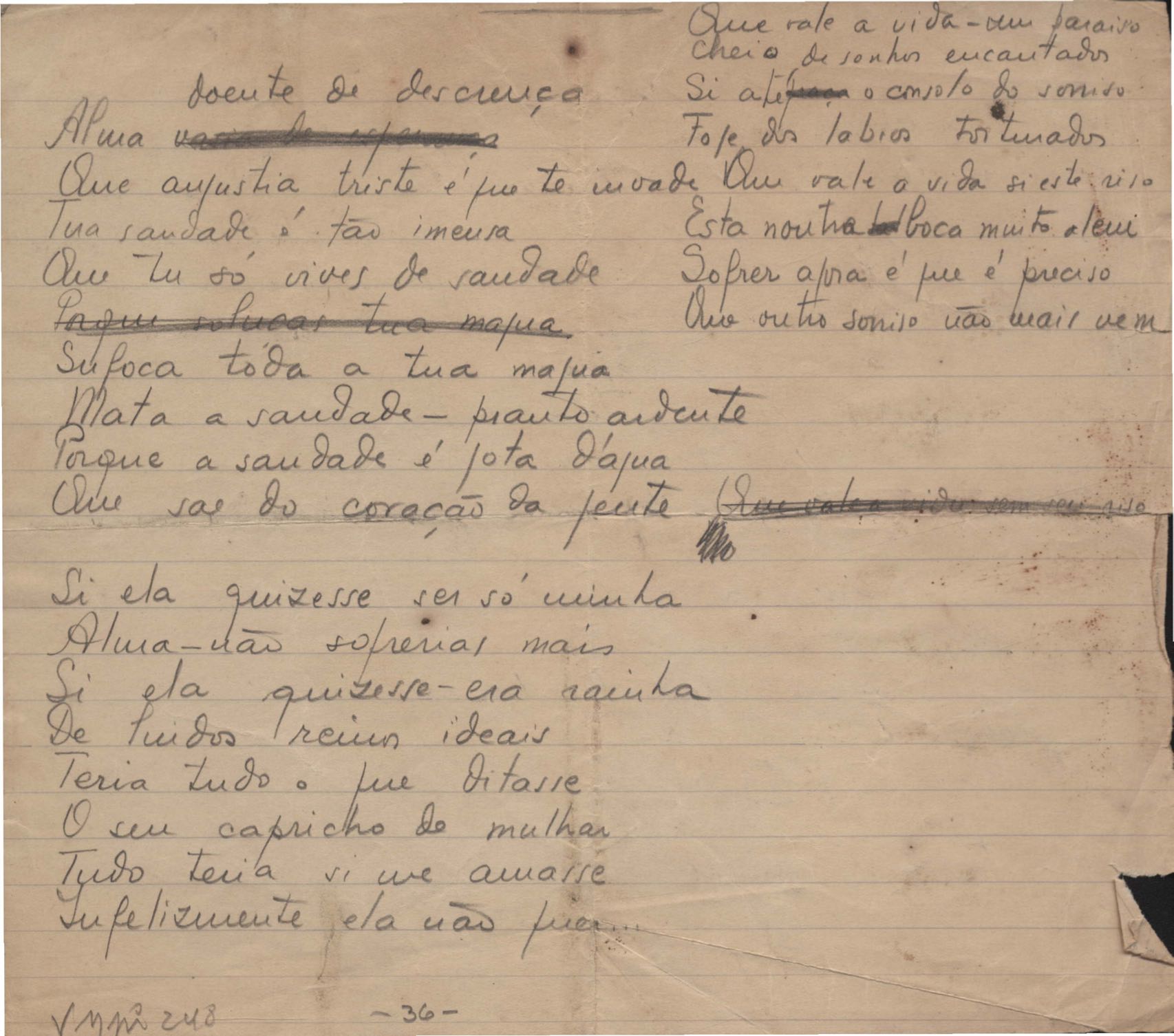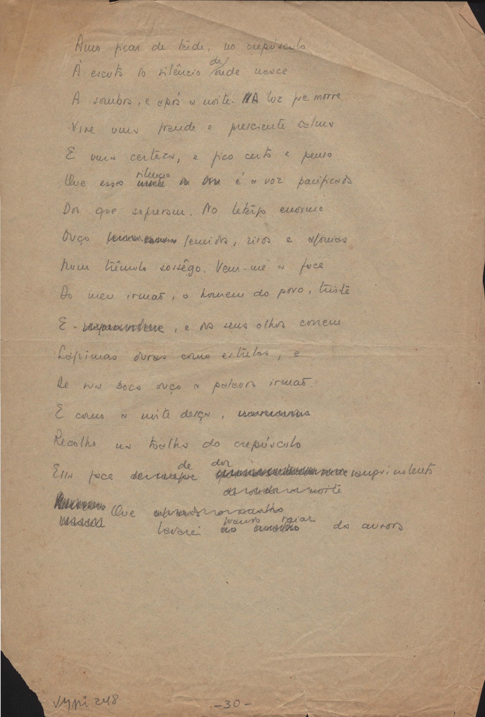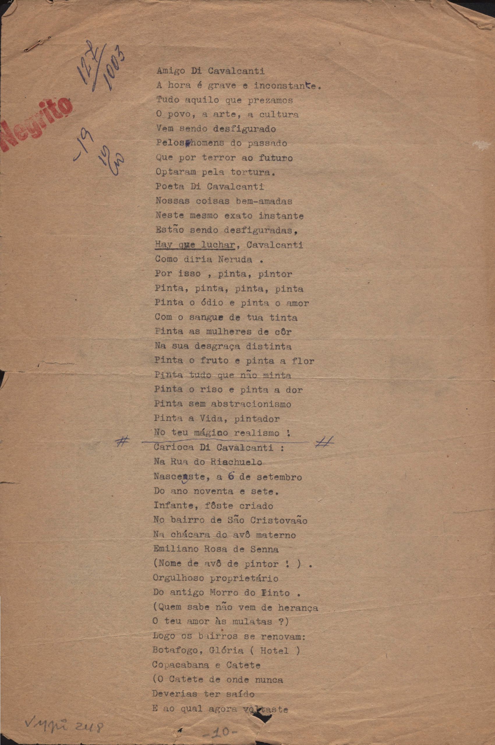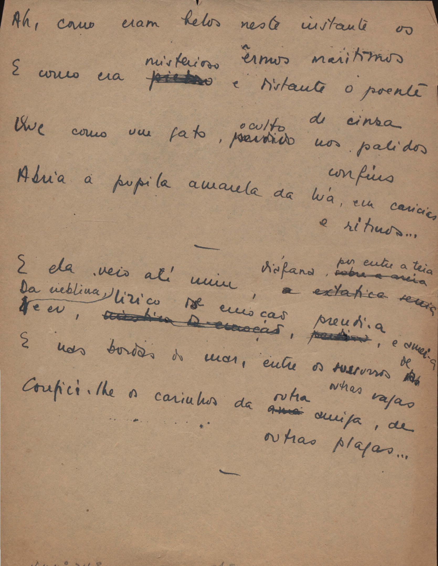 Dossiê dividido em nove partes. Outras observações: 1. Alguns poemas estão incompletos; 2. No verso de "O cântico das águas" encontra-se "A legenda do príncipe poeta" e no de "Verdade", "Plagiando o poeta..."; 3. Há dois poemas com o título de "Elegia de Paris", de "Legenda", de "Madrigal" e de "Trovas"; 4. "Cantiga XI" está publicada na Obra poética com o título de "Duas canções de silêncio II"; 5. Na mesma folha que "Pressentimento" encontram-se "Legenda" e "O bilhar", na mesma de "Romance da morena" temos "Não te dou perdão", e na de "Canto", "Última primavera", na de "Poema feito para chegar aos ouvidos de S. Teresa", outra versão de "Fala íntima"; 6. "O soneto a quatro mãos" foi escrito por VM e Paulo Mendes Campos e "Os acadêmicos... das 5 horas", por VM e Moacir Veloso de Oliveira; 7. Há dois poemas com o título de "A miragem"; 8. Destes poemas, 401 são esboços e não possuem título.