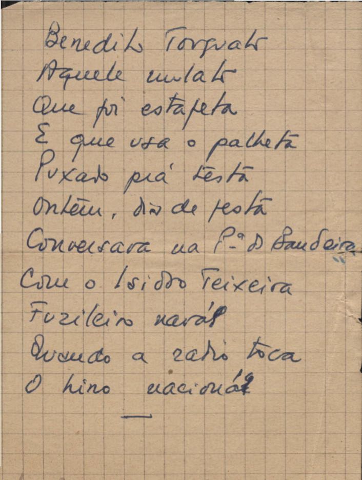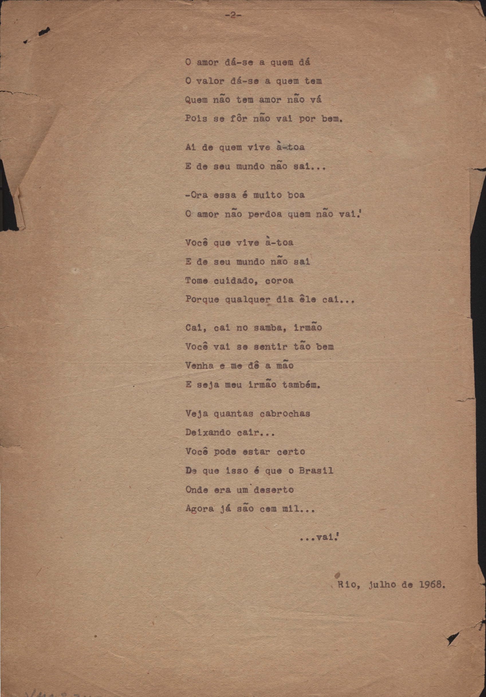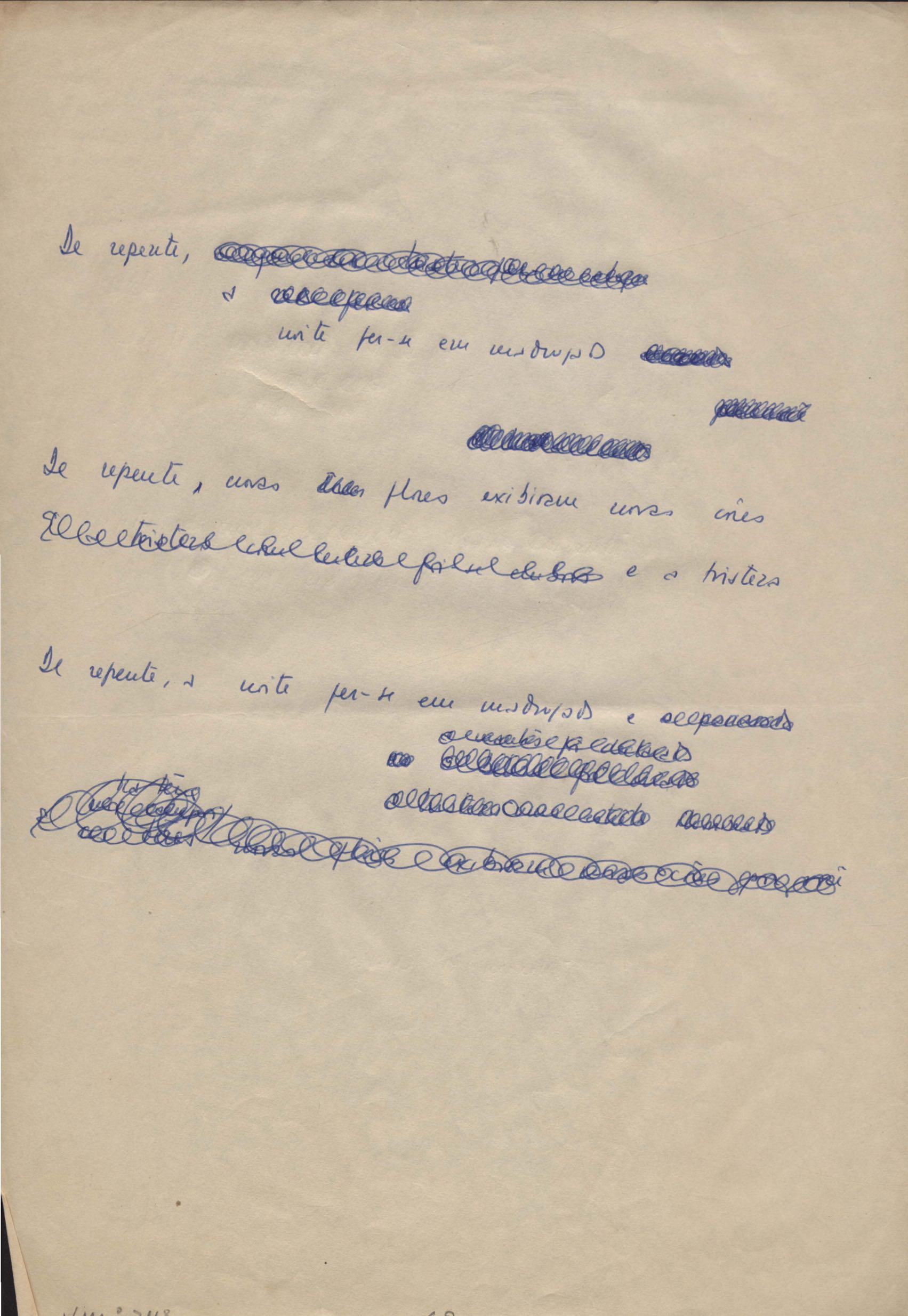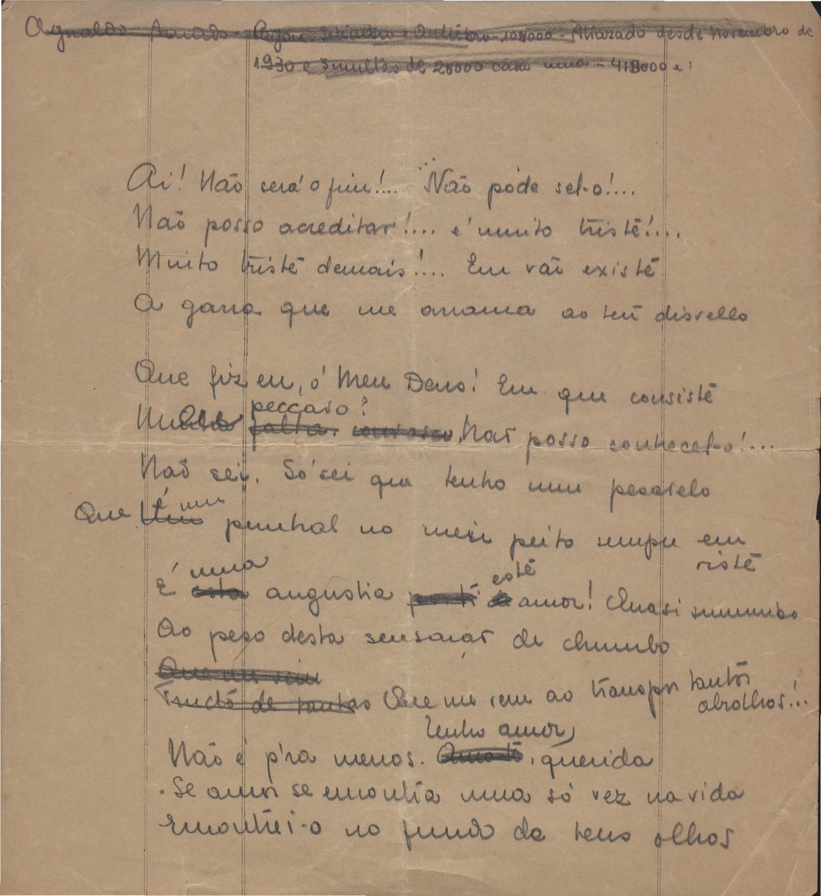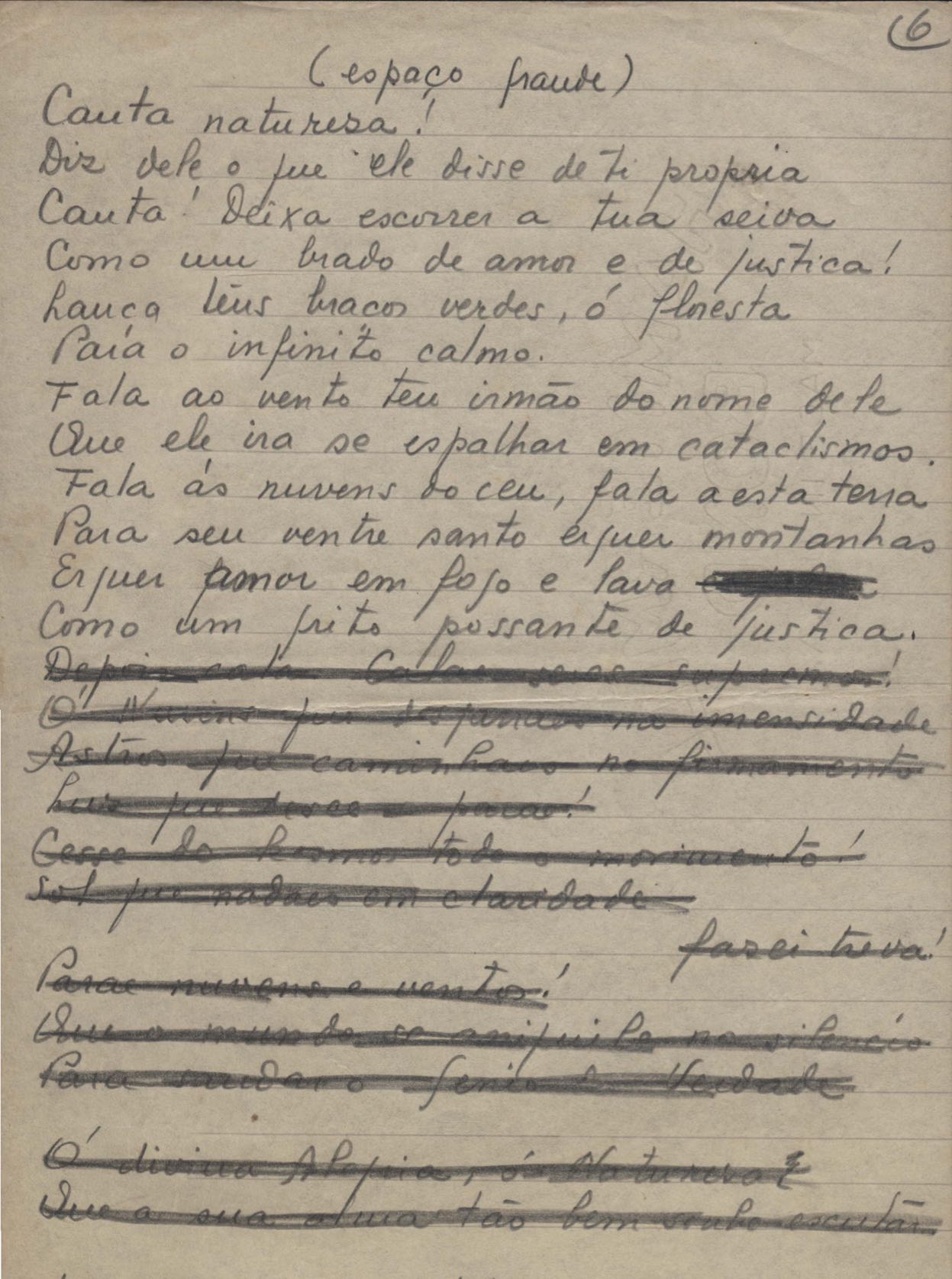 Dossiê dividido em nove partes. Outras observações: 1. Alguns poemas estão incompletos; 2. No verso de "O cântico das águas" encontra-se "A legenda do príncipe poeta" e no de "Verdade", "Plagiando o poeta..."; 3. Há dois poemas com o título de "Elegia de Paris", de "Legenda", de "Madrigal" e de "Trovas"; 4. "Cantiga XI" está publicada na Obra poética com o título de "Duas canções de silêncio II"; 5. Na mesma folha que "Pressentimento" encontram-se "Legenda" e "O bilhar", na mesma de "Romance da morena" temos "Não te dou perdão", e na de "Canto", "Última primavera", na de "Poema feito para chegar aos ouvidos de S. Teresa", outra versão de "Fala íntima"; 6. "O soneto a quatro mãos" foi escrito por VM e Paulo Mendes Campos e "Os acadêmicos... das 5 horas", por VM e Moacir Veloso de Oliveira; 7. Há dois poemas com o título de "A miragem"; 8. Destes poemas, 401 são esboços e não possuem título.