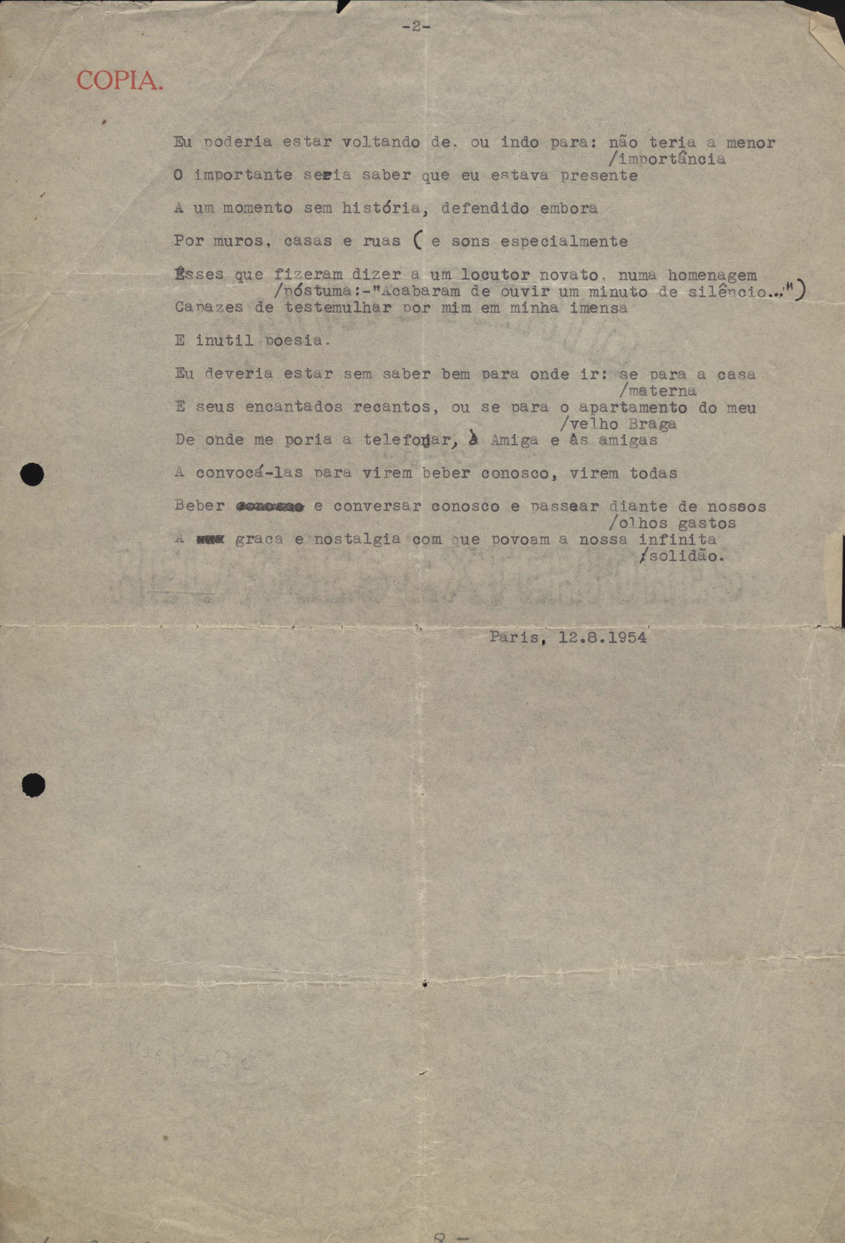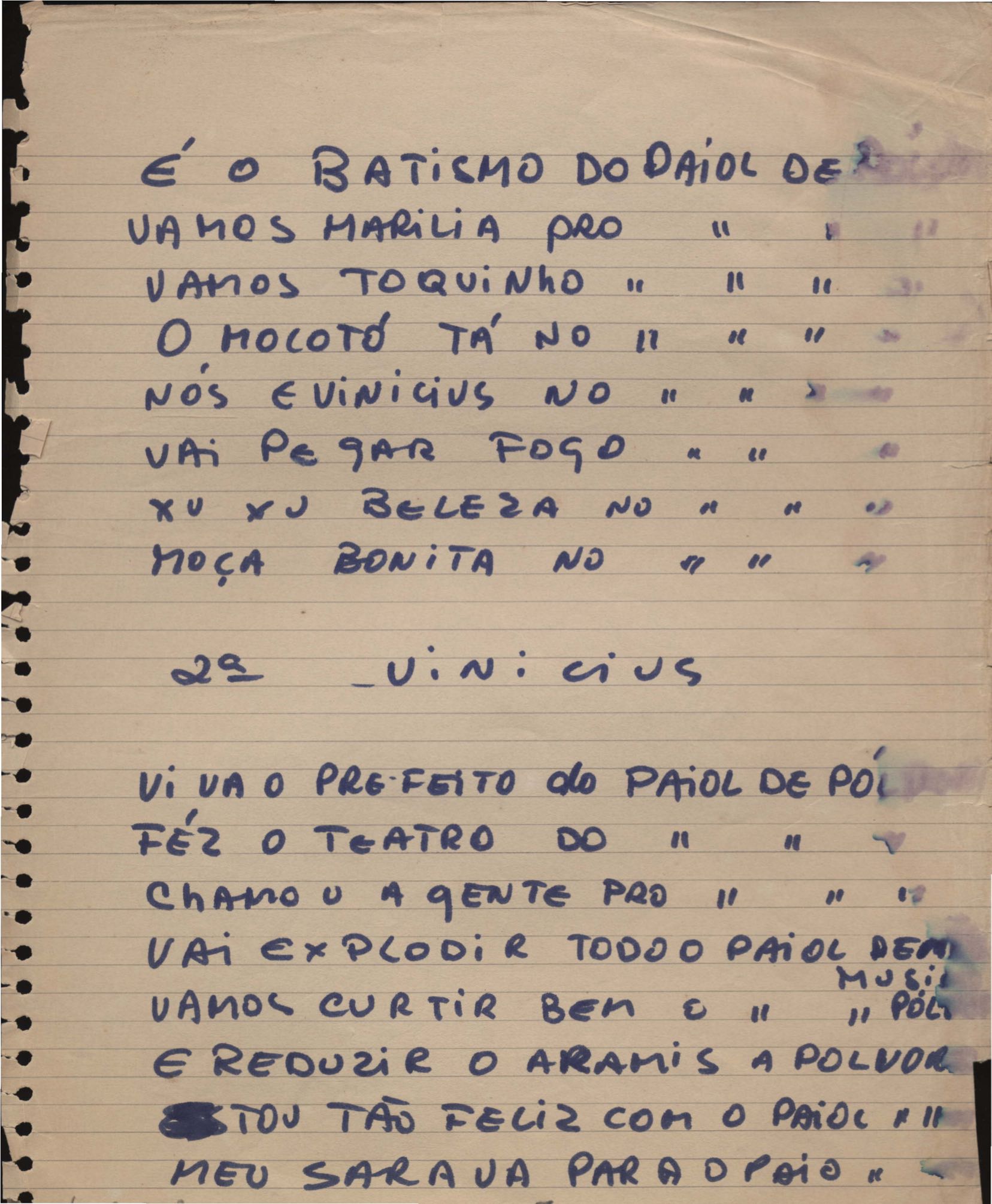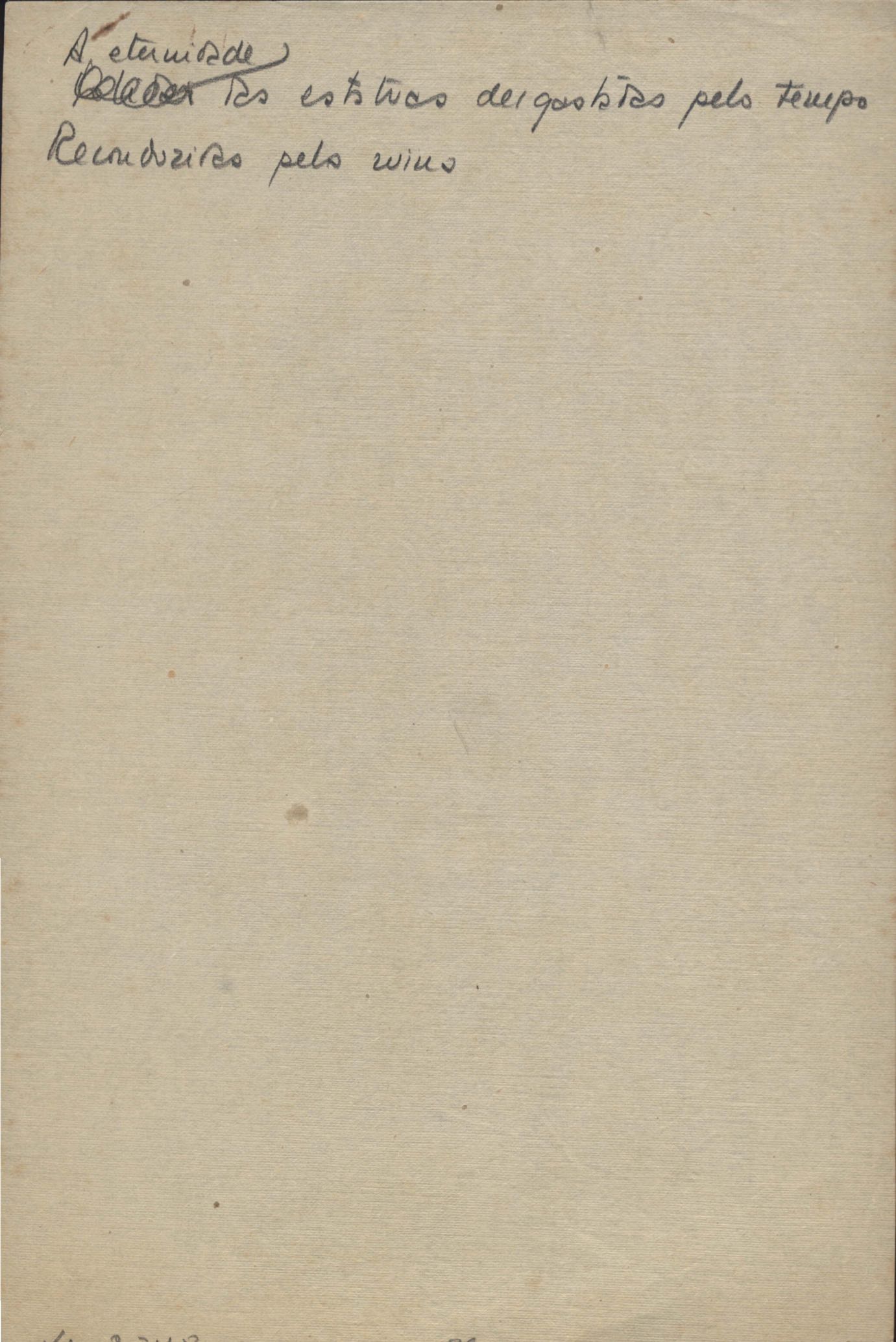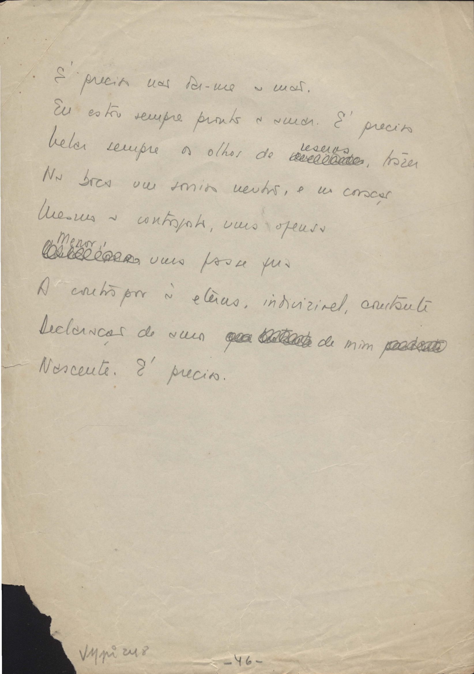 Dossiê dividido em nove partes. Outras observações: 1. Alguns poemas estão incompletos; 2. No verso de "O cântico das águas" encontra-se "A legenda do príncipe poeta" e no de "Verdade", "Plagiando o poeta..."; 3. Há dois poemas com o título de "Elegia de Paris", de "Legenda", de "Madrigal" e de "Trovas"; 4. "Cantiga XI" está publicada na Obra poética com o título de "Duas canções de silêncio II"; 5. Na mesma folha que "Pressentimento" encontram-se "Legenda" e "O bilhar", na mesma de "Romance da morena" temos "Não te dou perdão", e na de "Canto", "Última primavera", na de "Poema feito para chegar aos ouvidos de S. Teresa", outra versão de "Fala íntima"; 6. "O soneto a quatro mãos" foi escrito por VM e Paulo Mendes Campos e "Os acadêmicos... das 5 horas", por VM e Moacir Veloso de Oliveira; 7. Há dois poemas com o título de "A miragem"; 8. Destes poemas, 401 são esboços e não possuem título.