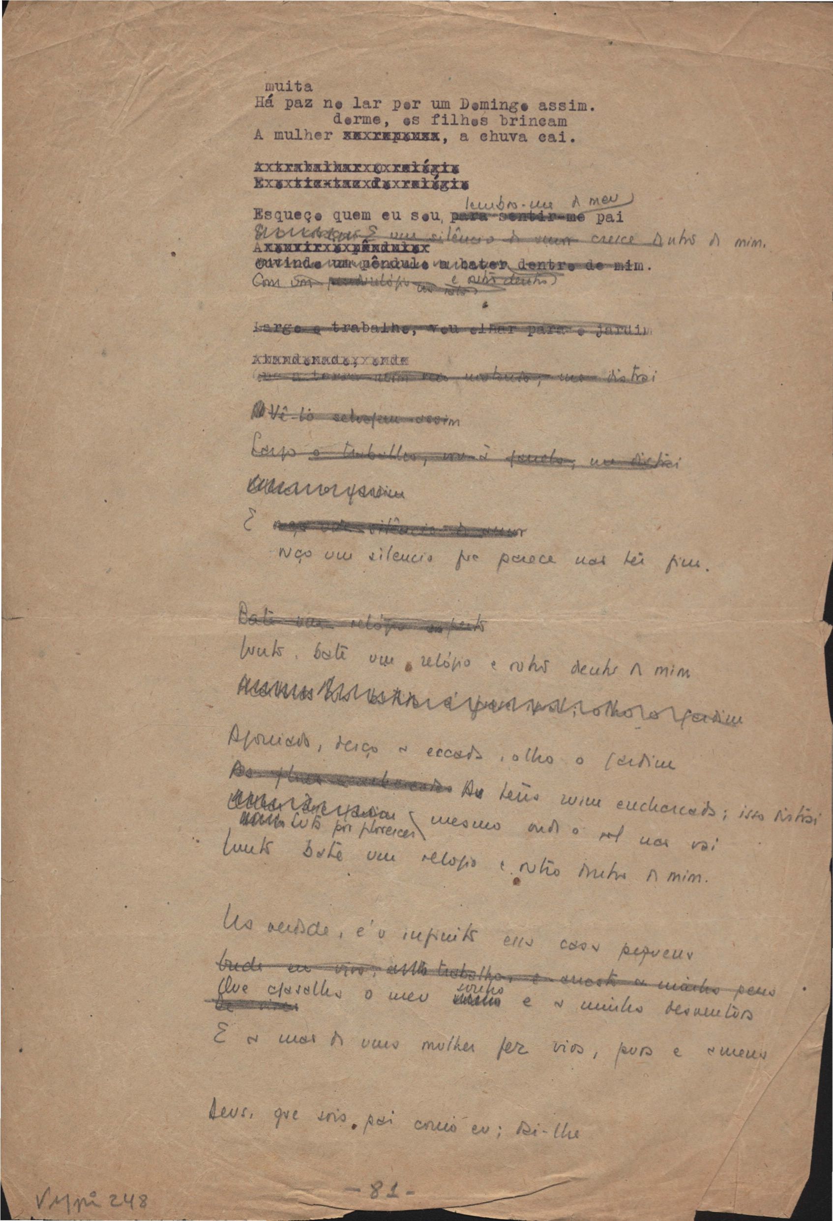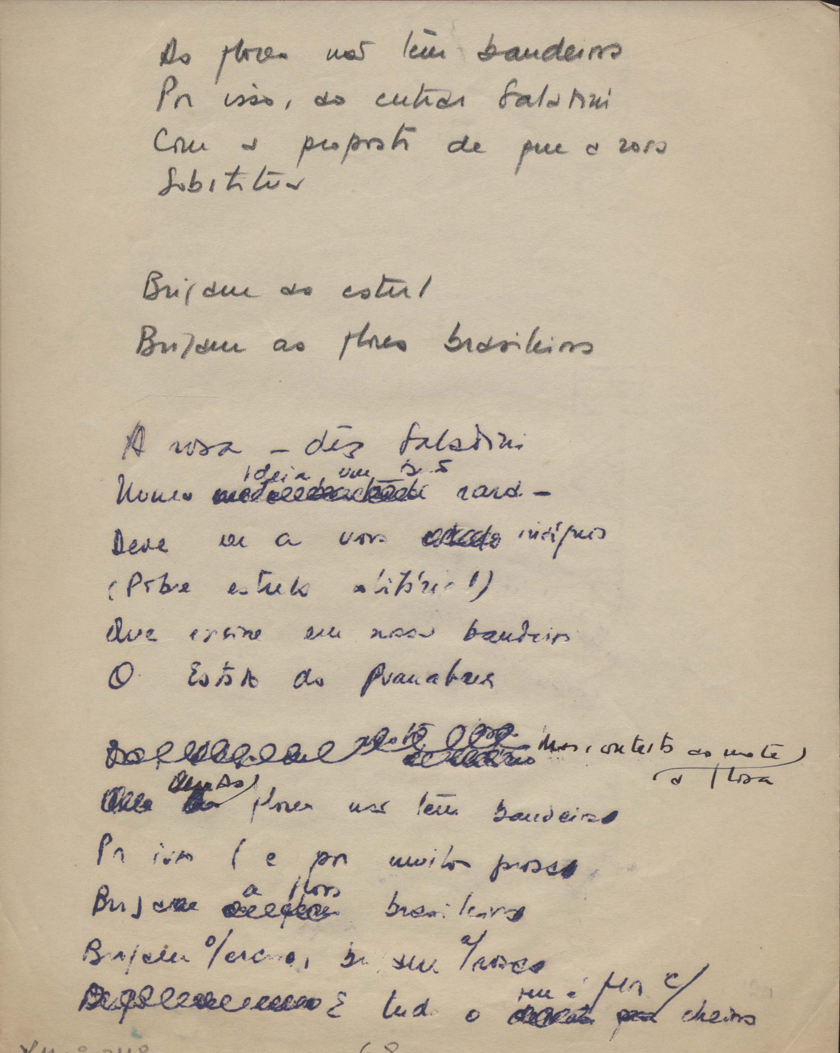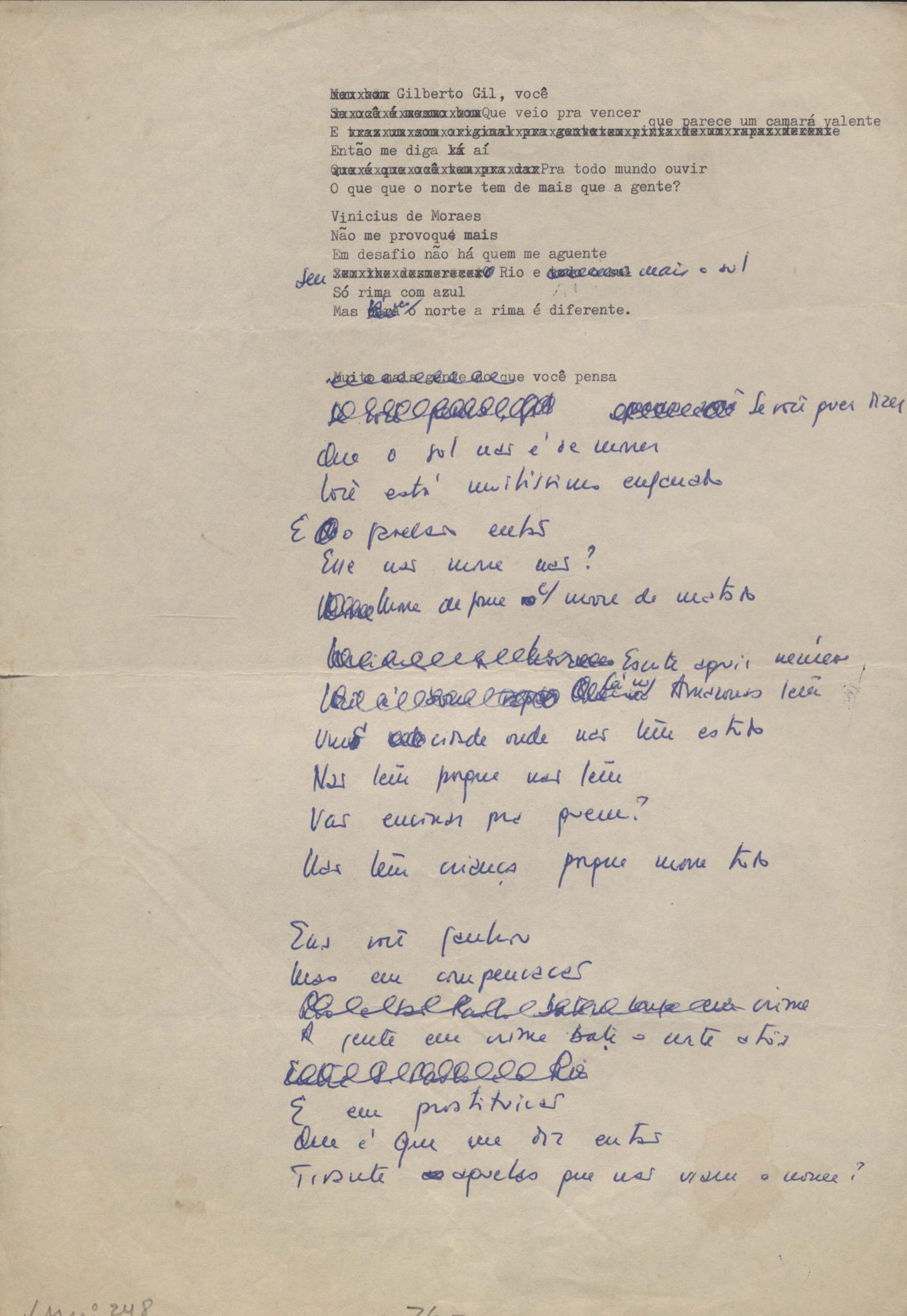 Dossiê dividido em nove partes. Outras observações: 1. Alguns poemas estão incompletos; 2. No verso de "O cântico das águas" encontra-se "A legenda do príncipe poeta" e no de "Verdade", "Plagiando o poeta..."; 3. Há dois poemas com o título de "Elegia de Paris", de "Legenda", de "Madrigal" e de "Trovas"; 4. "Cantiga XI" está publicada na Obra poética com o título de "Duas canções de silêncio II"; 5. Na mesma folha que "Pressentimento" encontram-se "Legenda" e "O bilhar", na mesma de "Romance da morena" temos "Não te dou perdão", e na de "Canto", "Última primavera", na de "Poema feito para chegar aos ouvidos de S. Teresa", outra versão de "Fala íntima"; 6. "O soneto a quatro mãos" foi escrito por VM e Paulo Mendes Campos e "Os acadêmicos... das 5 horas", por VM e Moacir Veloso de Oliveira; 7. Há dois poemas com o título de "A miragem"; 8. Destes poemas, 401 são esboços e não possuem título.