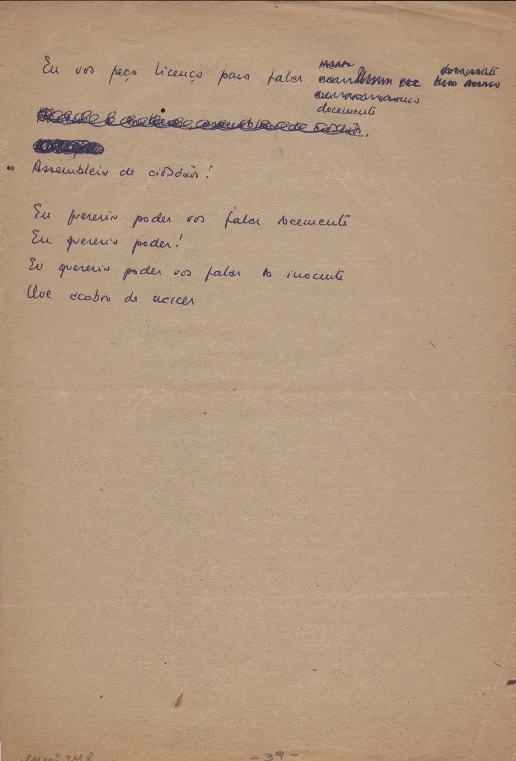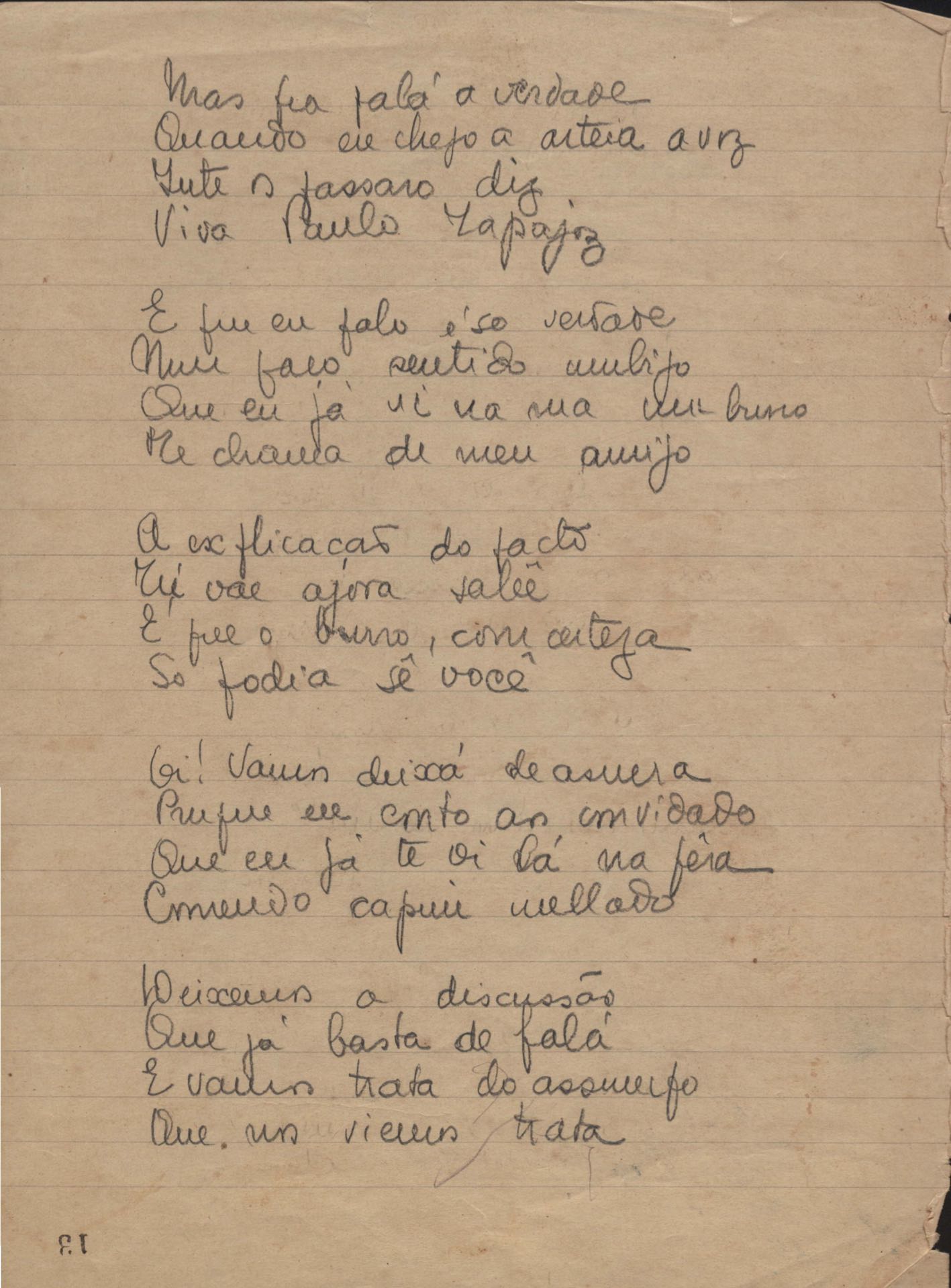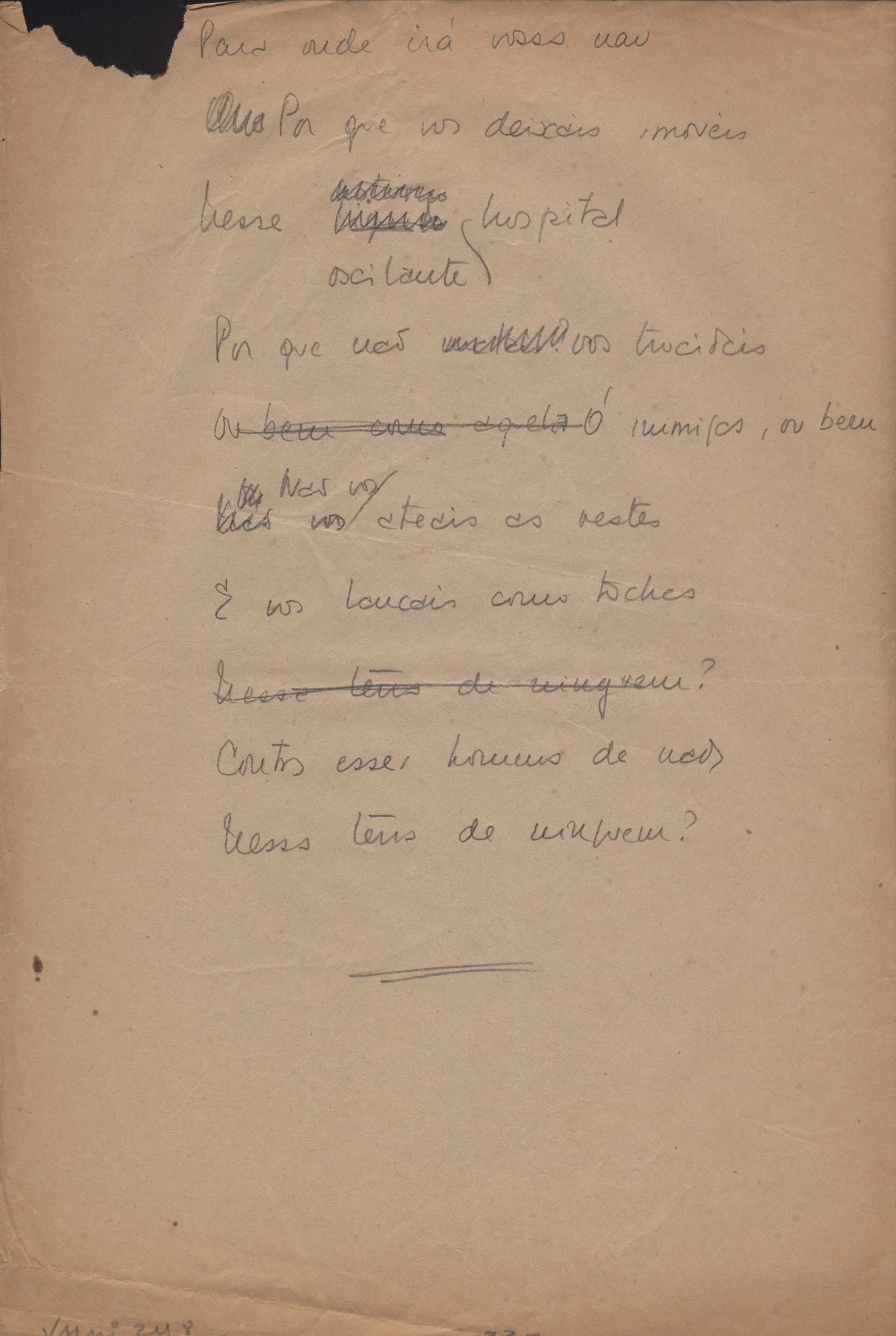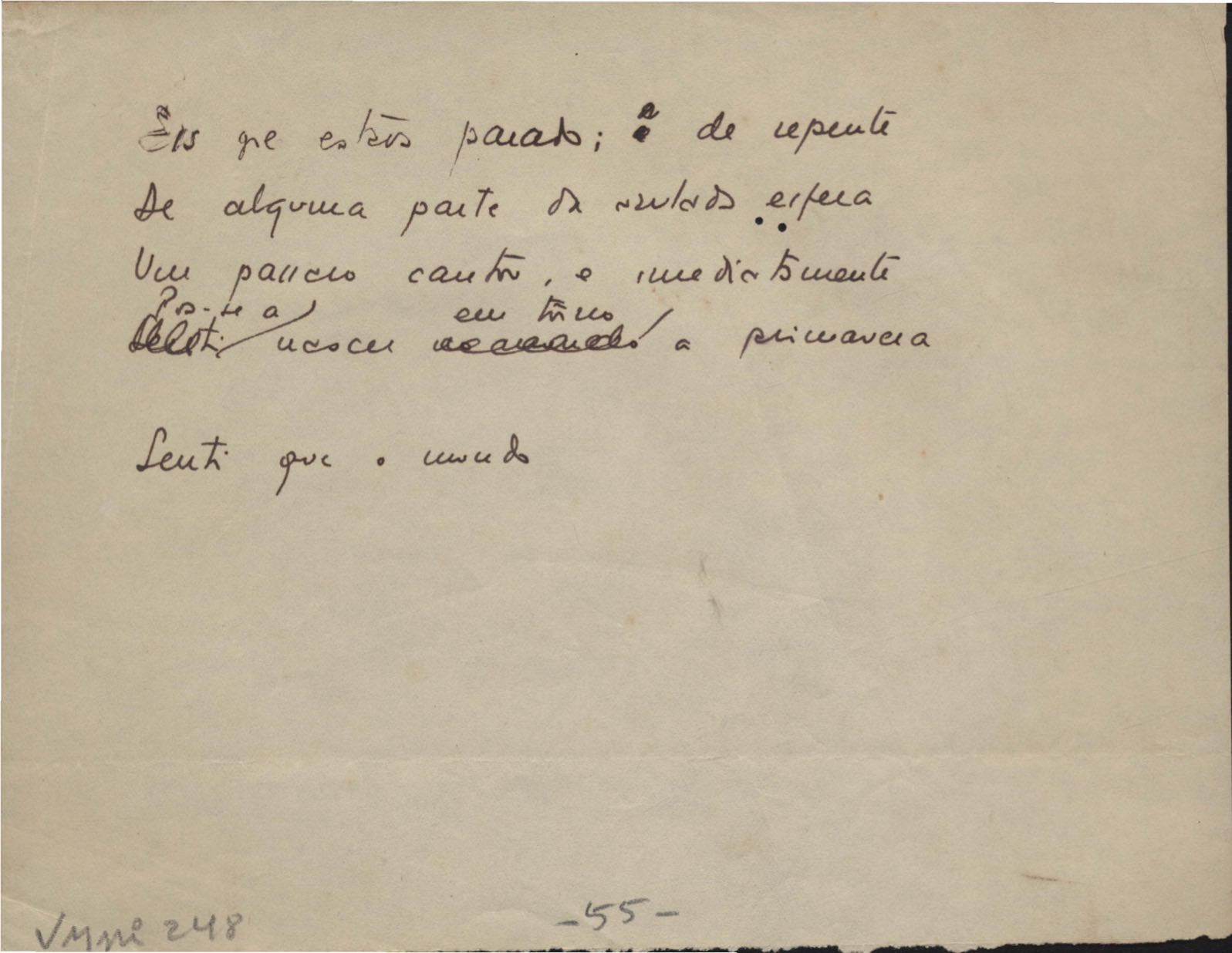 Dossiê dividido em nove partes. Outras observações: 1. Alguns poemas estão incompletos; 2. No verso de "O cântico das águas" encontra-se "A legenda do príncipe poeta" e no de "Verdade", "Plagiando o poeta..."; 3. Há dois poemas com o título de "Elegia de Paris", de "Legenda", de "Madrigal" e de "Trovas"; 4. "Cantiga XI" está publicada na Obra poética com o título de "Duas canções de silêncio II"; 5. Na mesma folha que "Pressentimento" encontram-se "Legenda" e "O bilhar", na mesma de "Romance da morena" temos "Não te dou perdão", e na de "Canto", "Última primavera", na de "Poema feito para chegar aos ouvidos de S. Teresa", outra versão de "Fala íntima"; 6. "O soneto a quatro mãos" foi escrito por VM e Paulo Mendes Campos e "Os acadêmicos... das 5 horas", por VM e Moacir Veloso de Oliveira; 7. Há dois poemas com o título de "A miragem"; 8. Destes poemas, 401 são esboços e não possuem título.