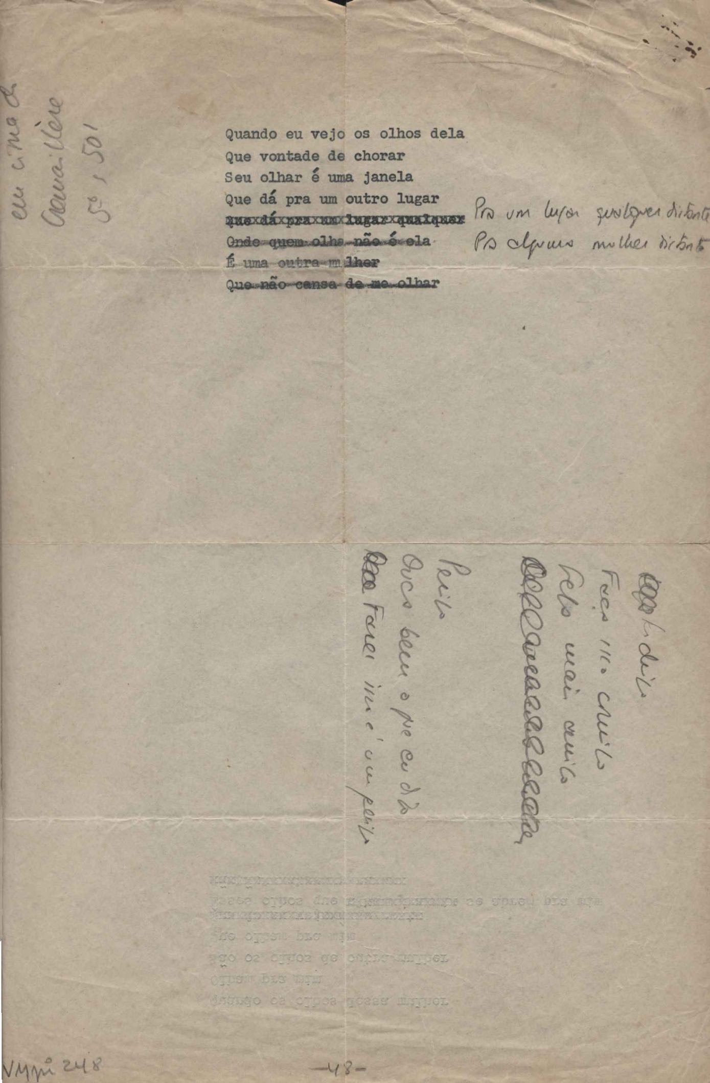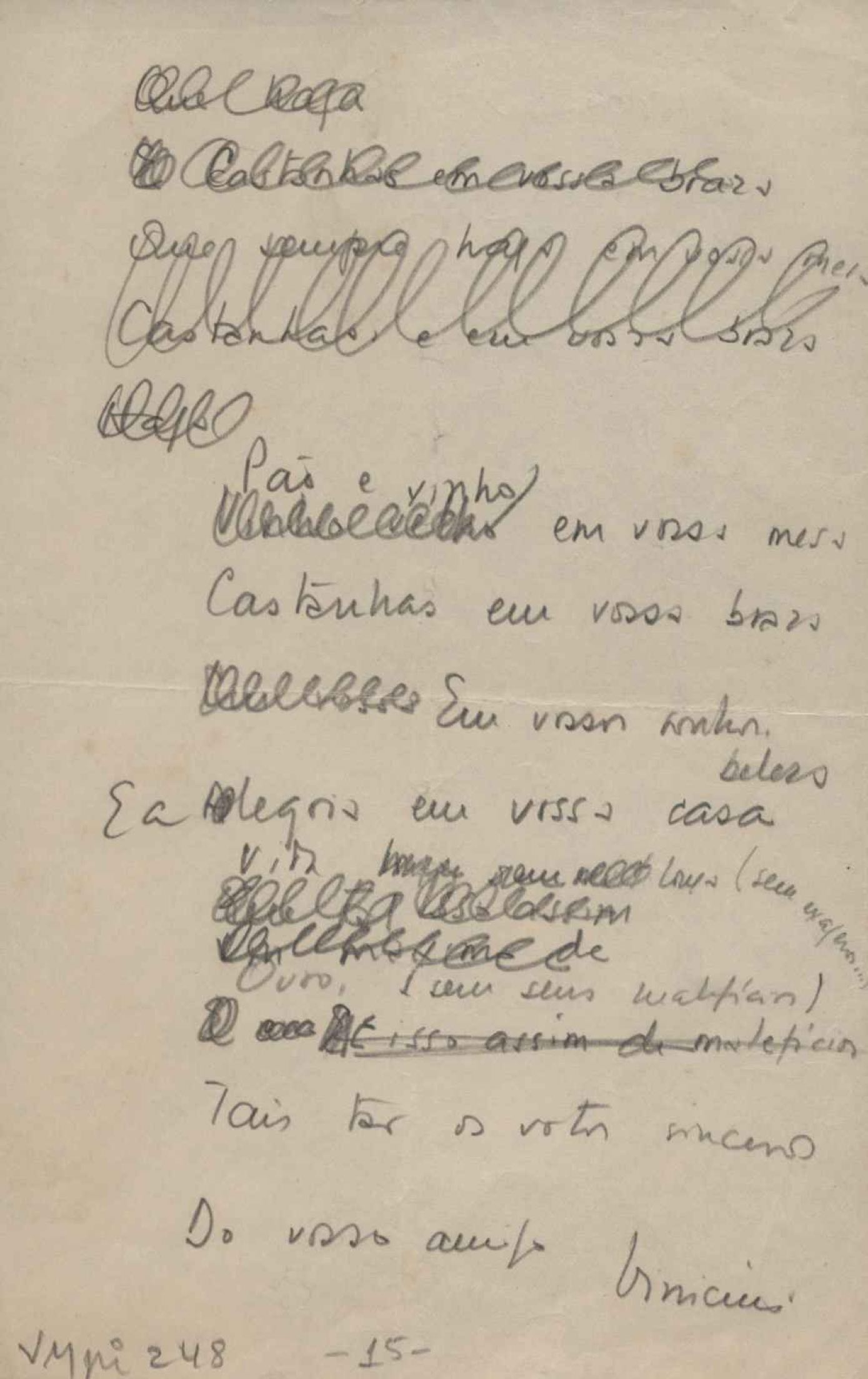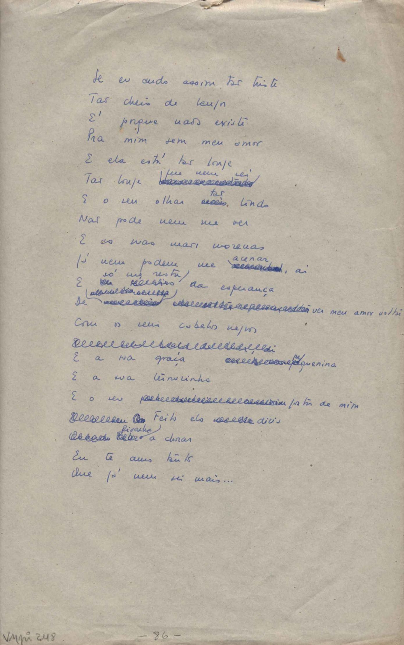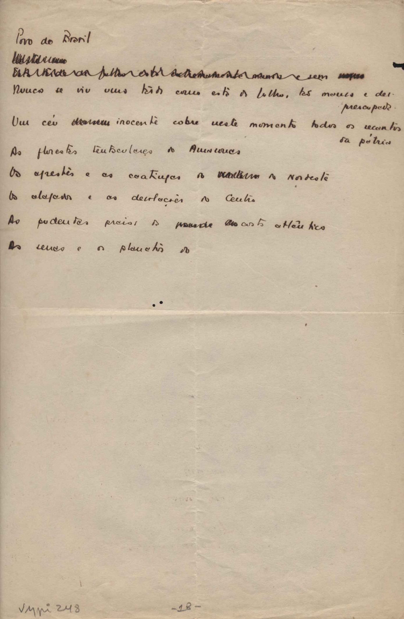 Dossiê dividido em nove partes. Outras observações: 1. Alguns poemas estão incompletos; 2. No verso de "O cântico das águas" encontra-se "A legenda do príncipe poeta" e no de "Verdade", "Plagiando o poeta..."; 3. Há dois poemas com o título de "Elegia de Paris", de "Legenda", de "Madrigal" e de "Trovas"; 4. "Cantiga XI" está publicada na Obra poética com o título de "Duas canções de silêncio II"; 5. Na mesma folha que "Pressentimento" encontram-se "Legenda" e "O bilhar", na mesma de "Romance da morena" temos "Não te dou perdão", e na de "Canto", "Última primavera", na de "Poema feito para chegar aos ouvidos de S. Teresa", outra versão de "Fala íntima"; 6. "O soneto a quatro mãos" foi escrito por VM e Paulo Mendes Campos e "Os acadêmicos... das 5 horas", por VM e Moacir Veloso de Oliveira; 7. Há dois poemas com o título de "A miragem"; 8. Destes poemas, 401 são esboços e não possuem título.
