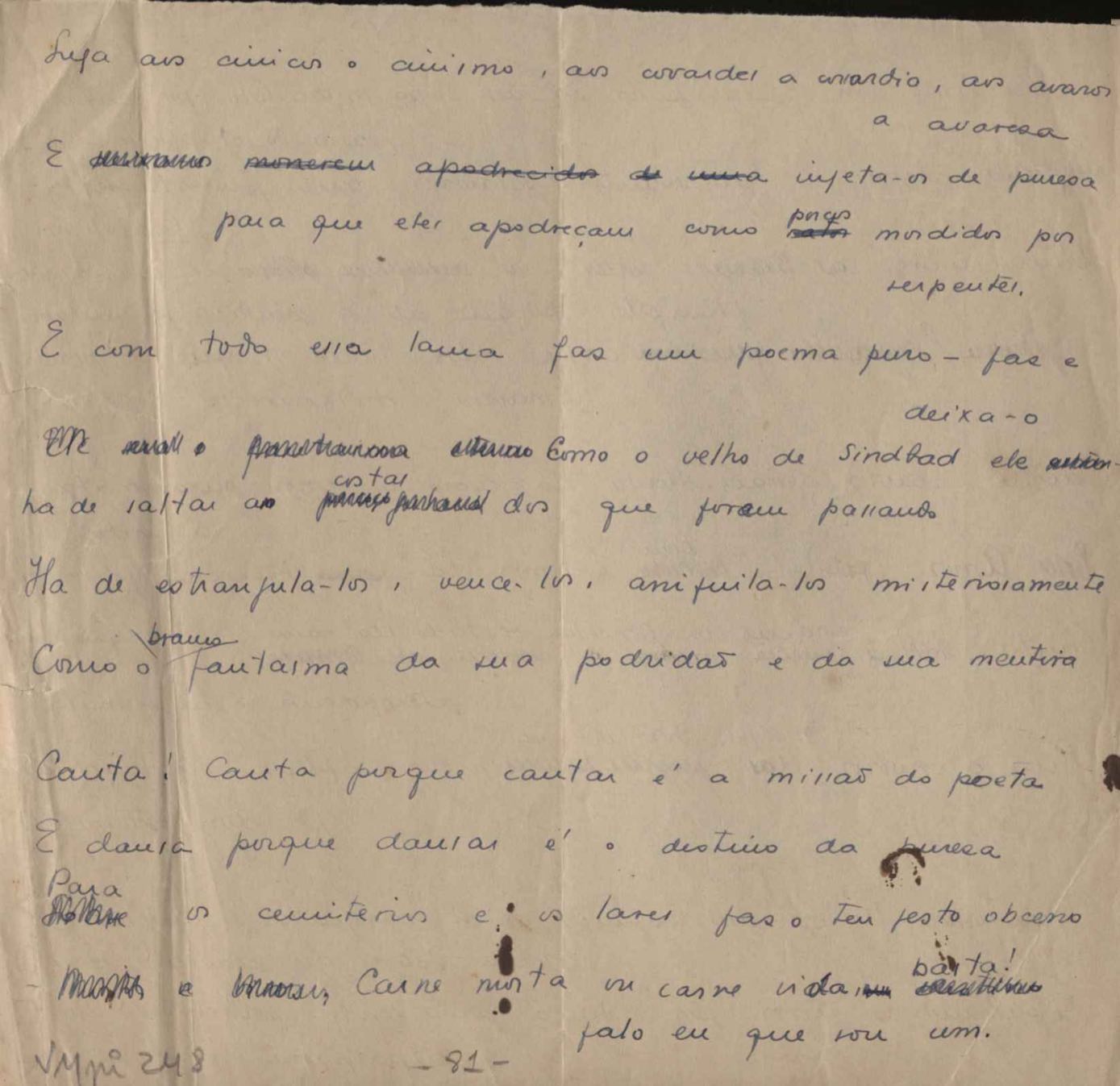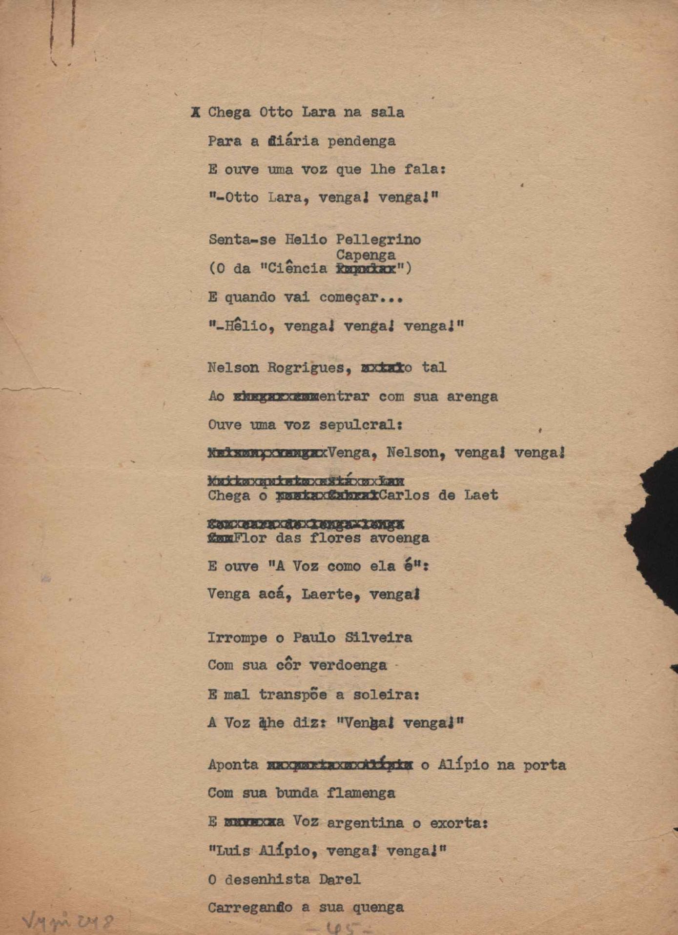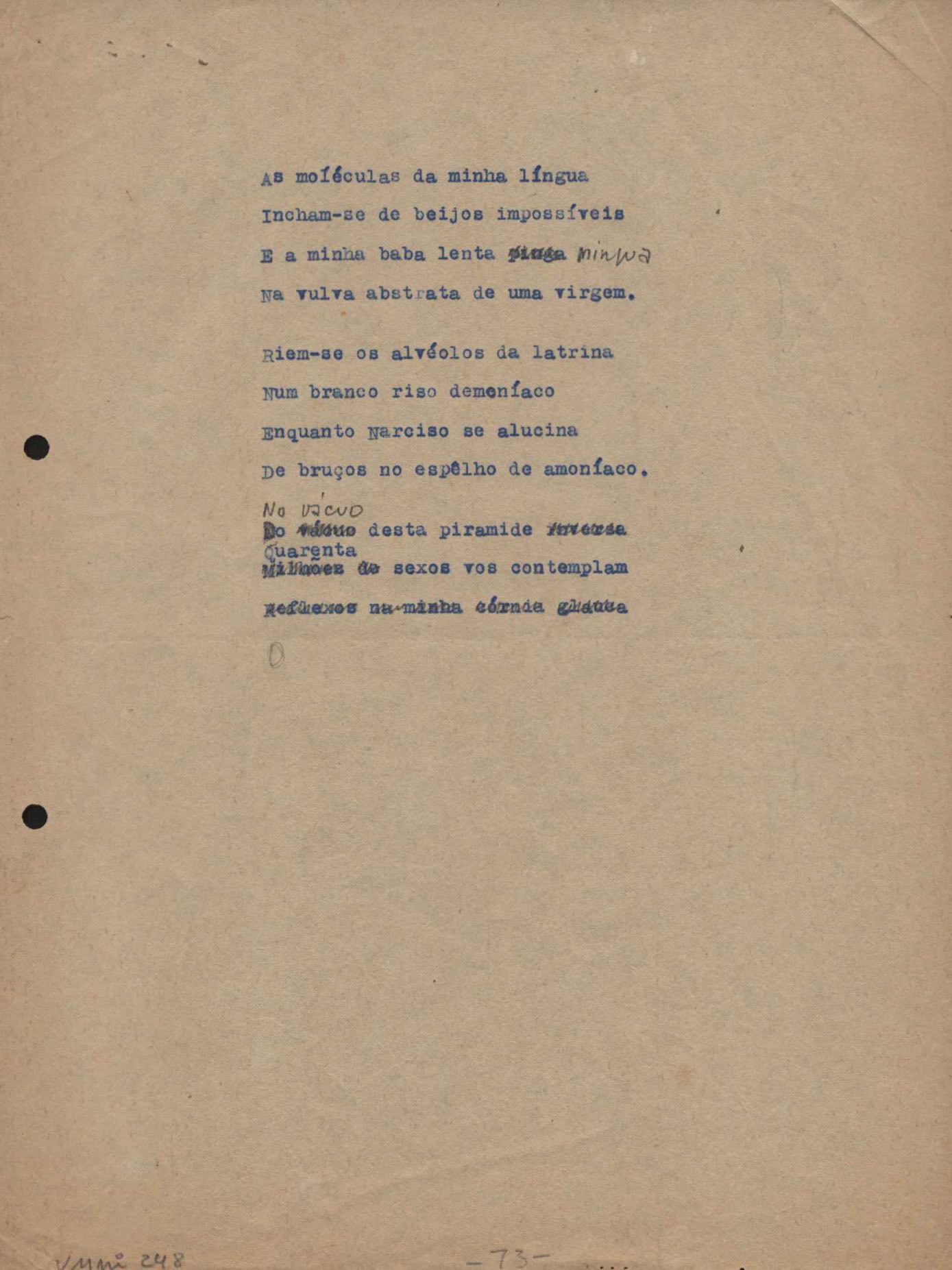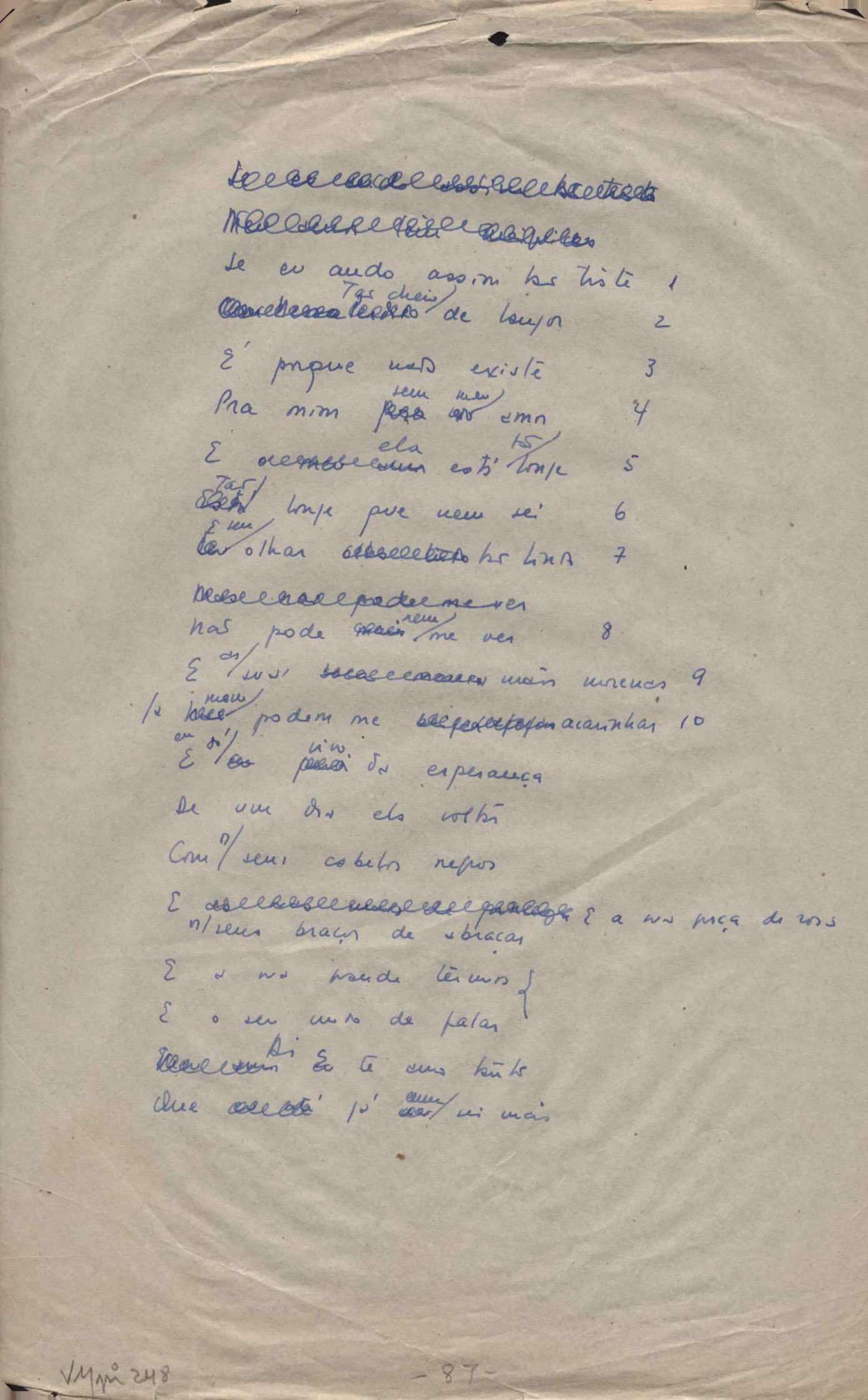 Dossiê dividido em nove partes. Outras observações: 1. Alguns poemas estão incompletos; 2. No verso de "O cântico das águas" encontra-se "A legenda do príncipe poeta" e no de "Verdade", "Plagiando o poeta..."; 3. Há dois poemas com o título de "Elegia de Paris", de "Legenda", de "Madrigal" e de "Trovas"; 4. "Cantiga XI" está publicada na Obra poética com o título de "Duas canções de silêncio II"; 5. Na mesma folha que "Pressentimento" encontram-se "Legenda" e "O bilhar", na mesma de "Romance da morena" temos "Não te dou perdão", e na de "Canto", "Última primavera", na de "Poema feito para chegar aos ouvidos de S. Teresa", outra versão de "Fala íntima"; 6. "O soneto a quatro mãos" foi escrito por VM e Paulo Mendes Campos e "Os acadêmicos... das 5 horas", por VM e Moacir Veloso de Oliveira; 7. Há dois poemas com o título de "A miragem"; 8. Destes poemas, 401 são esboços e não possuem título.