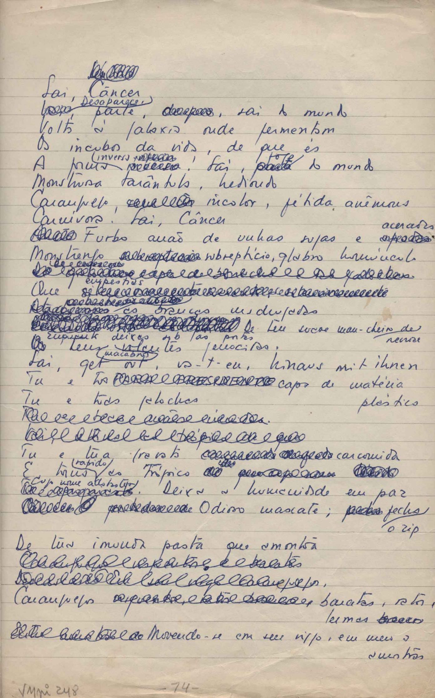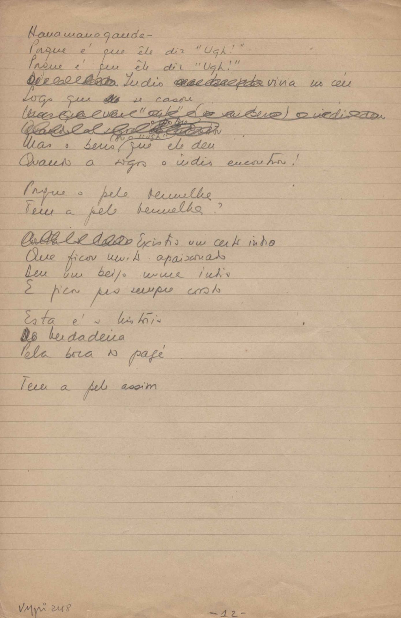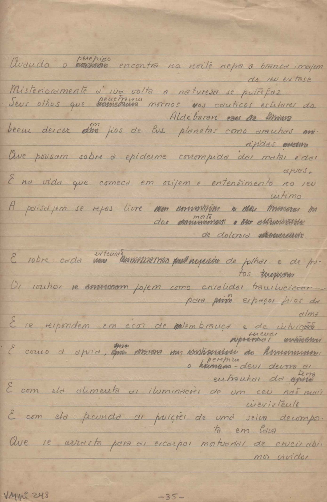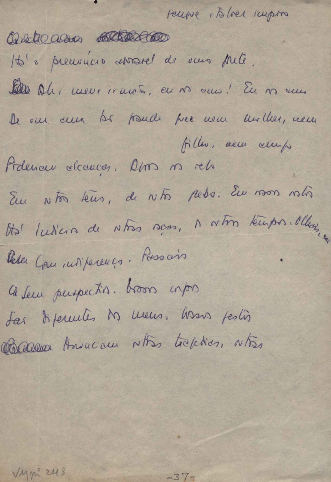 Dossiê dividido em nove partes. Outras observações: 1. Alguns poemas estão incompletos; 2. No verso de "O cântico das águas" encontra-se "A legenda do príncipe poeta" e no de "Verdade", "Plagiando o poeta..."; 3. Há dois poemas com o título de "Elegia de Paris", de "Legenda", de "Madrigal" e de "Trovas"; 4. "Cantiga XI" está publicada na Obra poética com o título de "Duas canções de silêncio II"; 5. Na mesma folha que "Pressentimento" encontram-se "Legenda" e "O bilhar", na mesma de "Romance da morena" temos "Não te dou perdão", e na de "Canto", "Última primavera", na de "Poema feito para chegar aos ouvidos de S. Teresa", outra versão de "Fala íntima"; 6. "O soneto a quatro mãos" foi escrito por VM e Paulo Mendes Campos e "Os acadêmicos... das 5 horas", por VM e Moacir Veloso de Oliveira; 7. Há dois poemas com o título de "A miragem"; 8. Destes poemas, 401 são esboços e não possuem título.