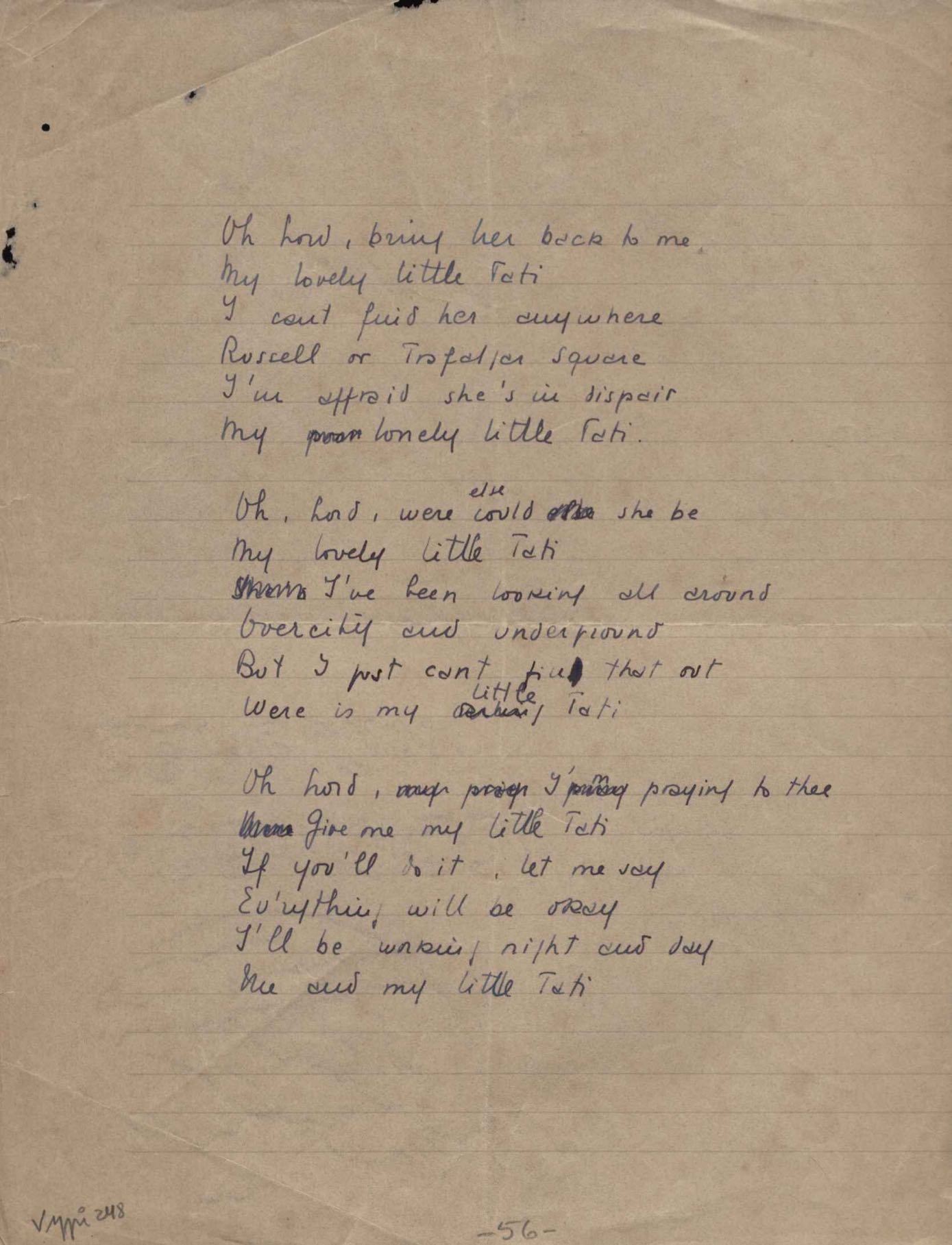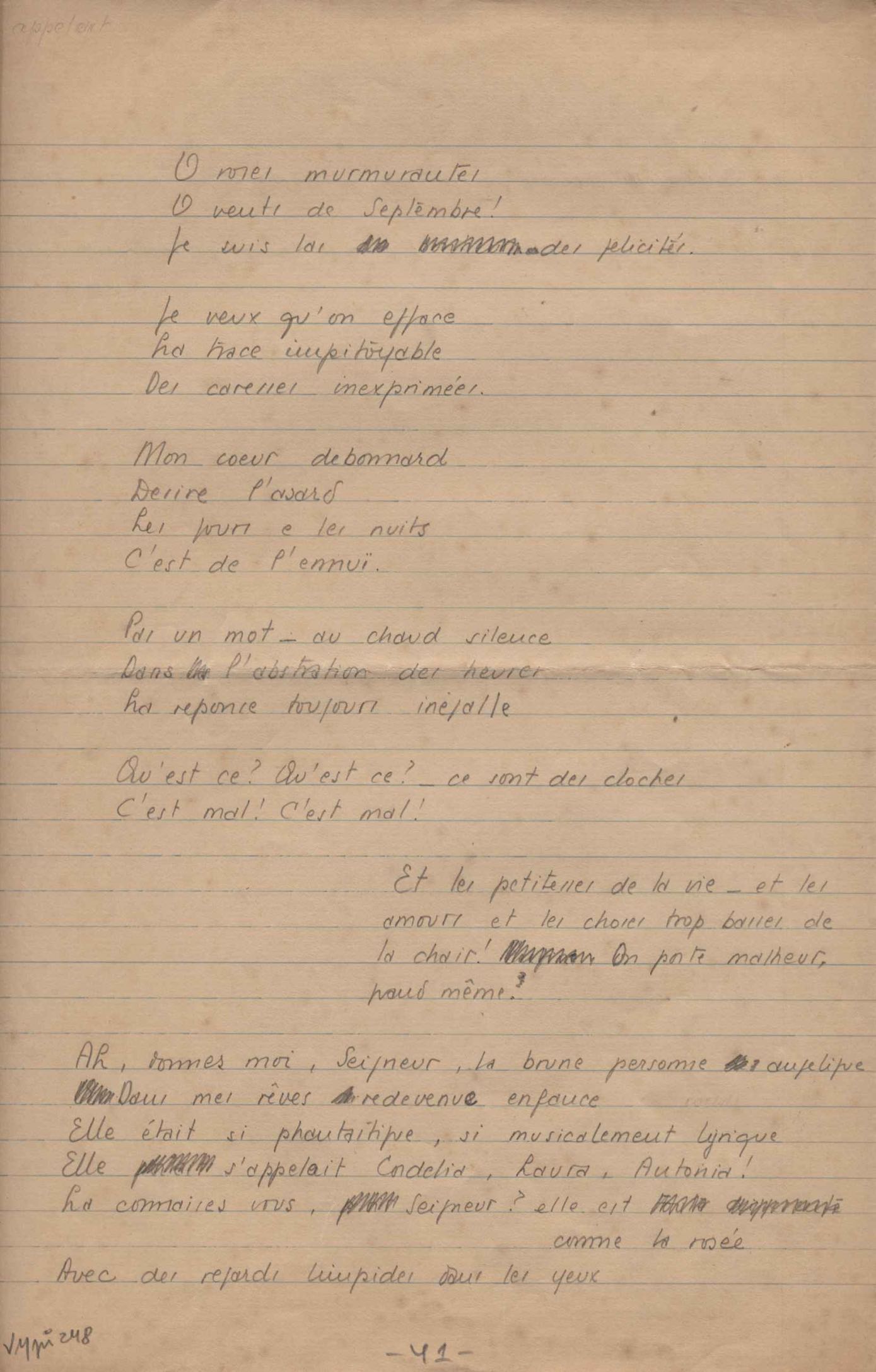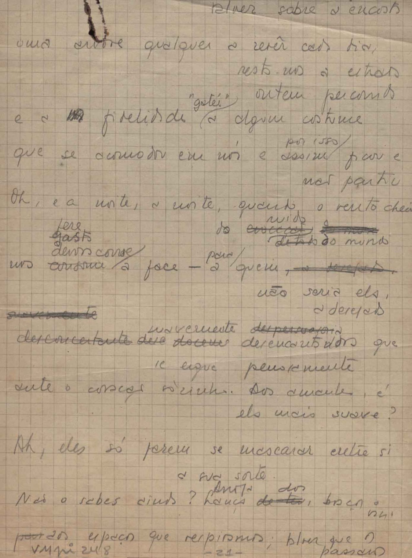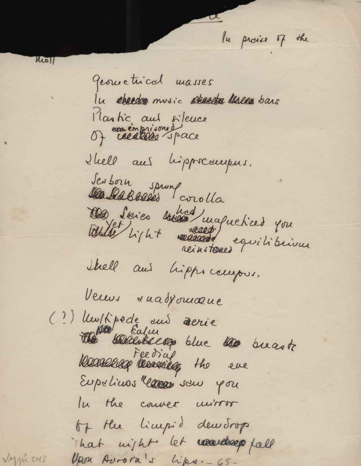 Dossiê dividido em nove partes. Outras observações: 1. Alguns poemas estão incompletos; 2. No verso de "O cântico das águas" encontra-se "A legenda do príncipe poeta" e no de "Verdade", "Plagiando o poeta..."; 3. Há dois poemas com o título de "Elegia de Paris", de "Legenda", de "Madrigal" e de "Trovas"; 4. "Cantiga XI" está publicada na Obra poética com o título de "Duas canções de silêncio II"; 5. Na mesma folha que "Pressentimento" encontram-se "Legenda" e "O bilhar", na mesma de "Romance da morena" temos "Não te dou perdão", e na de "Canto", "Última primavera", na de "Poema feito para chegar aos ouvidos de S. Teresa", outra versão de "Fala íntima"; 6. "O soneto a quatro mãos" foi escrito por VM e Paulo Mendes Campos e "Os acadêmicos... das 5 horas", por VM e Moacir Veloso de Oliveira; 7. Há dois poemas com o título de "A miragem"; 8. Destes poemas, 401 são esboços e não possuem título.
